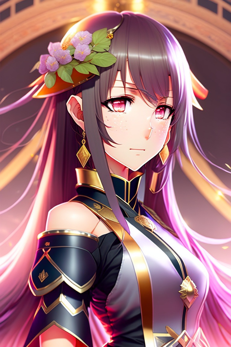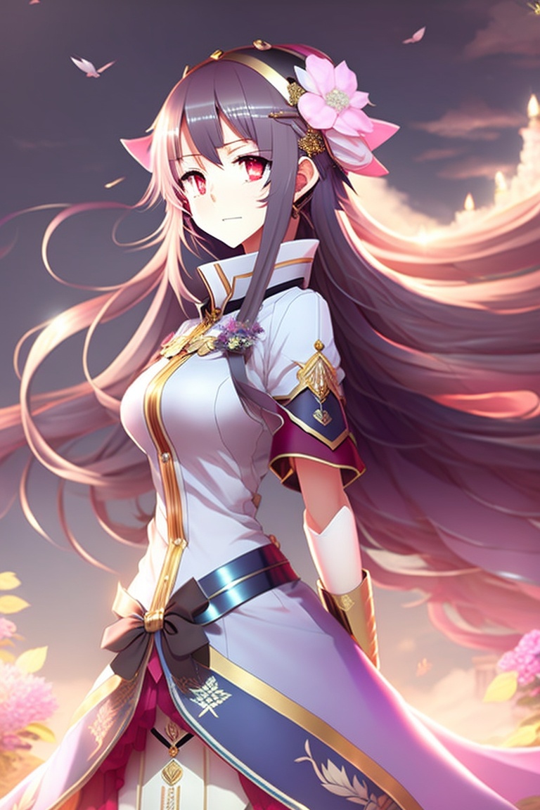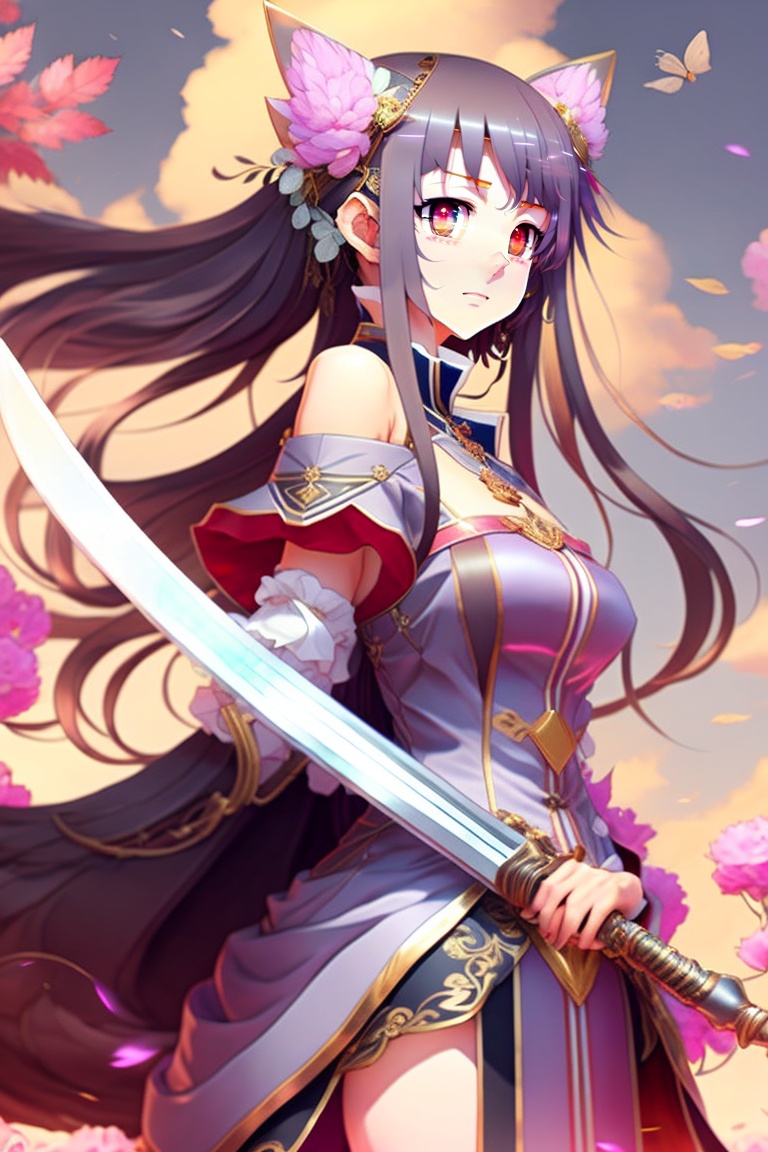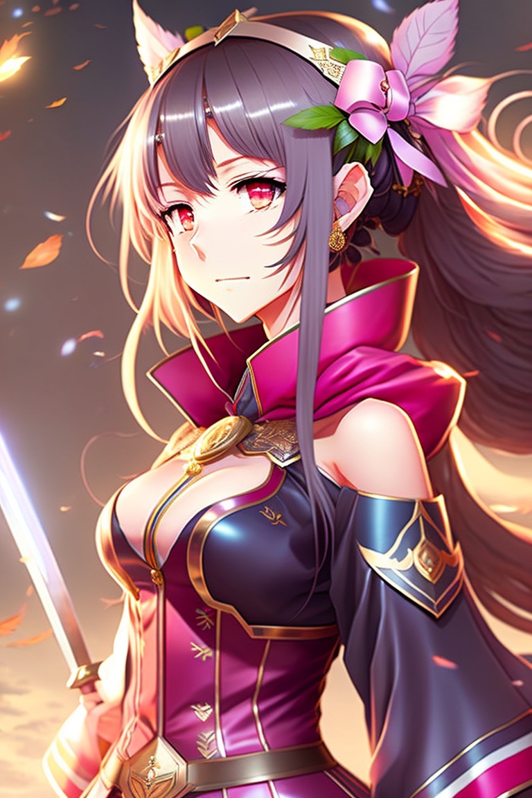 Anime character homura from edens zero, is a female character with traditional japanese dress, with her characteristic sword, with lights, masterpiece, very detailed, with warm colors, high resolution