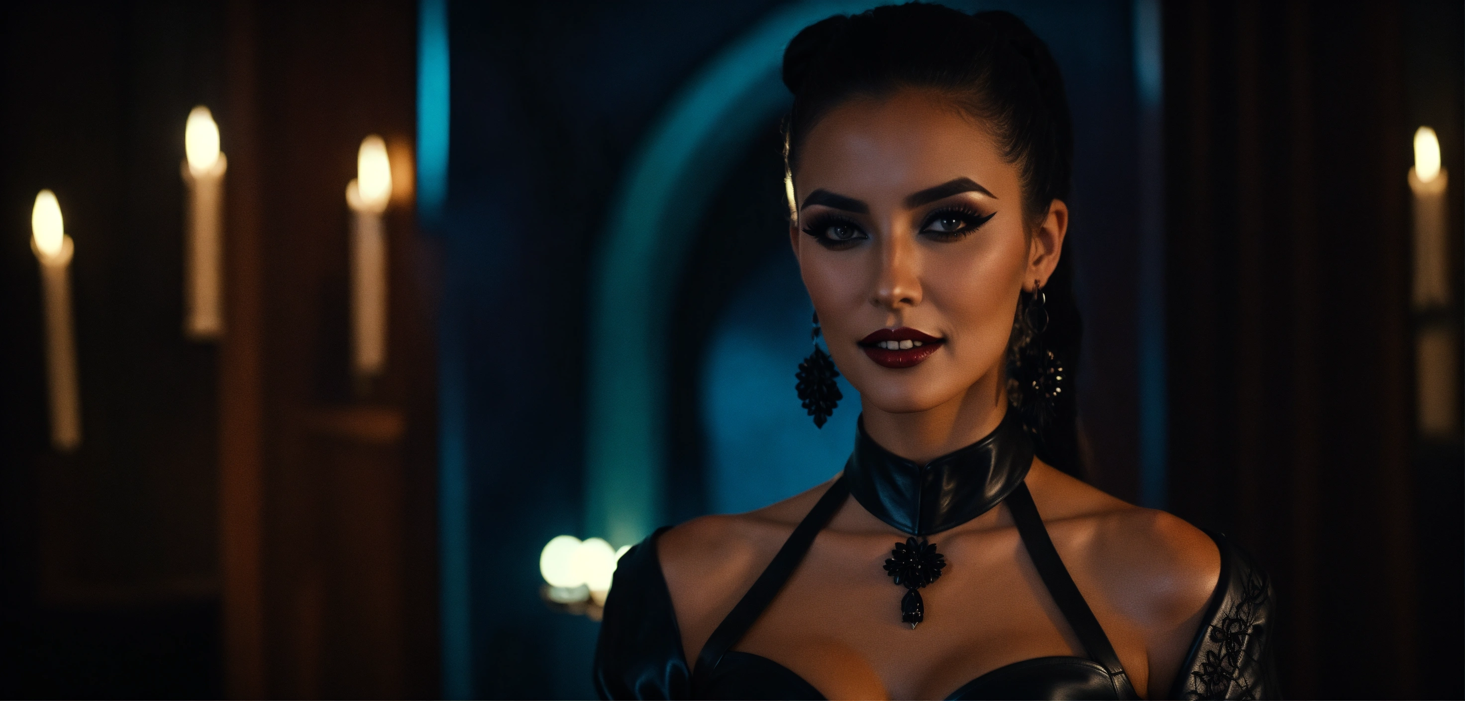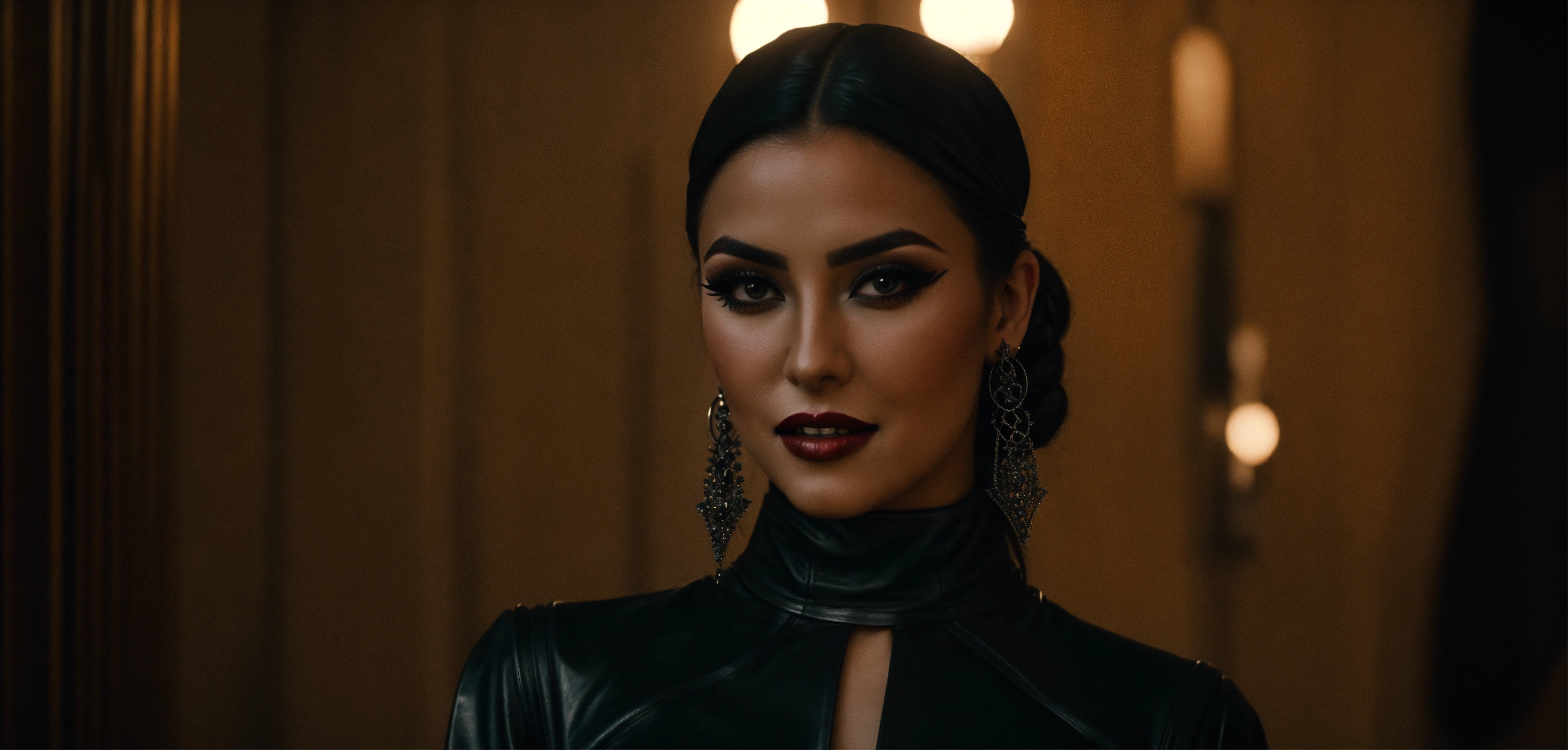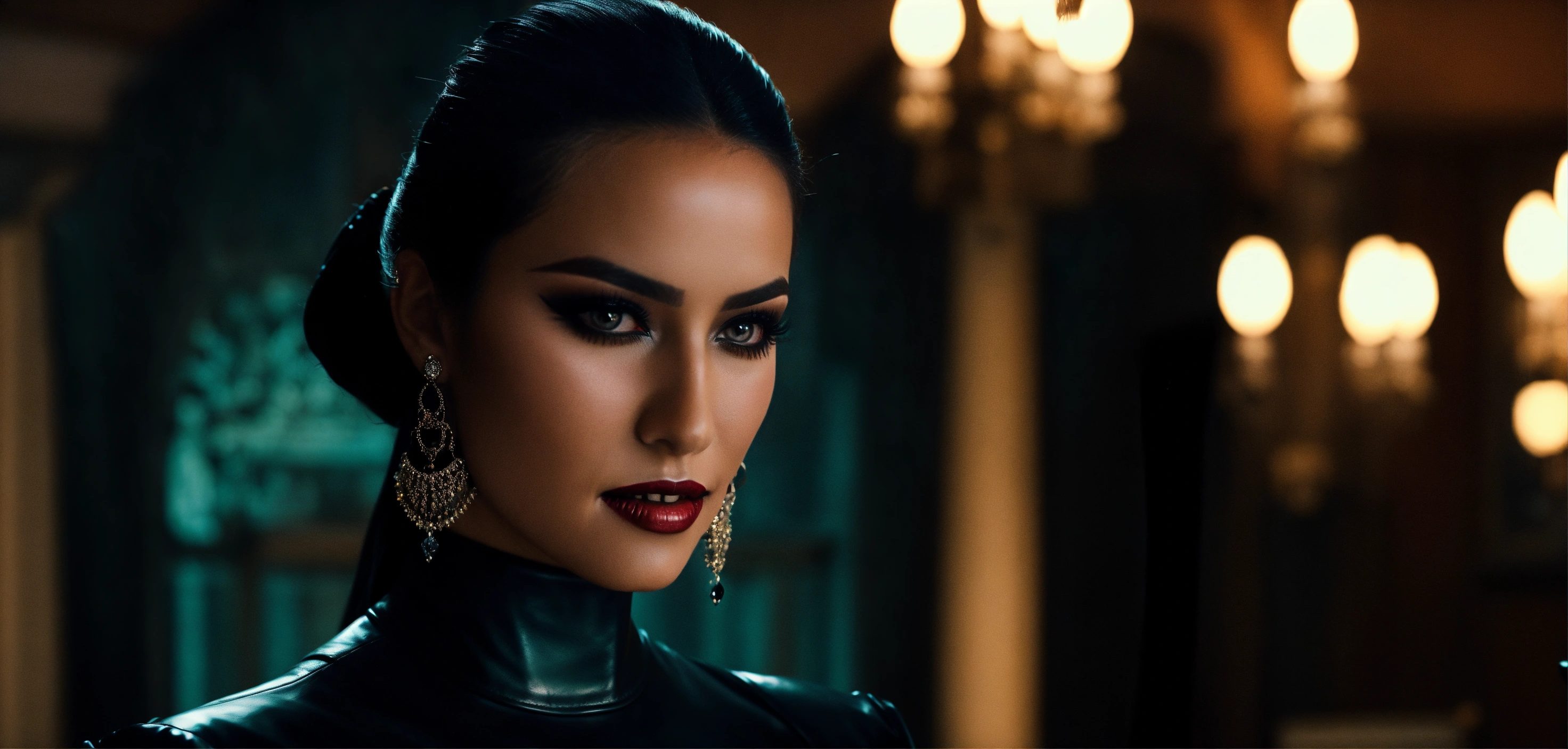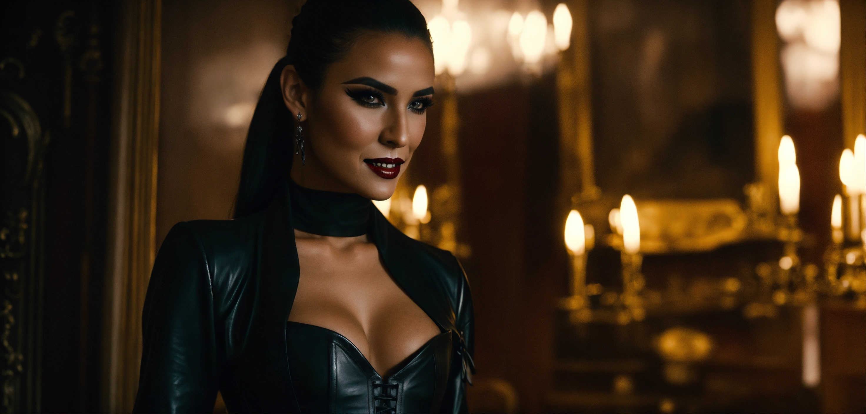 Cinematic vampire underworld movie look, stunning arab woman fashion model, head slightly tilted, looking arrogant evil smile, straight black high ponytail hair, eyeliner makeup, strict black leather dress with big long puff sleeves, black leather waist corset, french mansion room by night, haze
