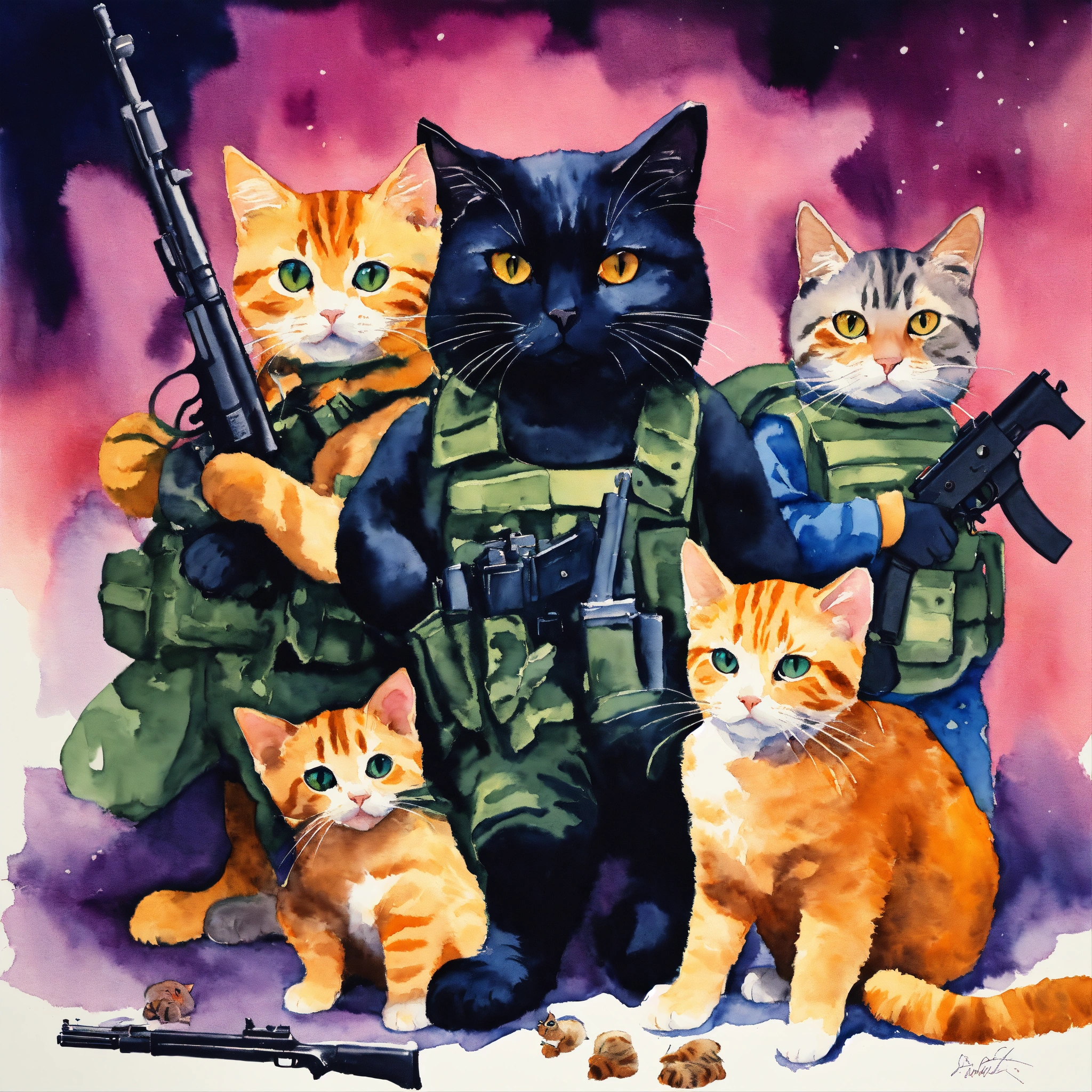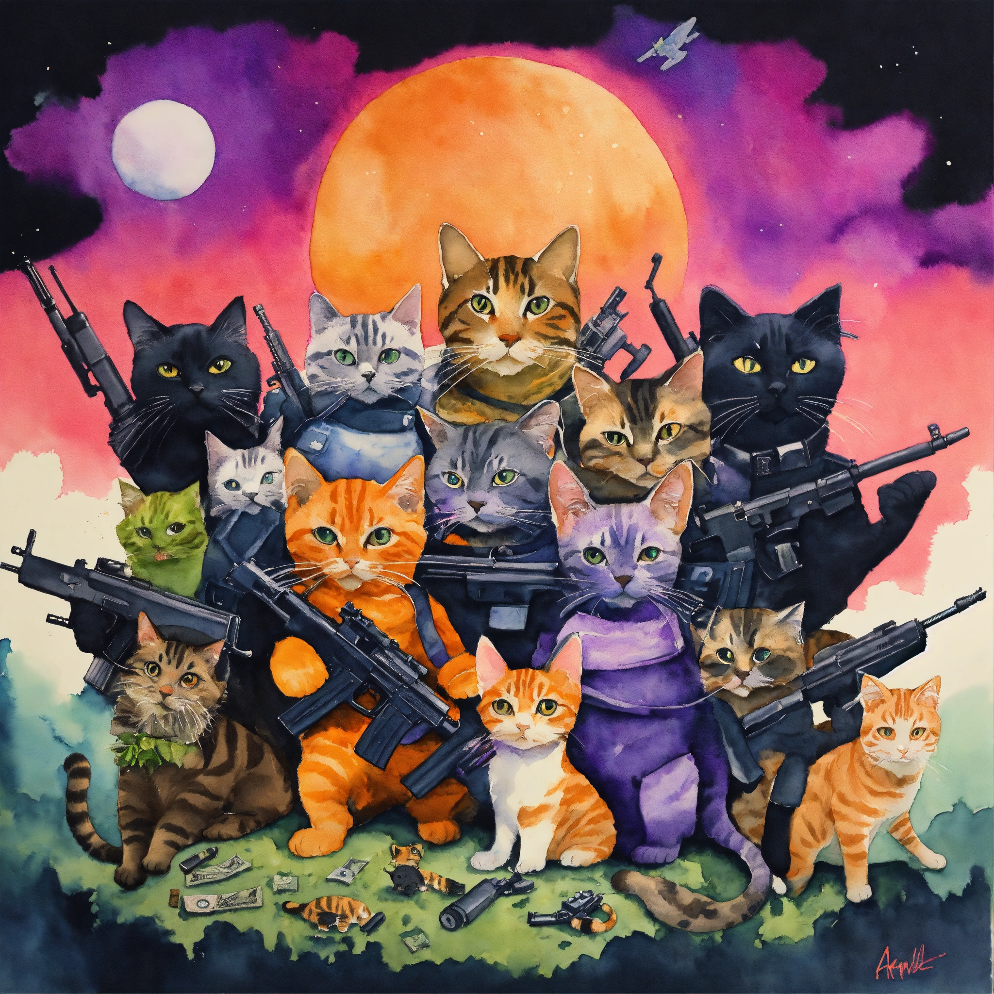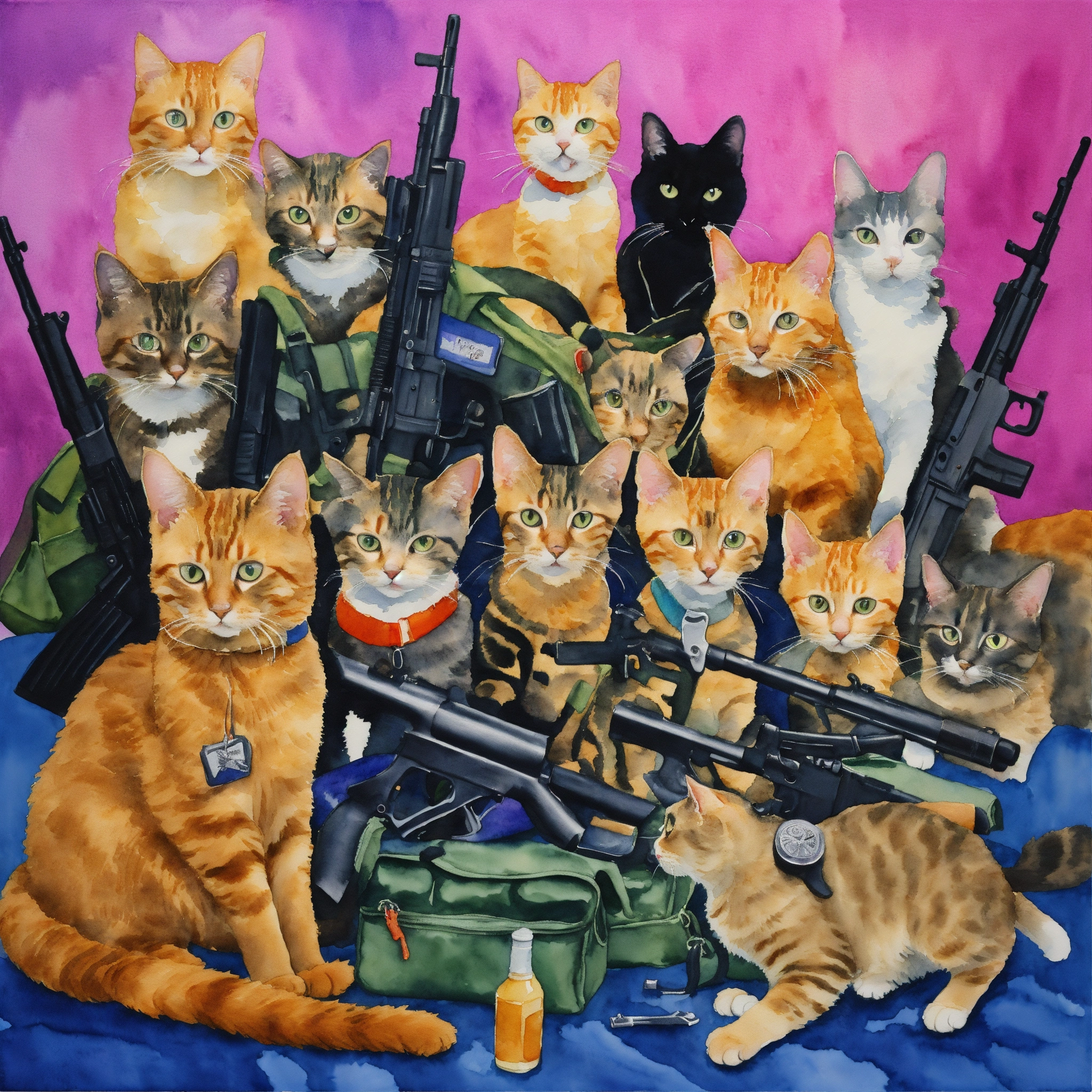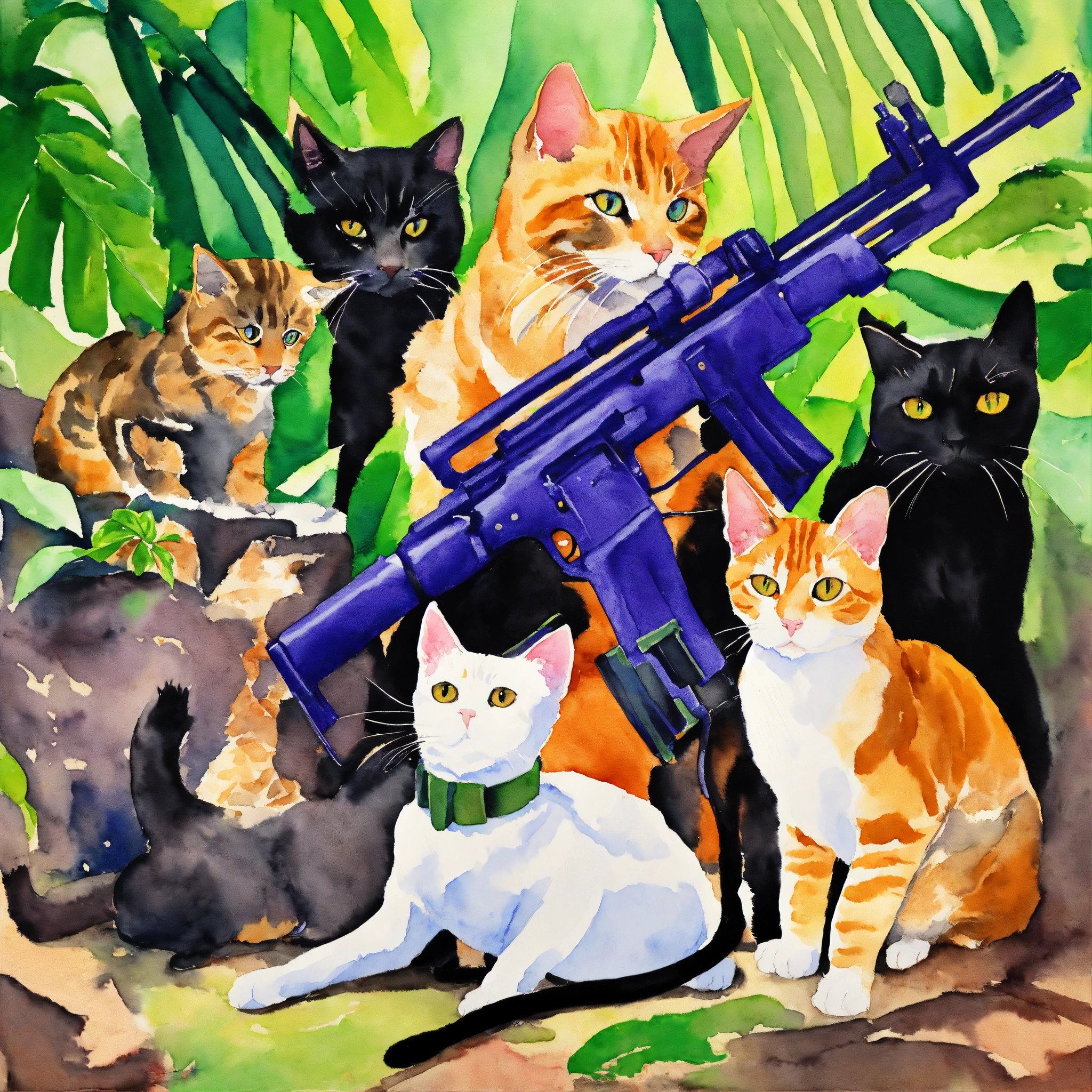 Watercolor painting, basic watercolor, simple watercolor on canvas, vivid colors, bright colors, bright green, tropical rainforest, cats holding guns, radicalized cats, large group of cats with artillery, terrorist cats, cat militia, cats with guns, black cat with a gun, aug, ak-47, pile of weapons, stacks of cash, bags of white powder, bombs, war, terrorist, jihad, cats with masks, black cat holding a revolver, elite cat mercenary, tiny white cat with a pistol, orange tabby with a missile, small revolver being held by a black cat, very small silver tabby carrying a revolver and looking confused, gun, revolver, black cat, small orange tabby, very very tiny purple cat