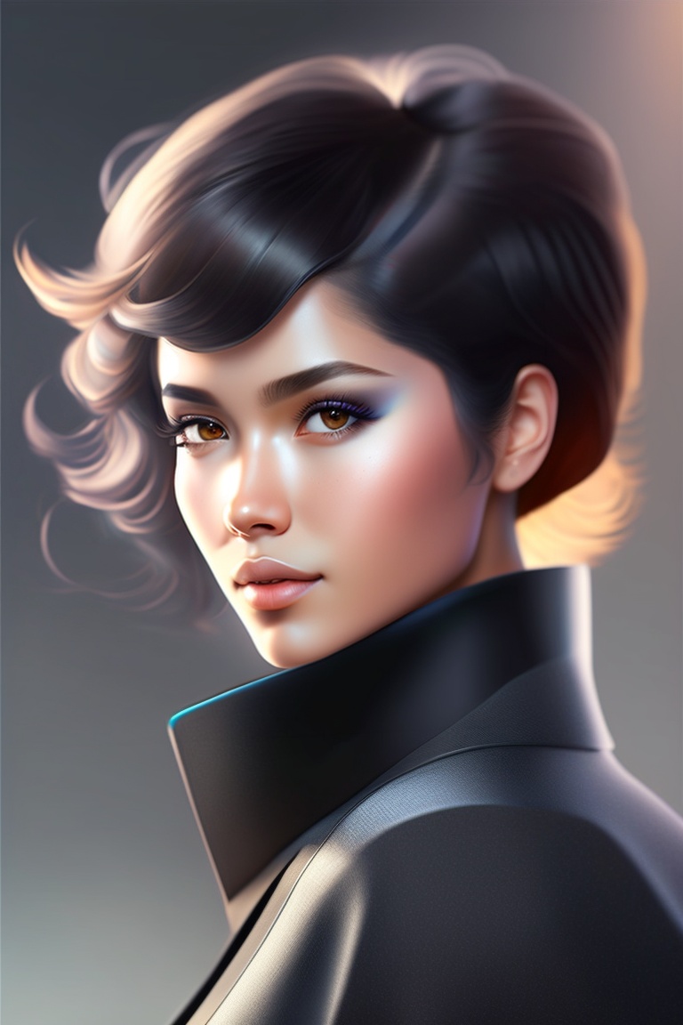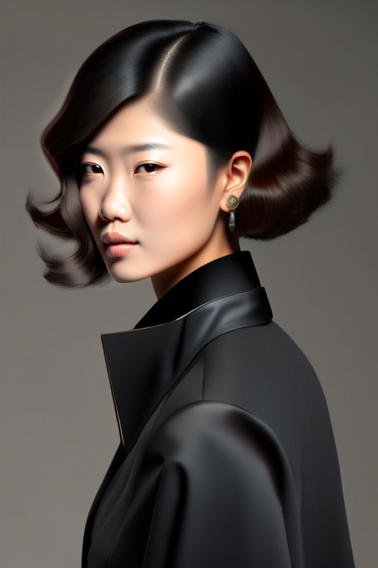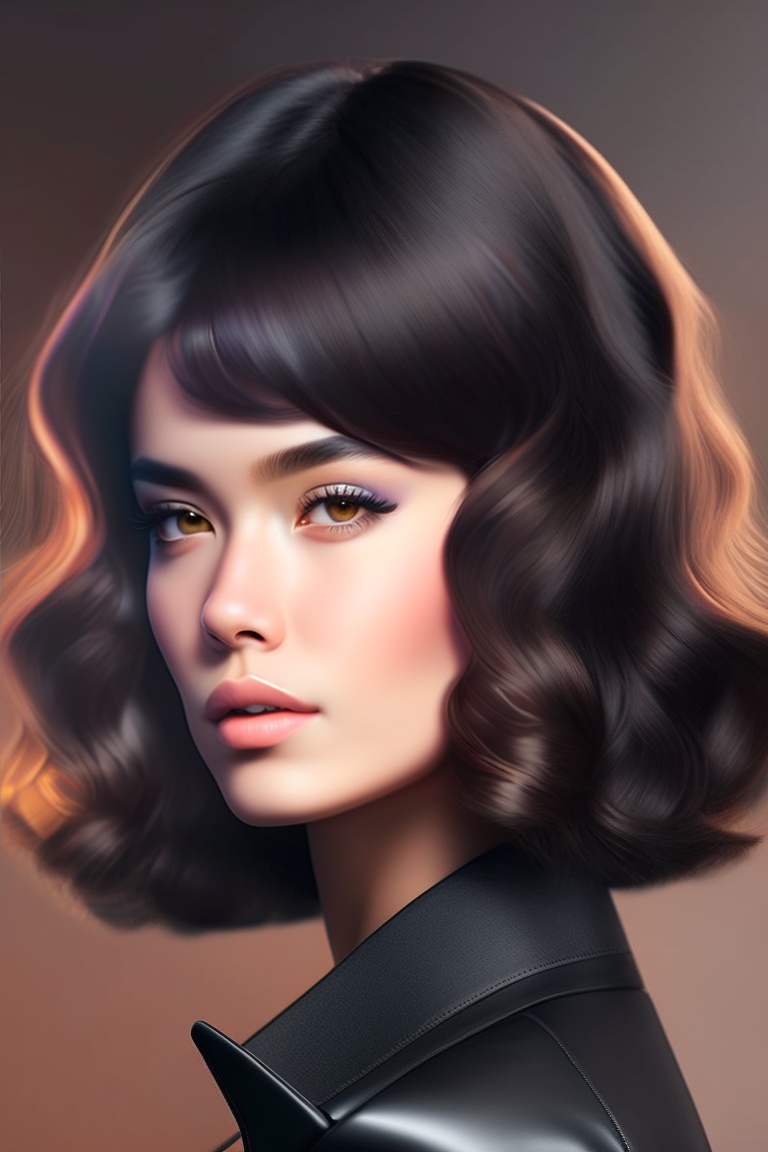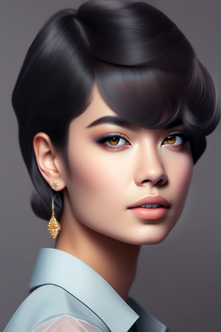 A girl with short wavy black hair, divide on side partition, with flowy hair, with big beautiful eye and a sharp nose