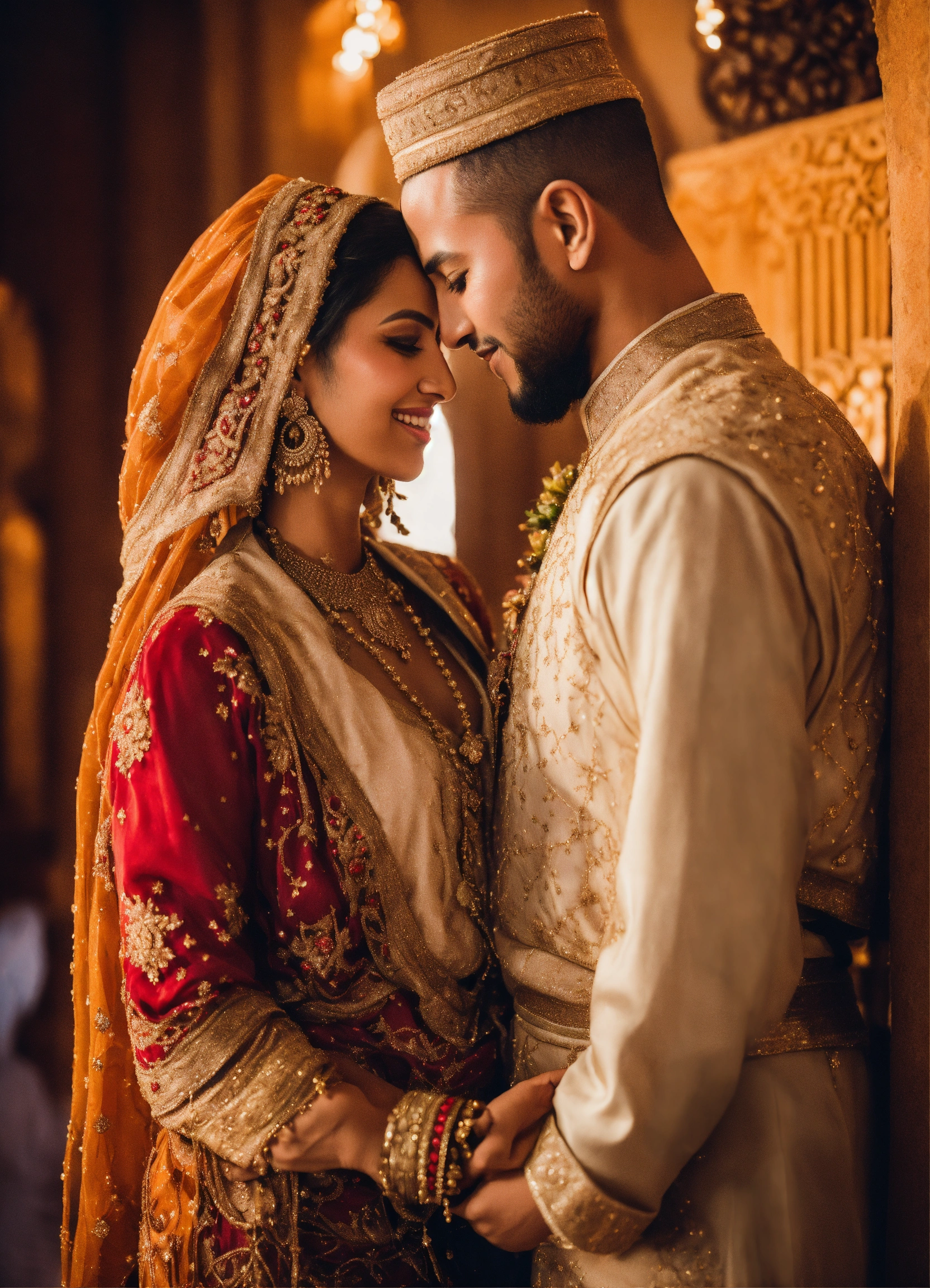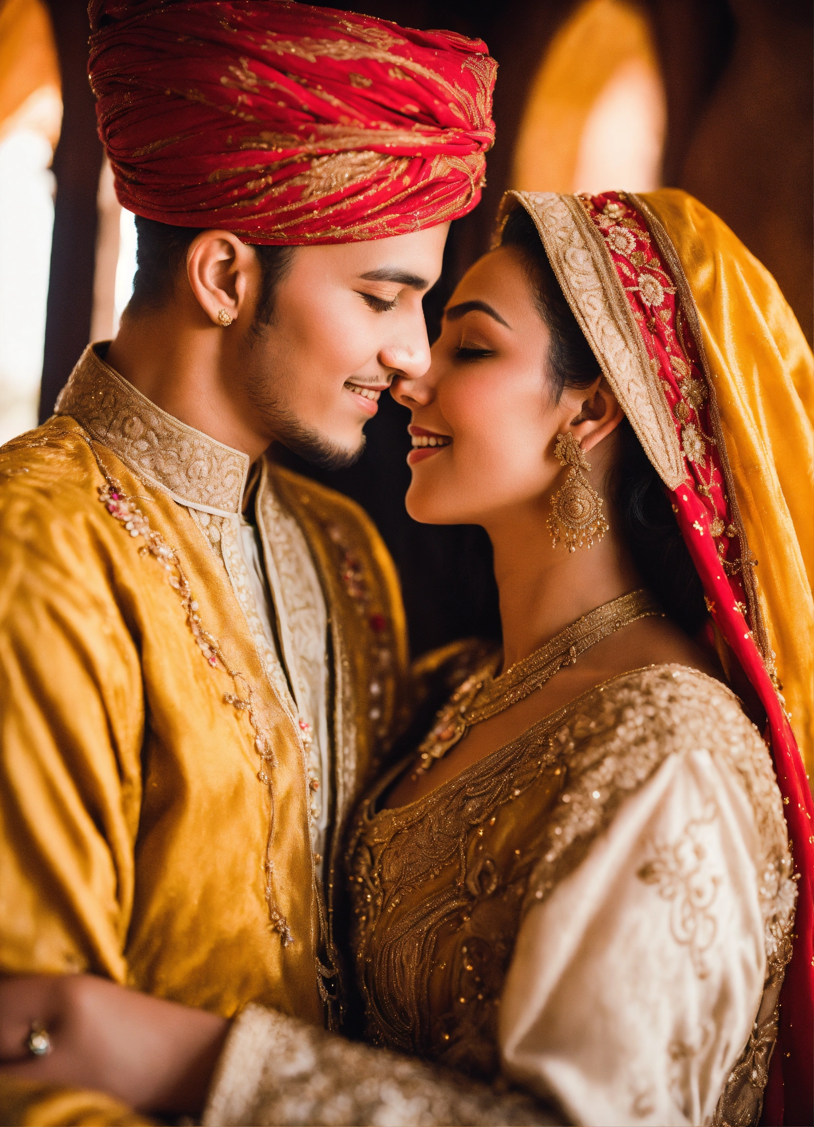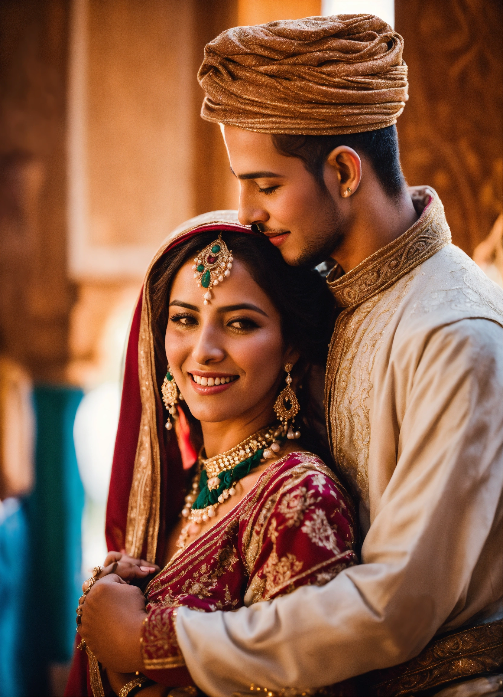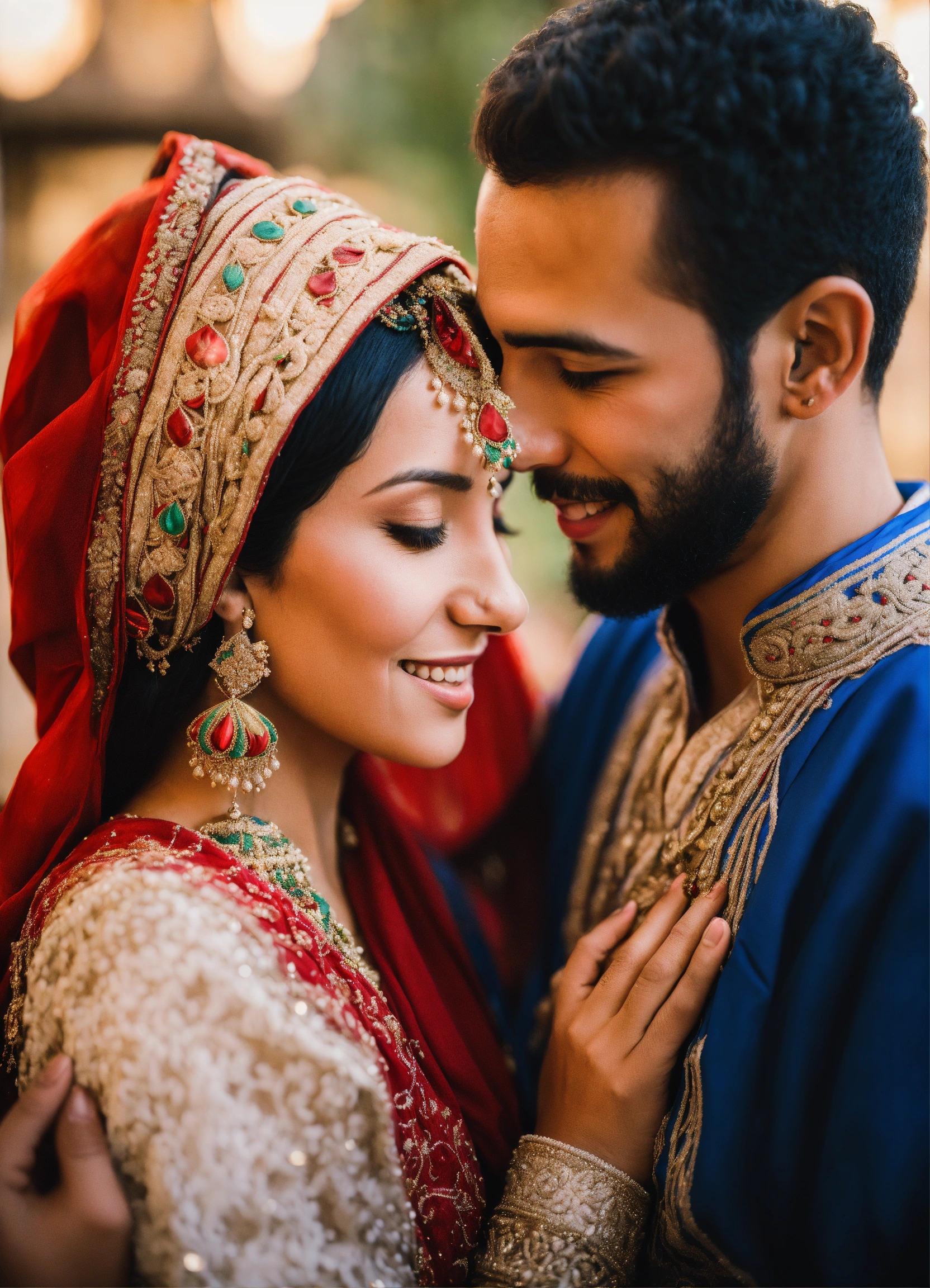 Create an image of a moroccan couple, dressed in traditional wedding attire, holding each other tenderly in a loving embrace. ensure you capture the details of their traditional clothing and the warm expression of their love