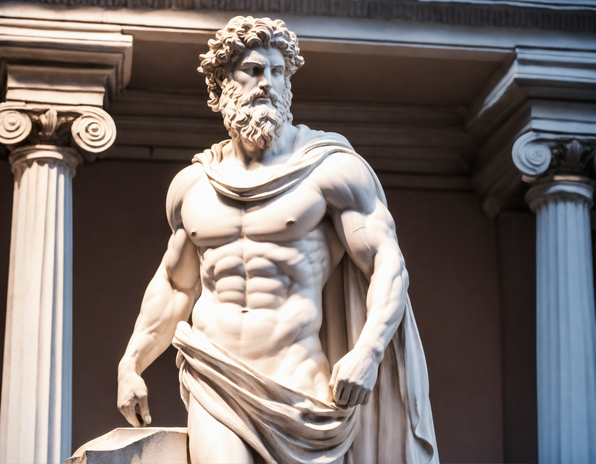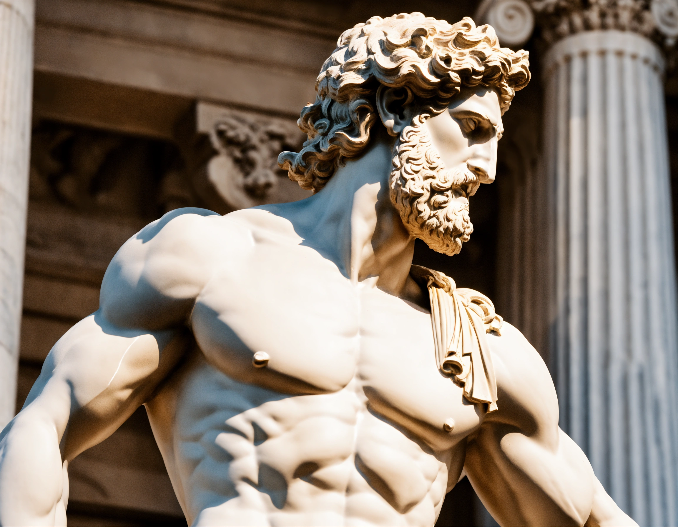 A statue from a muscular greek god statue with a wavey midde! part hair out of white marbel with white backround standing on a podest 8k