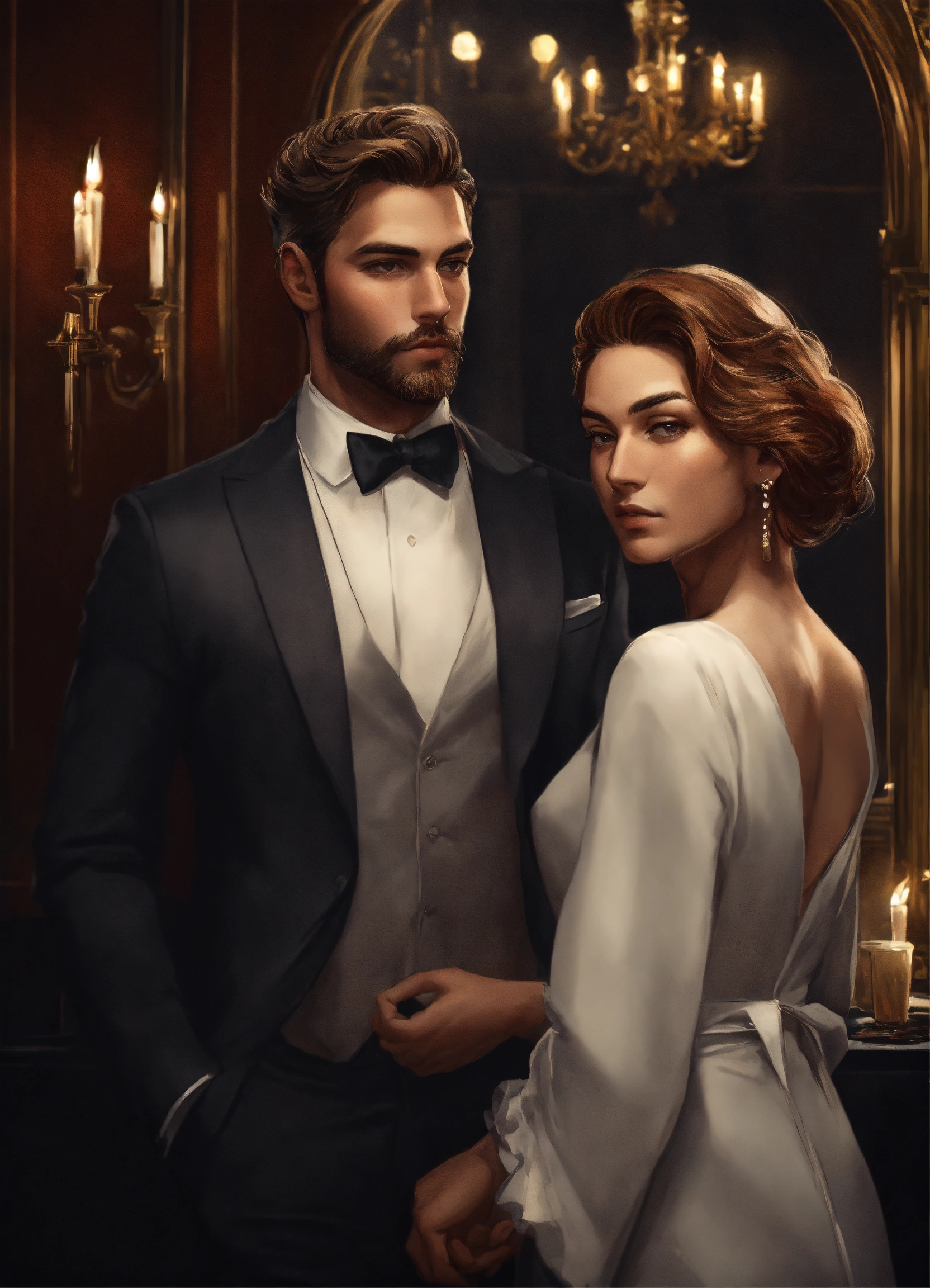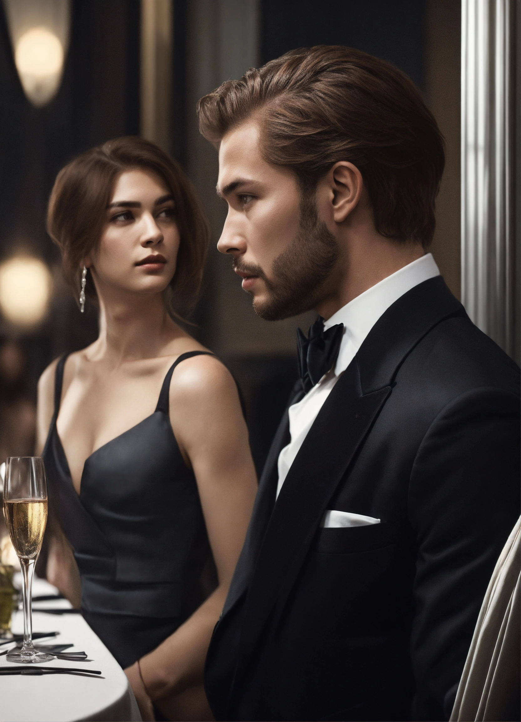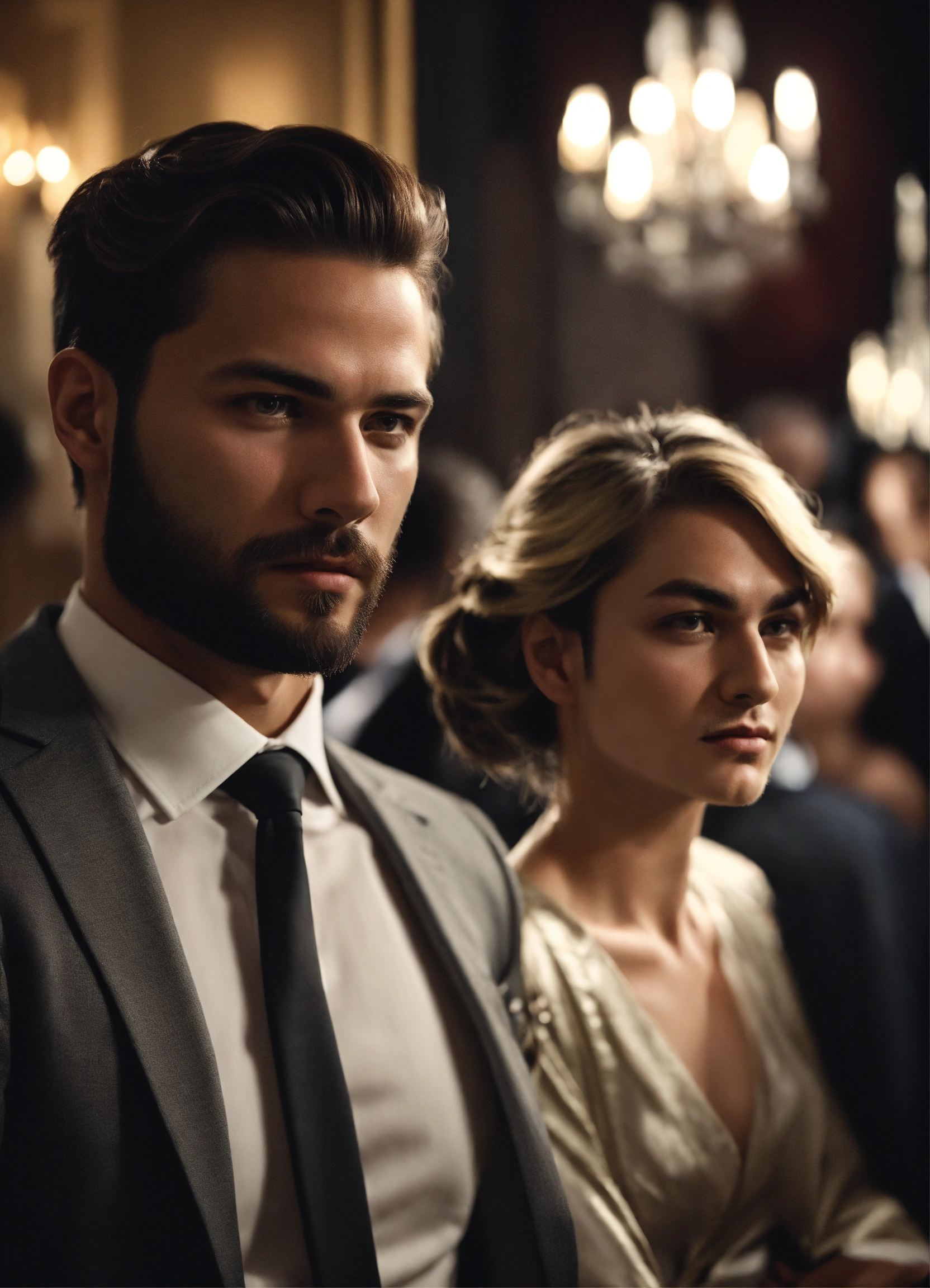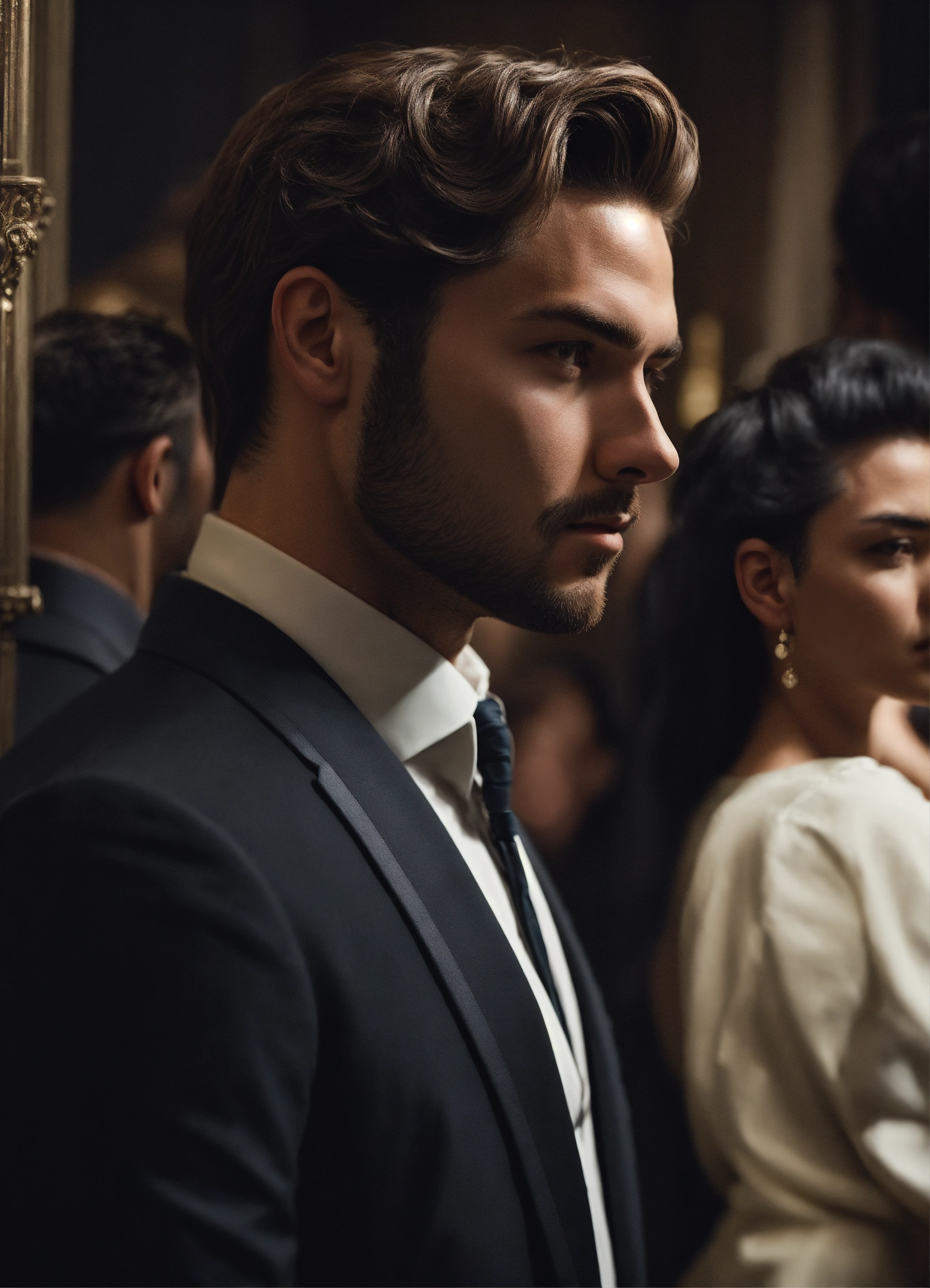 Modern handsome man, looking side view, rich man, avoidant, black and white, photorealistic, avoidant man, in classy party, and the villainess-looking woman glances at him from behind
