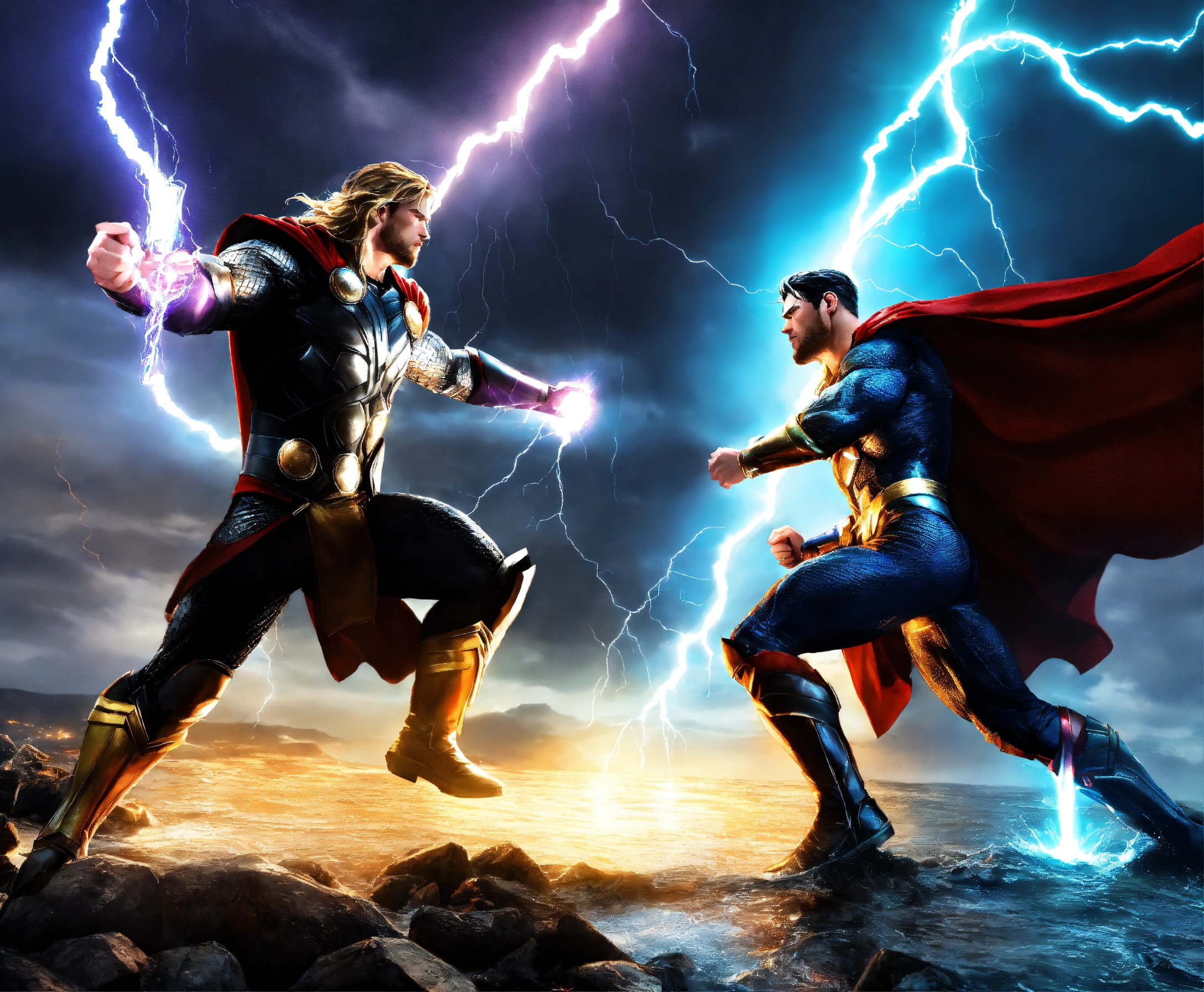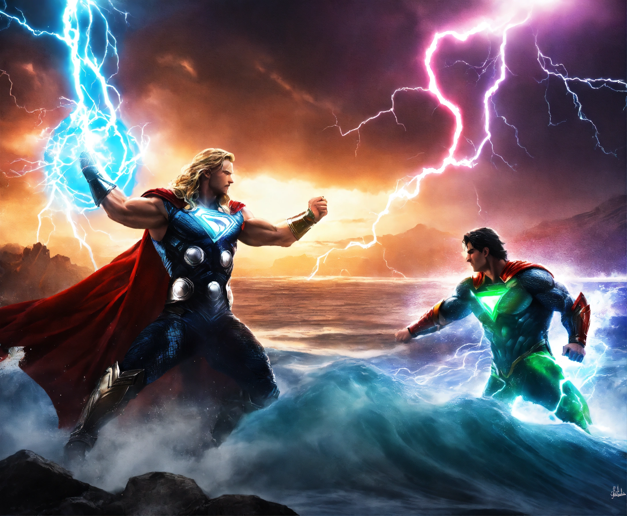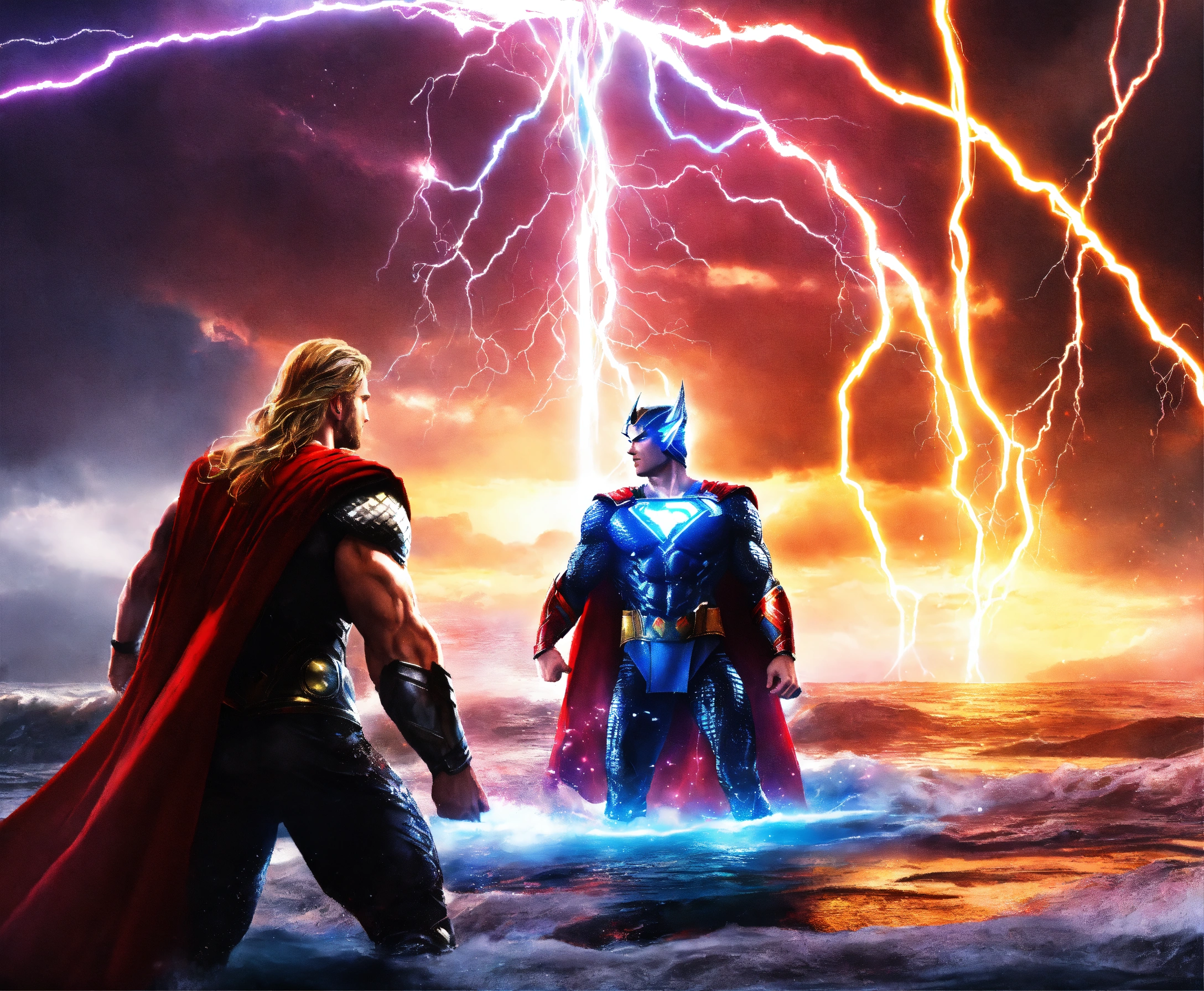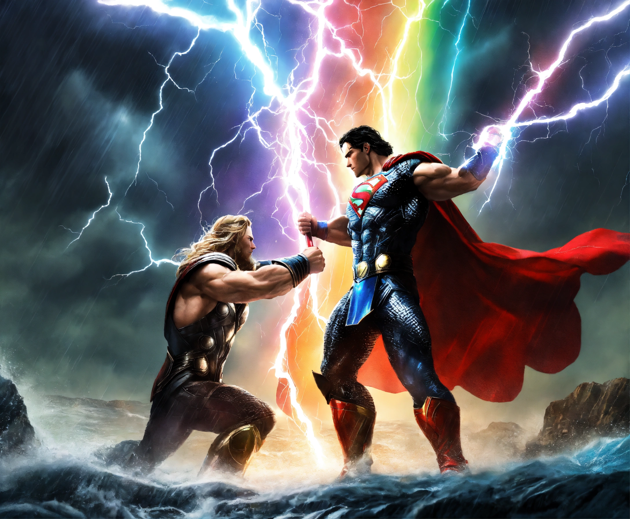Dark thor vs glowing superman god rainbow lightning water