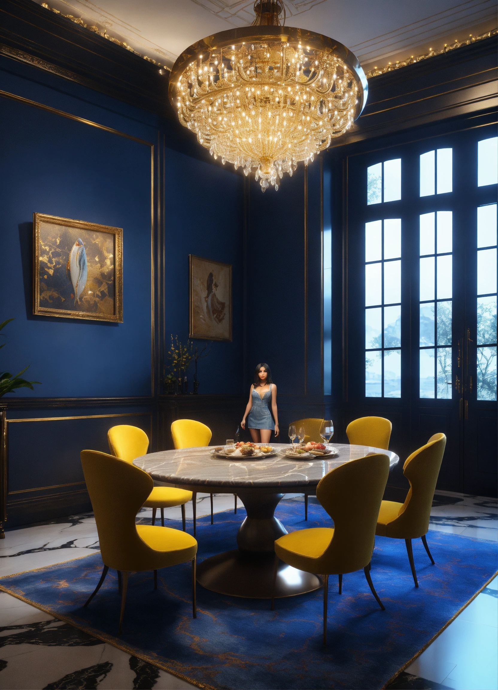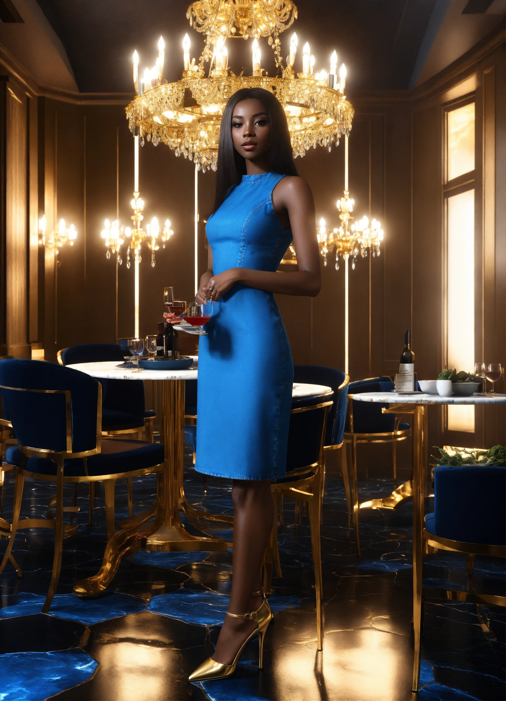 Alien female, 30 years old, dark skin, long dark hair. small frame. in cute denim dress and heels. standing in upscale apertment . there is a large chandelier. fish and vegatabless on plates, dessert, wine on table with blue chairs, black and gold marble floors, 8k, unreal engine. 8k, unreal engine.