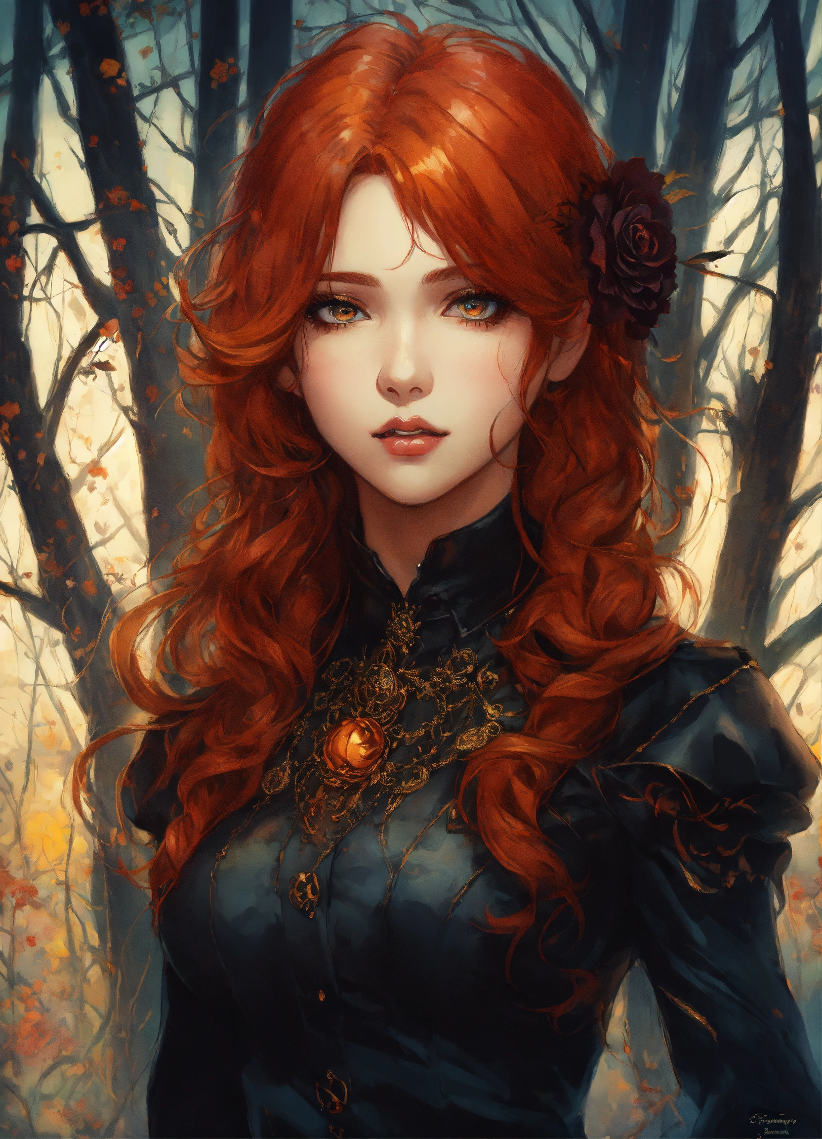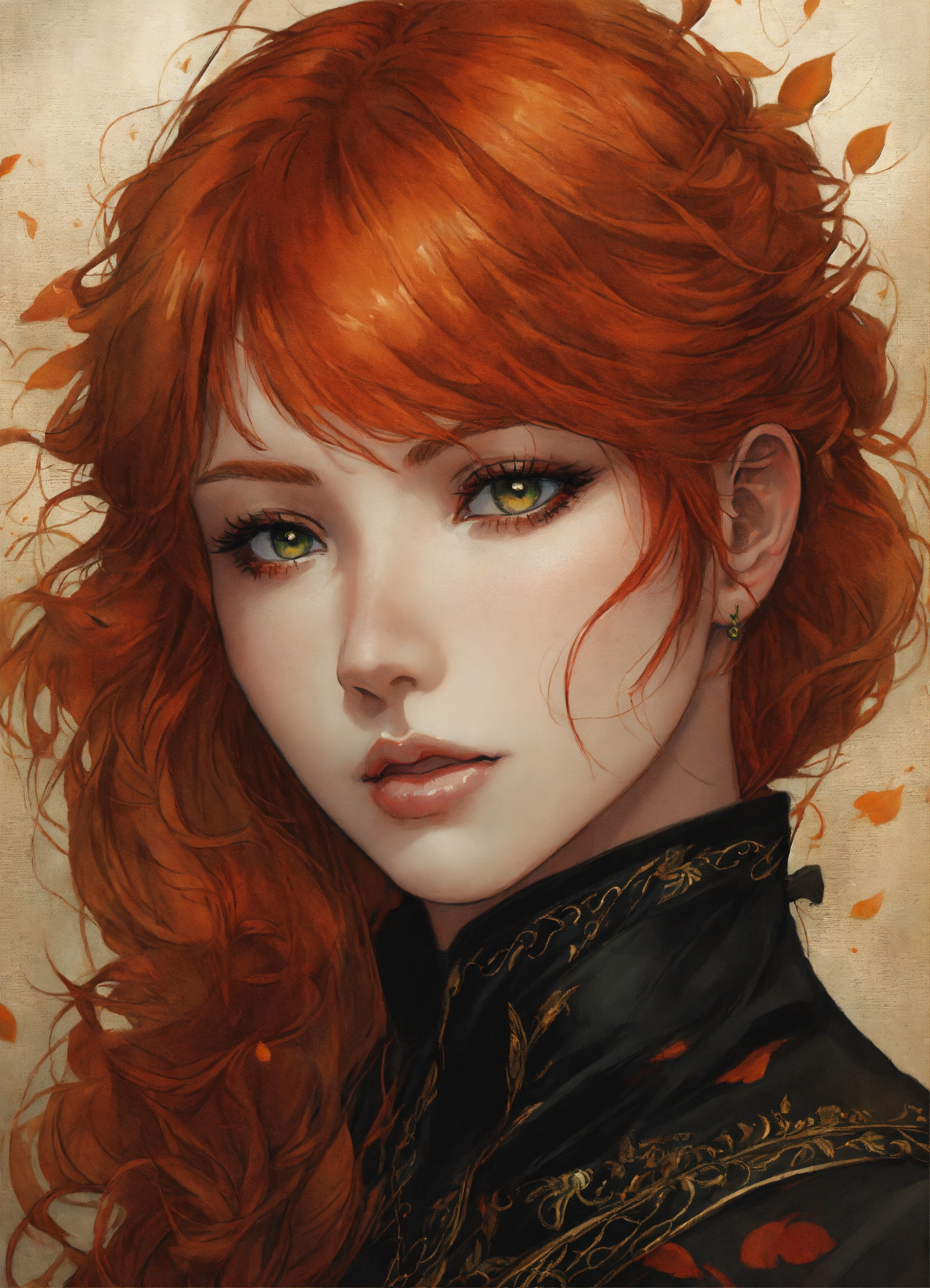 Beautiful redhead woman, anime, hazel eyes, manga, detailed, black clothes, portrait, detailed, pretty, gorgeous, attractive face, halloween, art by ayami kojima, art by sam deats, art by katie silva, art by evgeny lubaev, art by suzanne sharp, art by sean vo, art by stephen stark