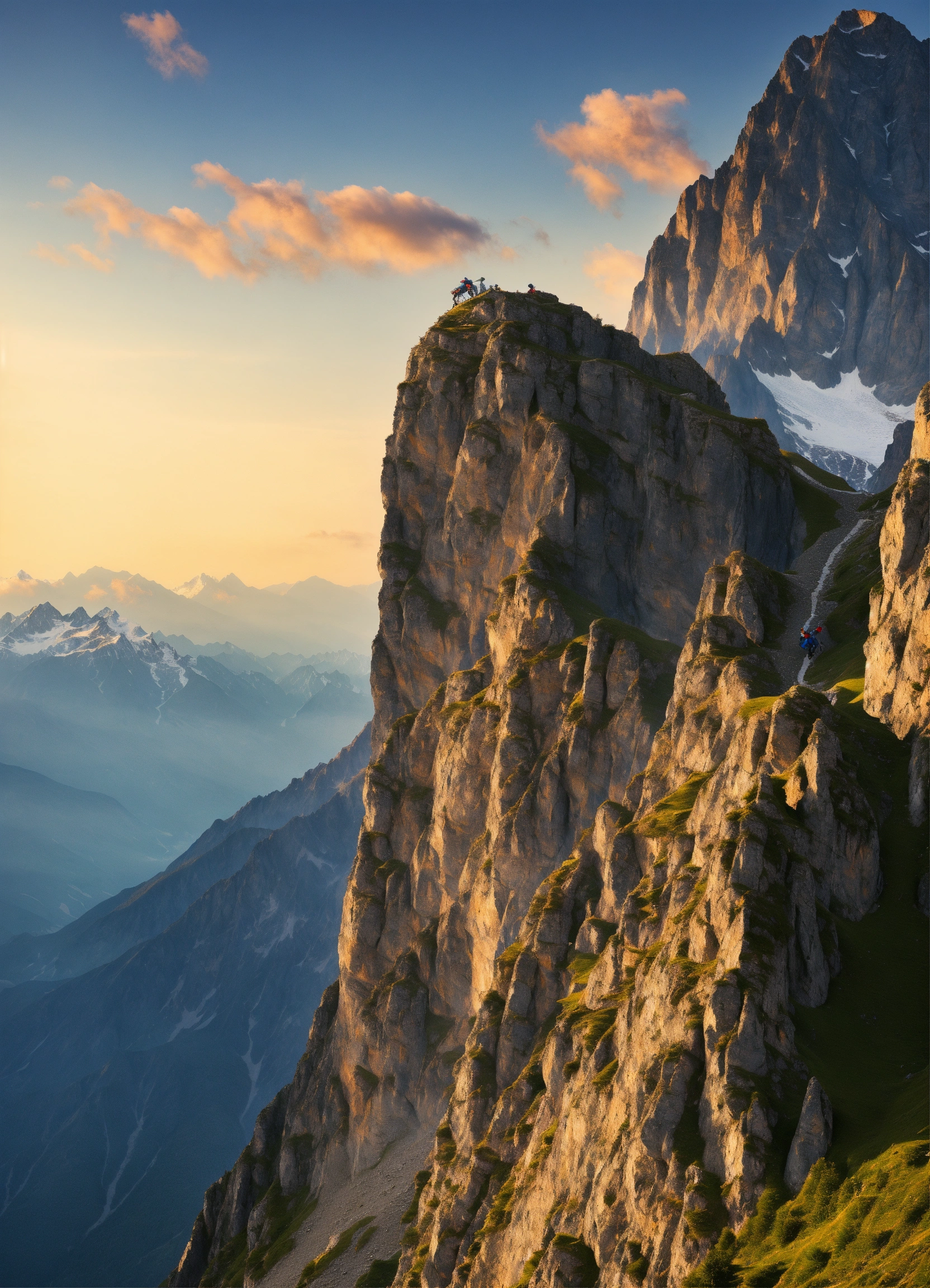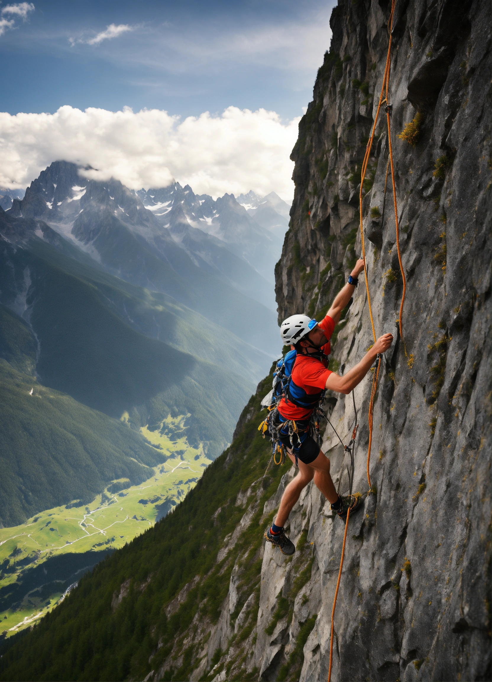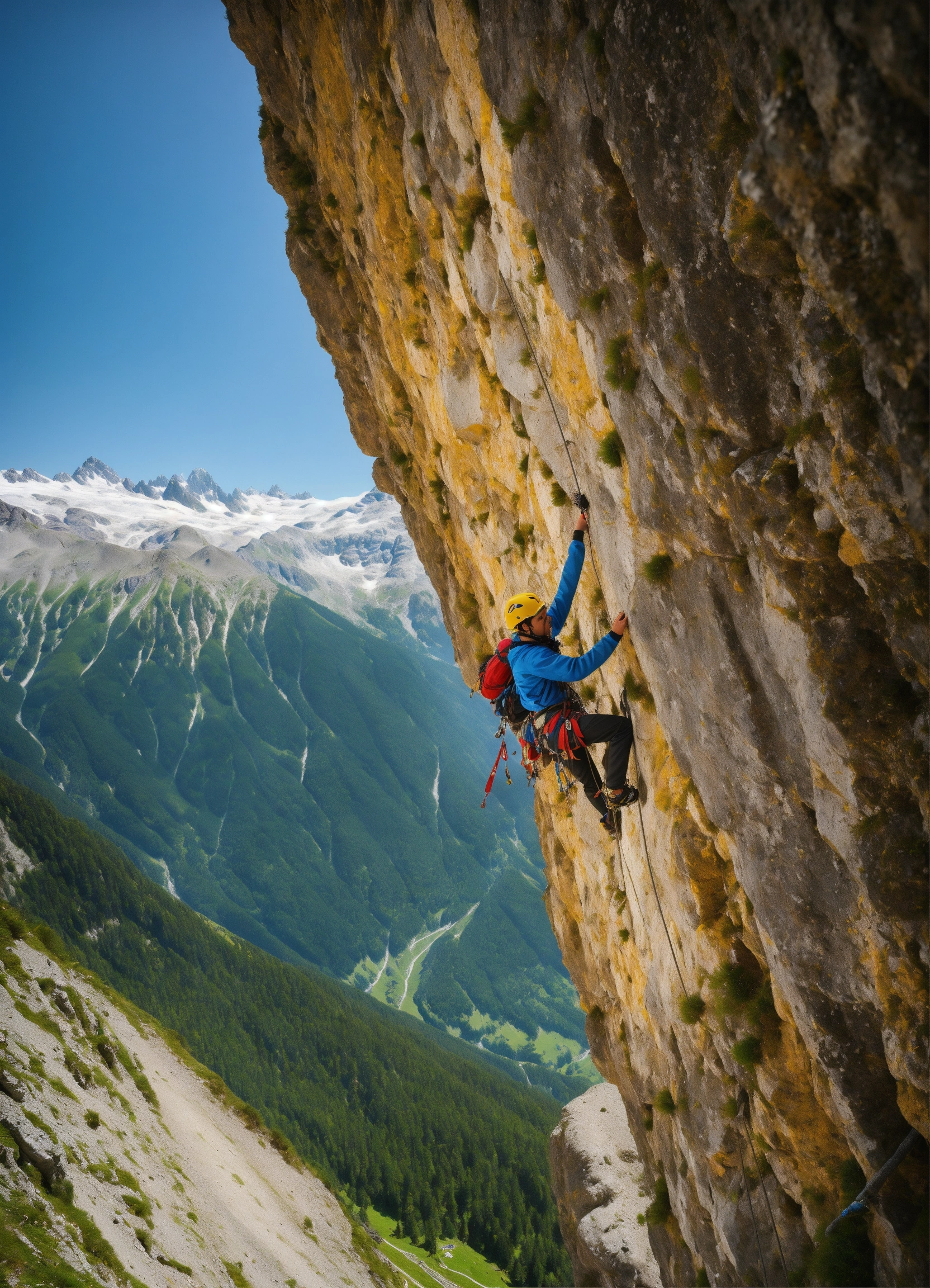 Climber climbes a high mountain alps background