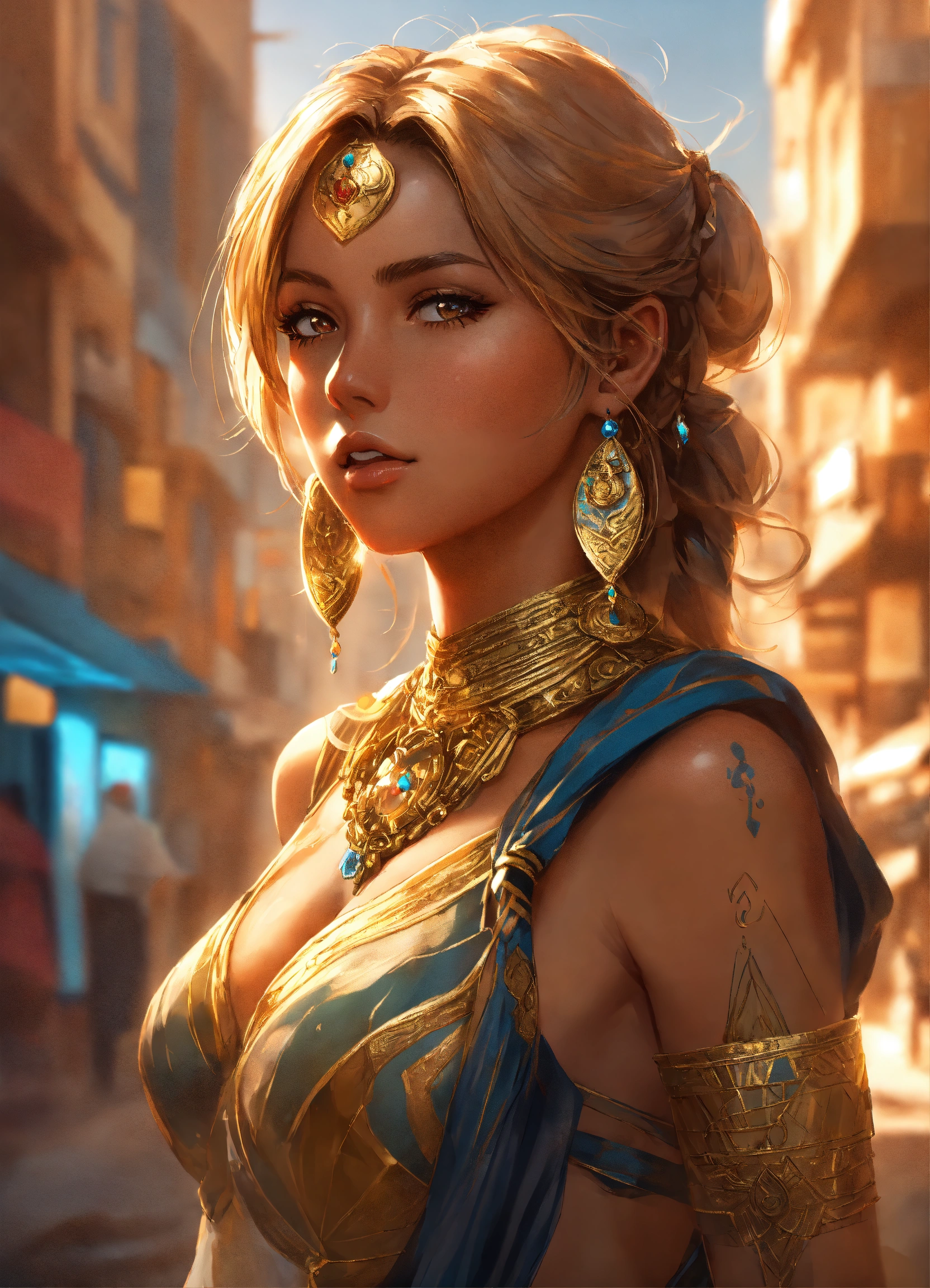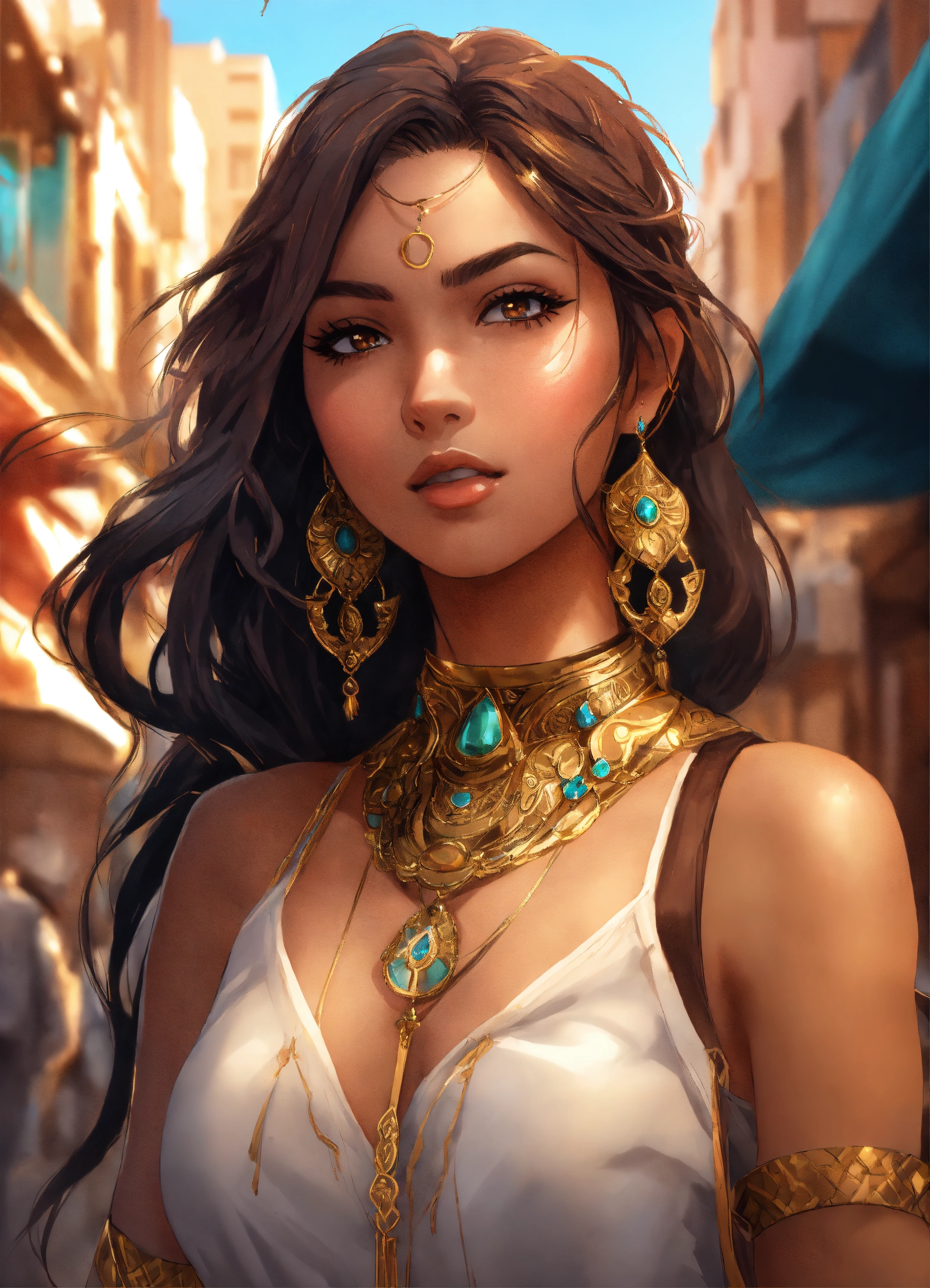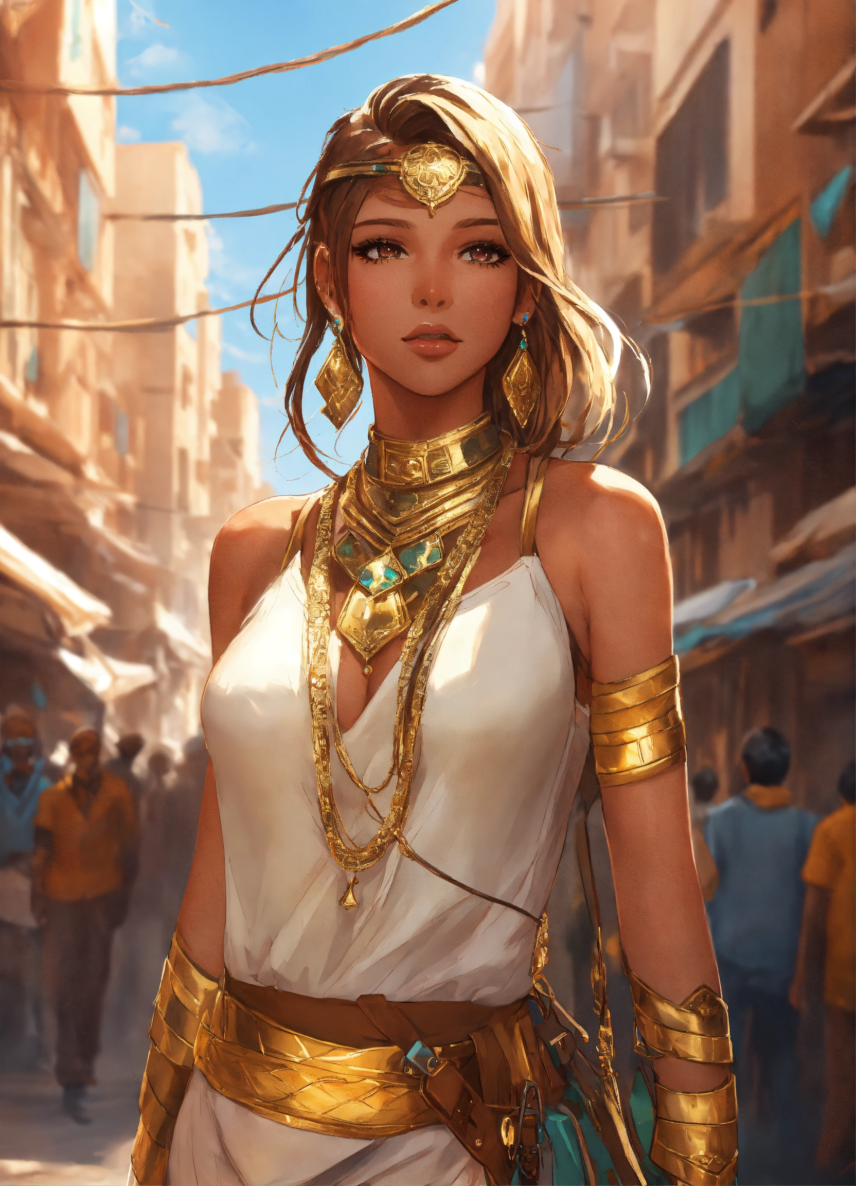 8k wallpaper of a beautiful anime adventurer girl wearing gold jewelry in the streets of a city in the western sahara, by artgerm, intricate detail, trending on artstation, 8k, fluid motion, stunning shading