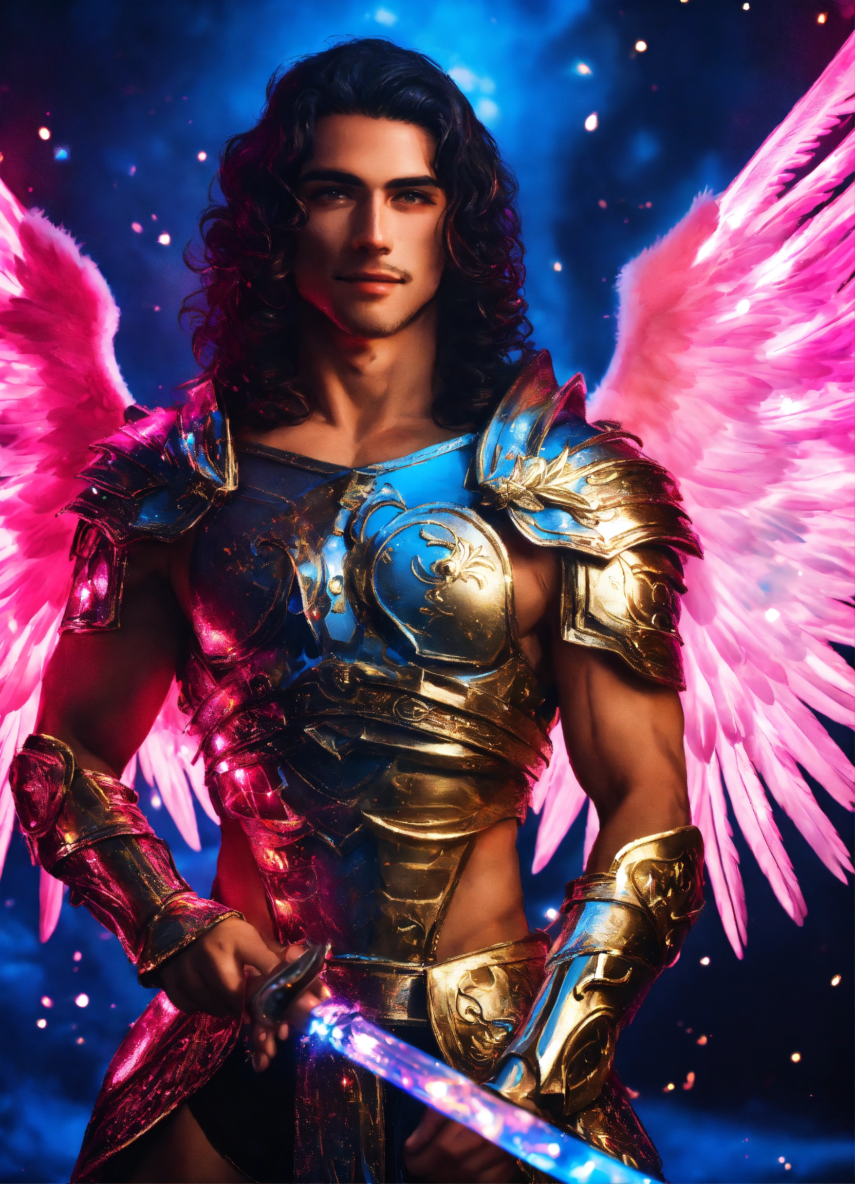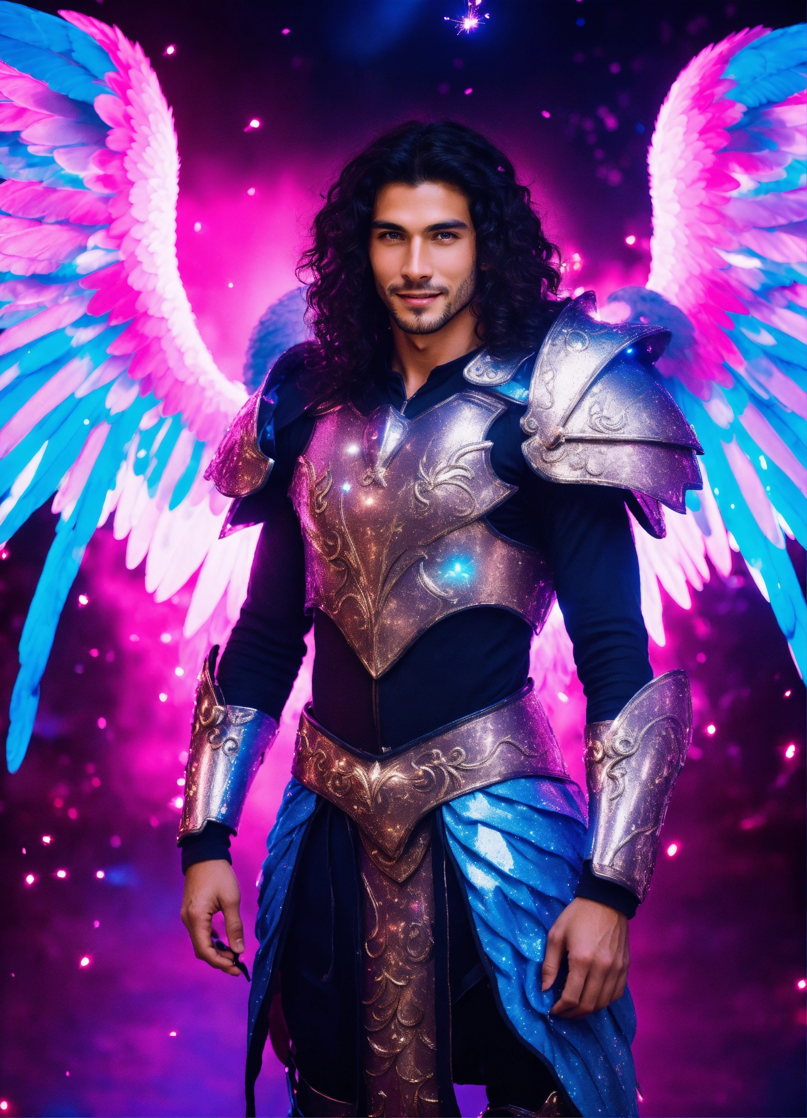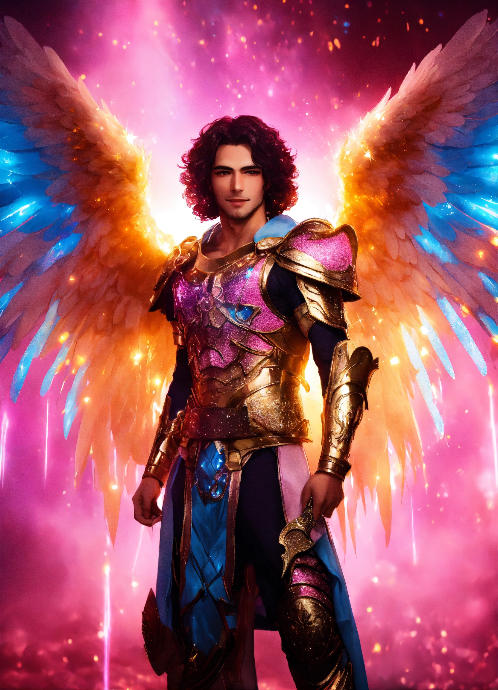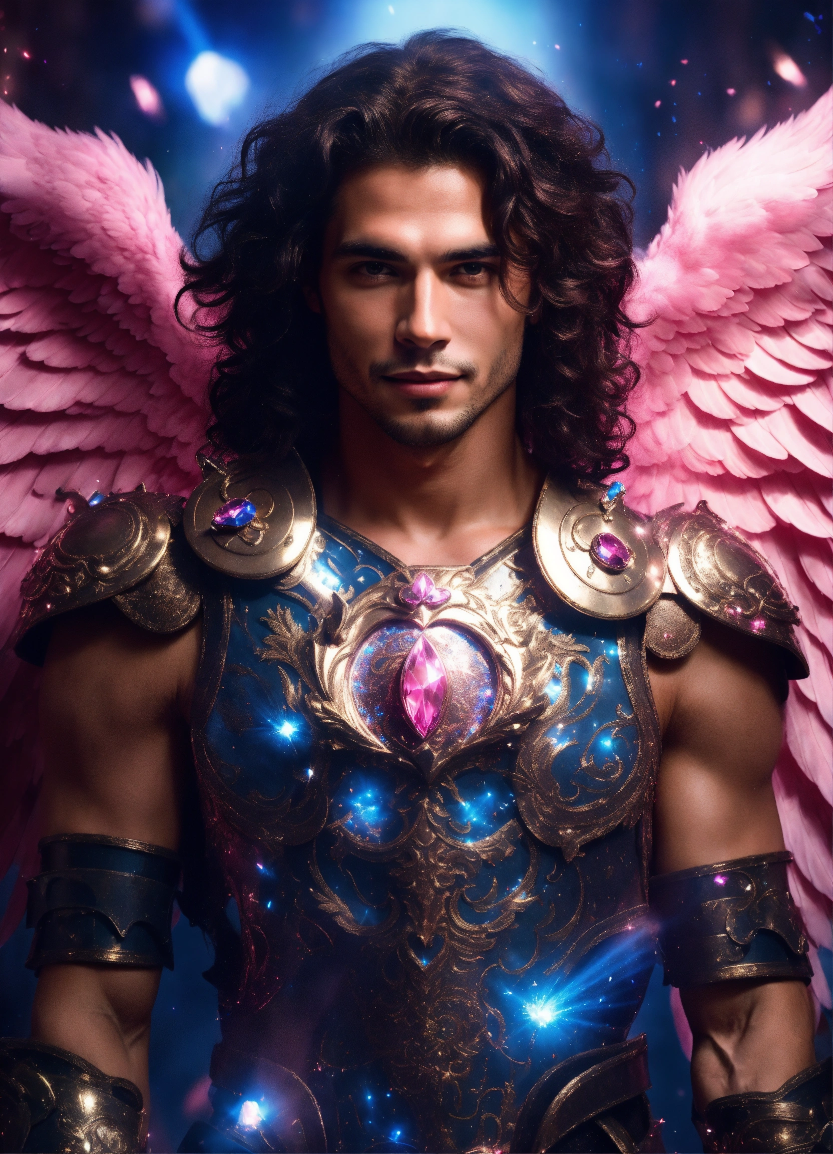Photographic portrait of robust fit masculine archangel of love with massive angel wings, background is swirling explosions of sparkling hearts sparkles, 25 year old israeli extremely handsome model male, magical loving light, channeling god's pink and blue sparks of light, loving, caring, promising a soulmate, love warrior, bright smile, facing forward and staring intensely at camera as if listening intently to me, holding a caduceus staff, long curly black hair, warm brown eyes centred towards me, wearing pink and blue futuristic sparkling body warrior armour, film grain. computer-enhanced photograph magazine cover photoshoot