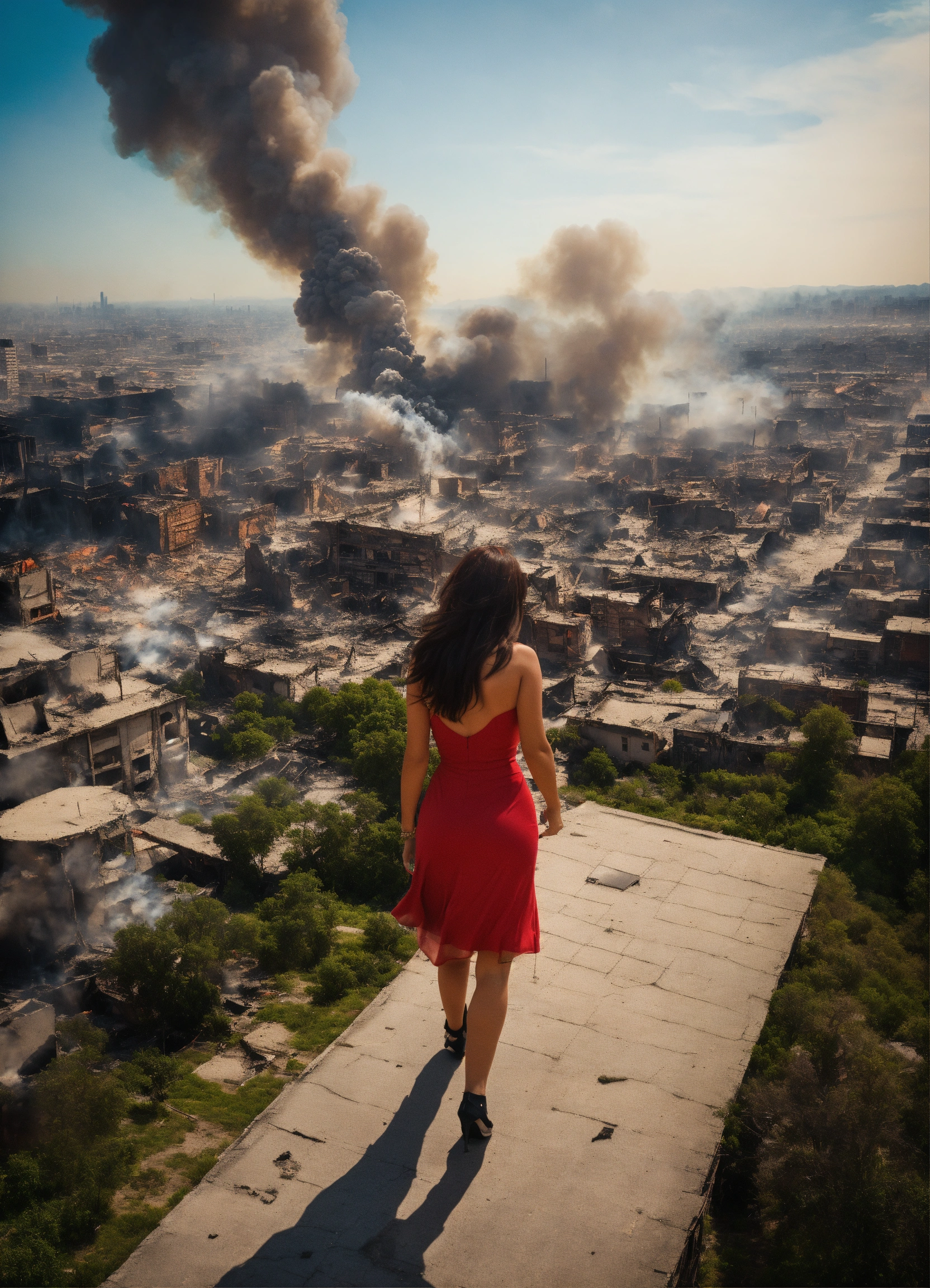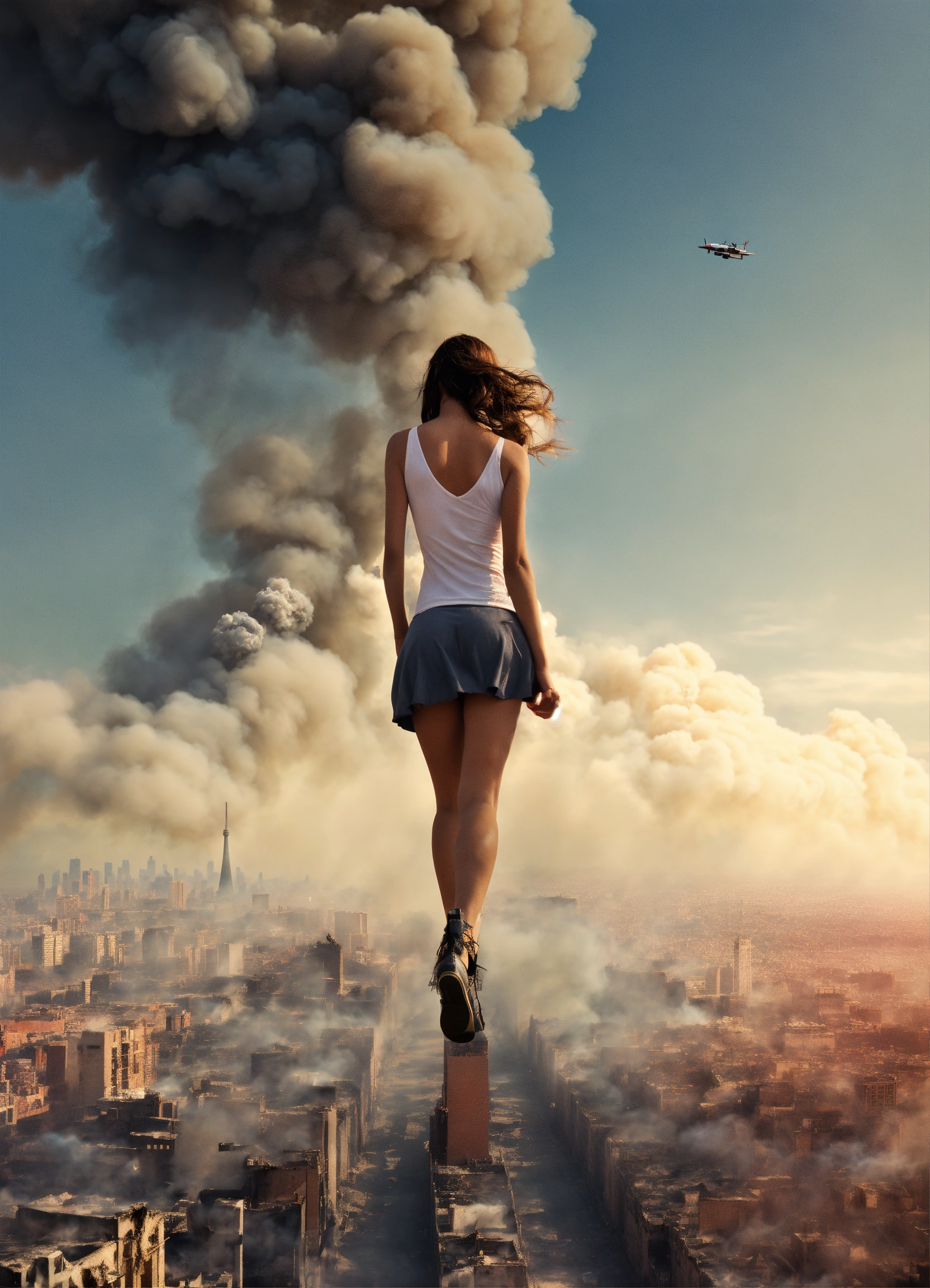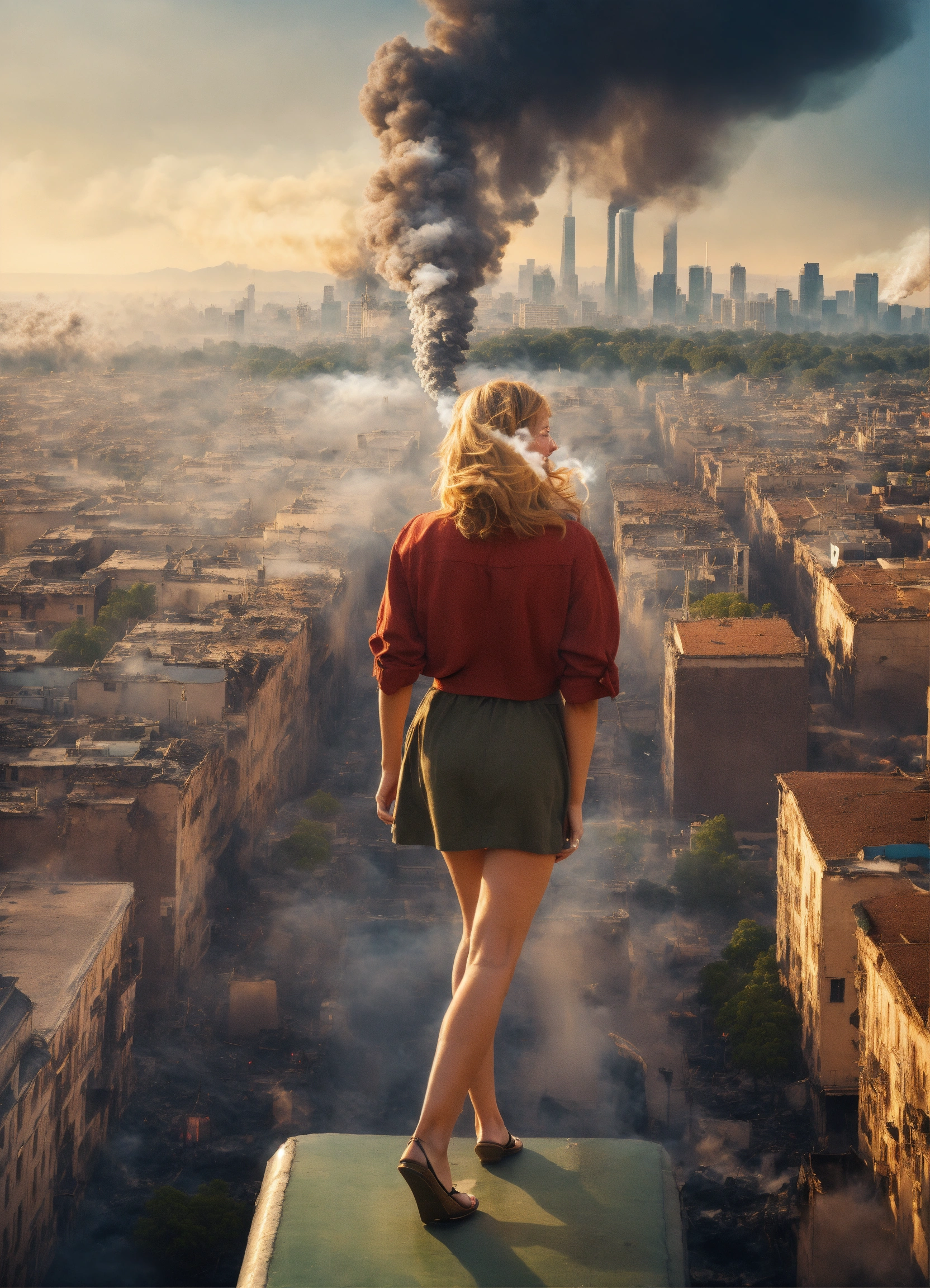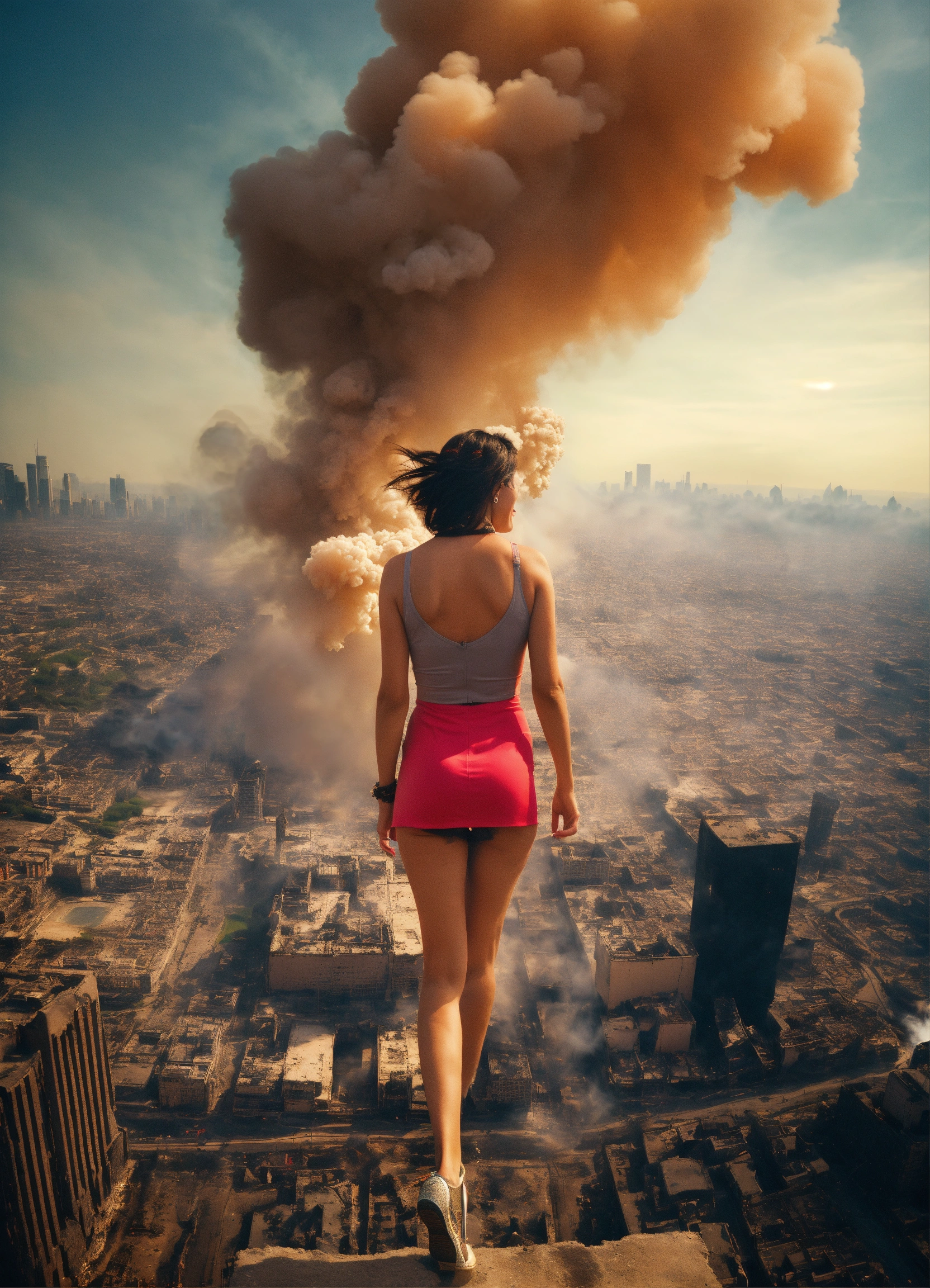 Mega giantess walking over a city (aerial view) destruction (smoke by her feet) face laughing horizon