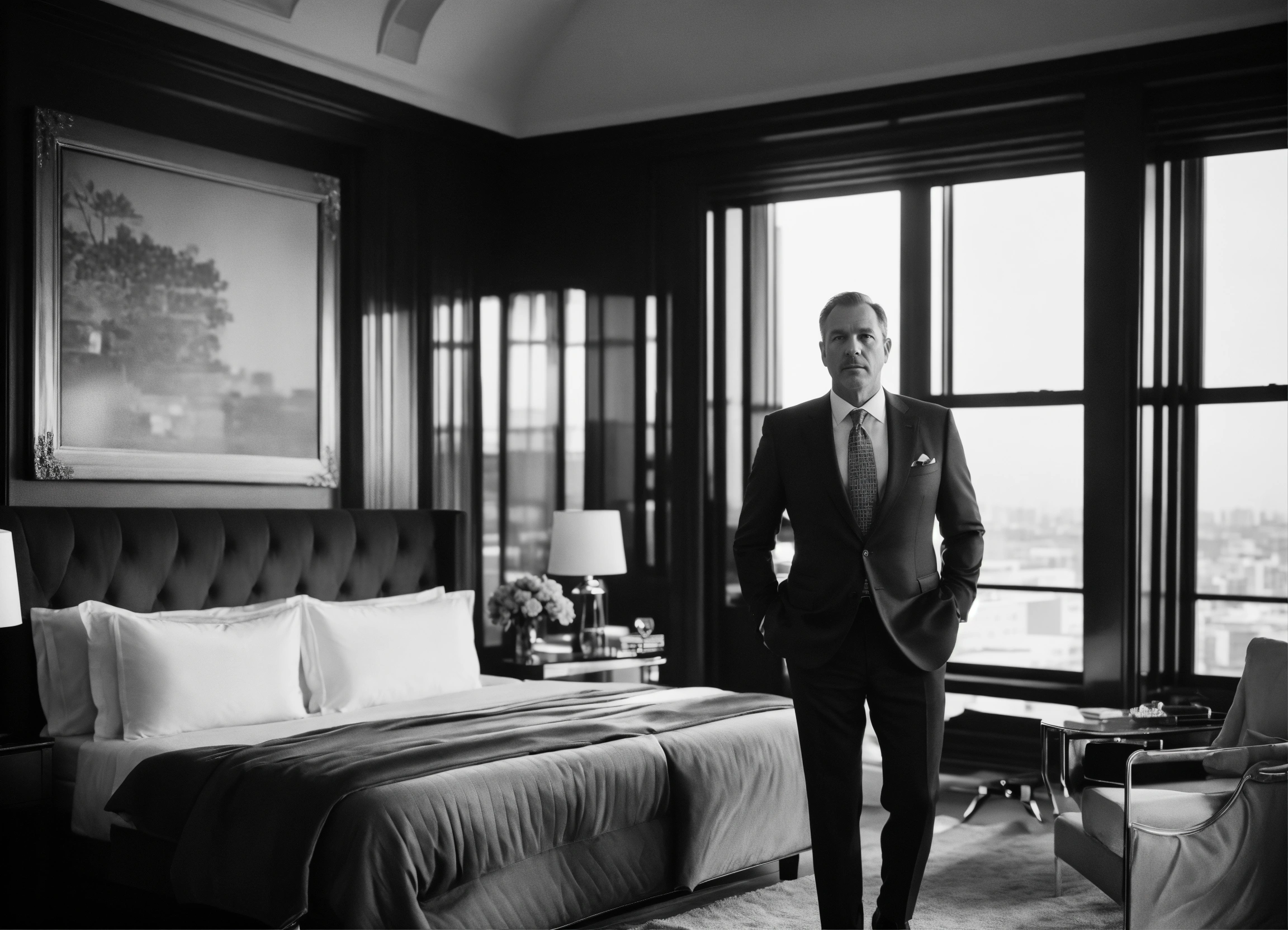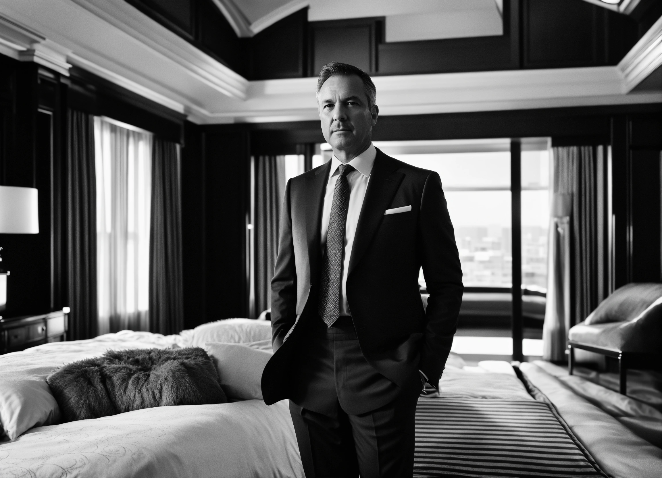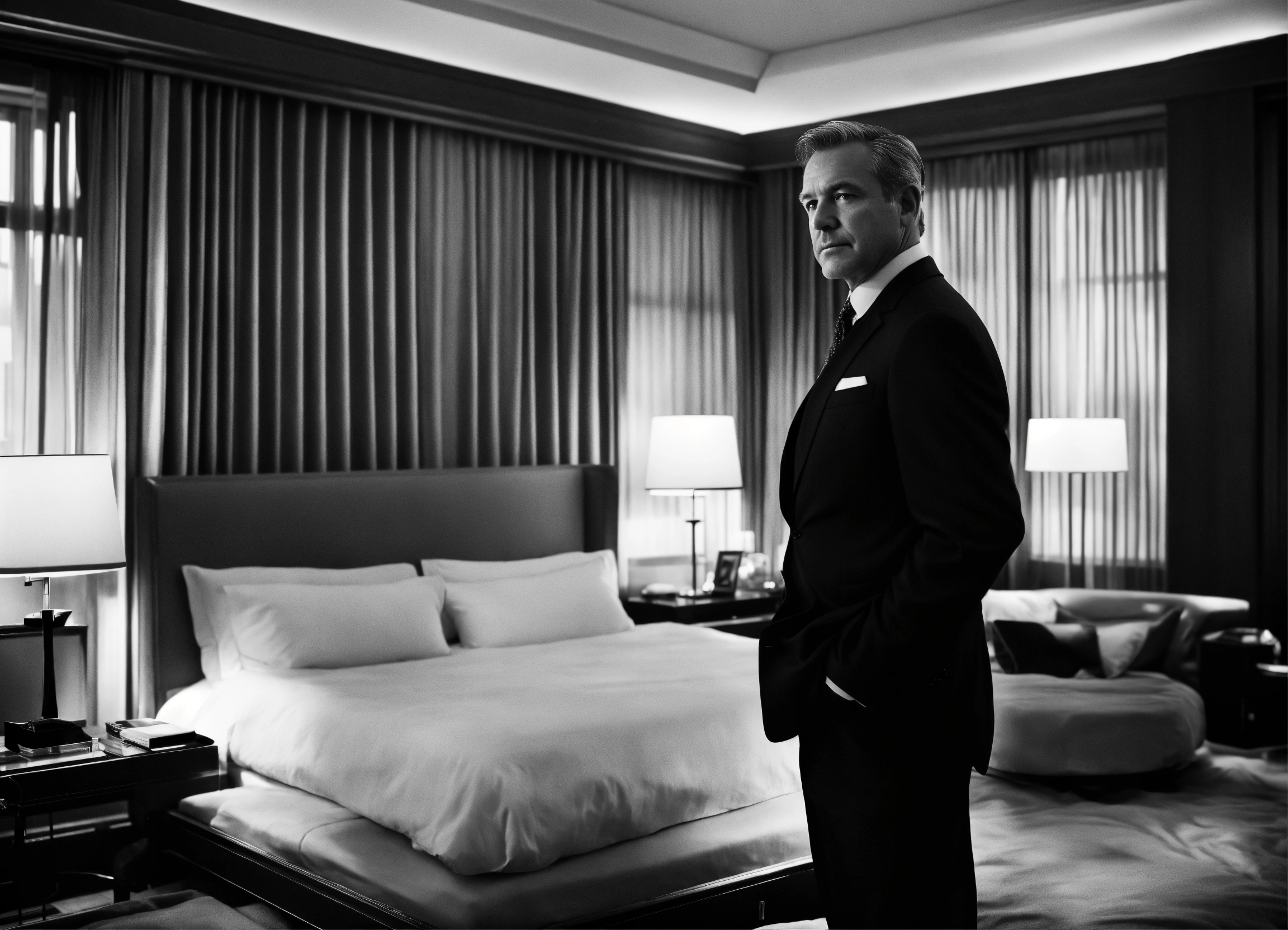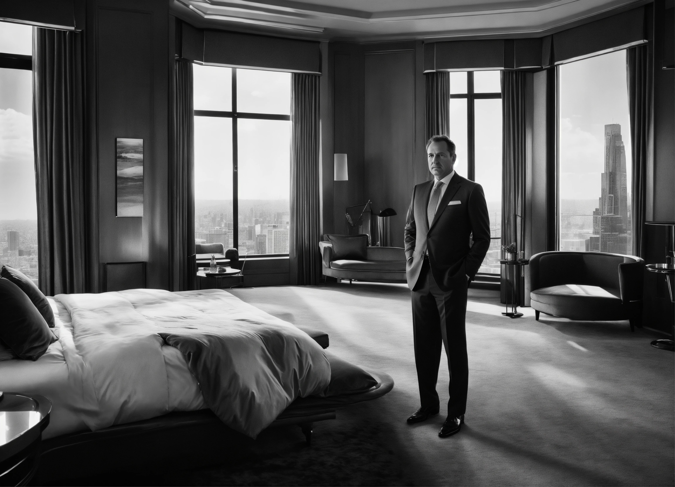 A middle-aged man in a suit and tie stands in a luxurious penthouse in front of a bed, the image is black-and-white