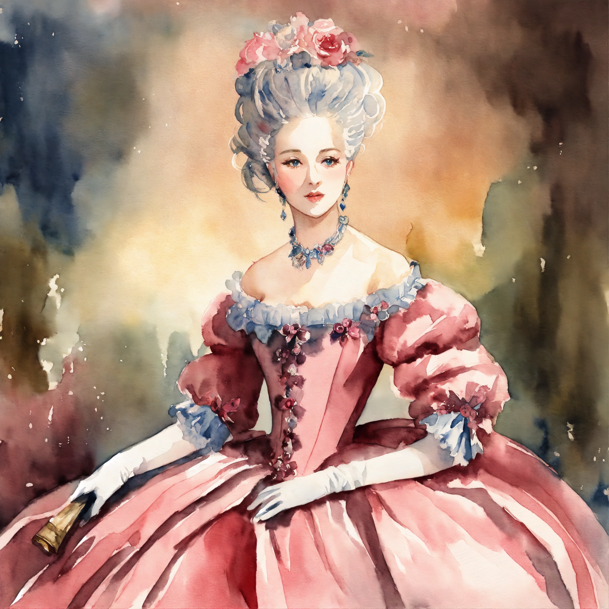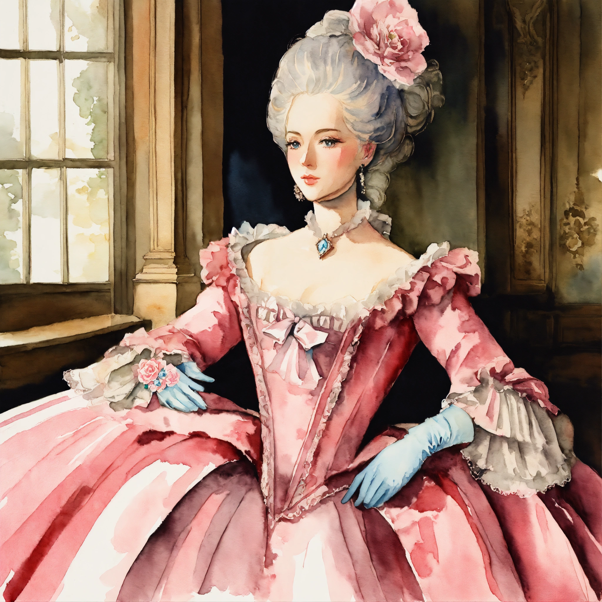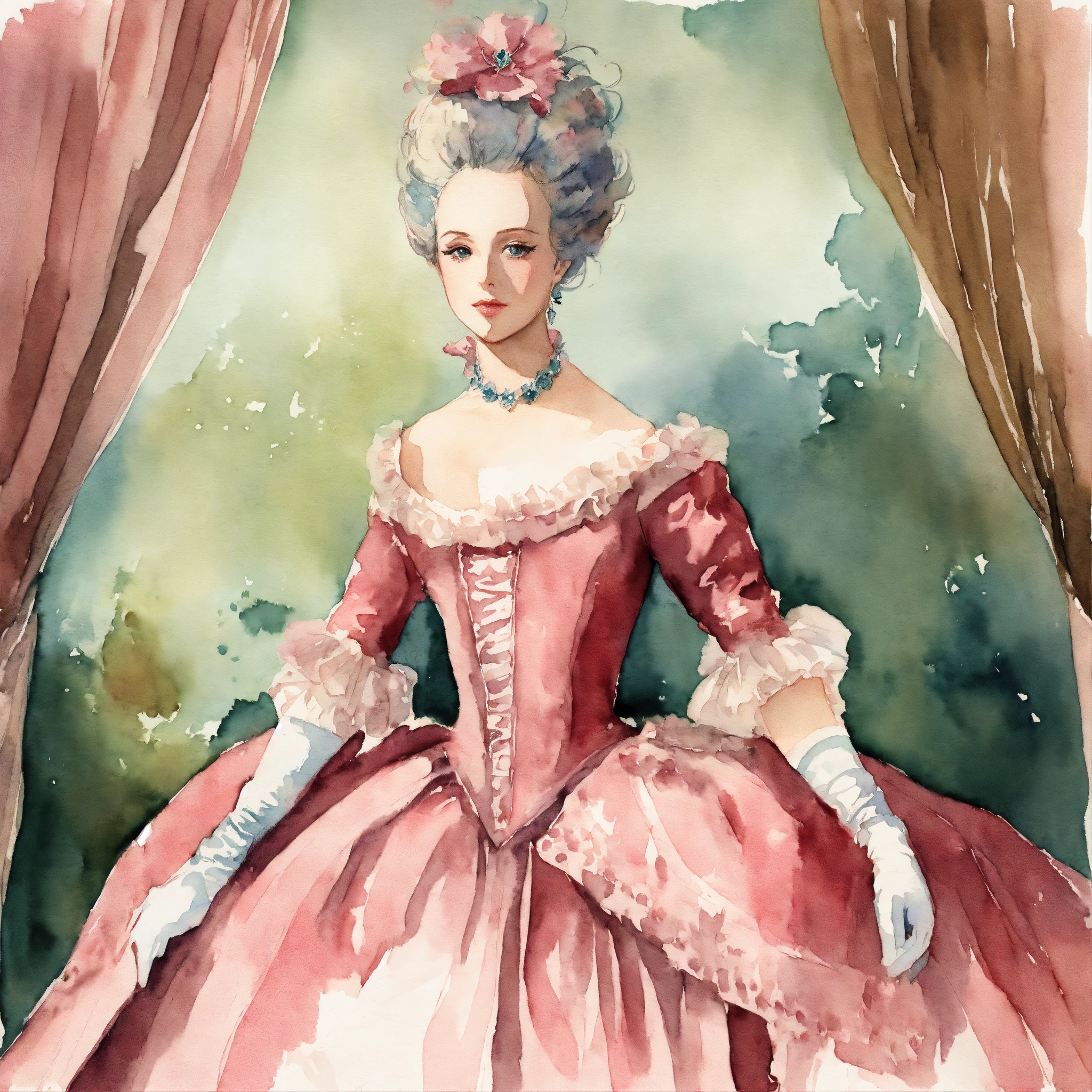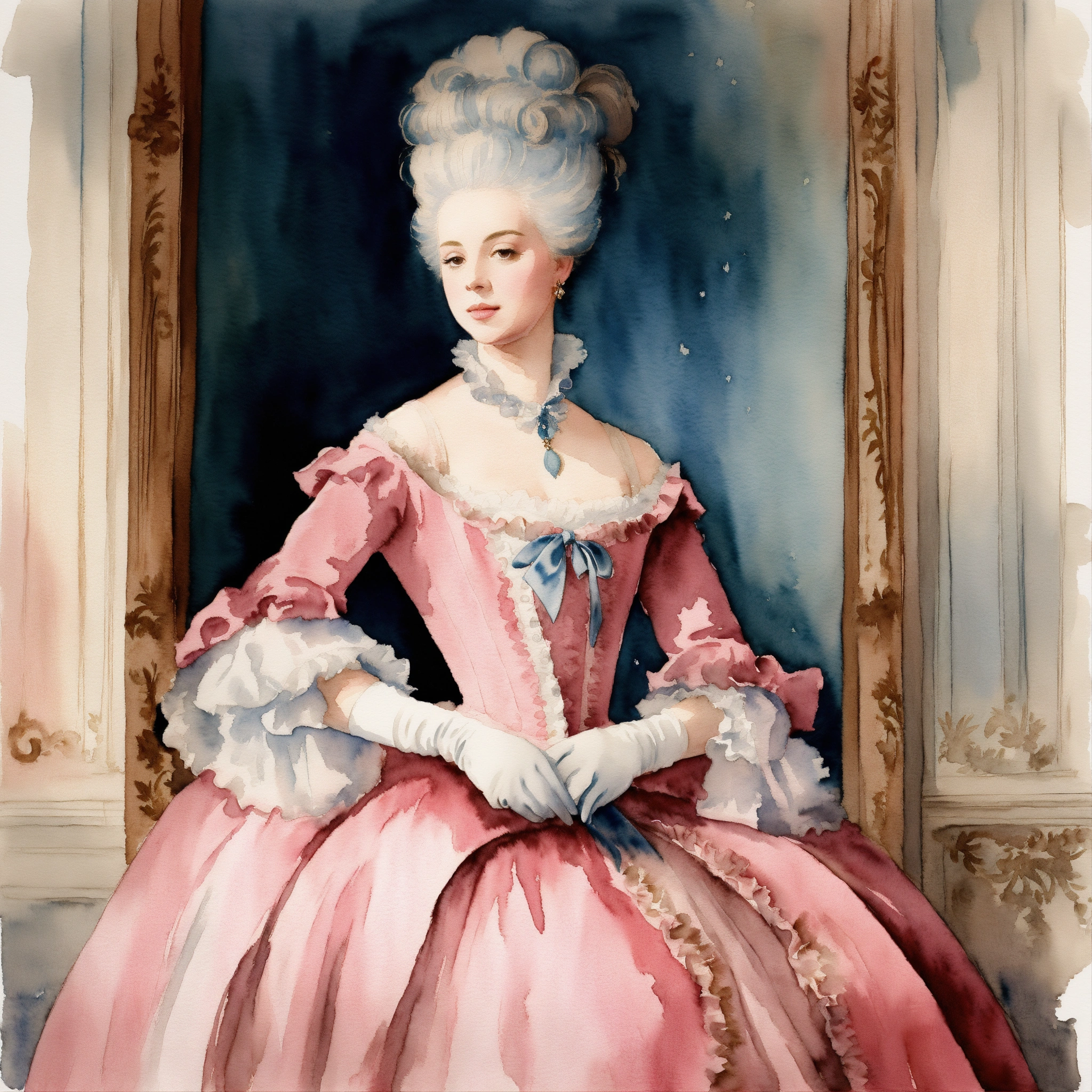 Watercolor illustration, marie antoinette wearing gloves, pink dress, muted colors, isolated on white background