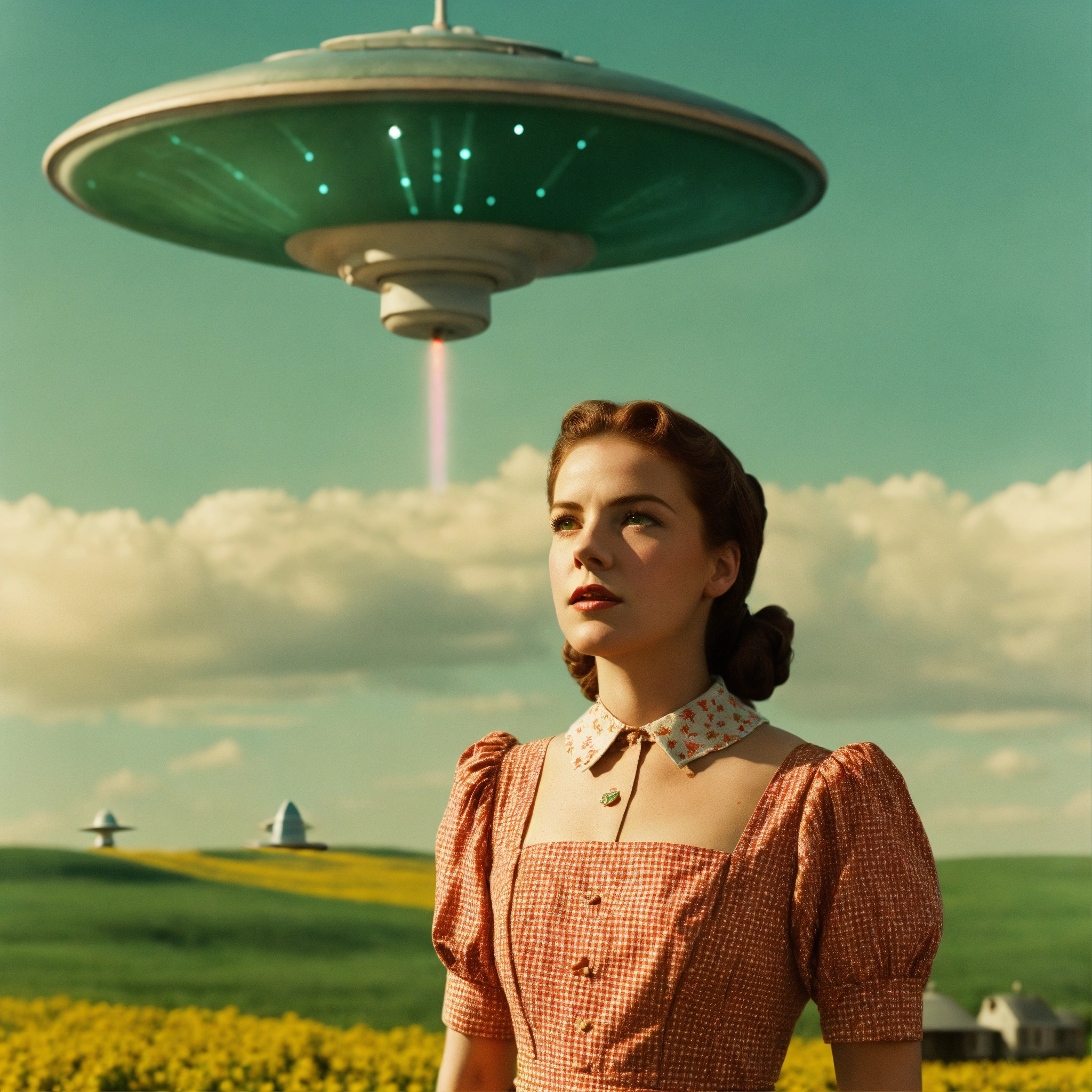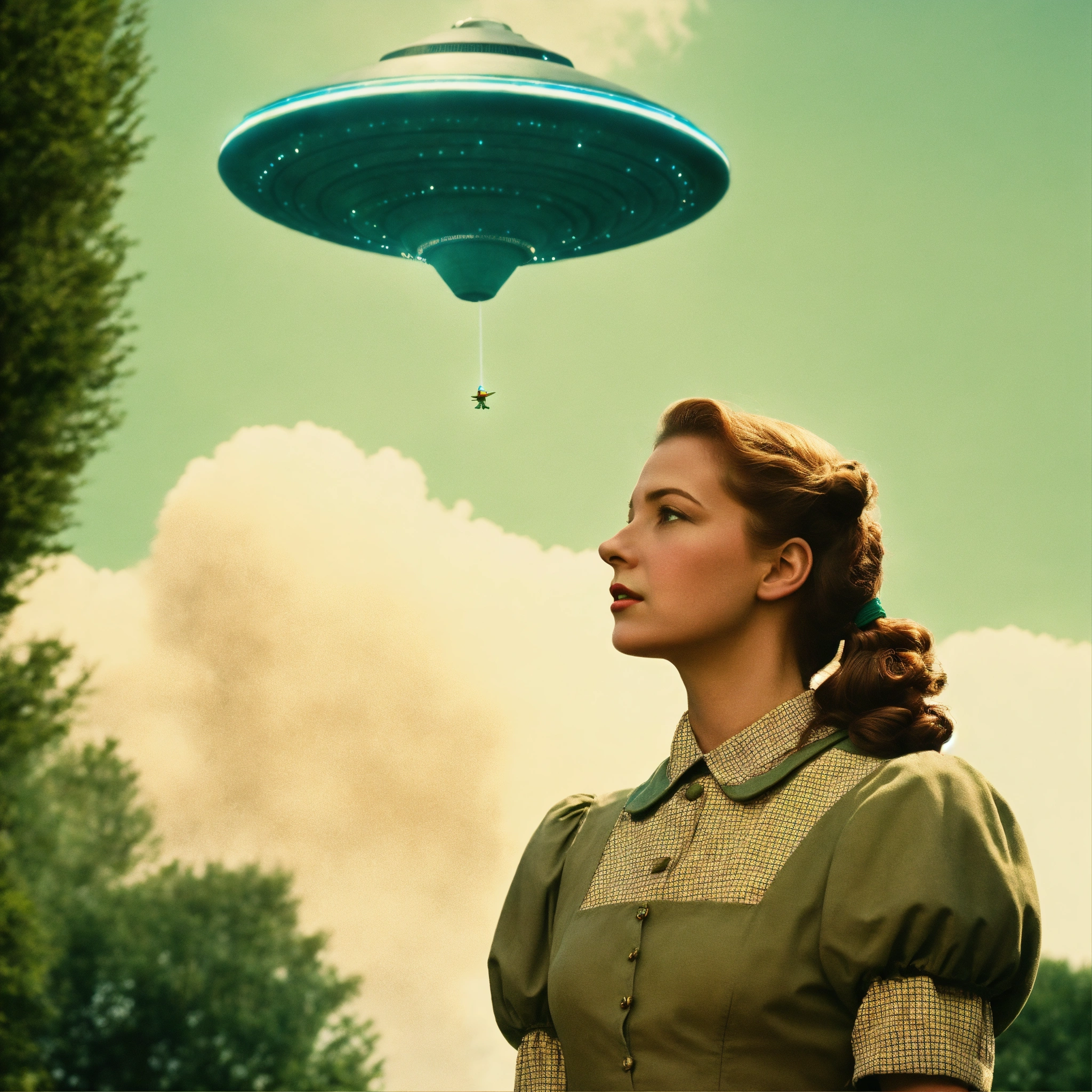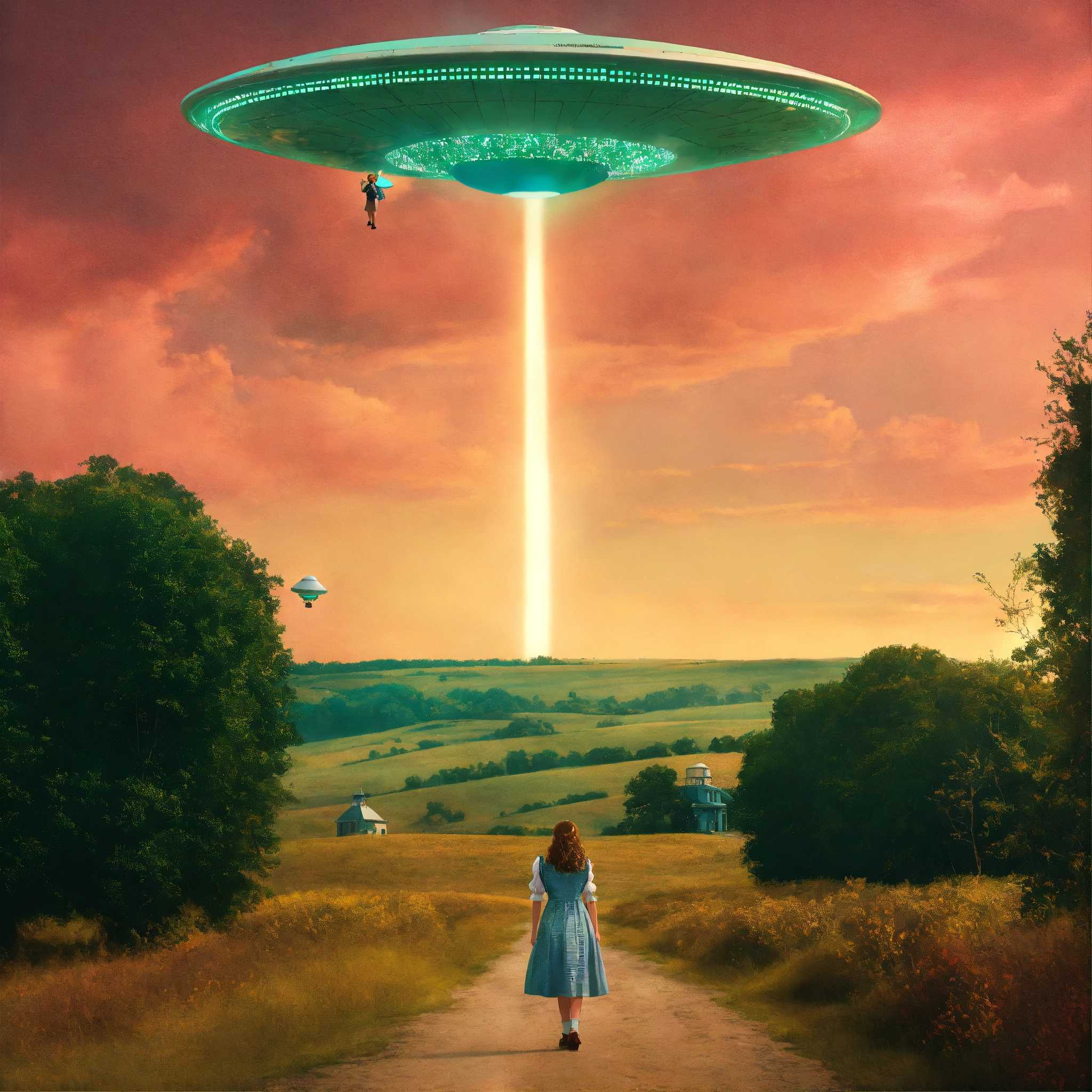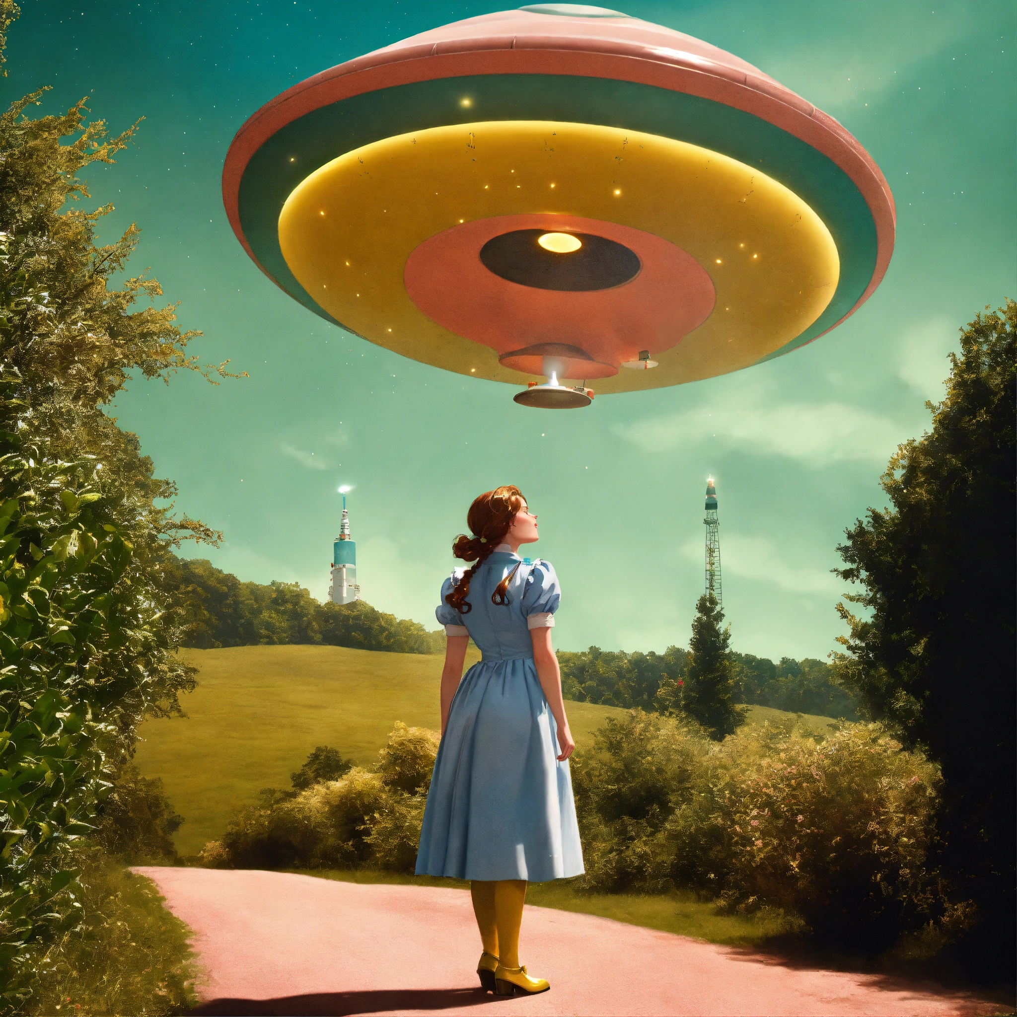 A realistic photograph of dorothy in the wizard of oz looking up at a ufo in the sky, retro-futuristic, wes anderson colour palette