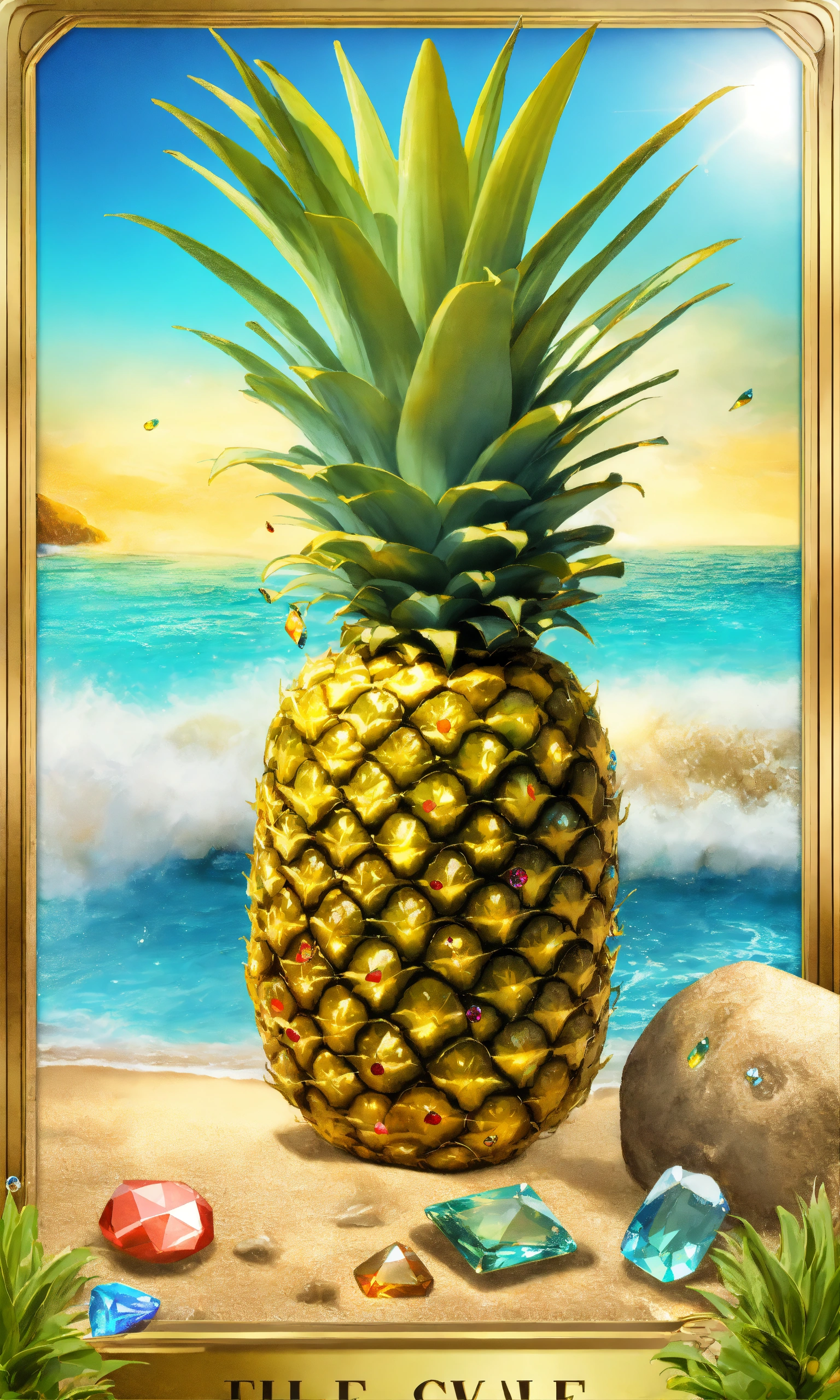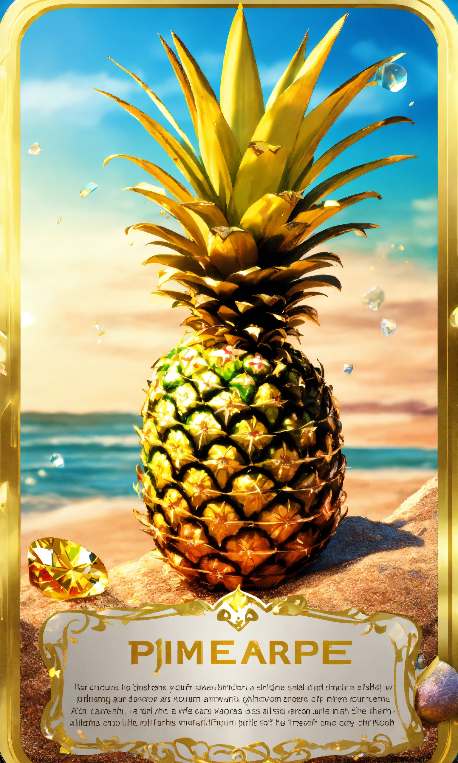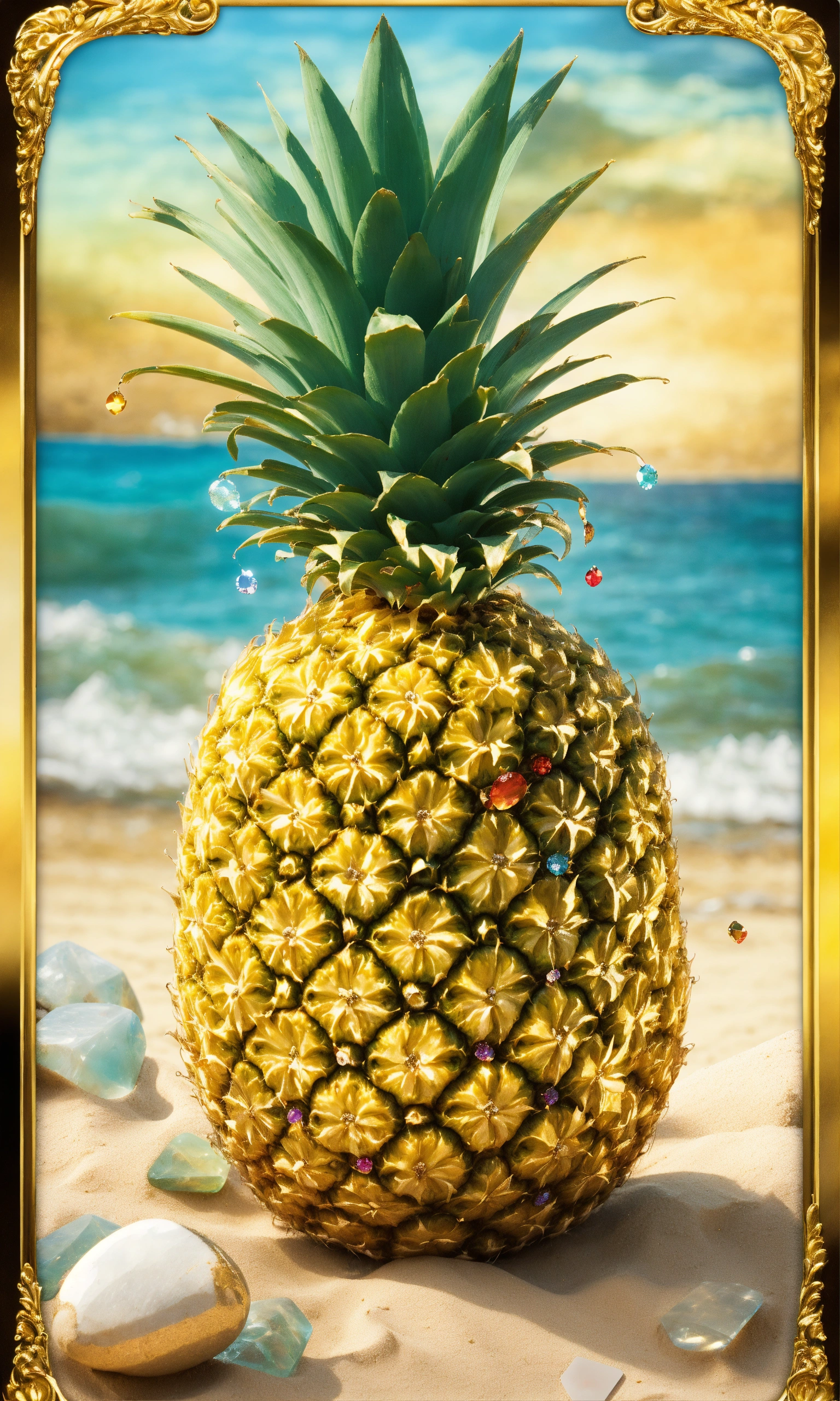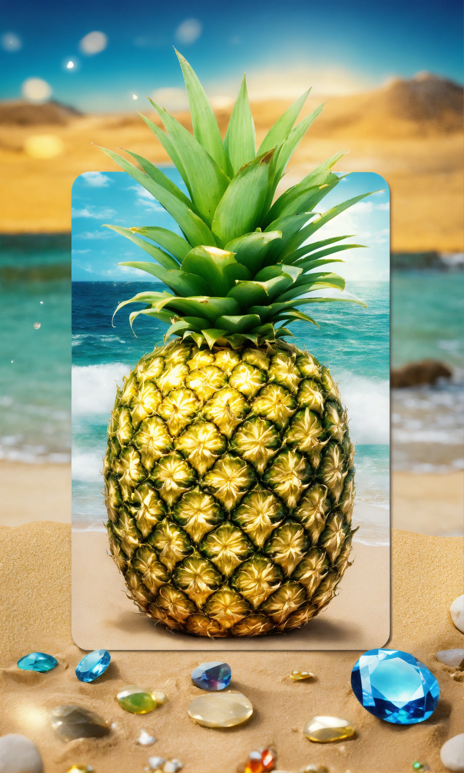 Realistic, trading card, template, layout, with pineapple, ocean, gold, gemstones on the beach, treasures, hd, 4k, playing card