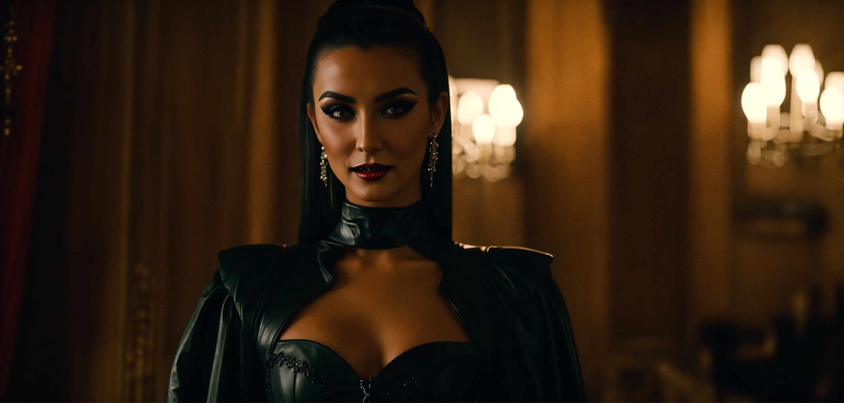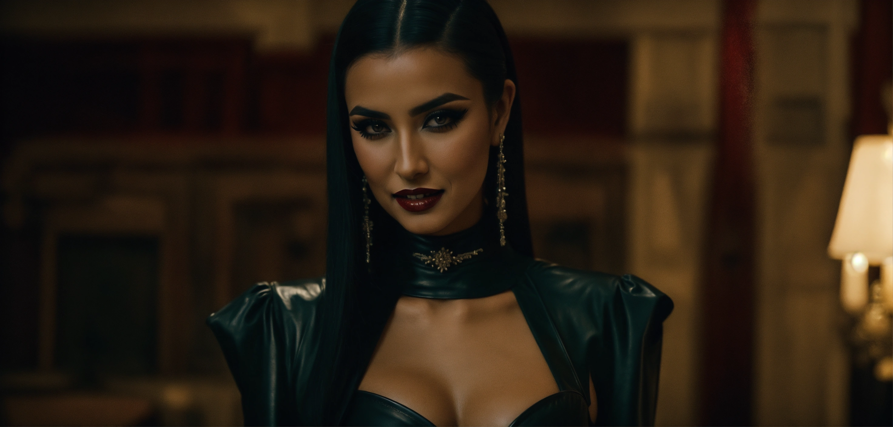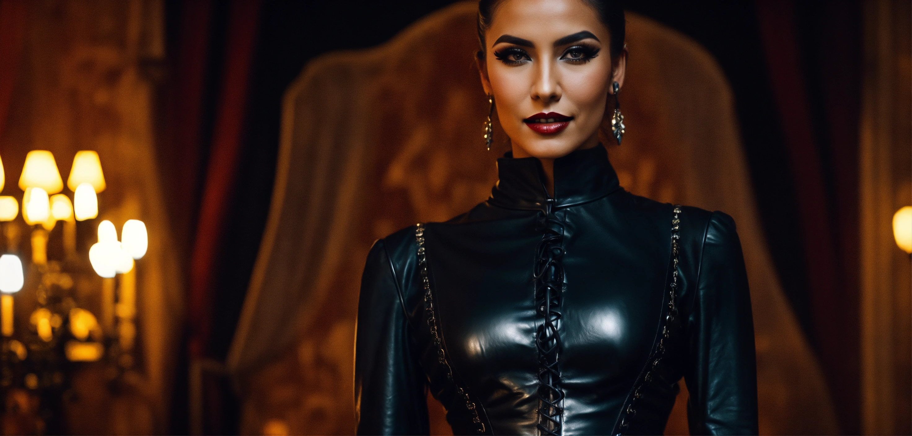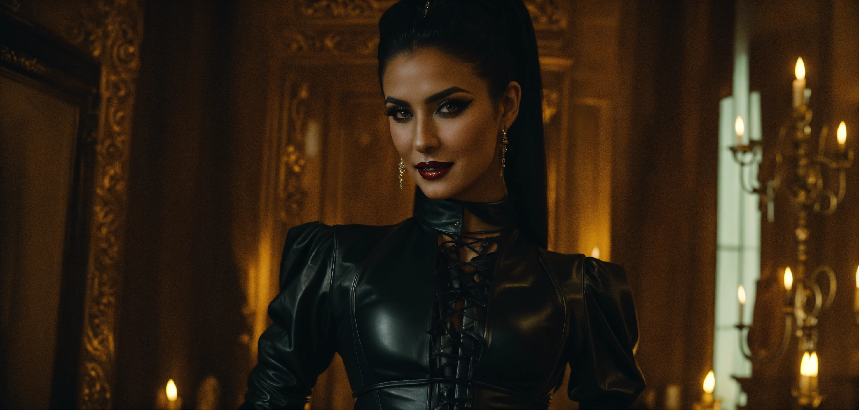 Cinematic vampire underworld movie look, stunning arab woman fashion model, head slightly tilted, looking arrogant evil smile, straight black high ponytail hair, eyeliner makeup, strict black leather dress with big long puff sleeves, black leather waist corset, french mansion room by night, haze