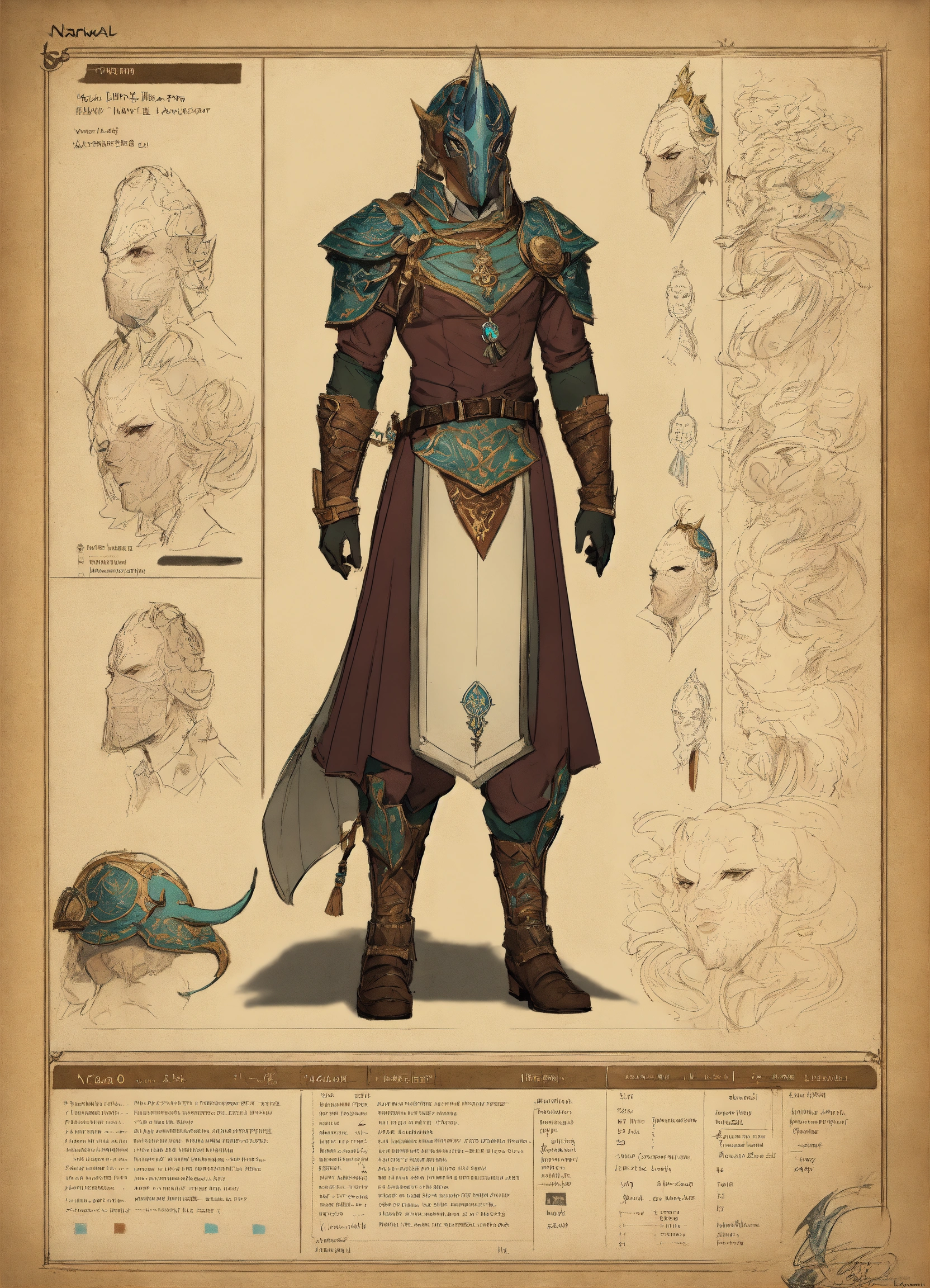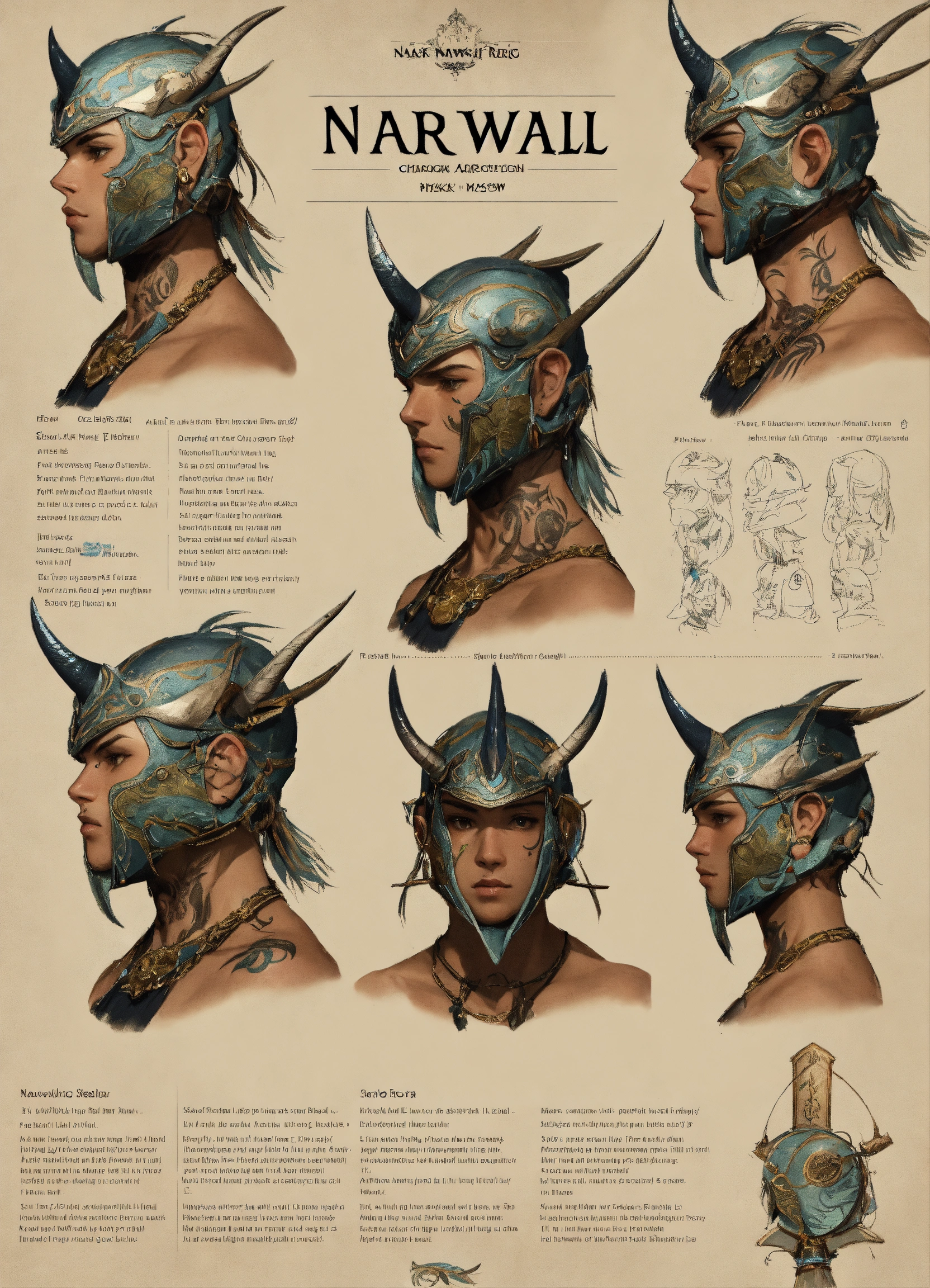 Narwal tattoo mask, character sheet, character design, chart, reference sheet, multiple views, high detail, fine details, concept art