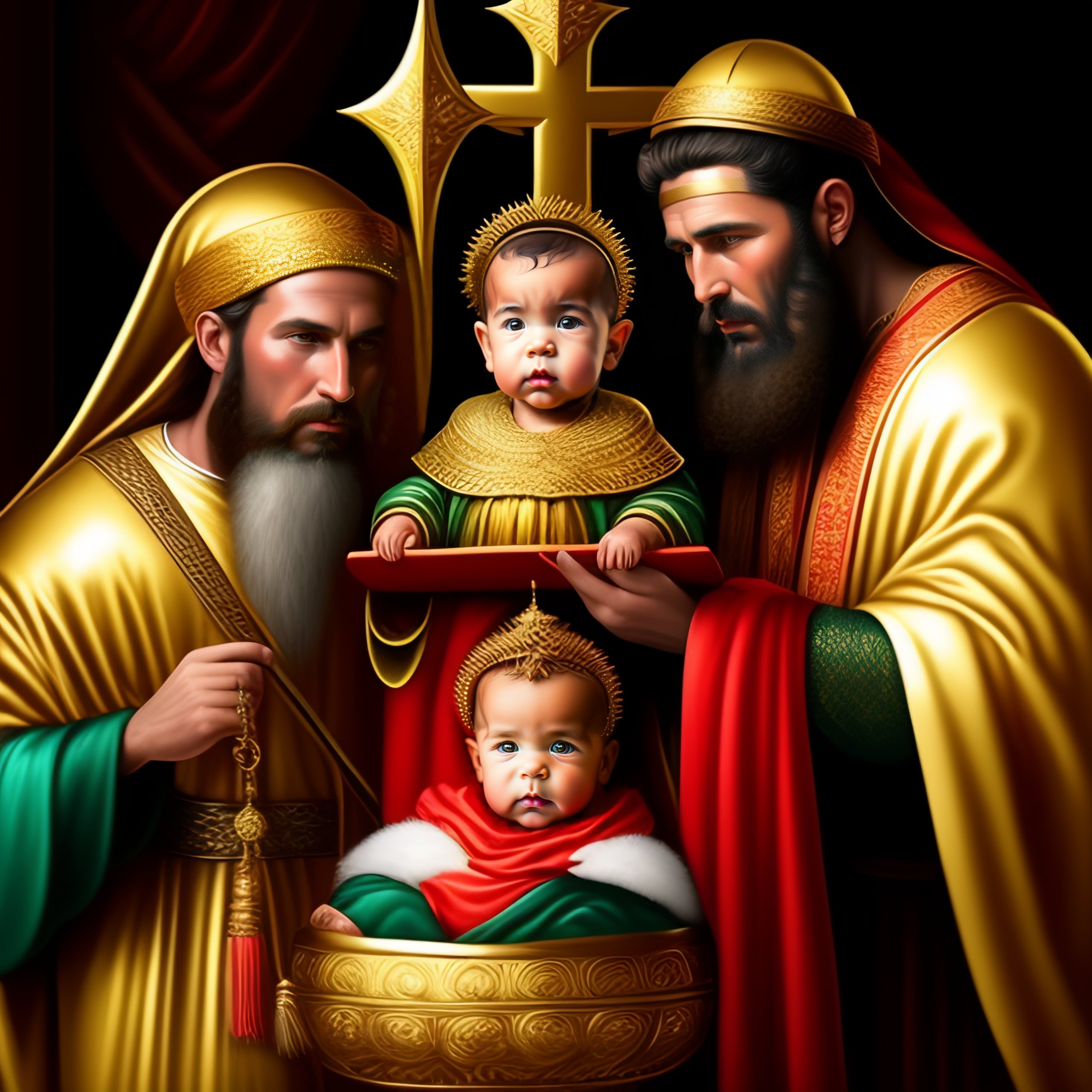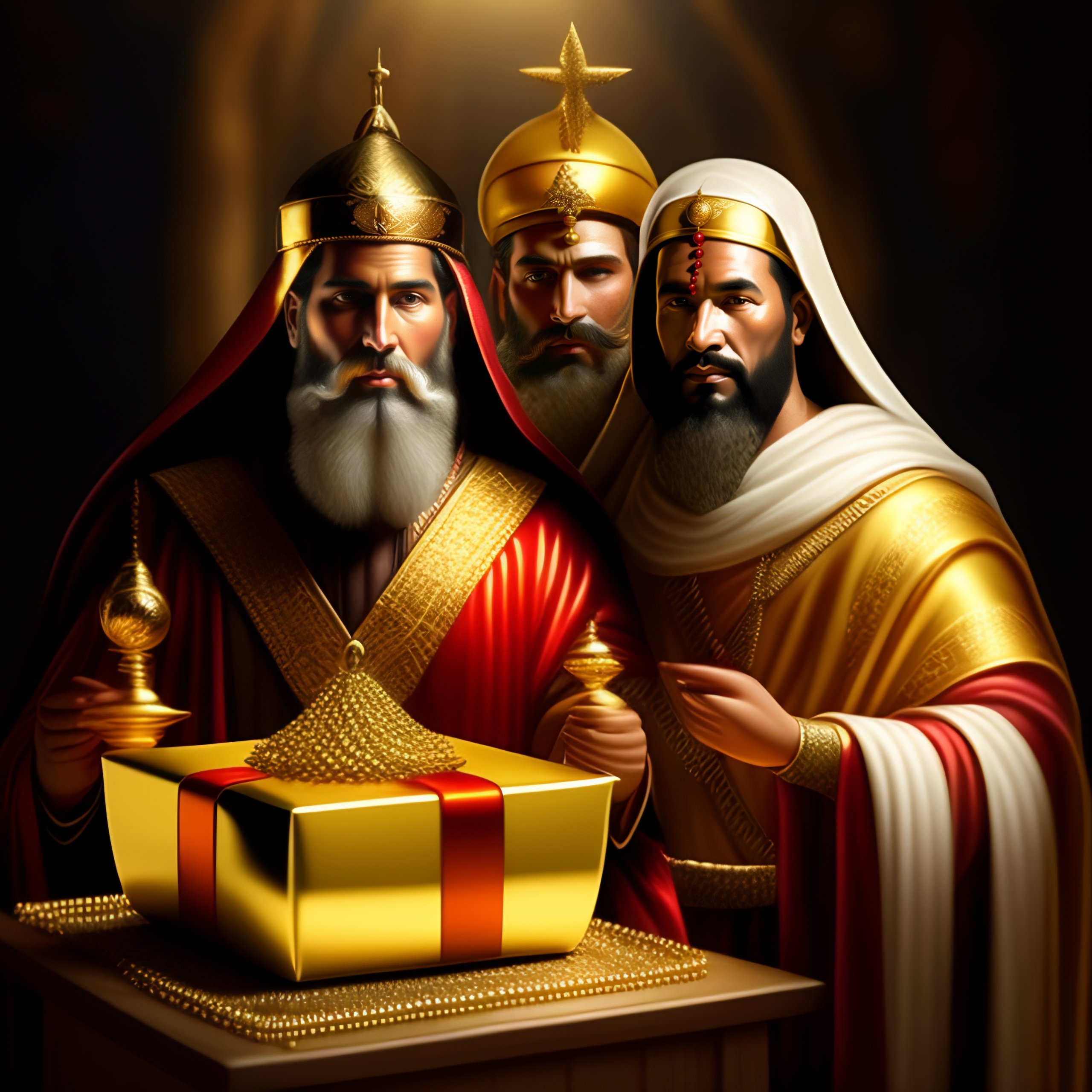 Generate a portrait of the three wise men from the bible, depicted as they present their gifts of gold, frankincense, and myrrh to the newborn baby jesus in bethlehem. horror and devil style