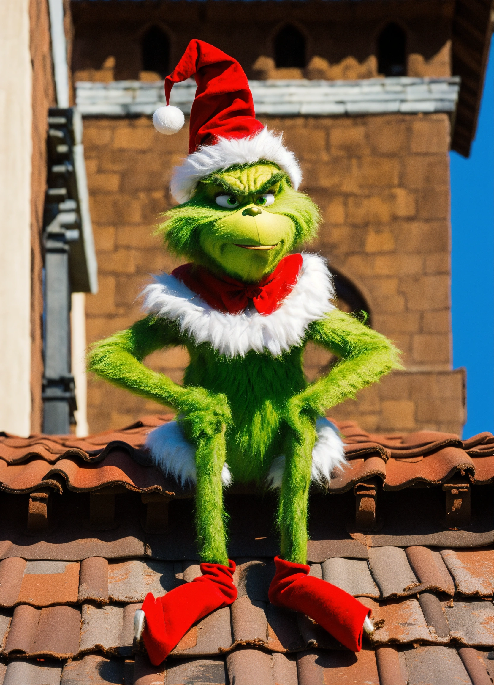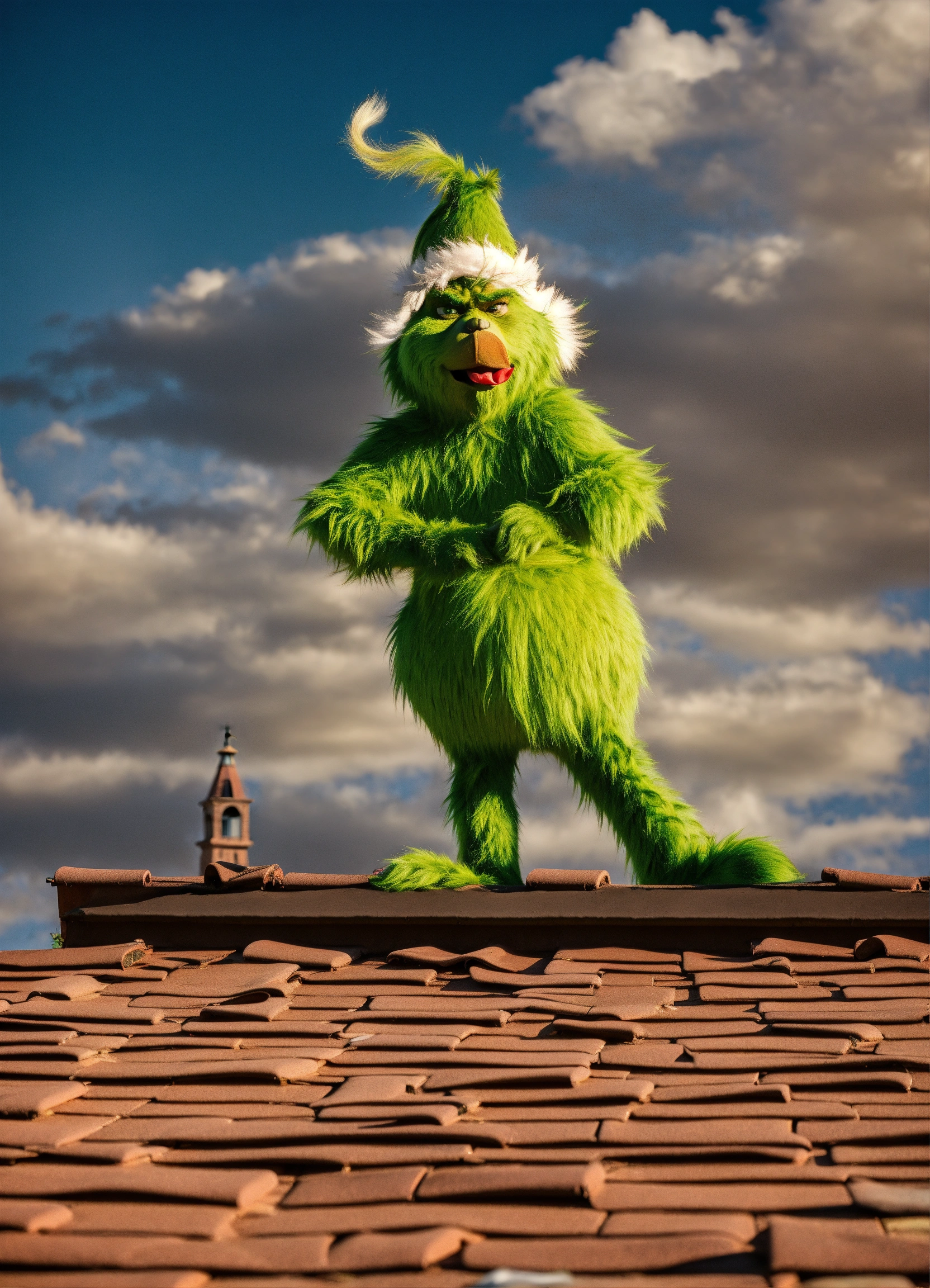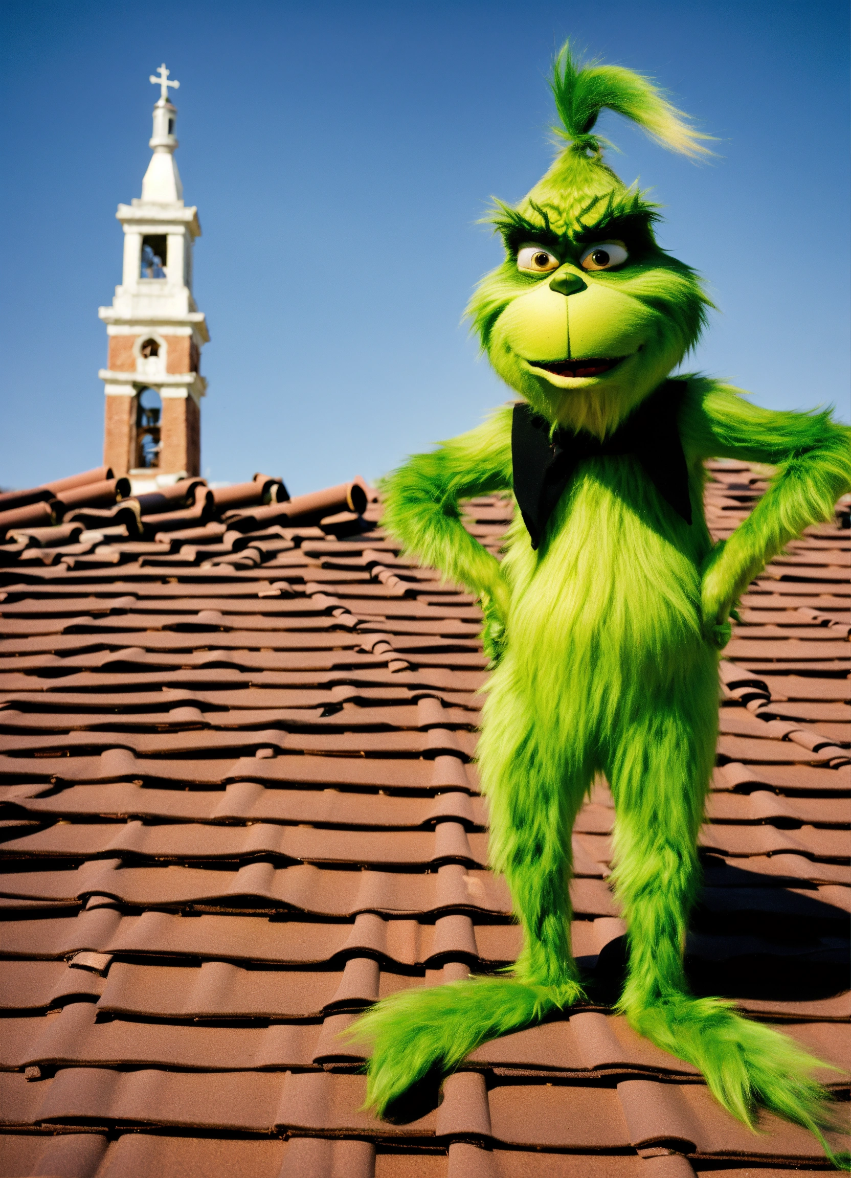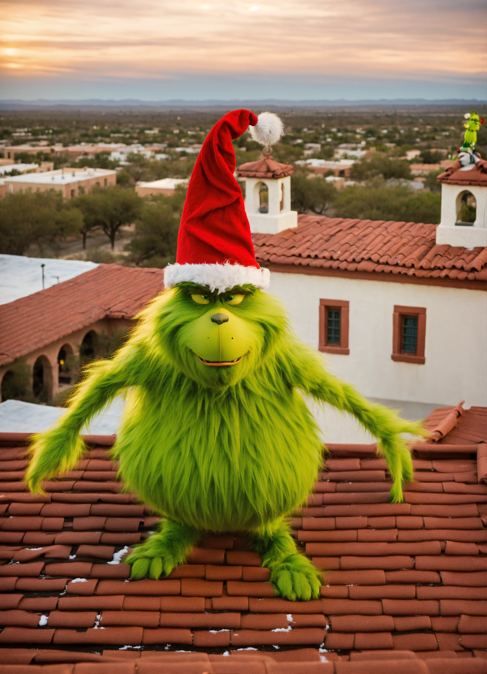 The grinch standing on roof tiles of a spanish mission, lubbock high school bell tower in the background