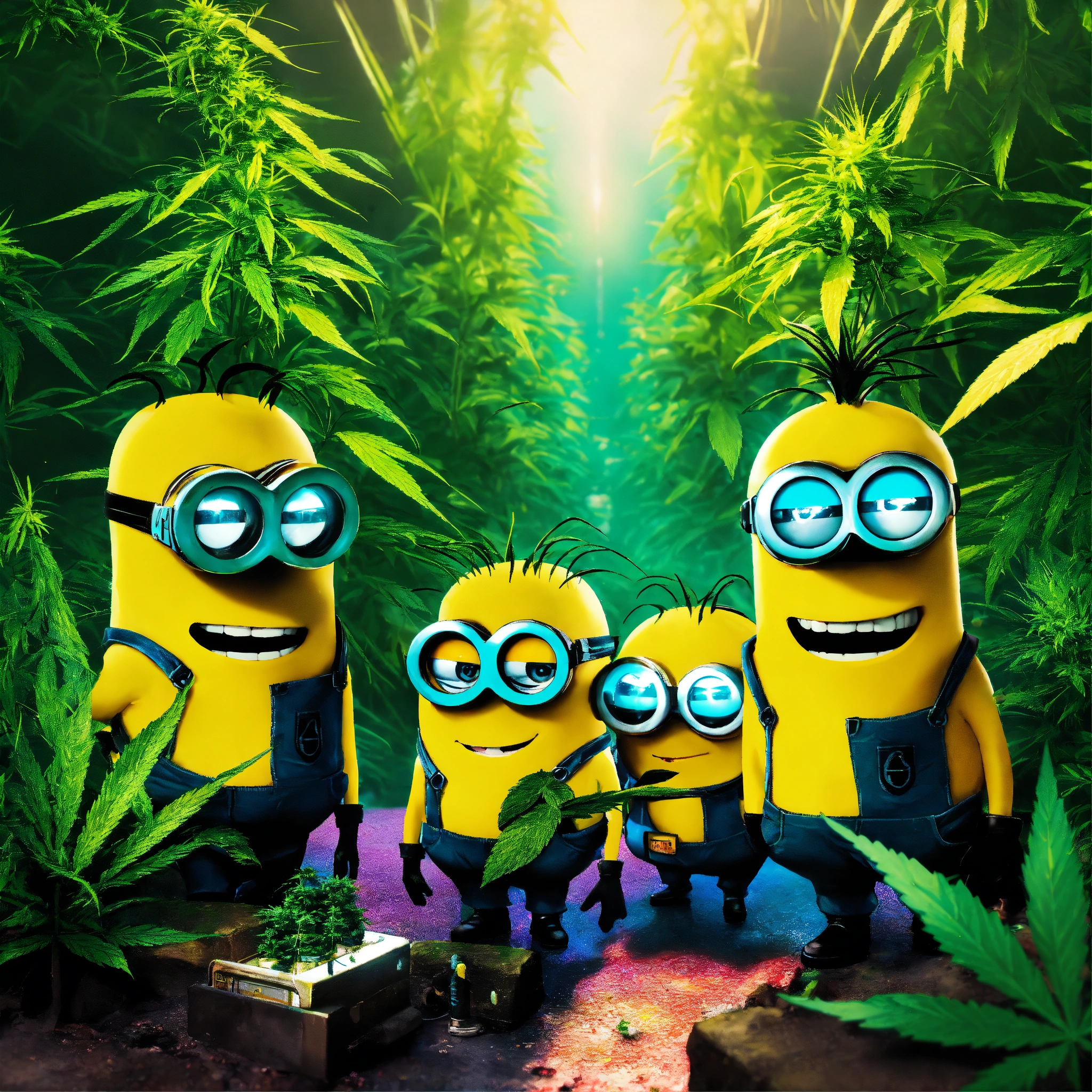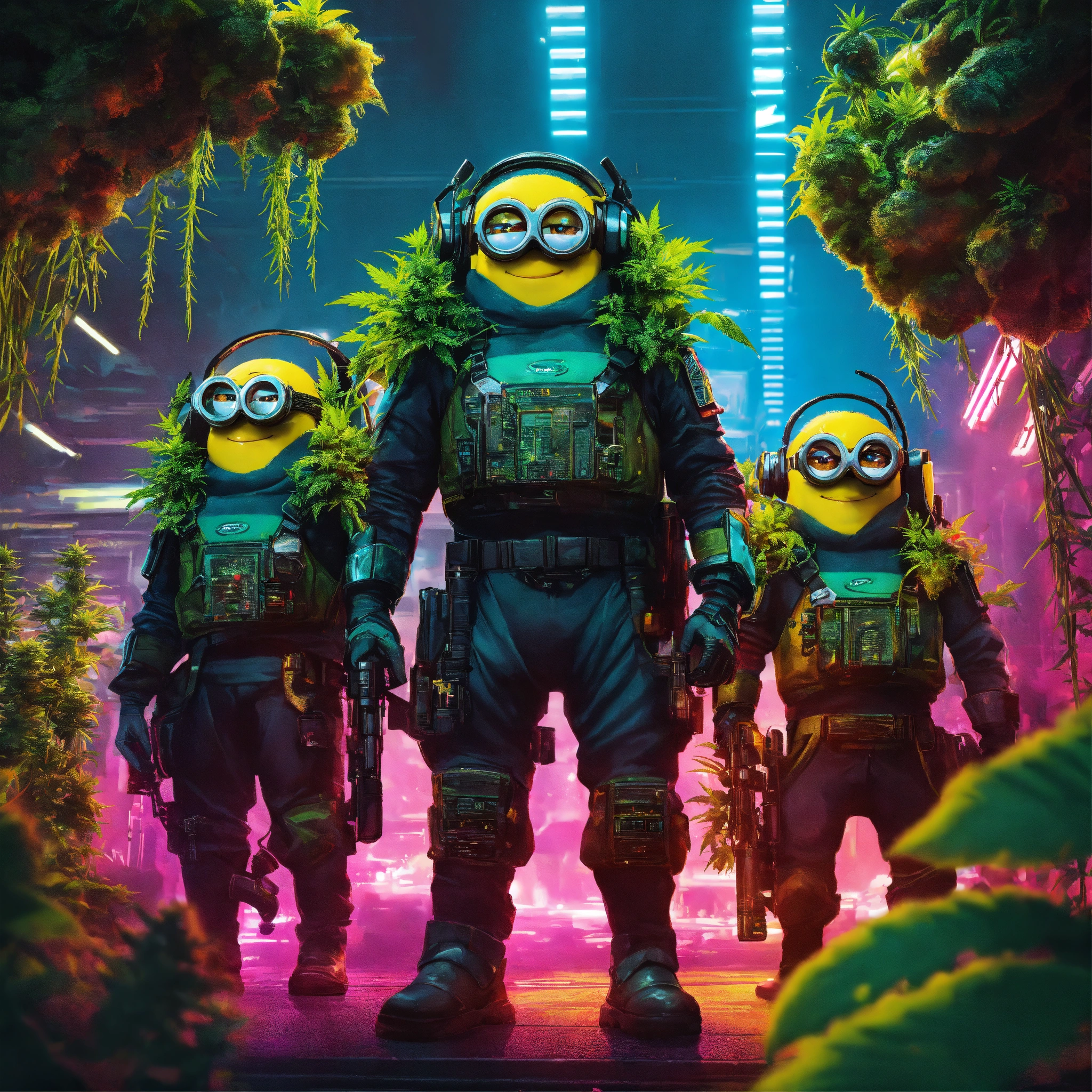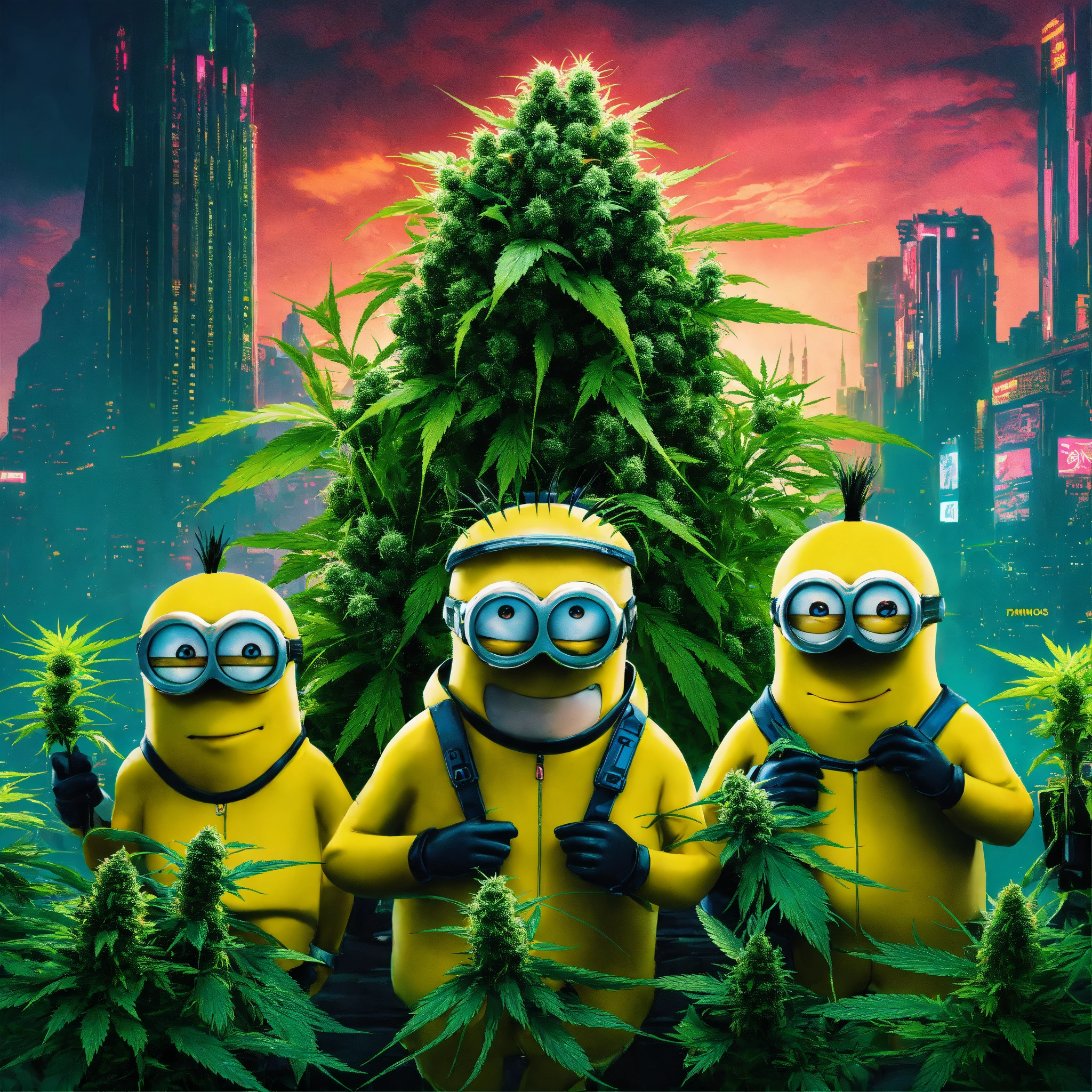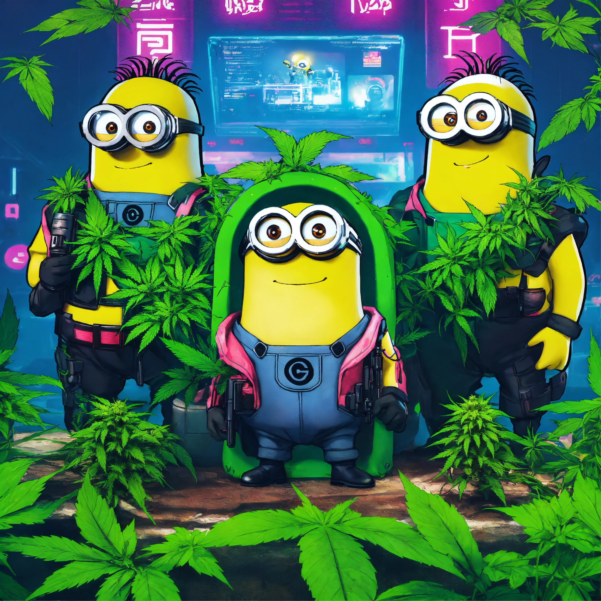 Cyberpunk poster of 4 minions surrounded by cannabis plants