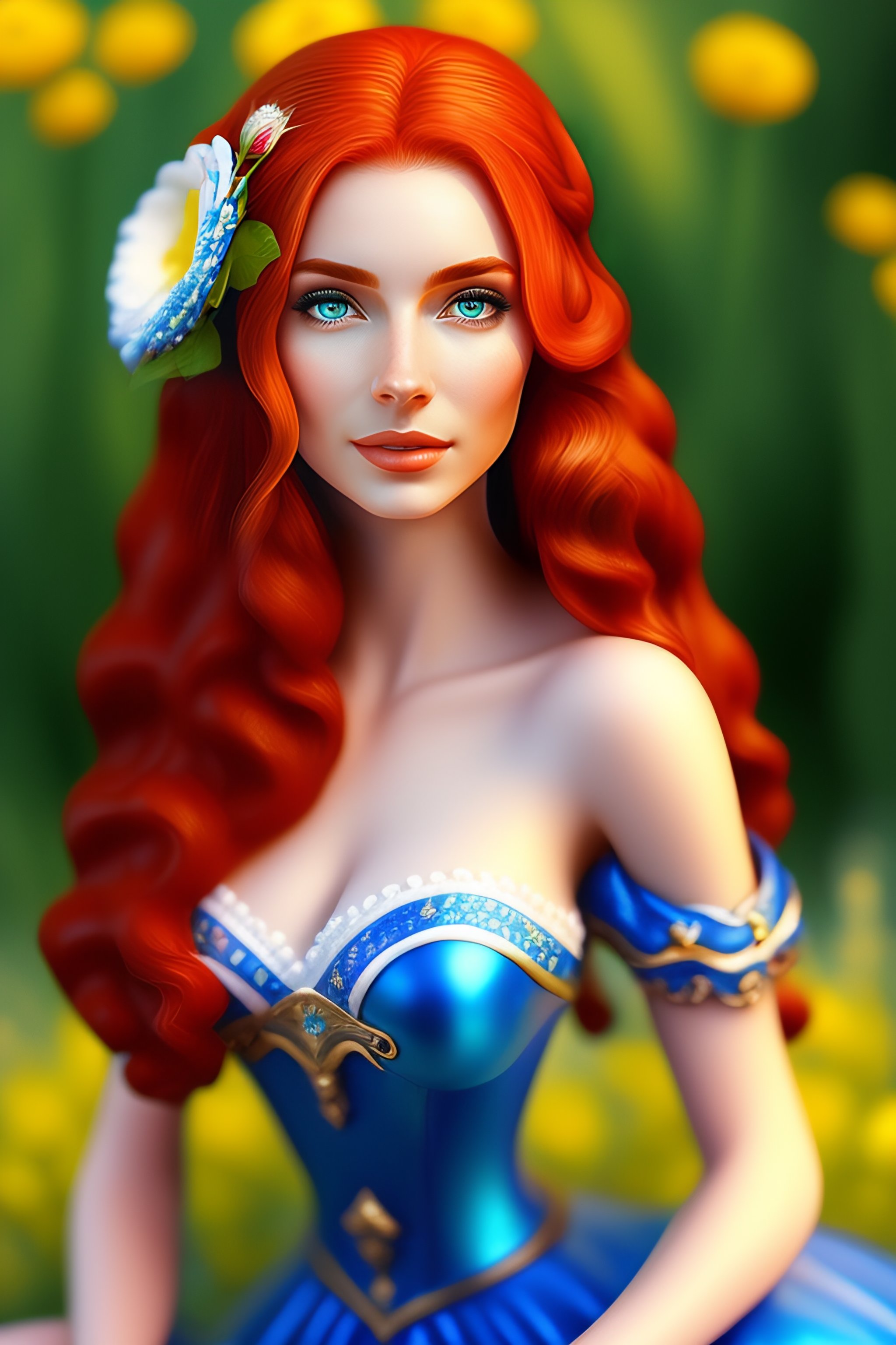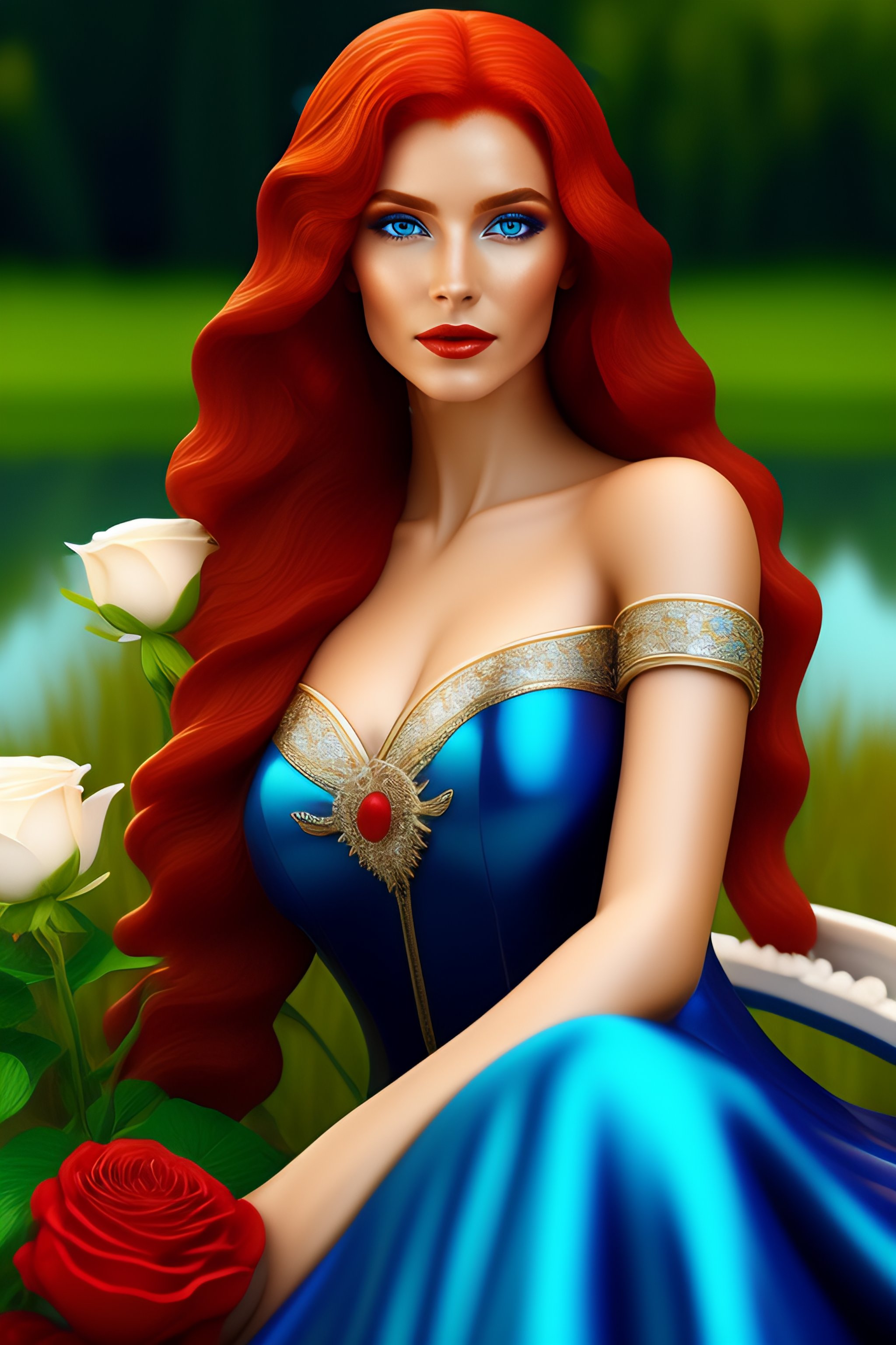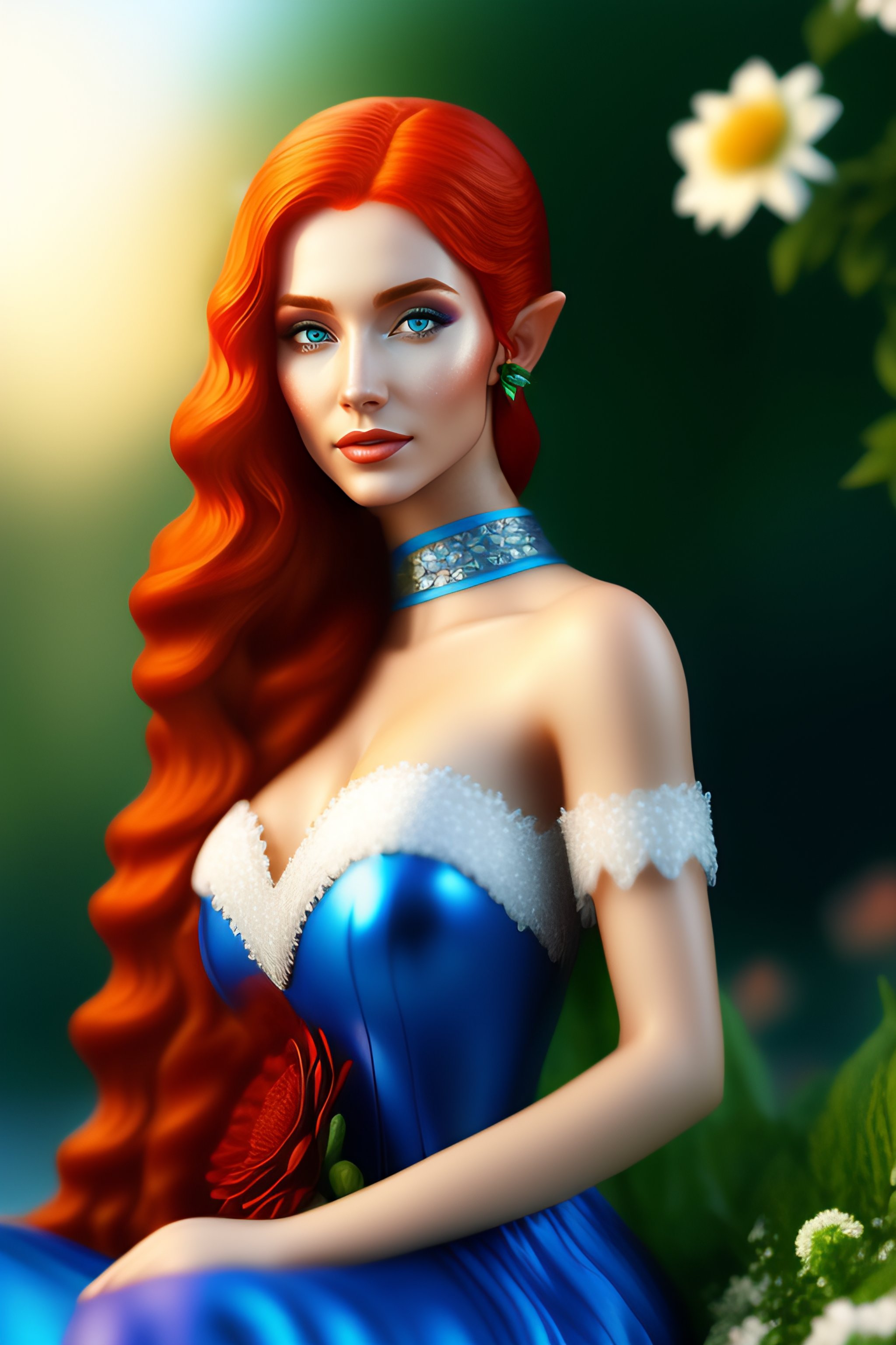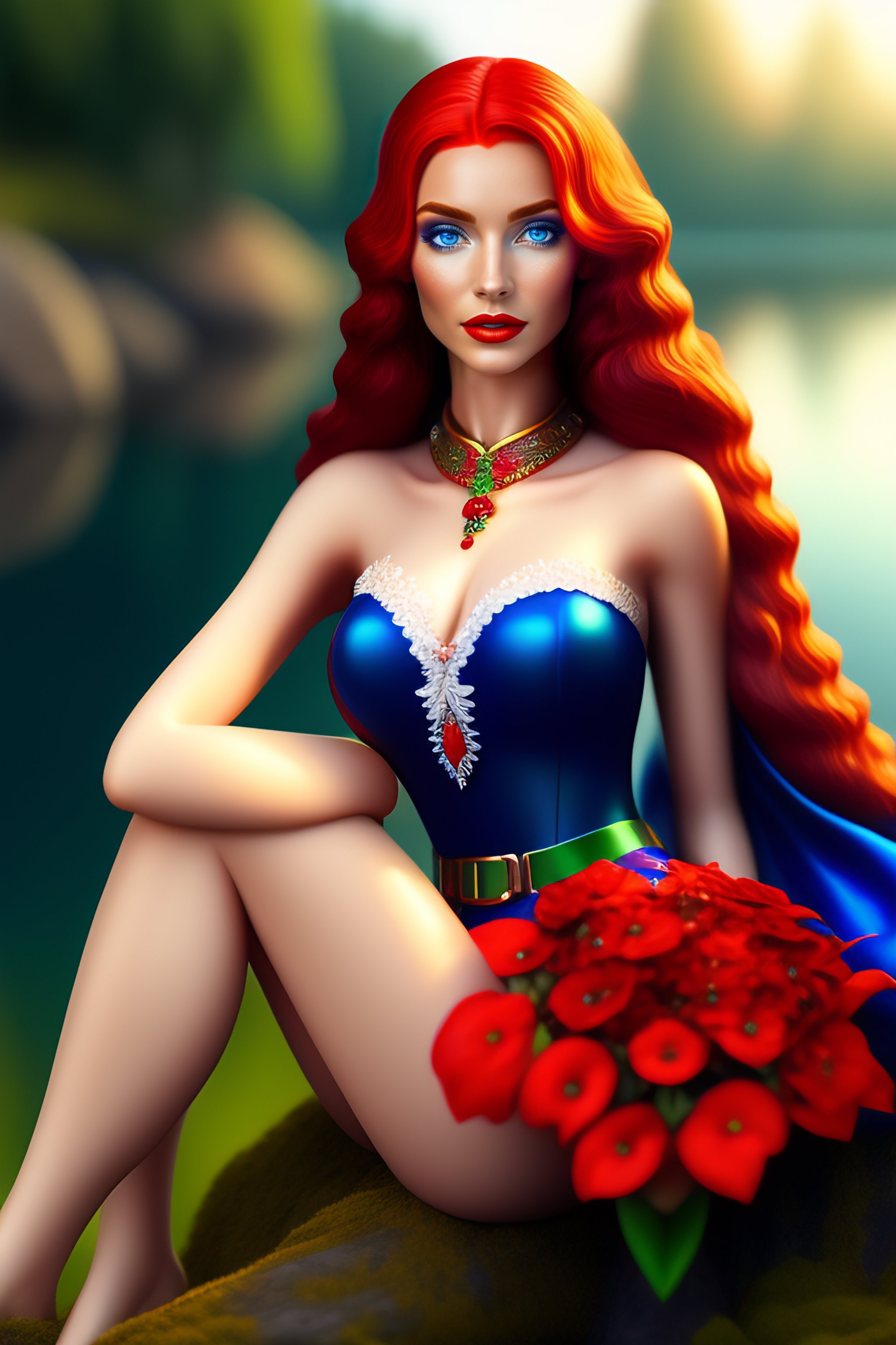 Elf woman in blue elf dress with red hair and white skin sitting by green lake, realistic, detailed, elf woman holding bouquet of flowers, detailed, realistic, 8k