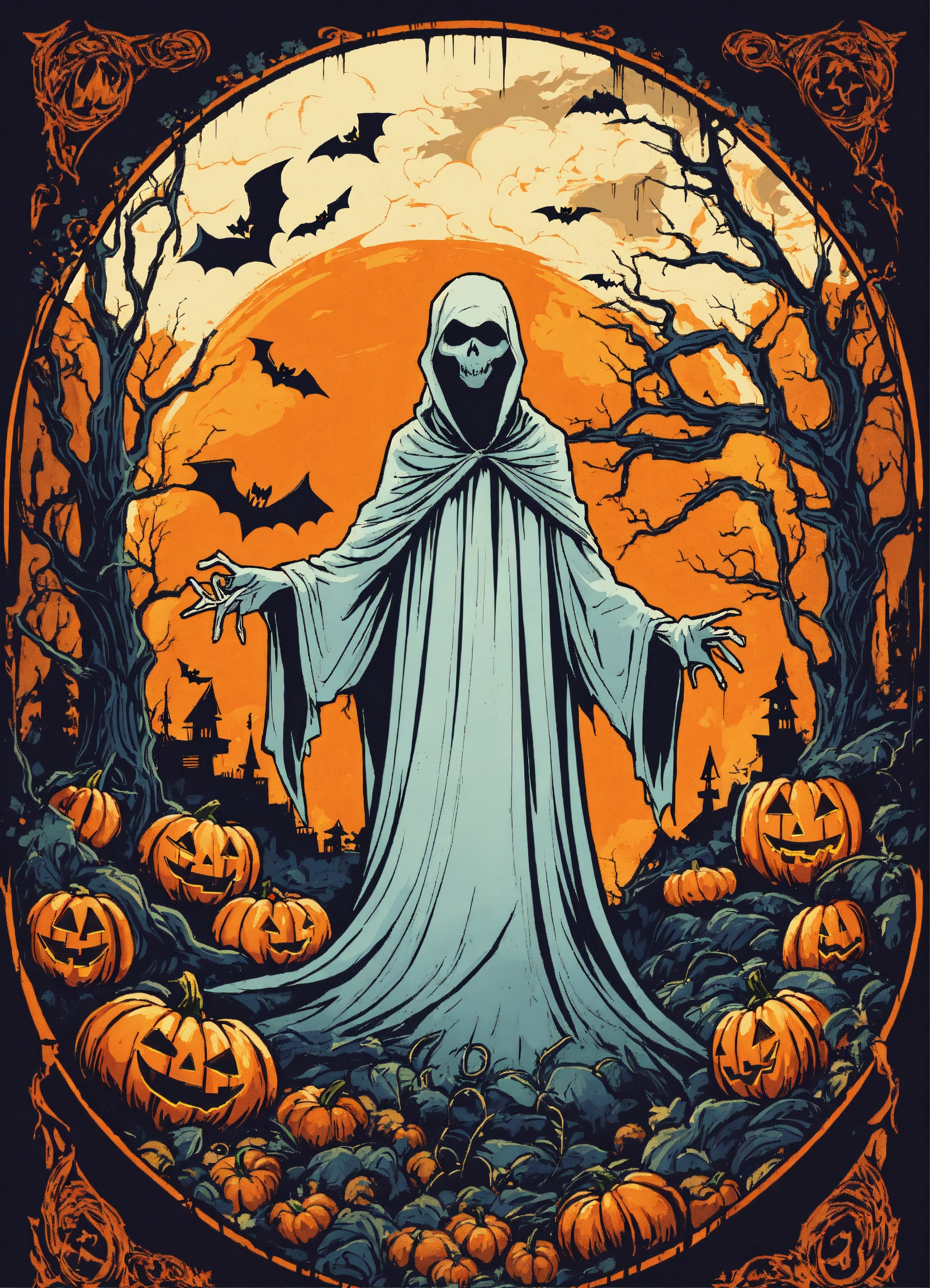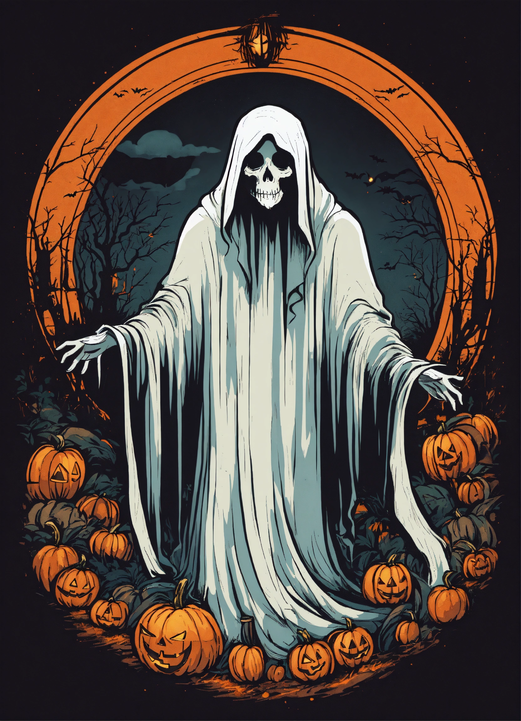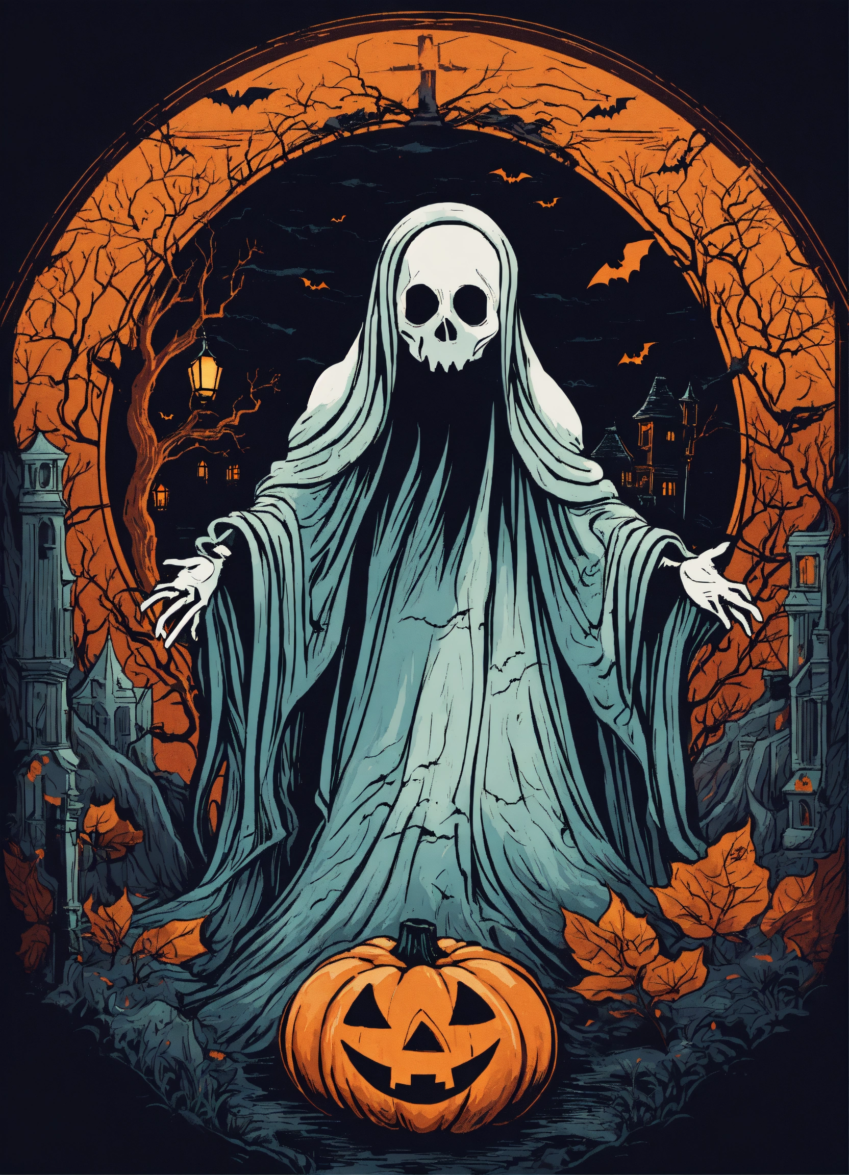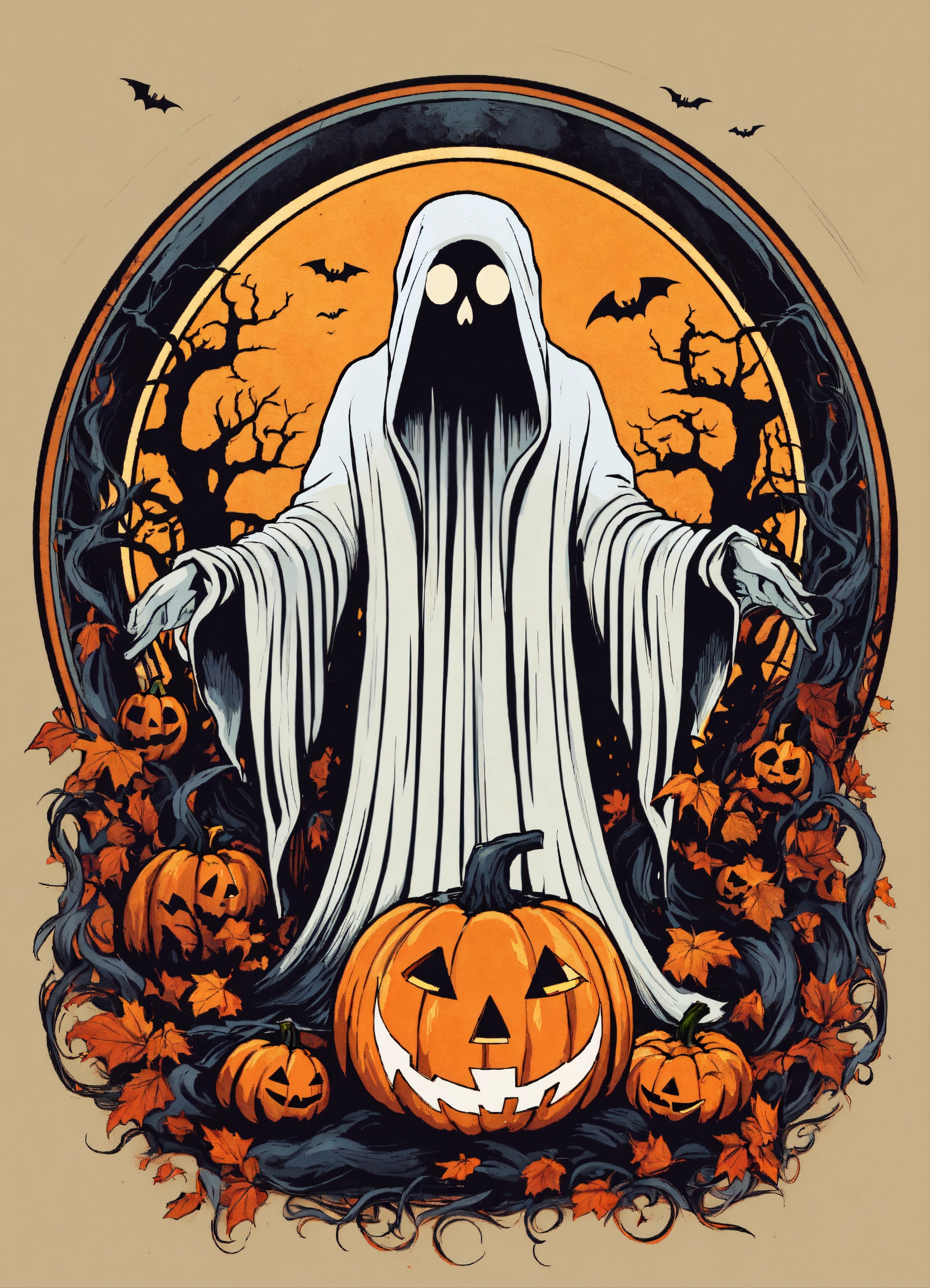 Halloween ghost in a circle, tshirt design, retro, vector artwork, art by dan mumford, white background