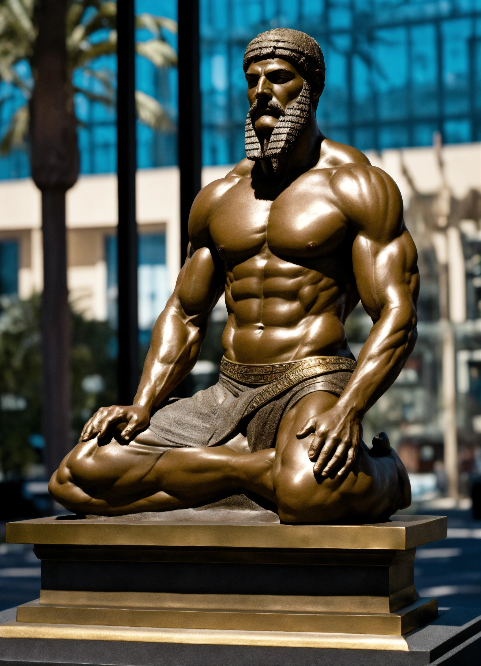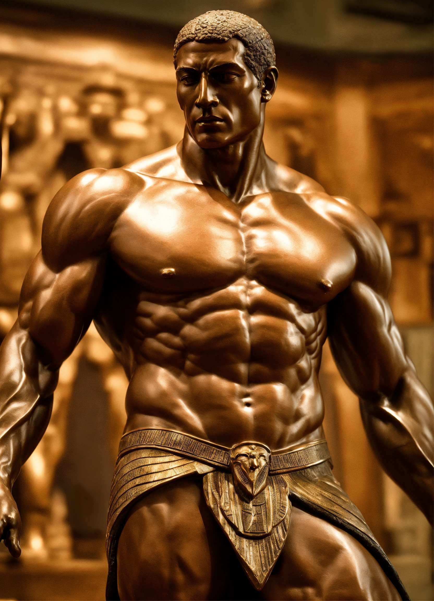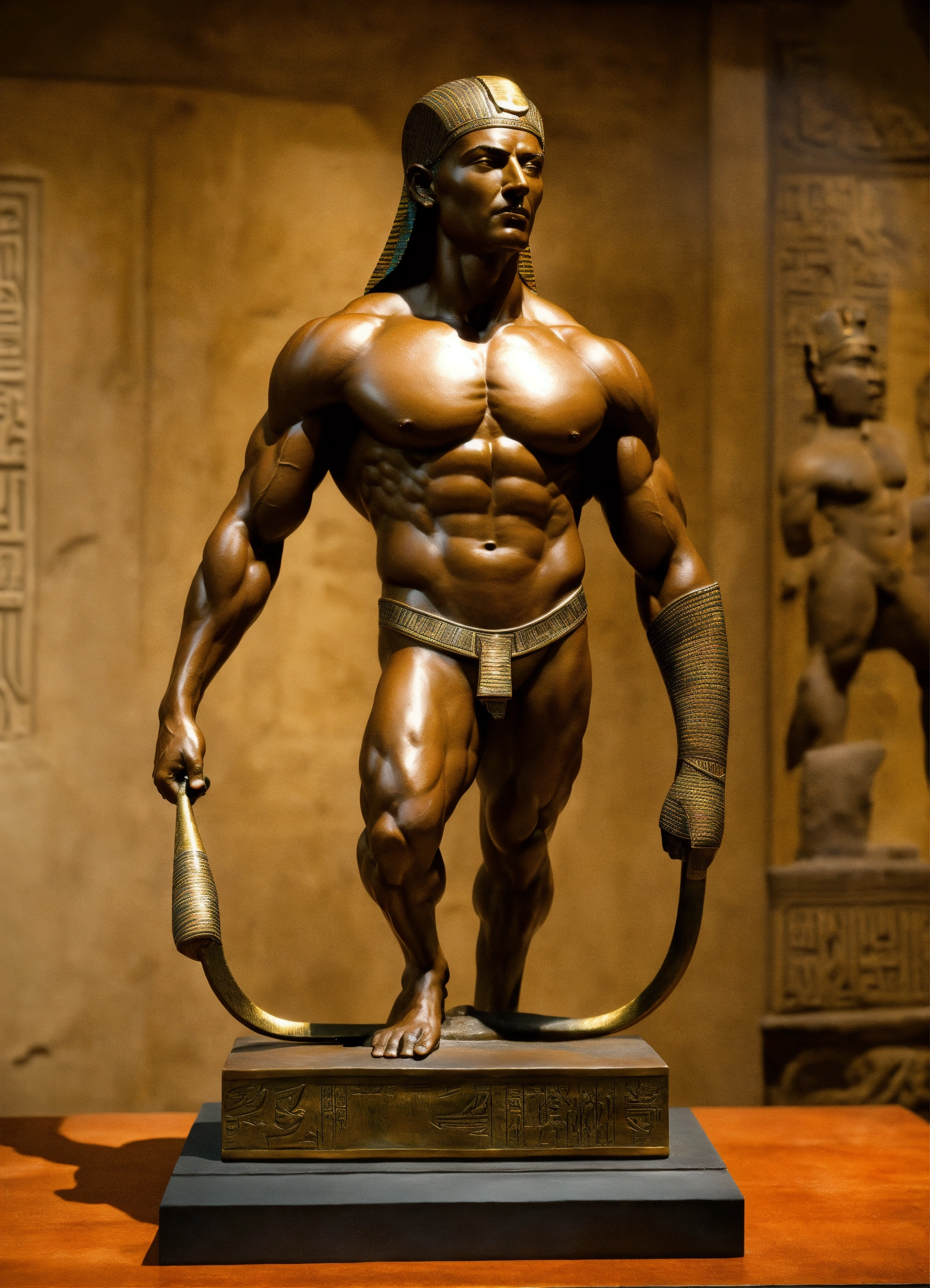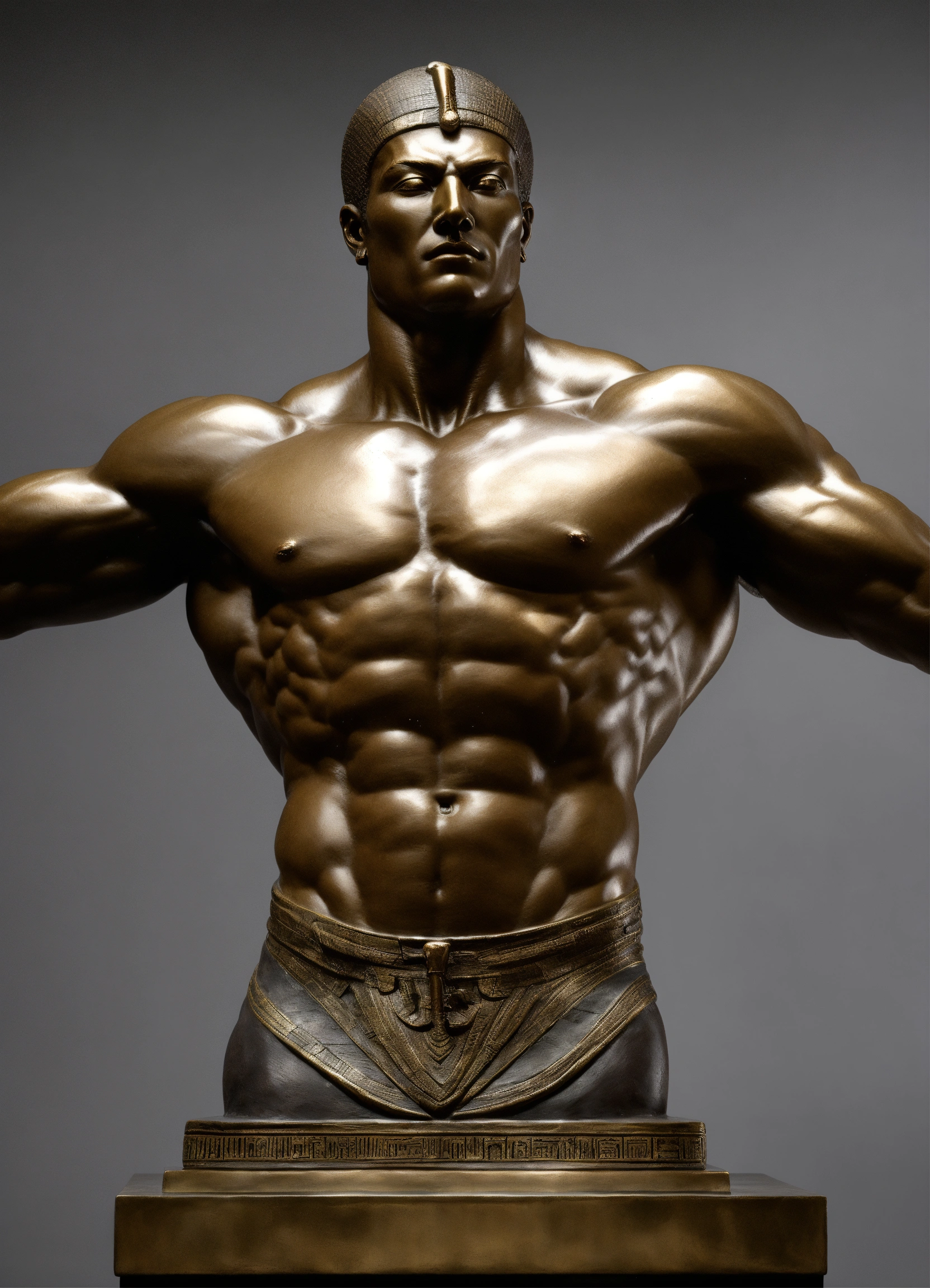 A sculpture of a muscular man reminiscent of ancient egypt, in aged bronze atop a base, ultra-mega-realistic in ultra-definition 32k photorealism.
