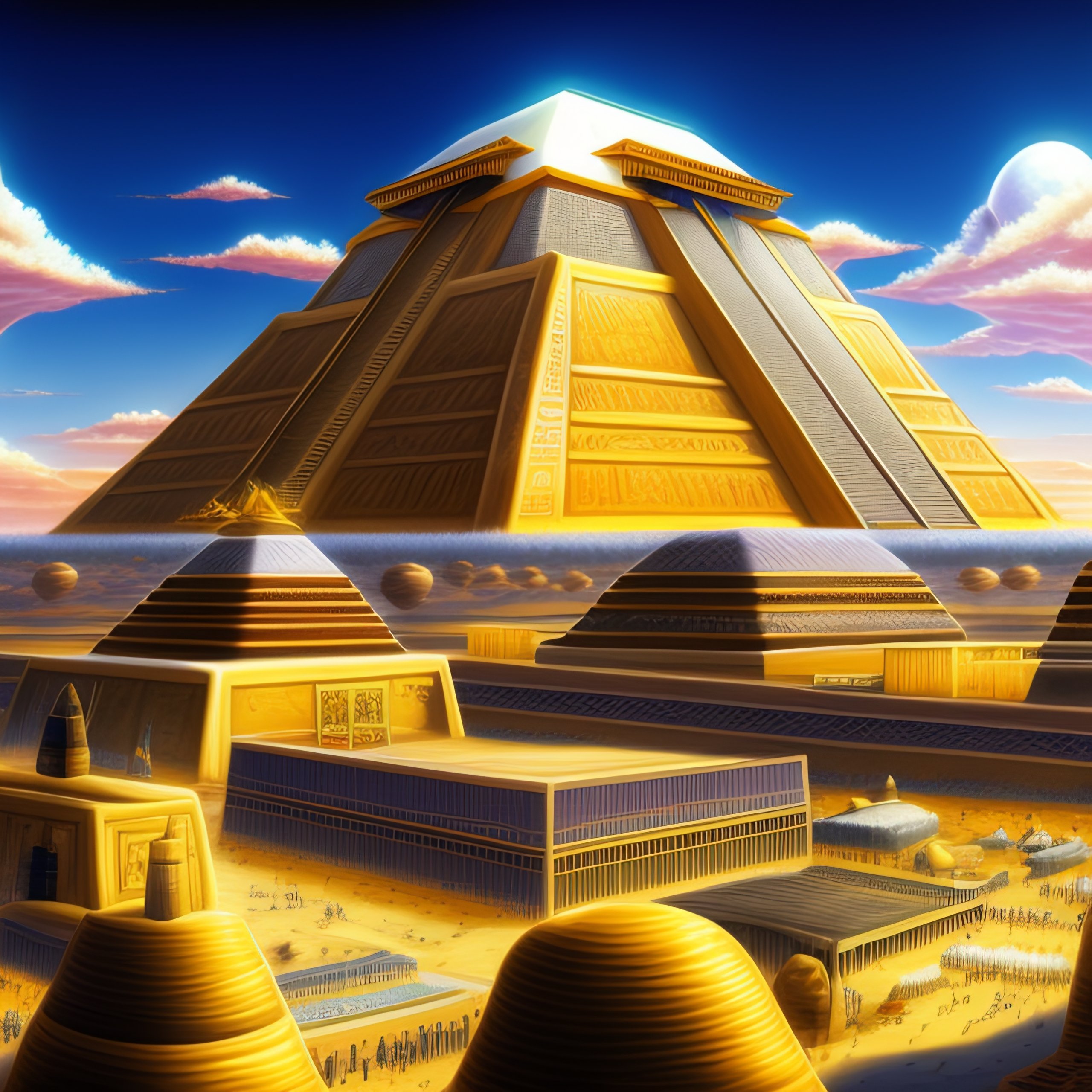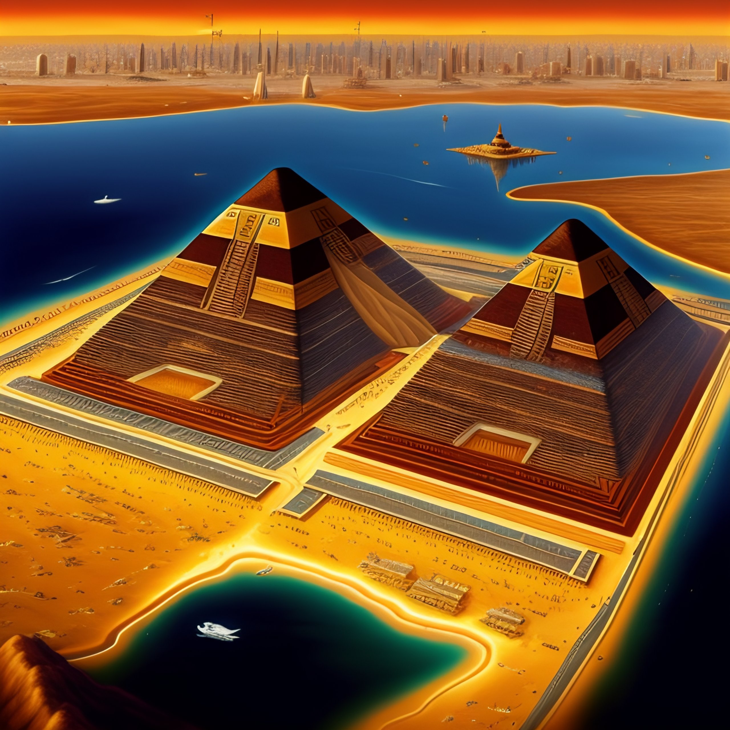 Tilt-shift photo of khufu, khafre, and menkaure pyramids of giza, in the sky, art by masashi kishimoto, the pharaonic period.