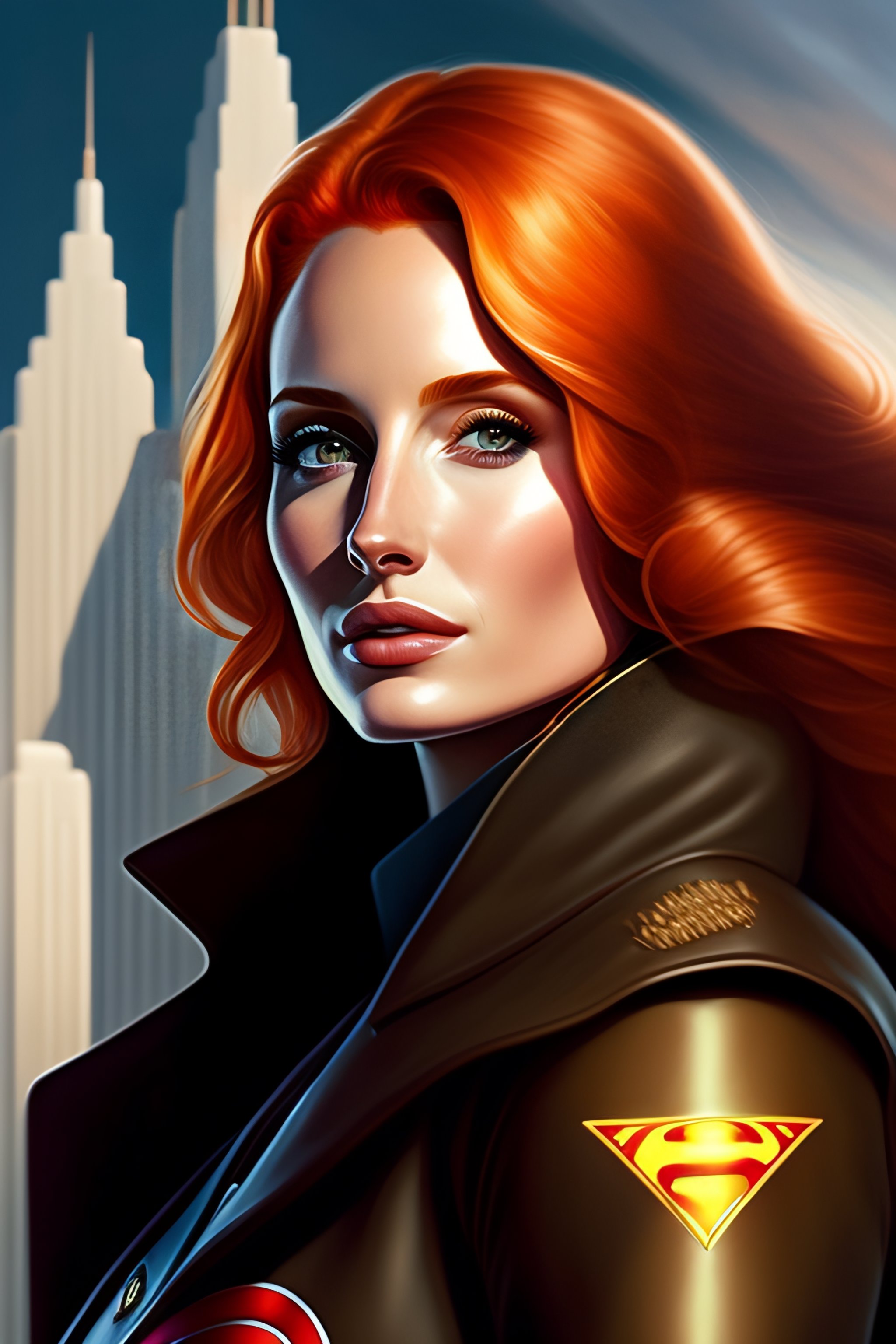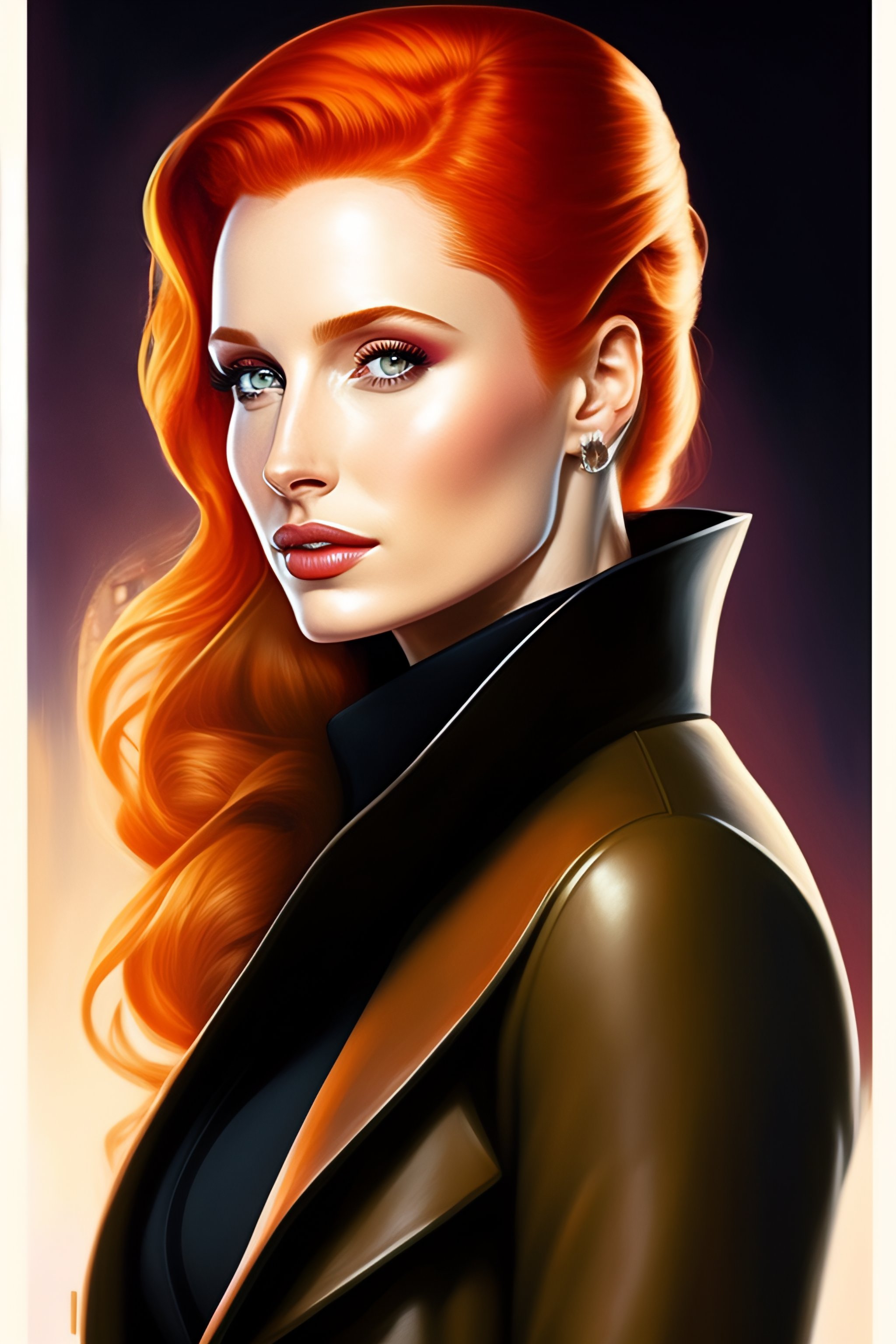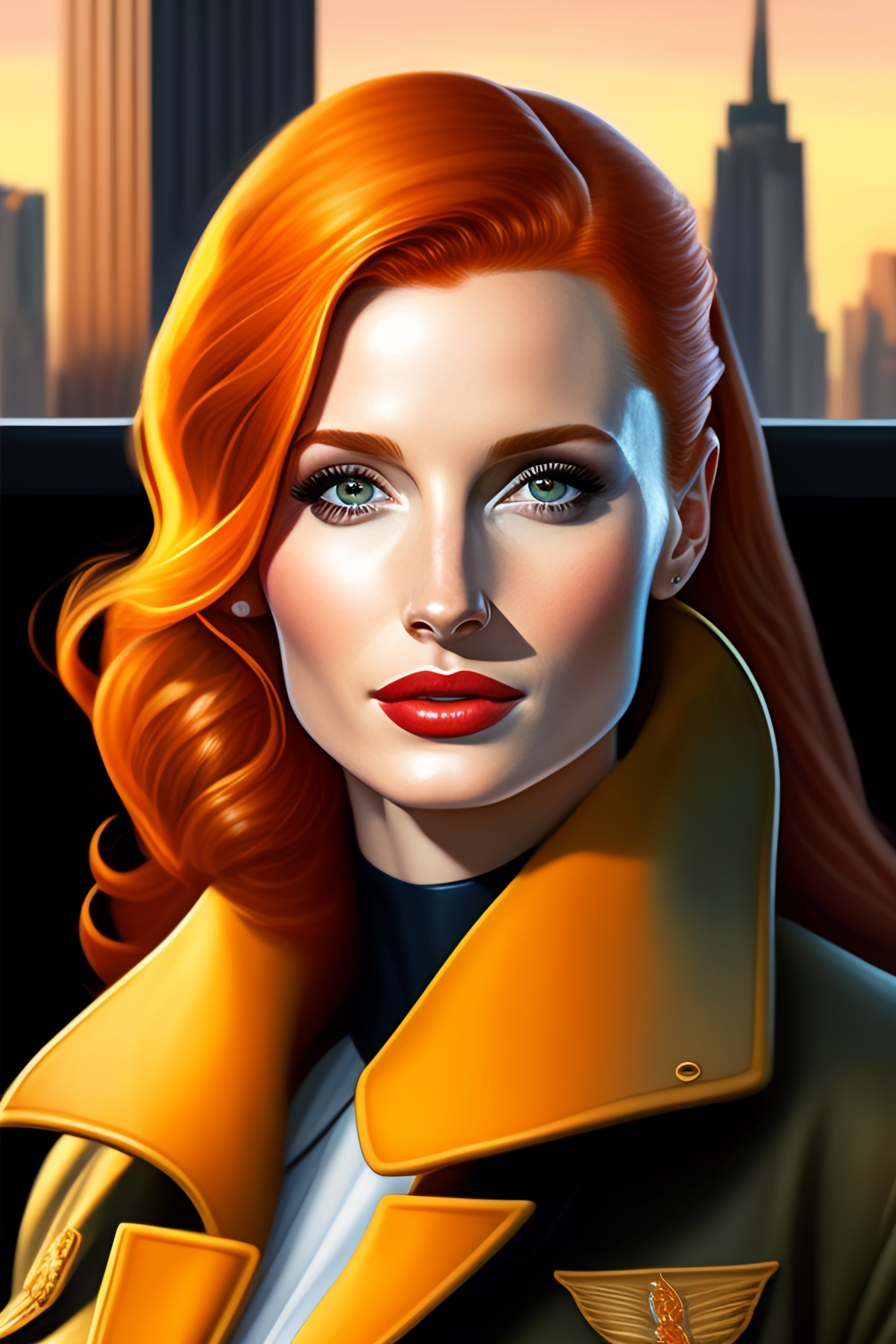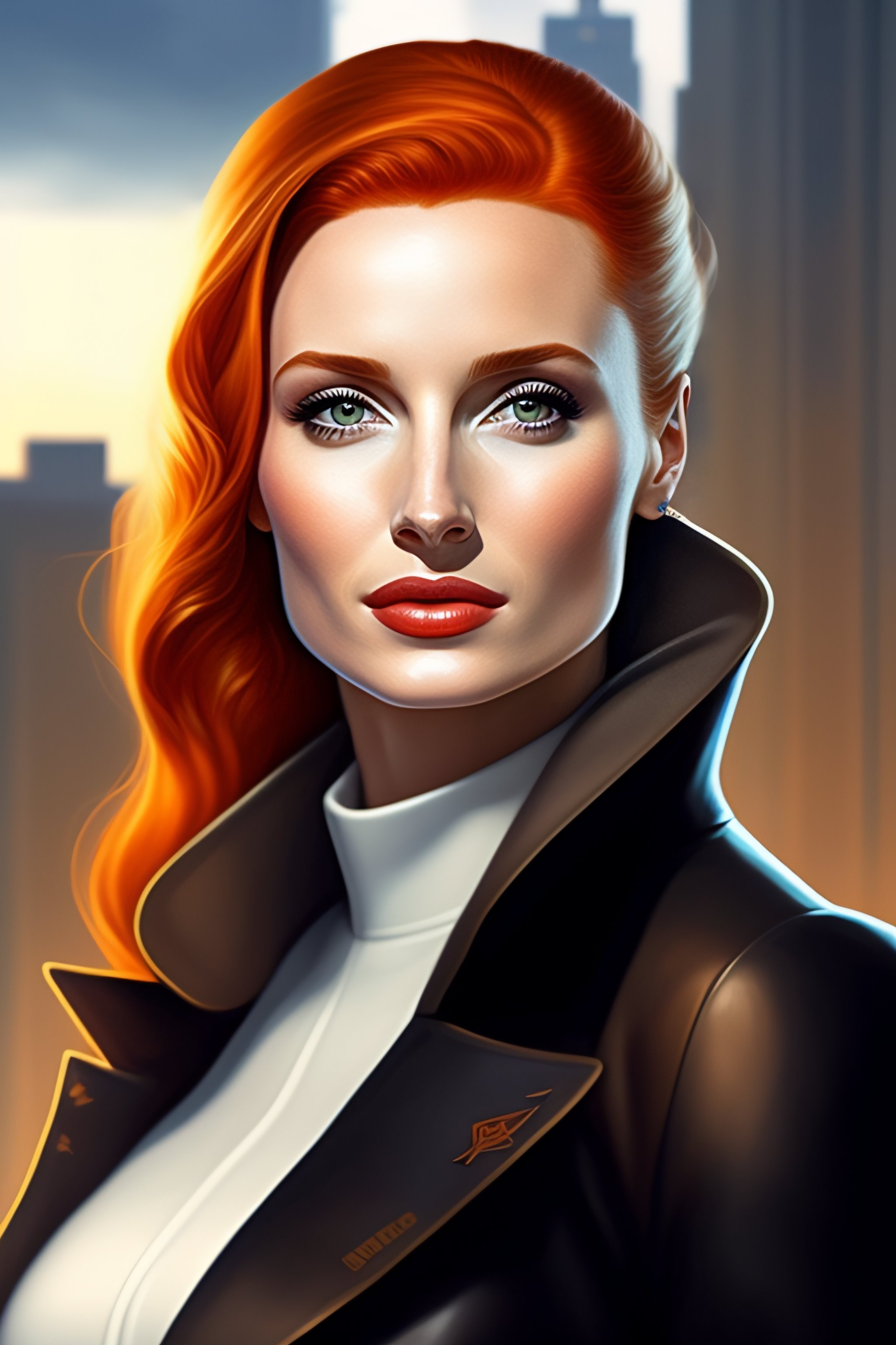 Beautiful portrait of sansa angeline jolie gessica chastain superhero, phil noto comicbook cover art, short ginger hair, military coat, marvel, symmetrical eyes, city rooftop