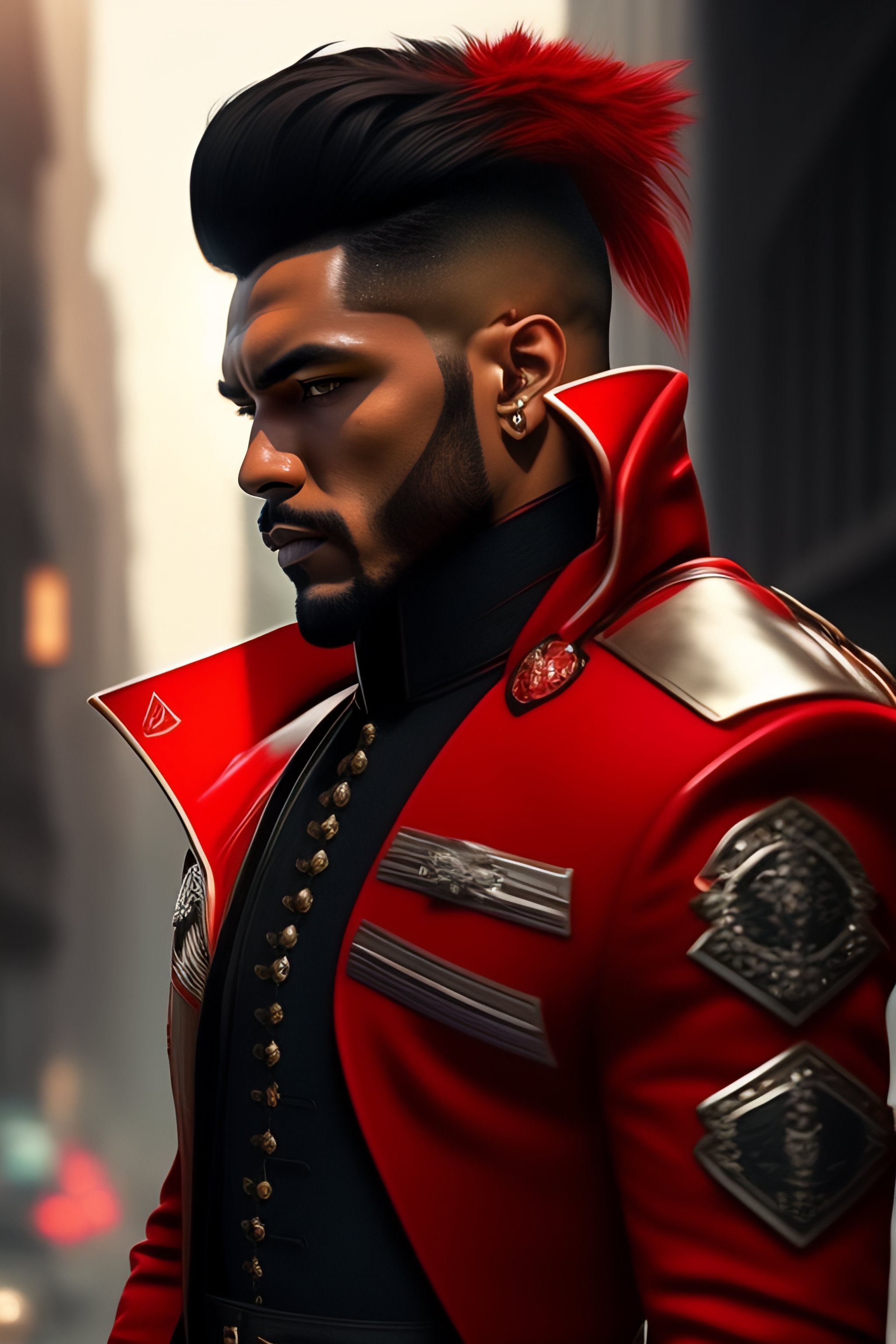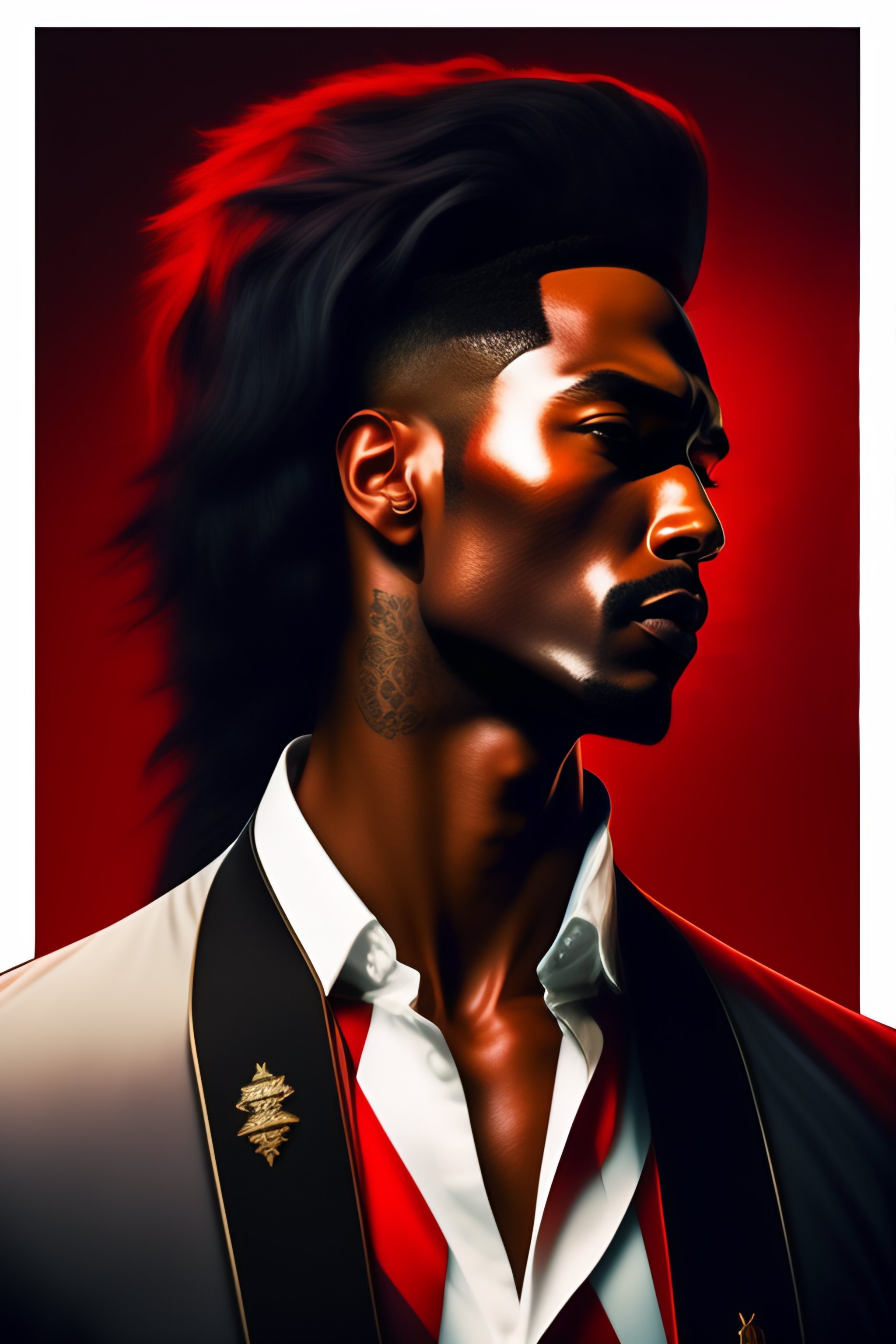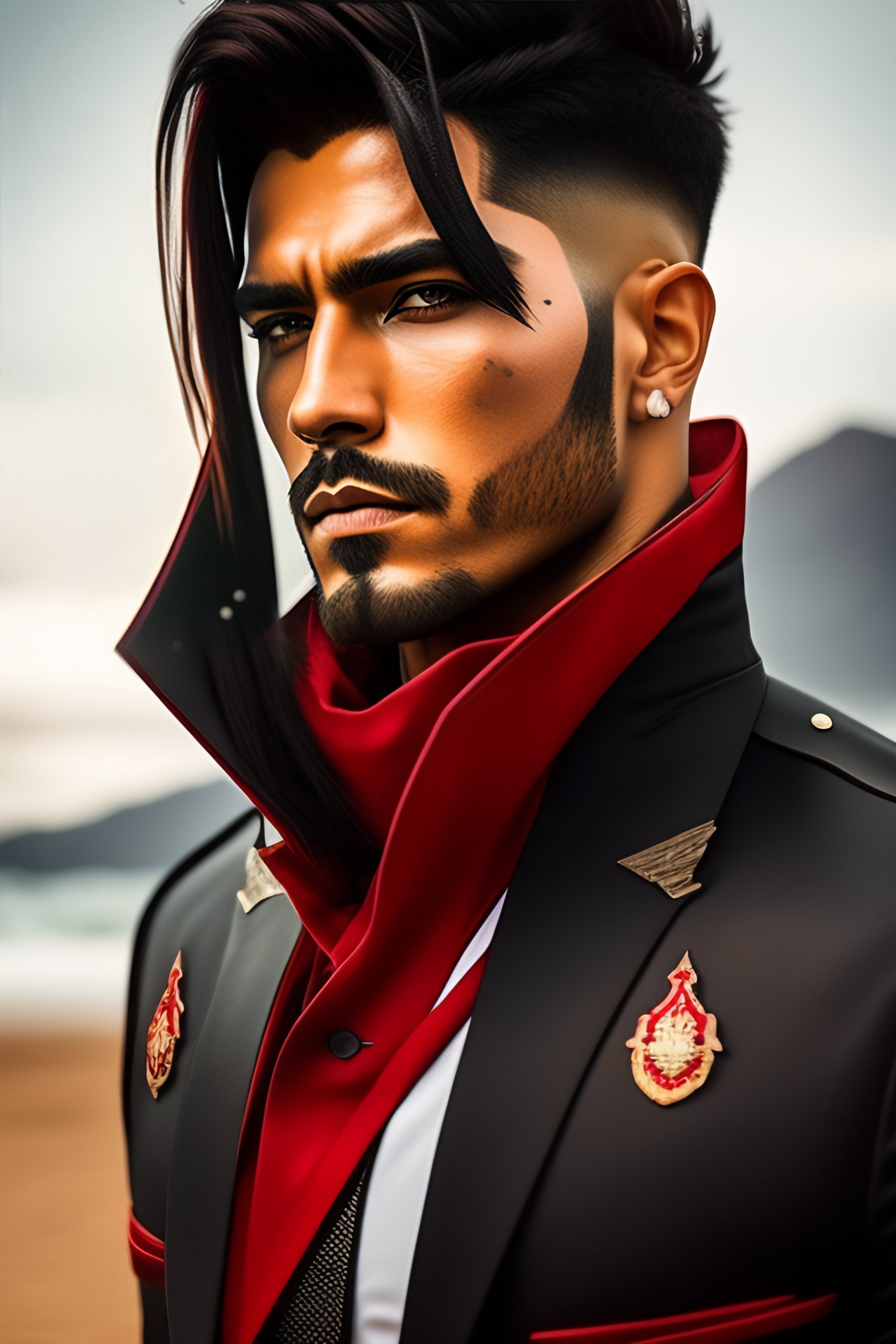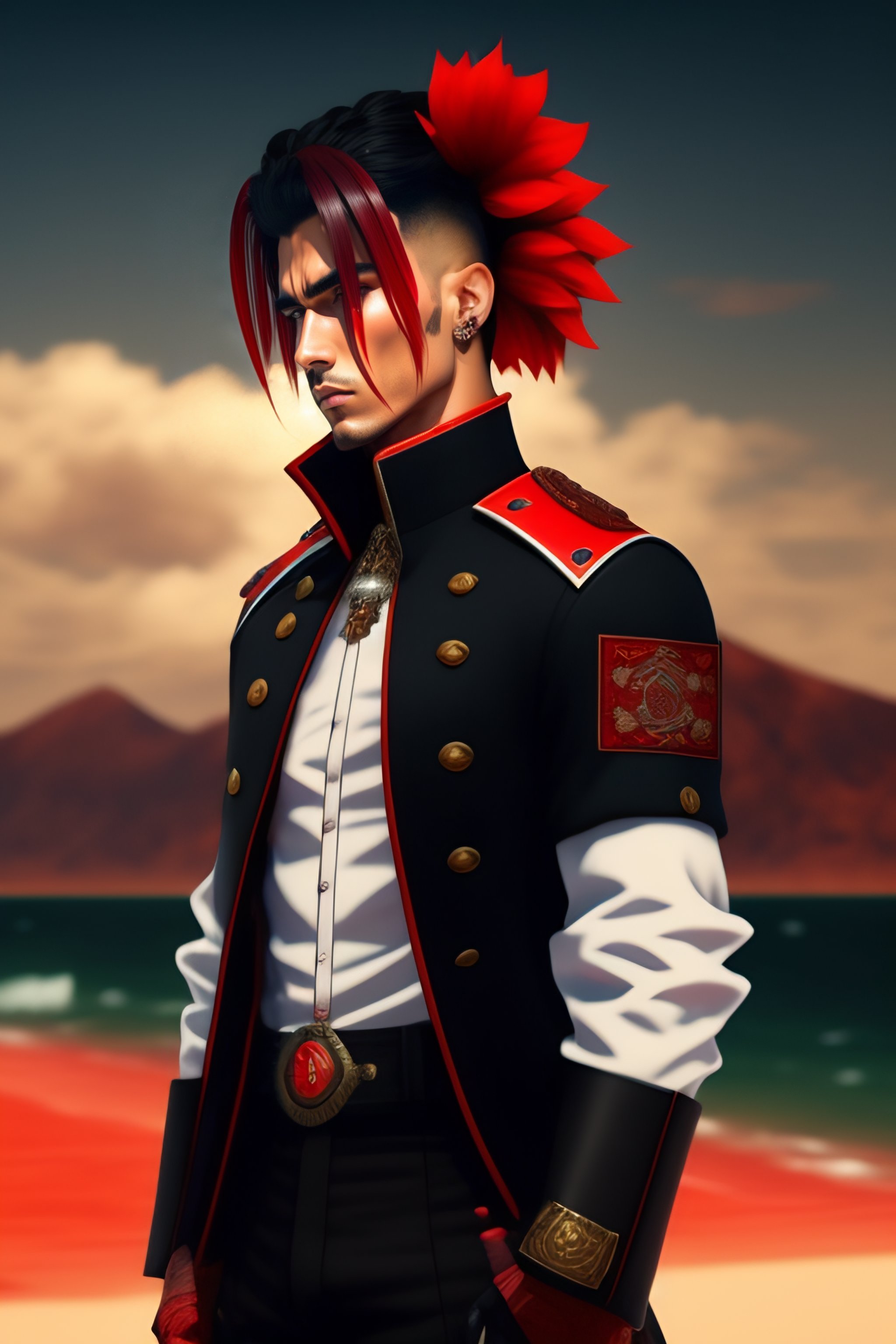 Hombre de cabello negro con mechas rojas, pantalones y botas militares negras, camisa blanca con corbata roja, chaqueta americana negra, portando una gran guadaña, mascara inferior demoniaca japonés, pelo largo al estilo de madera uchiha, un mechón de pelo tapando un ojo, cuatro ojos rojos, complexión atlética