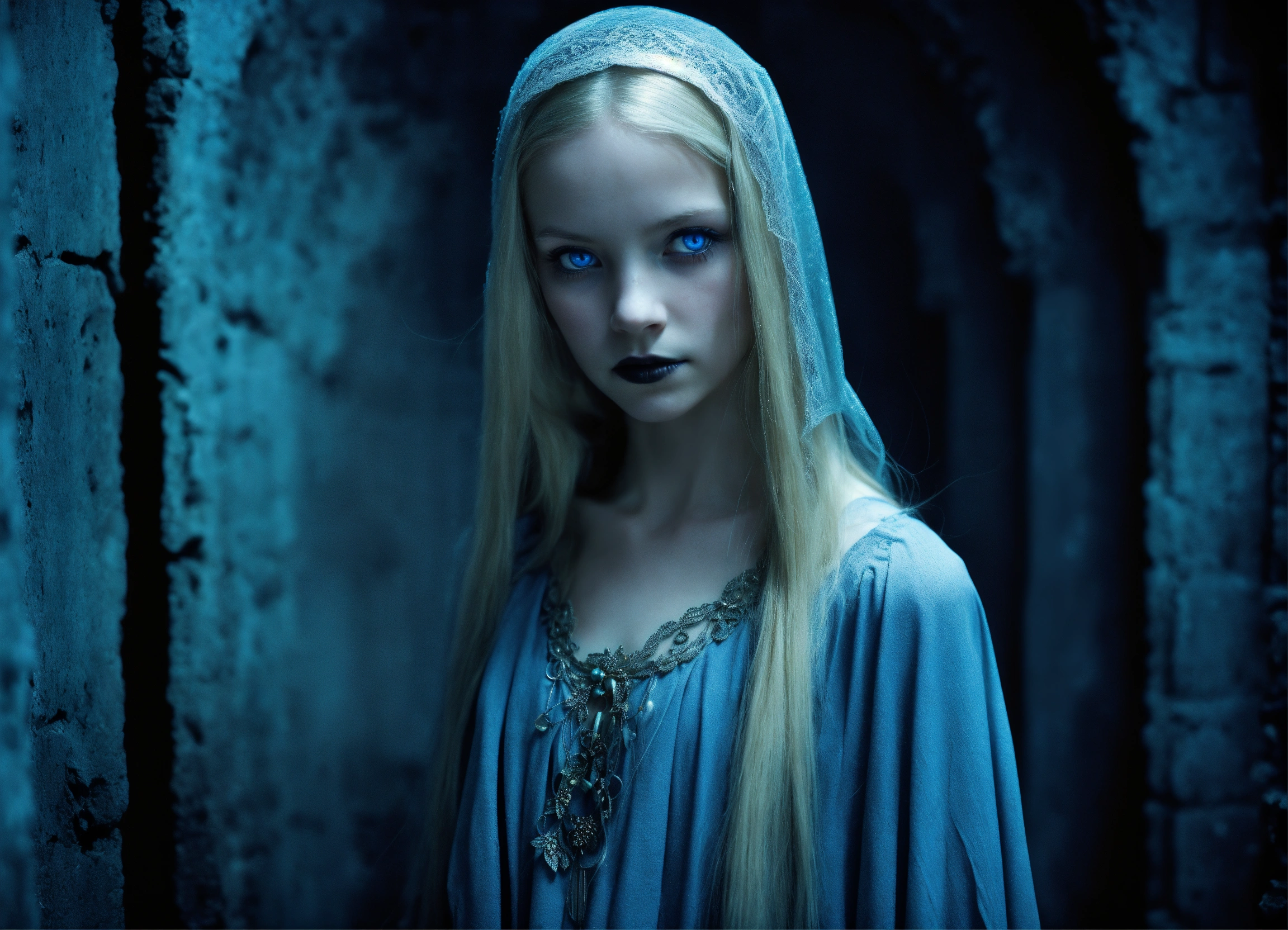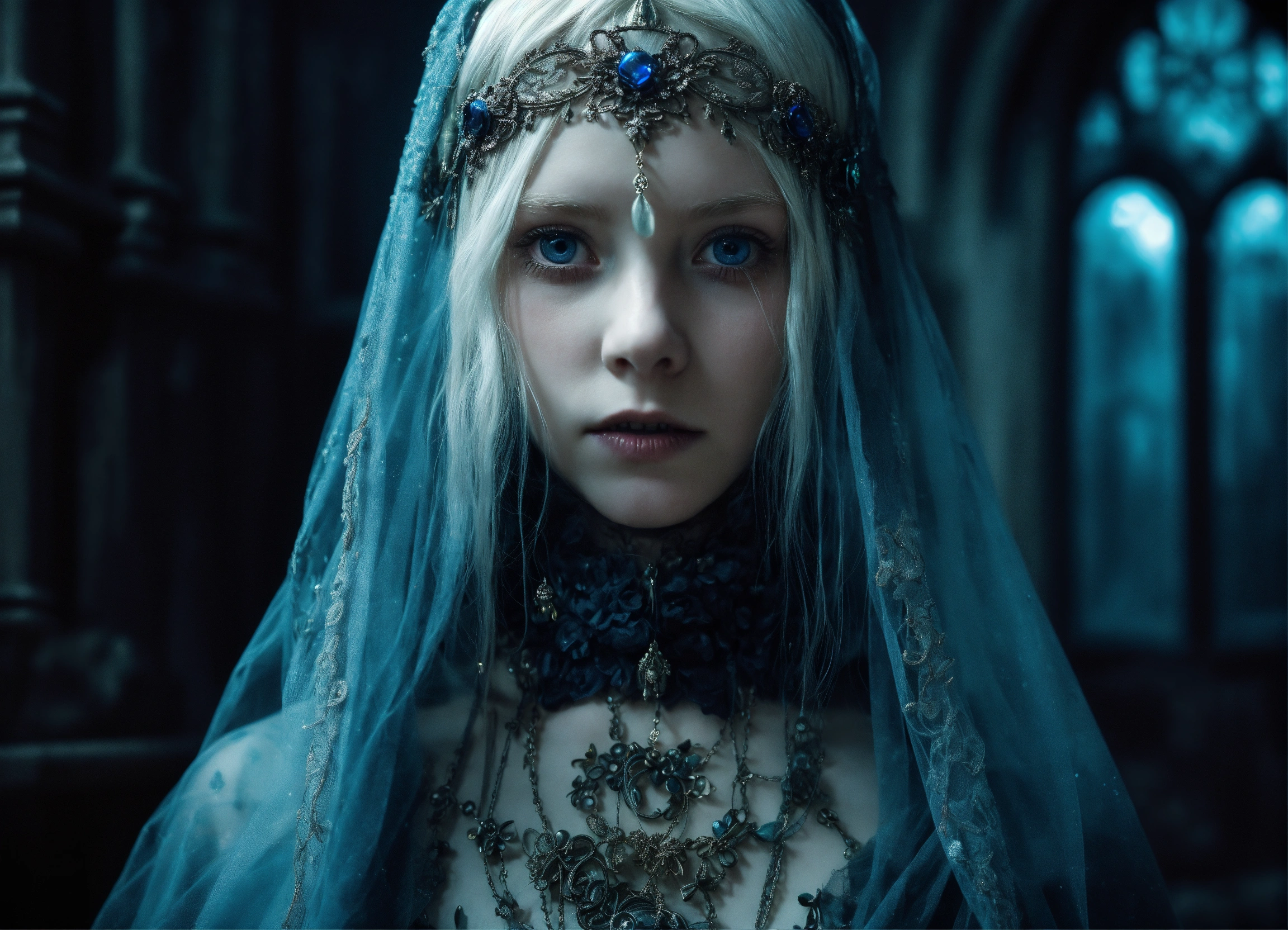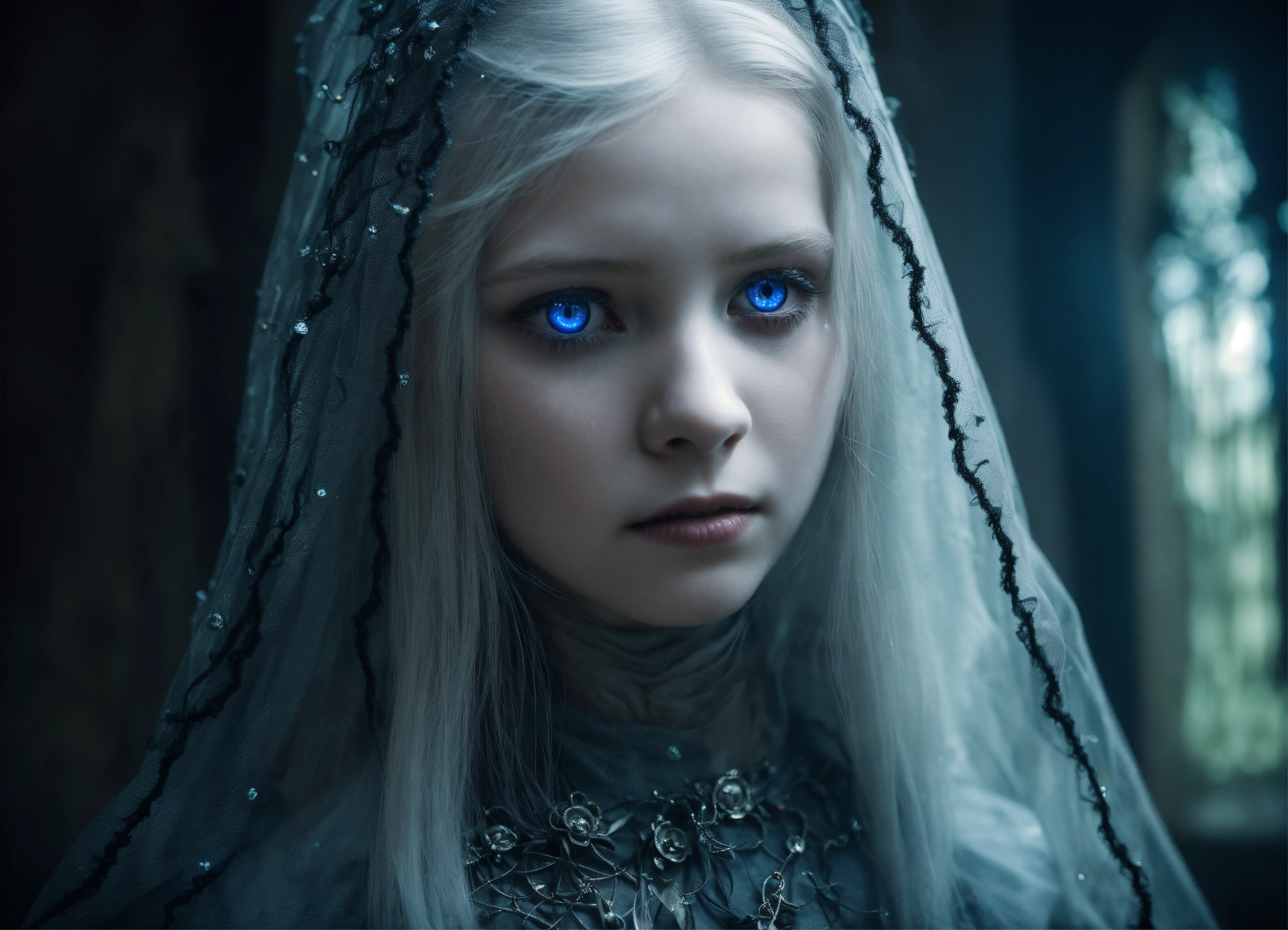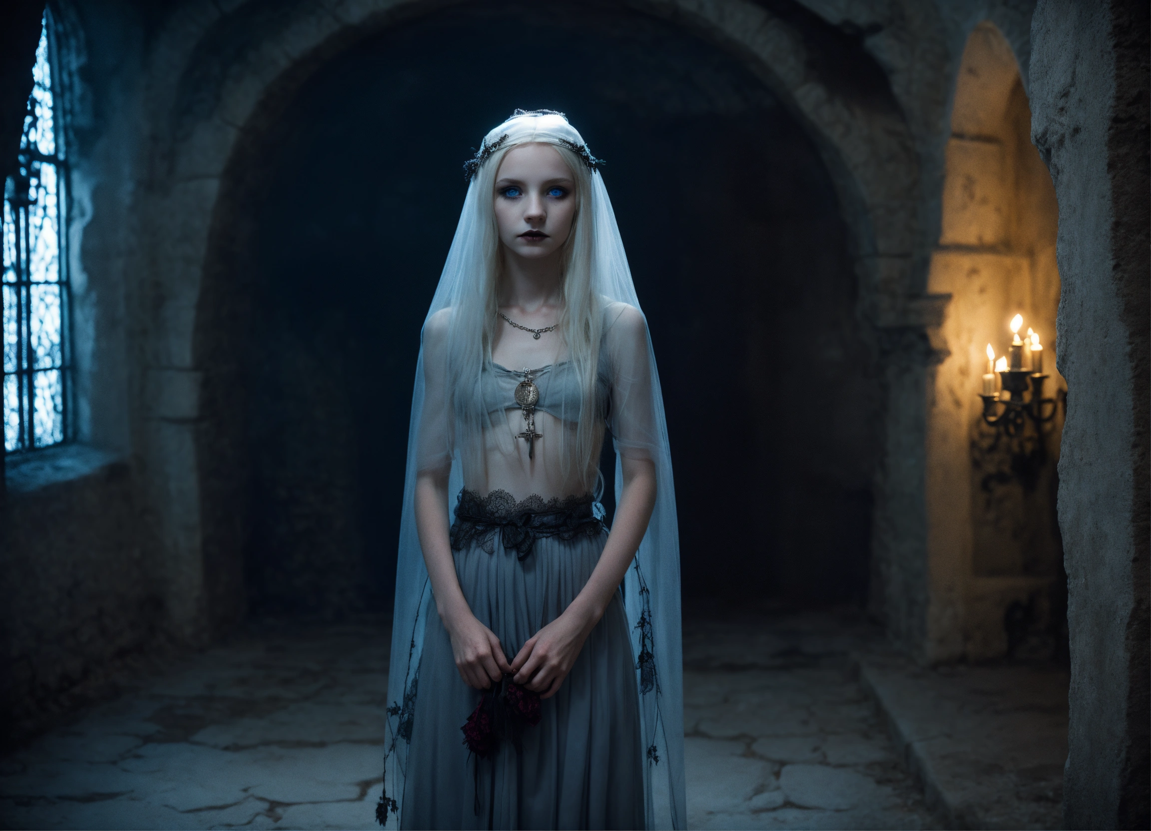 Body portrait of a very childish deadly pale extremely slim twelve year old female child, she is a goth necromancer with waist long silverwhite hair, face veil, extremely flat belly, extremely skinny, extremely slim body, emaciated body, completely emaciated, extremly narrow face, alabaster skin, pale as a corpse, glowing blue eyes, slim face, innocent looking, in a gloomy crypt, lasziv, kindlich, unschuldig, childlike, graceful, wispy, glowing blue eyes, ghostly, dead, evil, demonic, undead, darkness, grotesque, mysterious, dark, cold ambient lighting, extremely detailed, fantasy, medieval setting