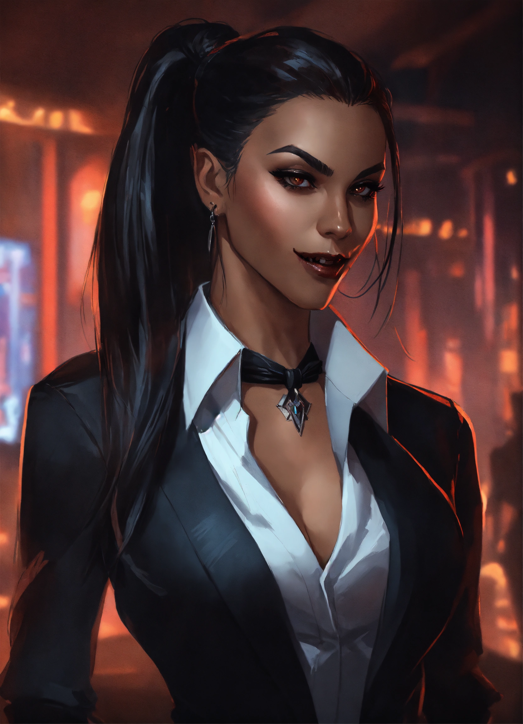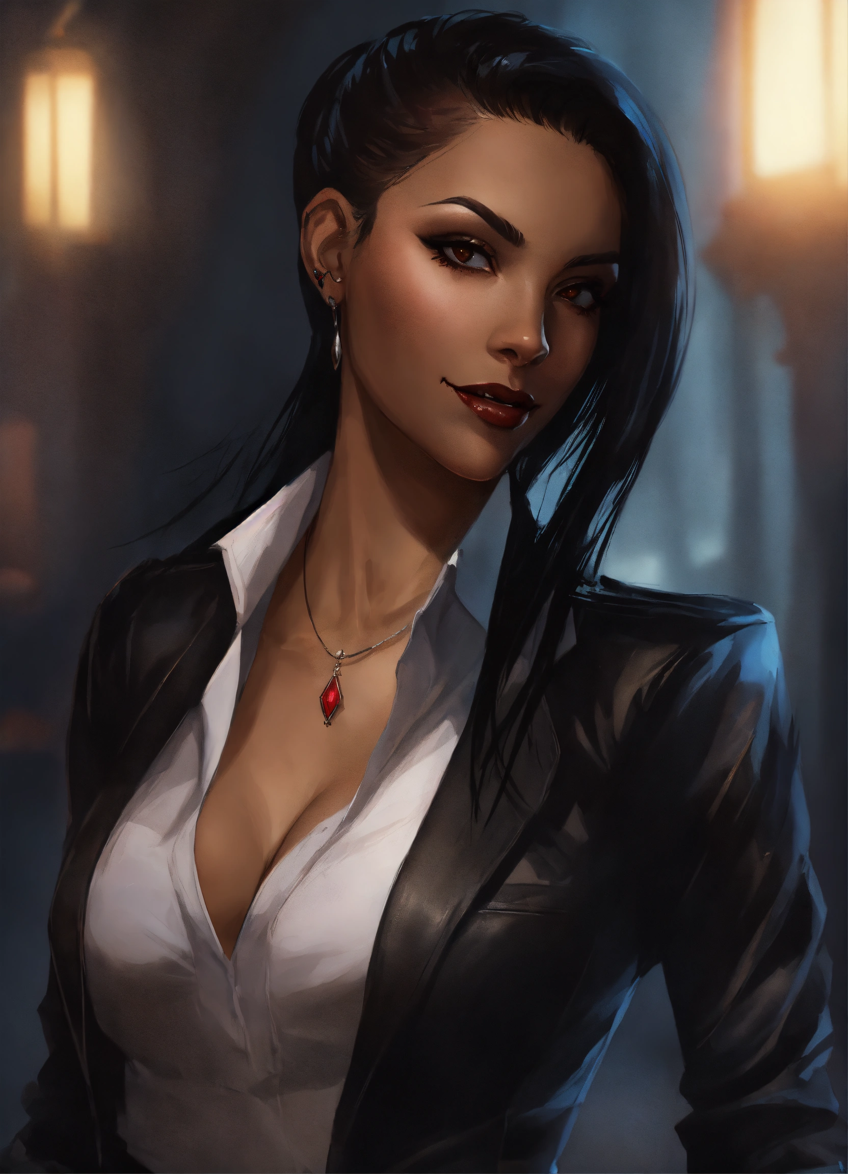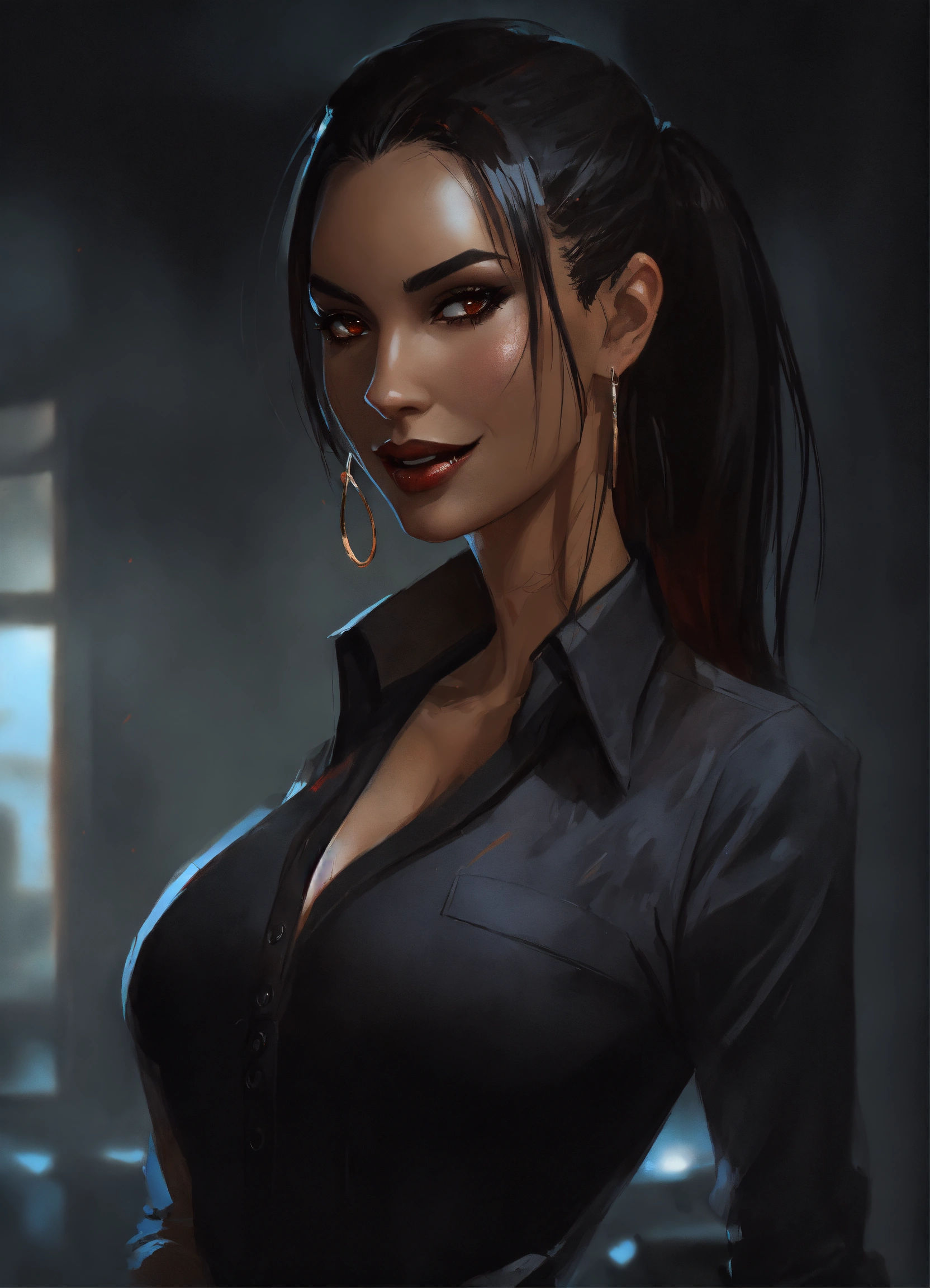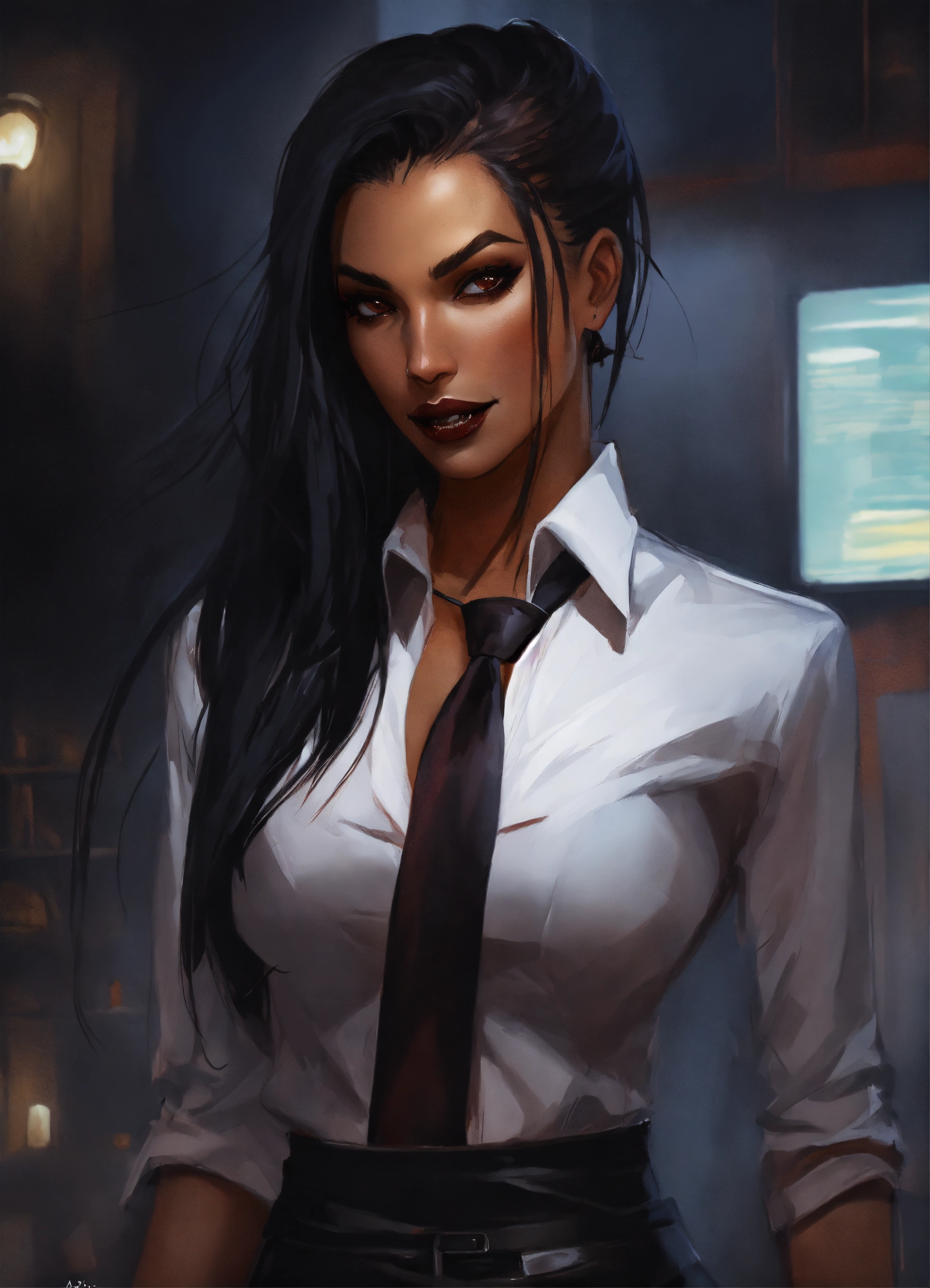 Art by stjepan sejic, artstation, character concept art, portrait, black backgorund, dark spooky atmosphere, vampire the masquerade, stunning female arab woman, straight black high ponytail hair, evil smile, strict business style office shirt and tie, black leather corset