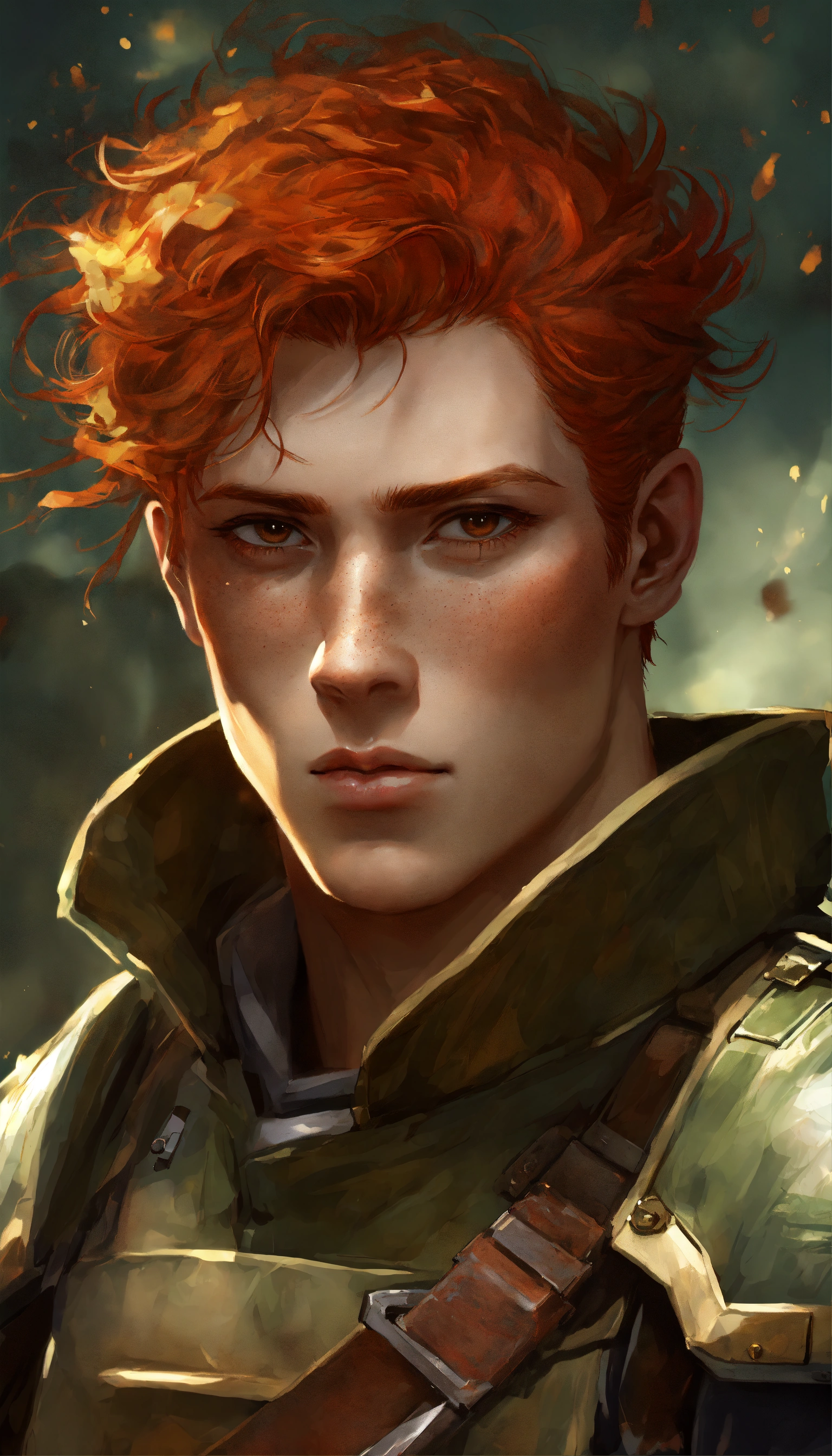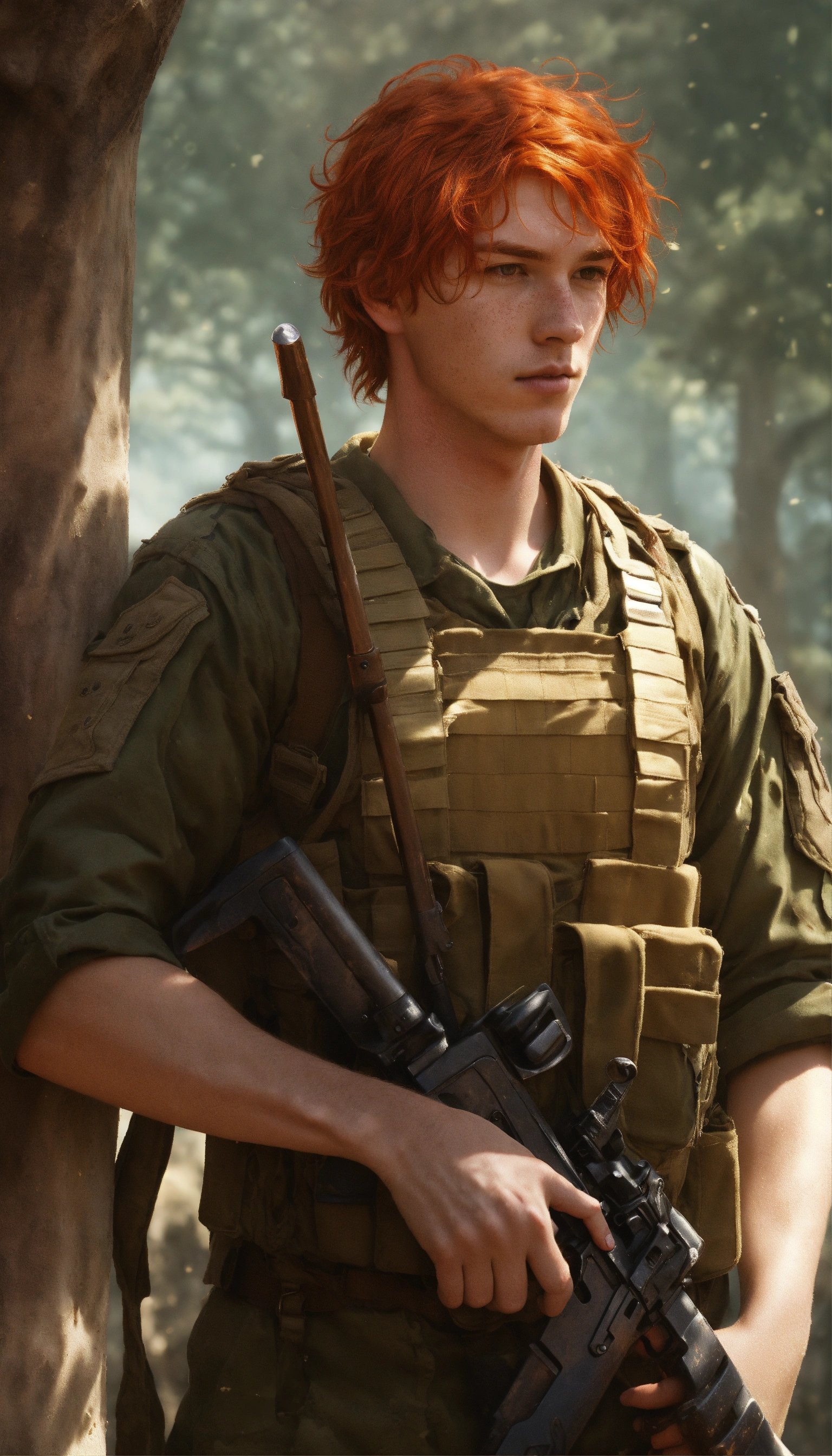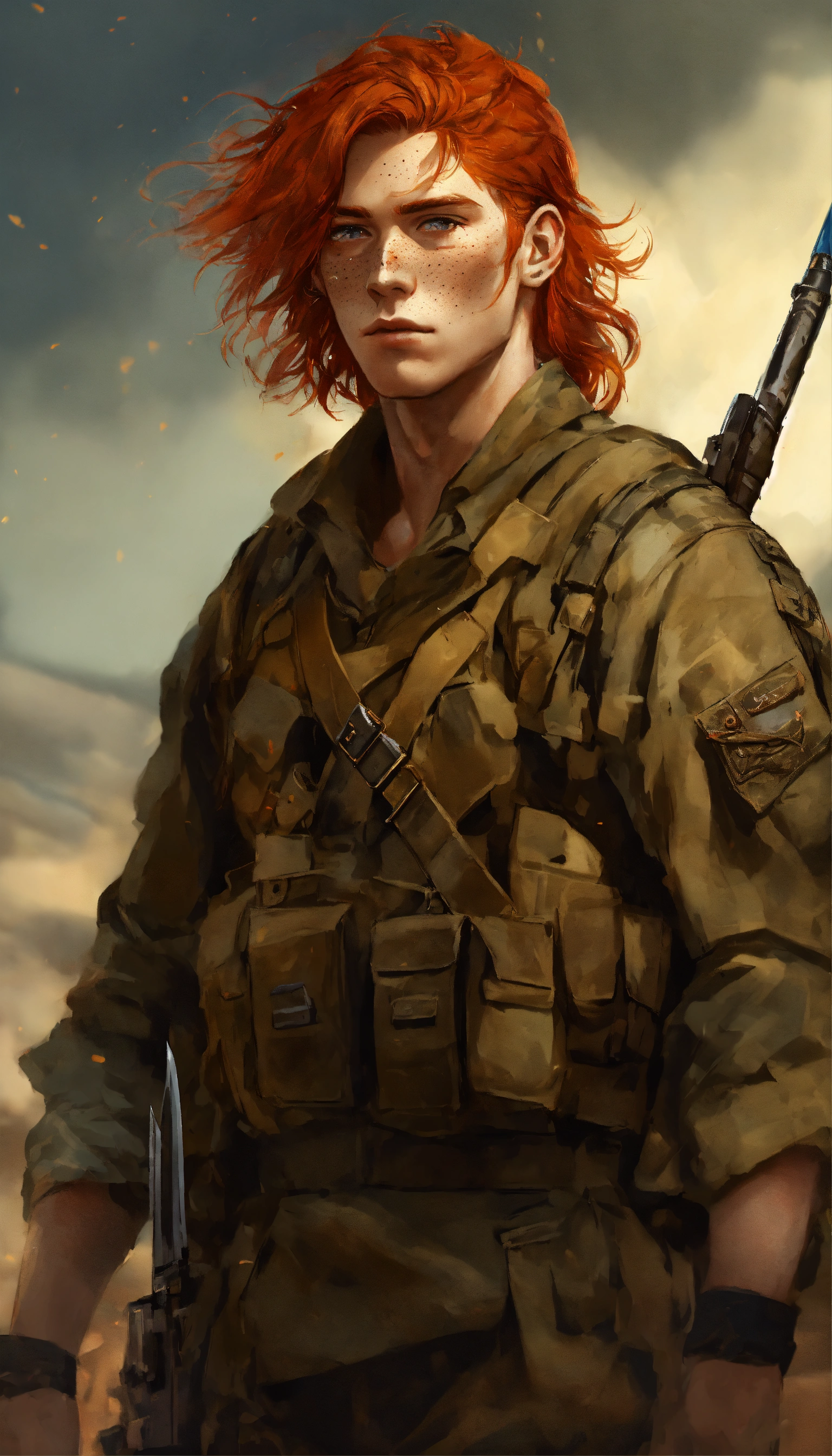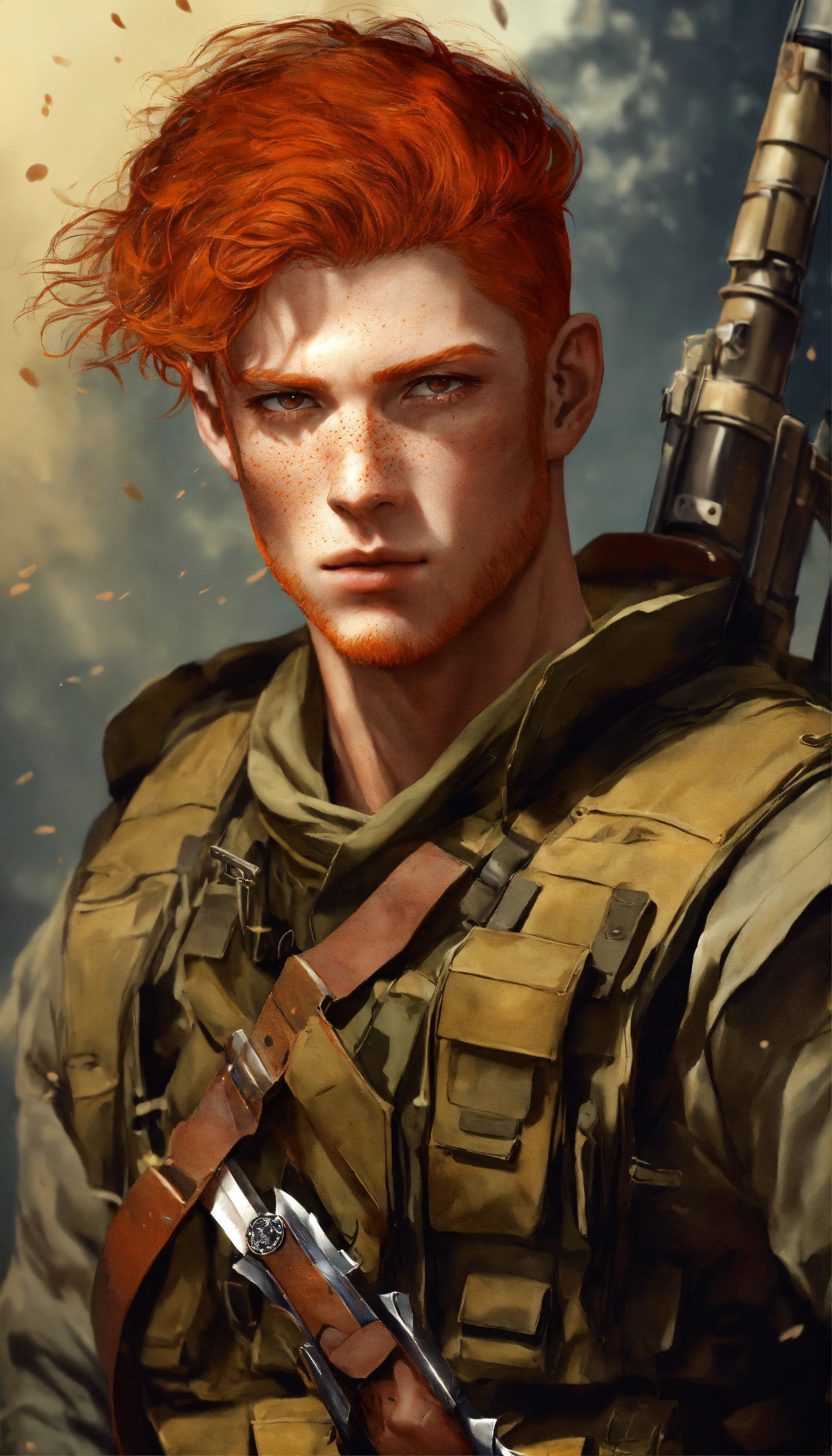 A soldier with a blade redhair, look really thin and have a really pale skin. he has messy hair and freckles on his nose.