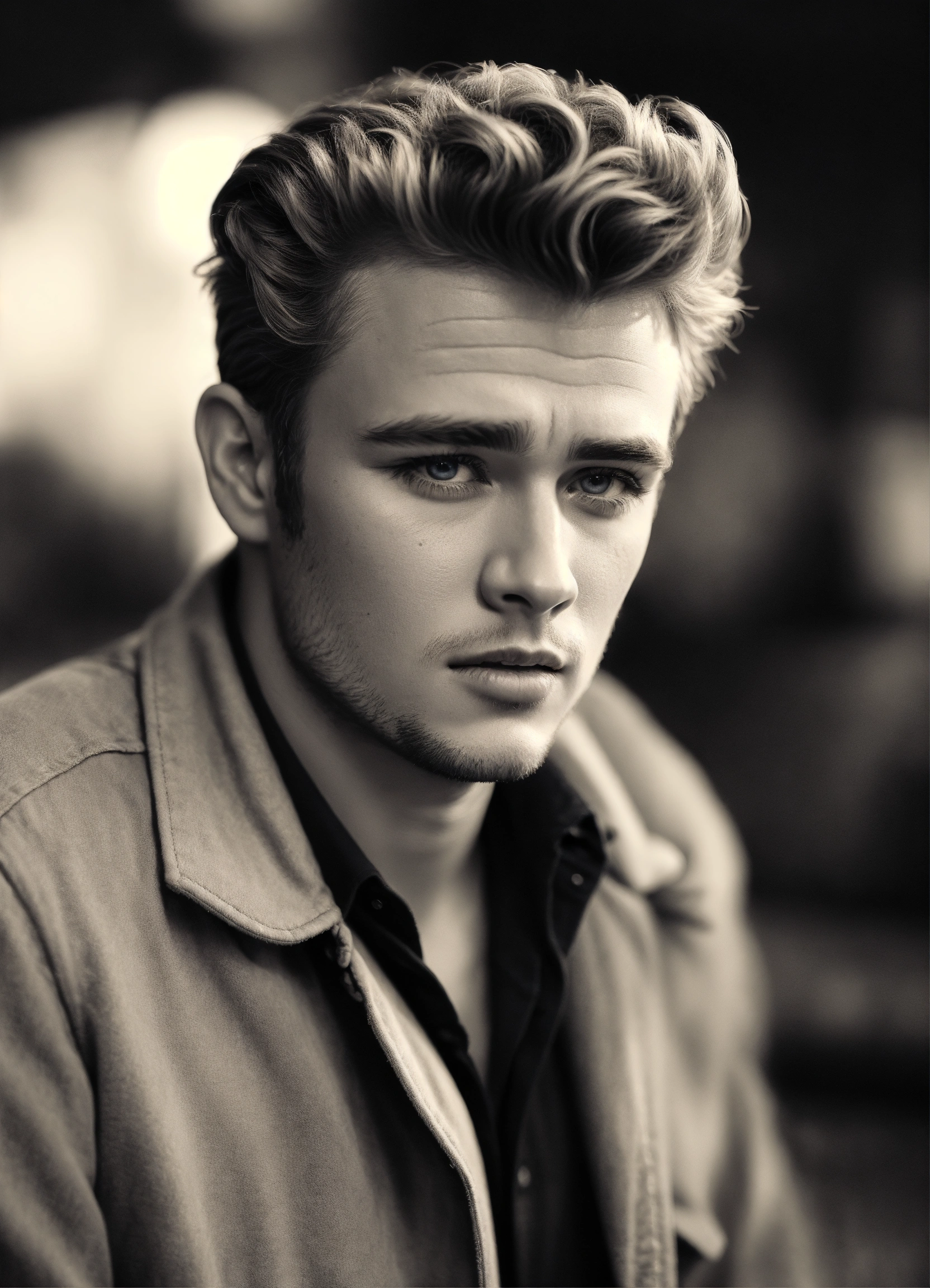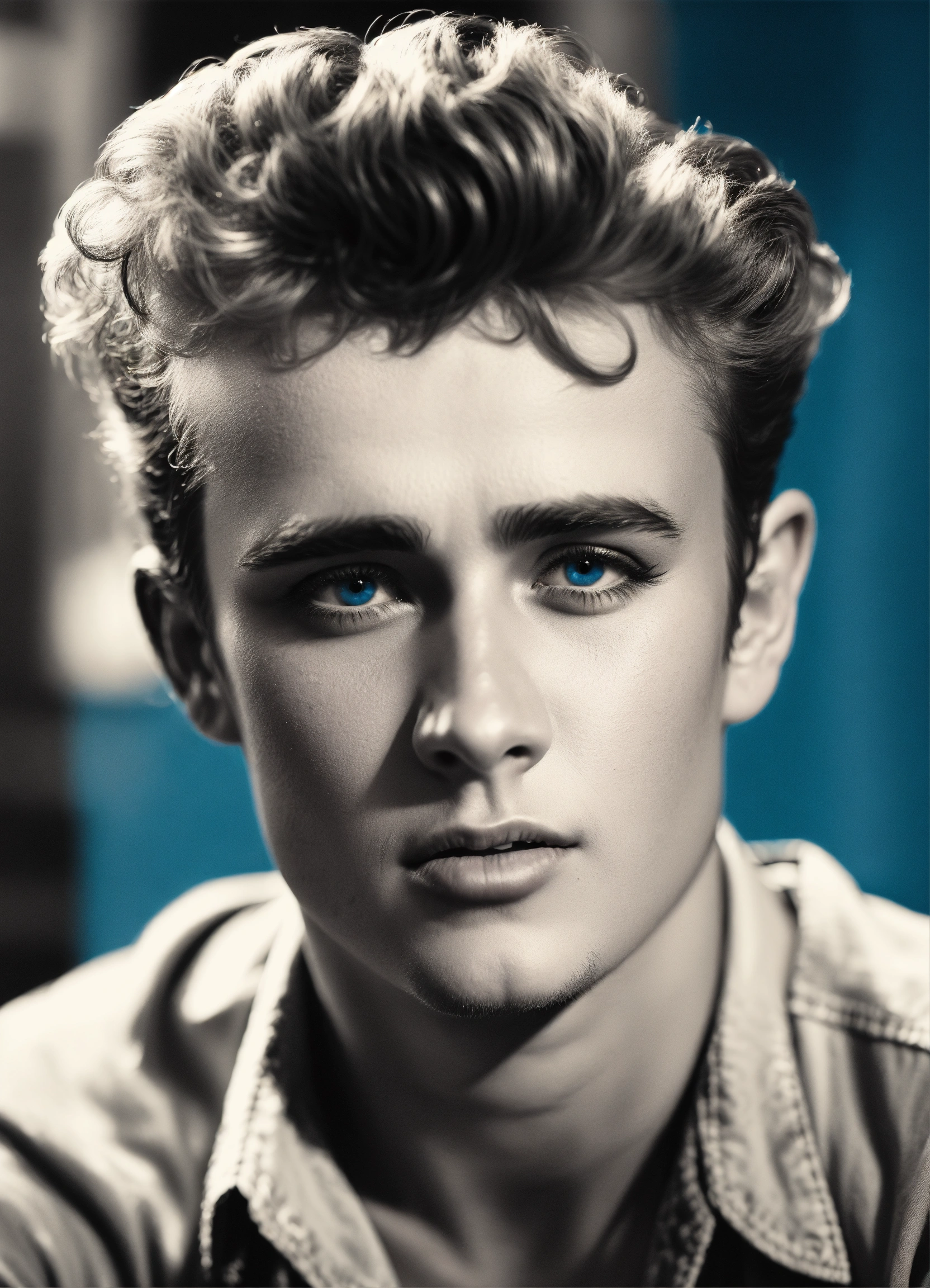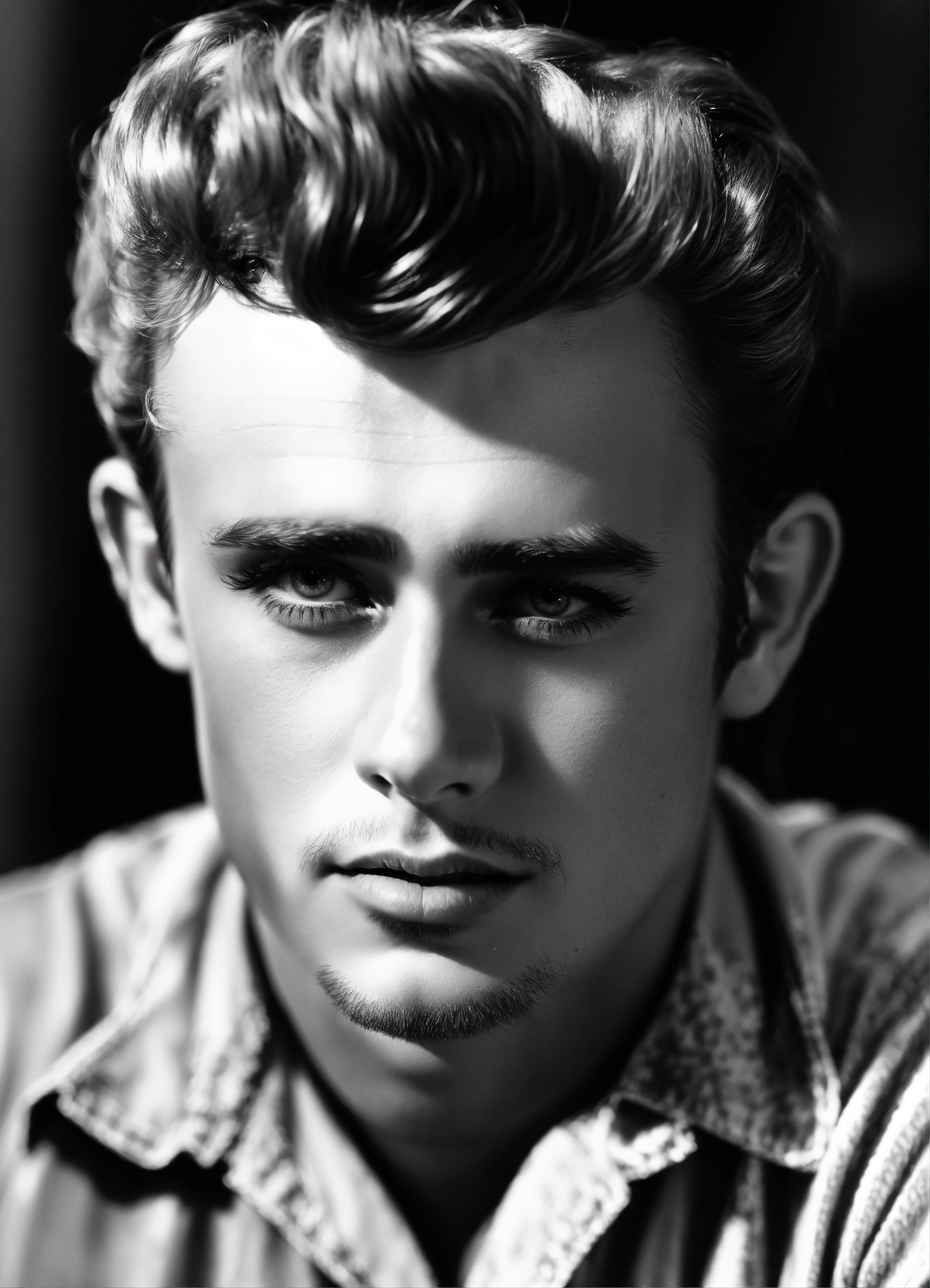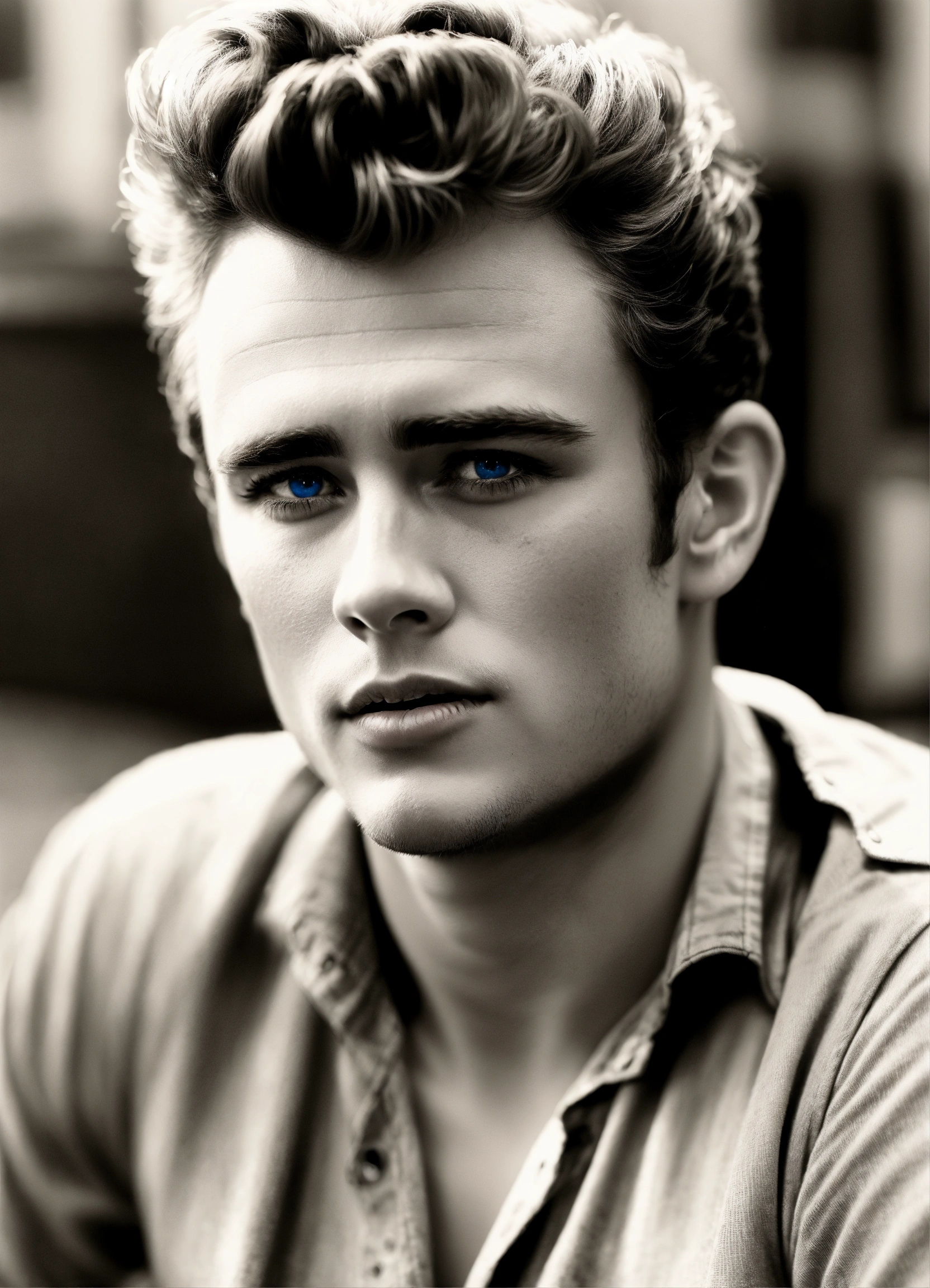Photorealistic, blackandwhite photo, james dean, blue eyes, 50s style, cool and classy attitute, pin up, soft focus, set card, moviestar, detailed, soft focus, 8k, q2