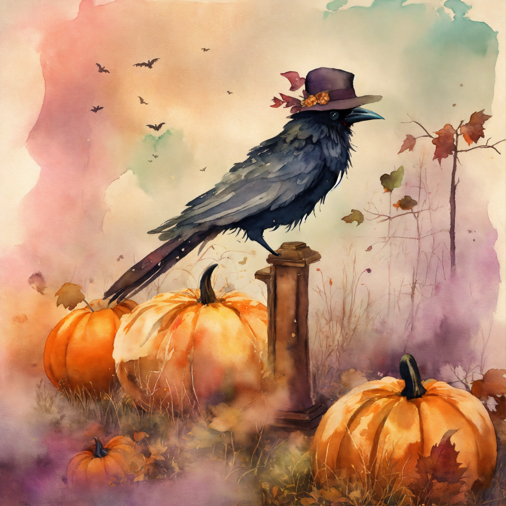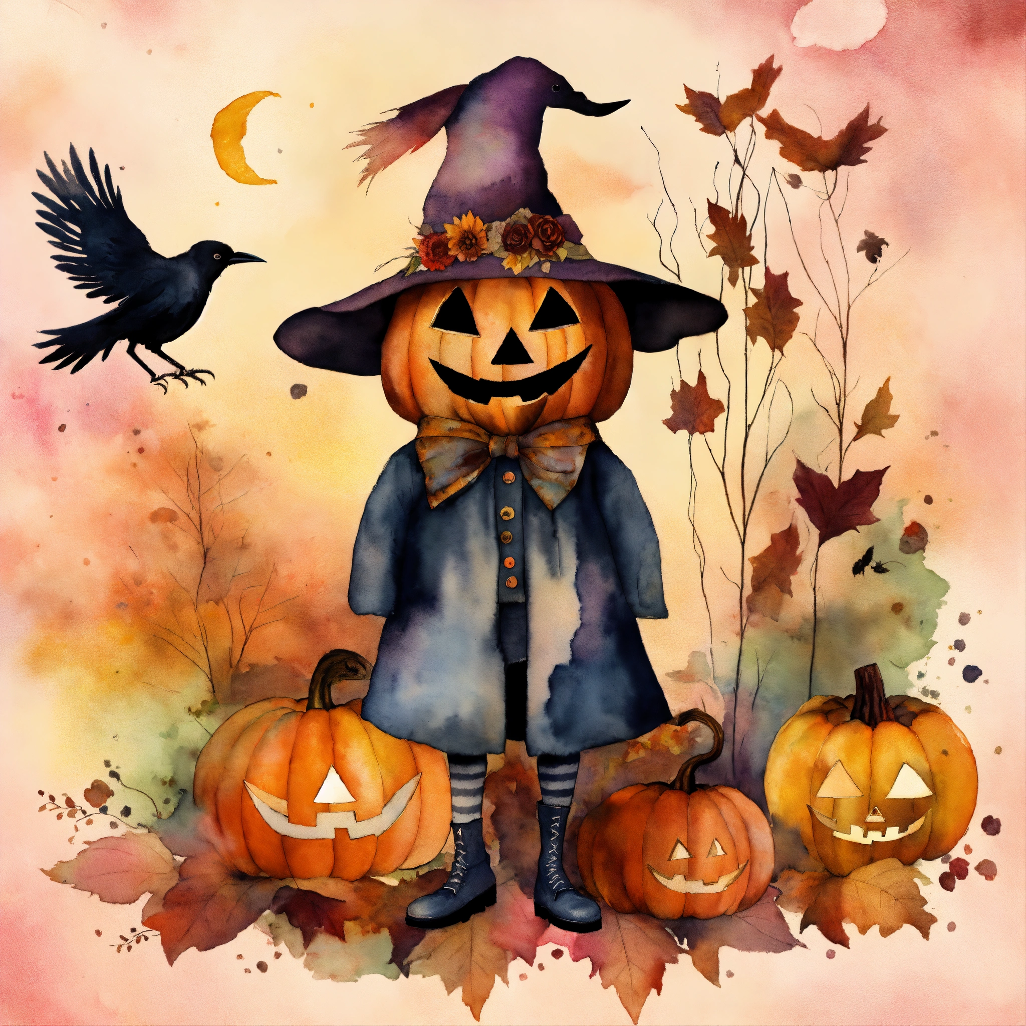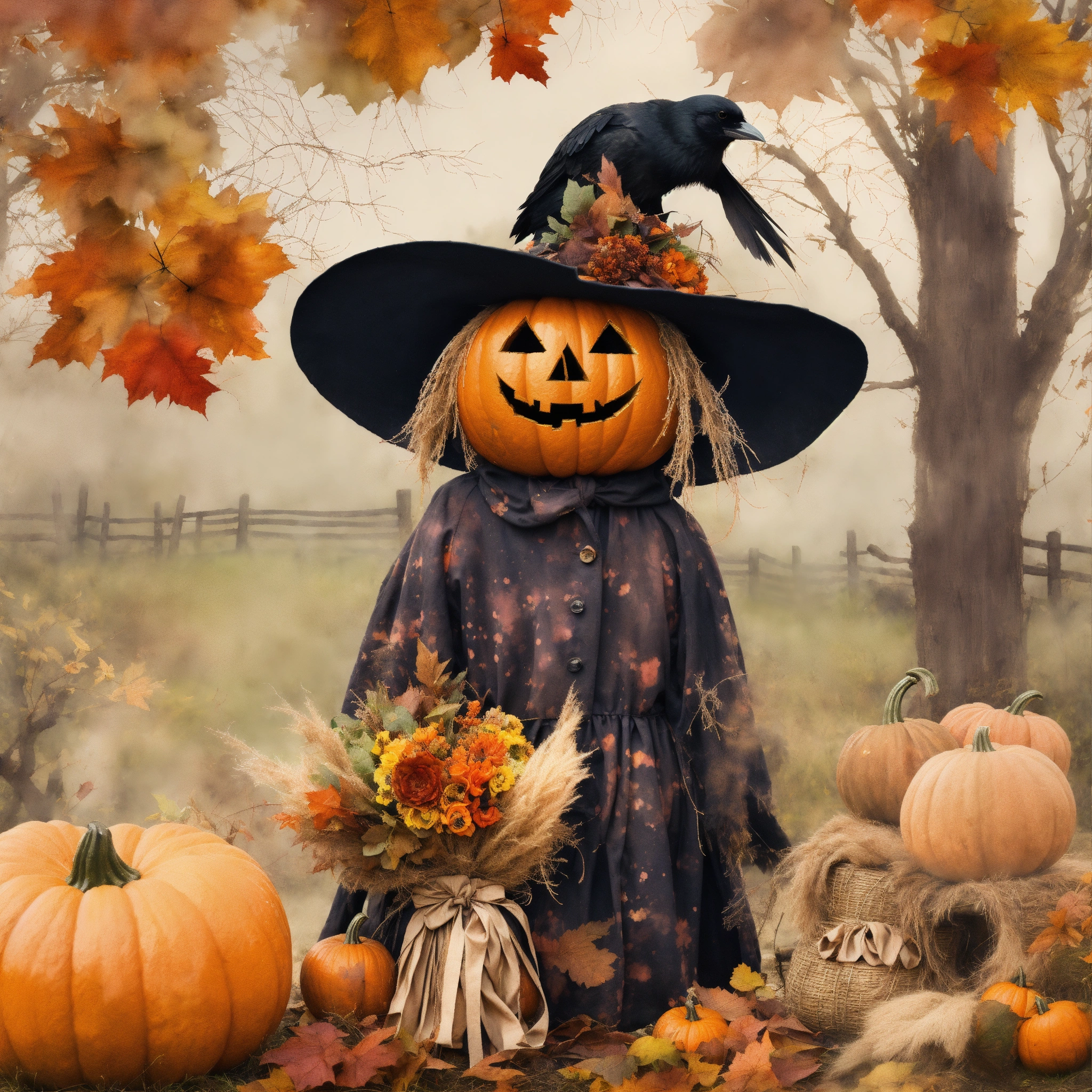 Shabby chic dreamy mist pastel junk journals scarecrow clipart watercolor, spooky crow scary autumn, scarecrows vintage clothes jack o lantern png swirling magical fairytale abstract art style
