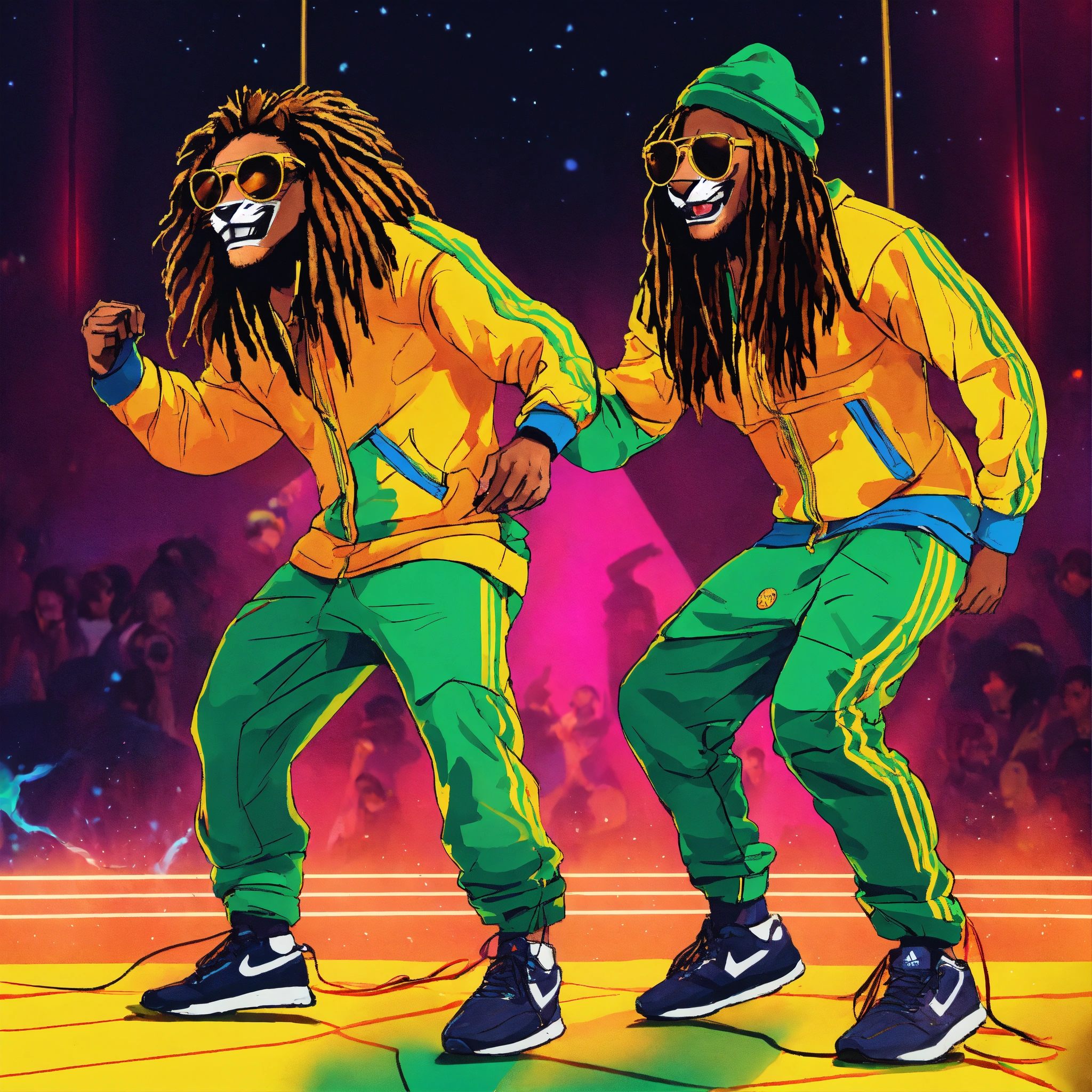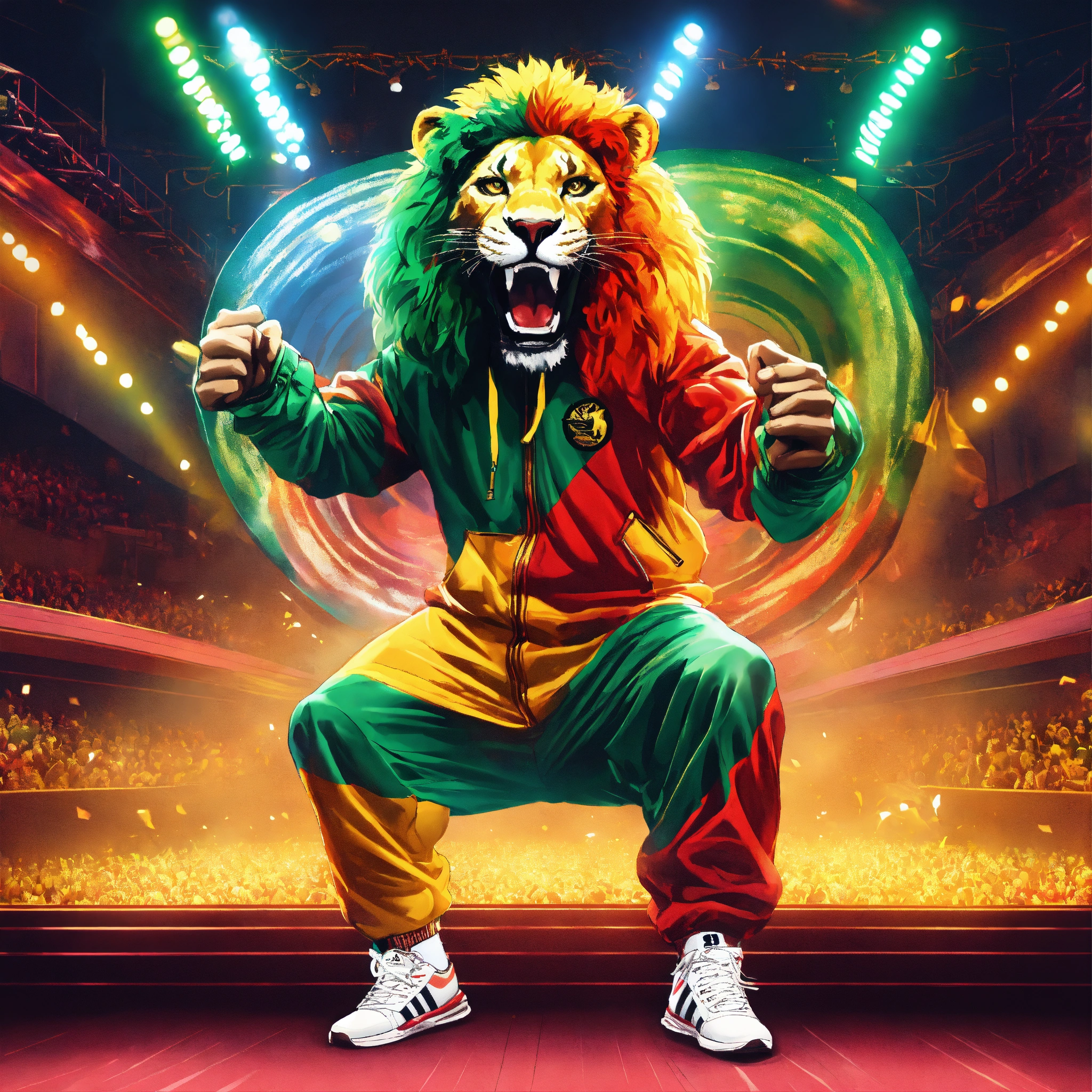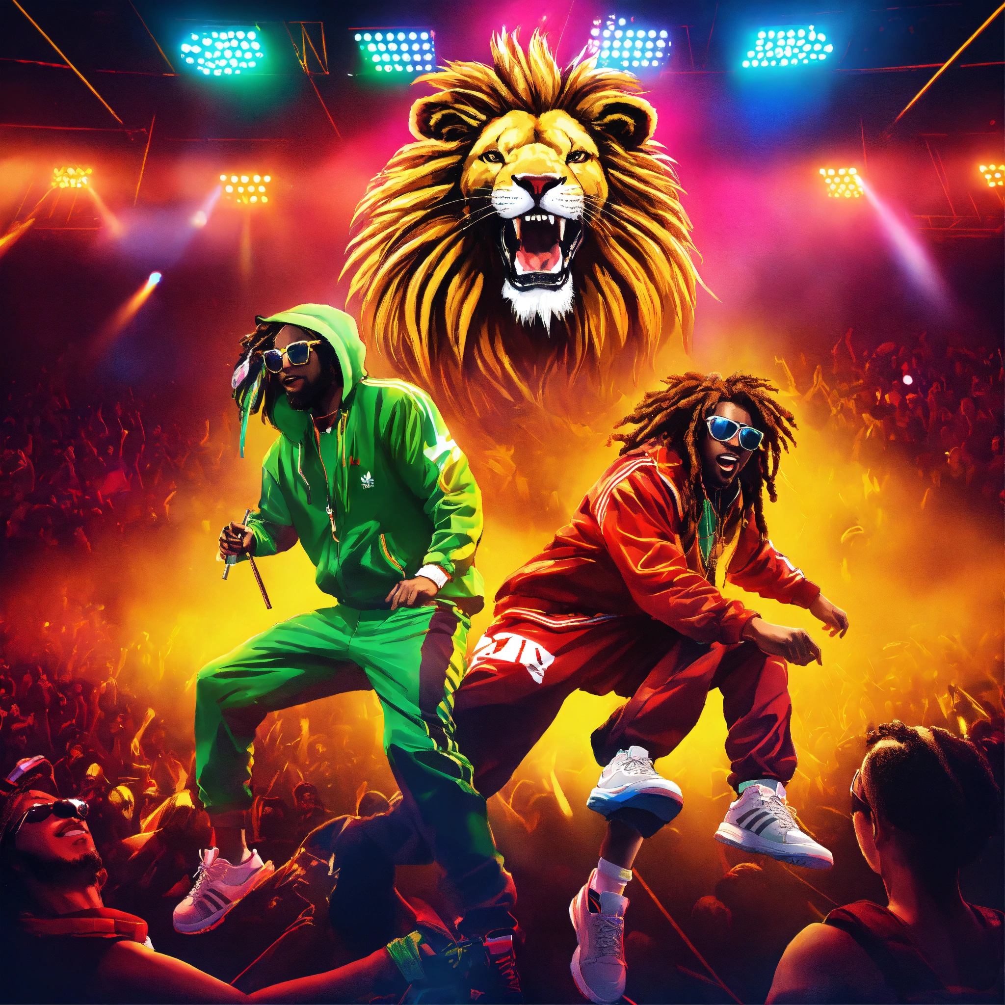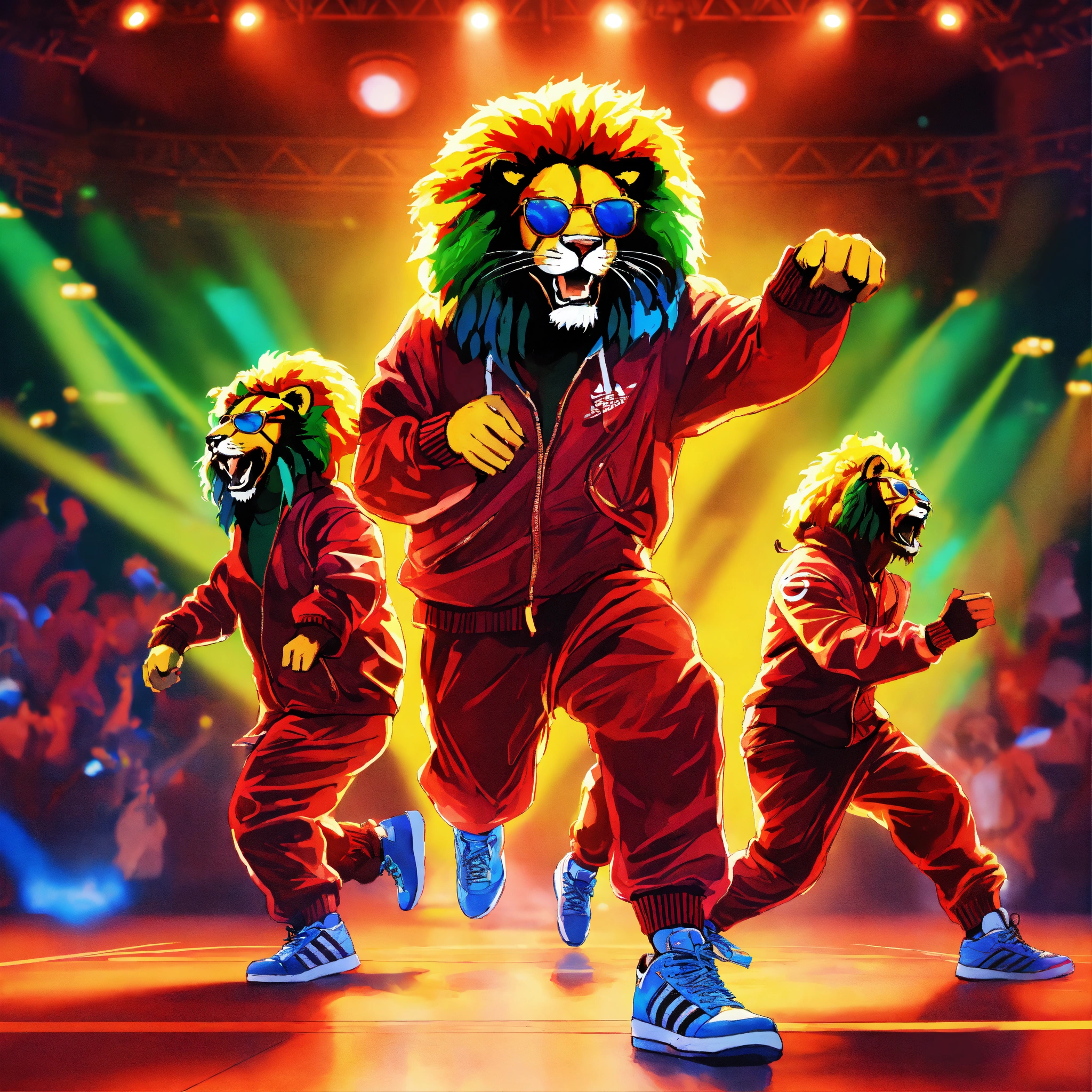 Artistic image type of image illustration prompt description create an electrifying illustration featuring three rasta lions wearing trendy sunglasses, dressed in adidas jumpsuits, showcasing their breakdancing skills like the jabbawockeez on a dynamic stage. the stage will be the focal point, with a massive and exuberant crowd cheering them on. the atmosphere will be filled with vibrant and colorful lights, creating a mesmerizing light show. a hazy mist of smoke will envelop the stage, adding to the energy and excitement.