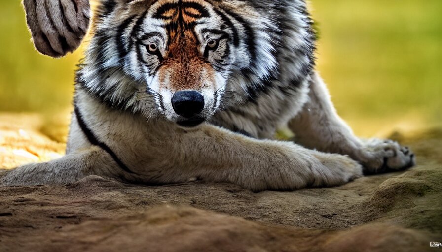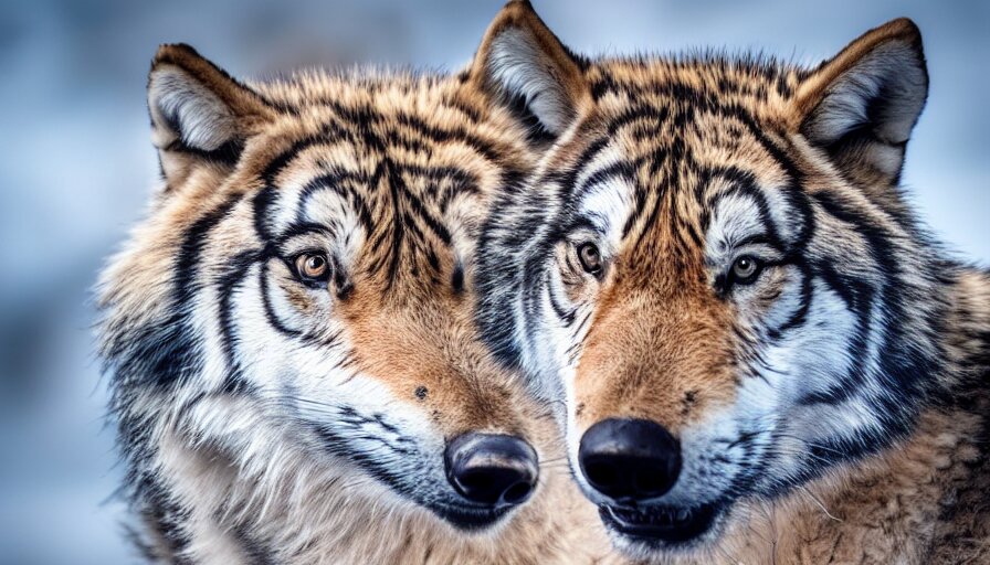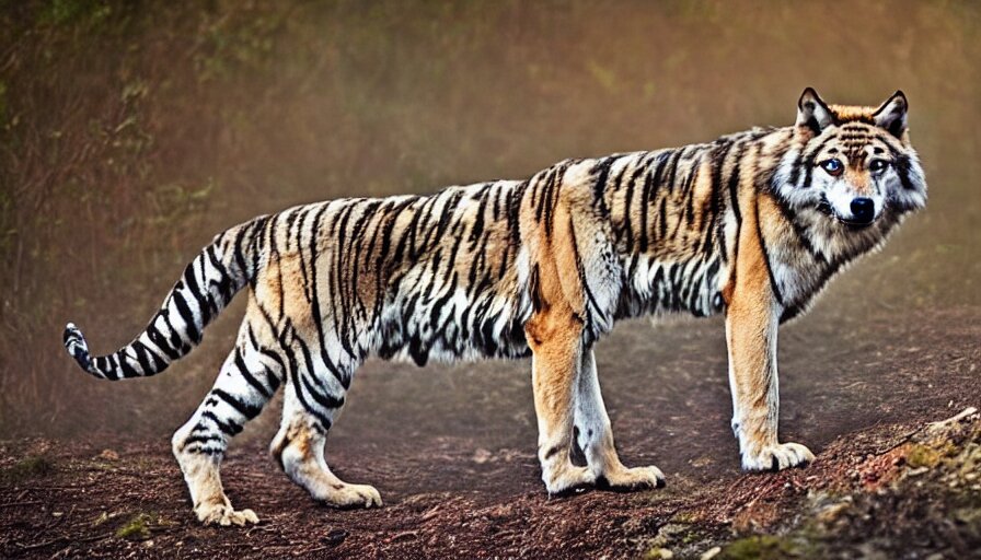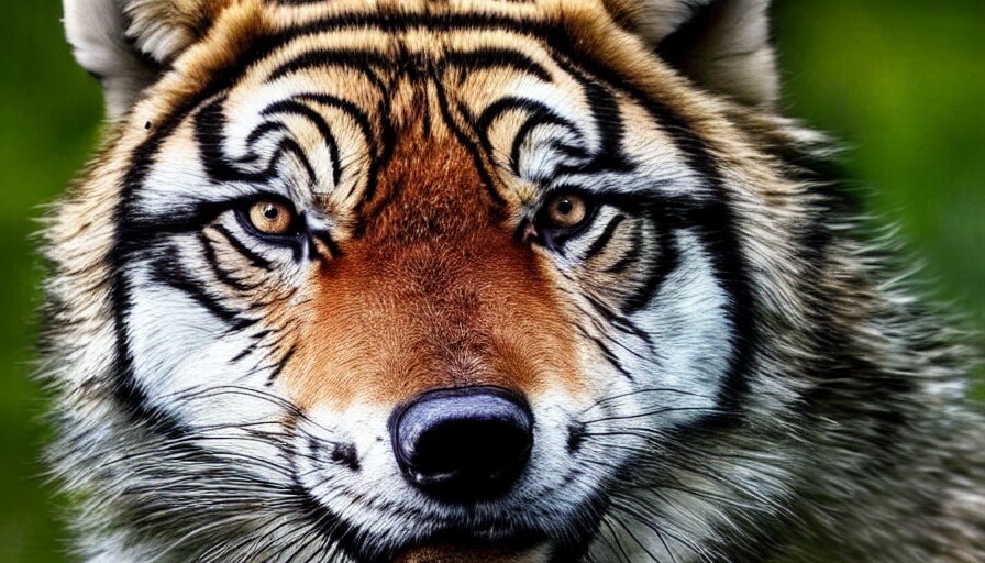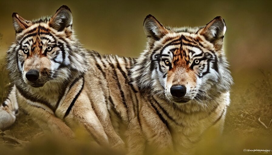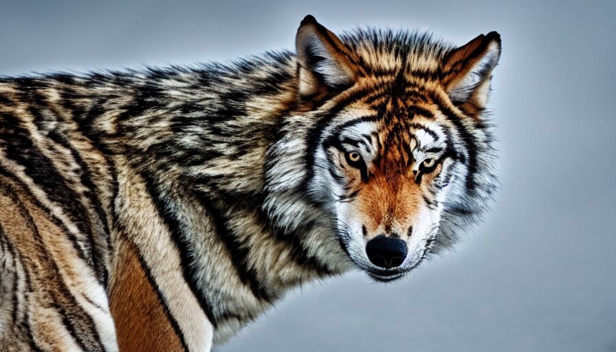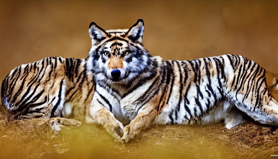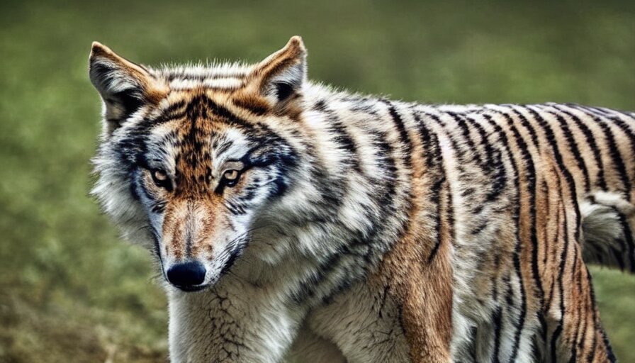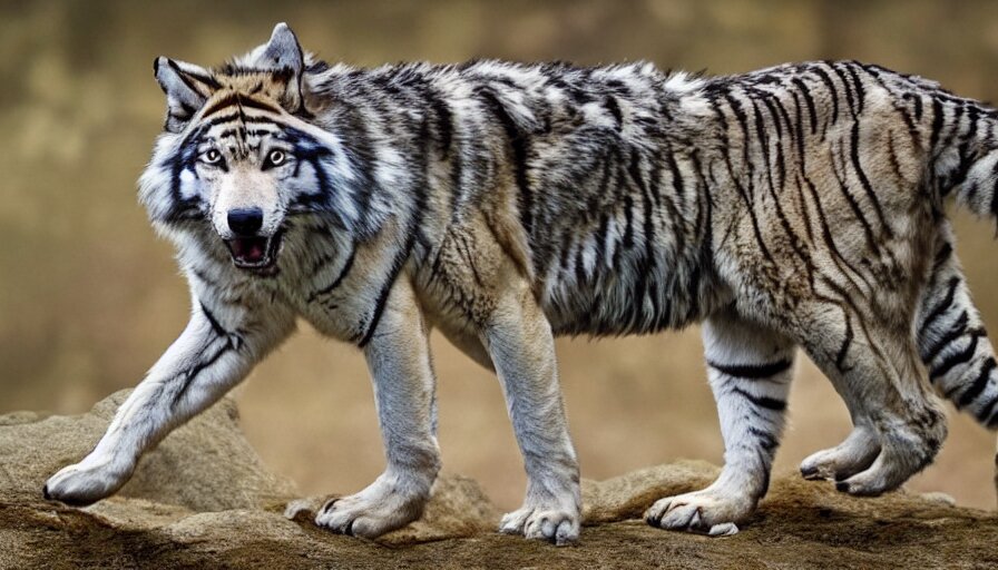 A wolf tiger!!! hybrid! hyper realistic!! realistic lighting!! wildlife photographer of the year!!! bold natural colors, national geographic, hd, wide angle, 8 k