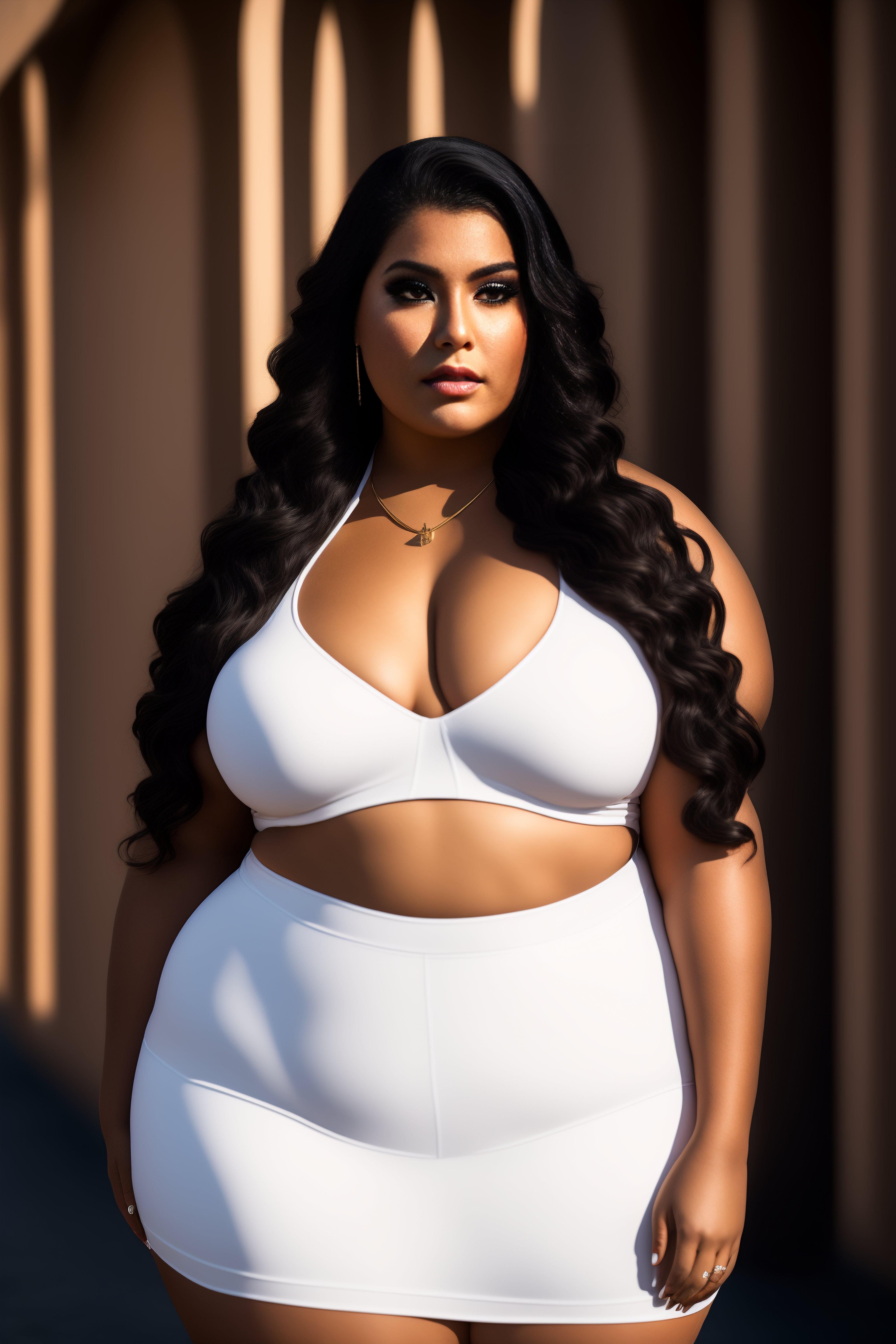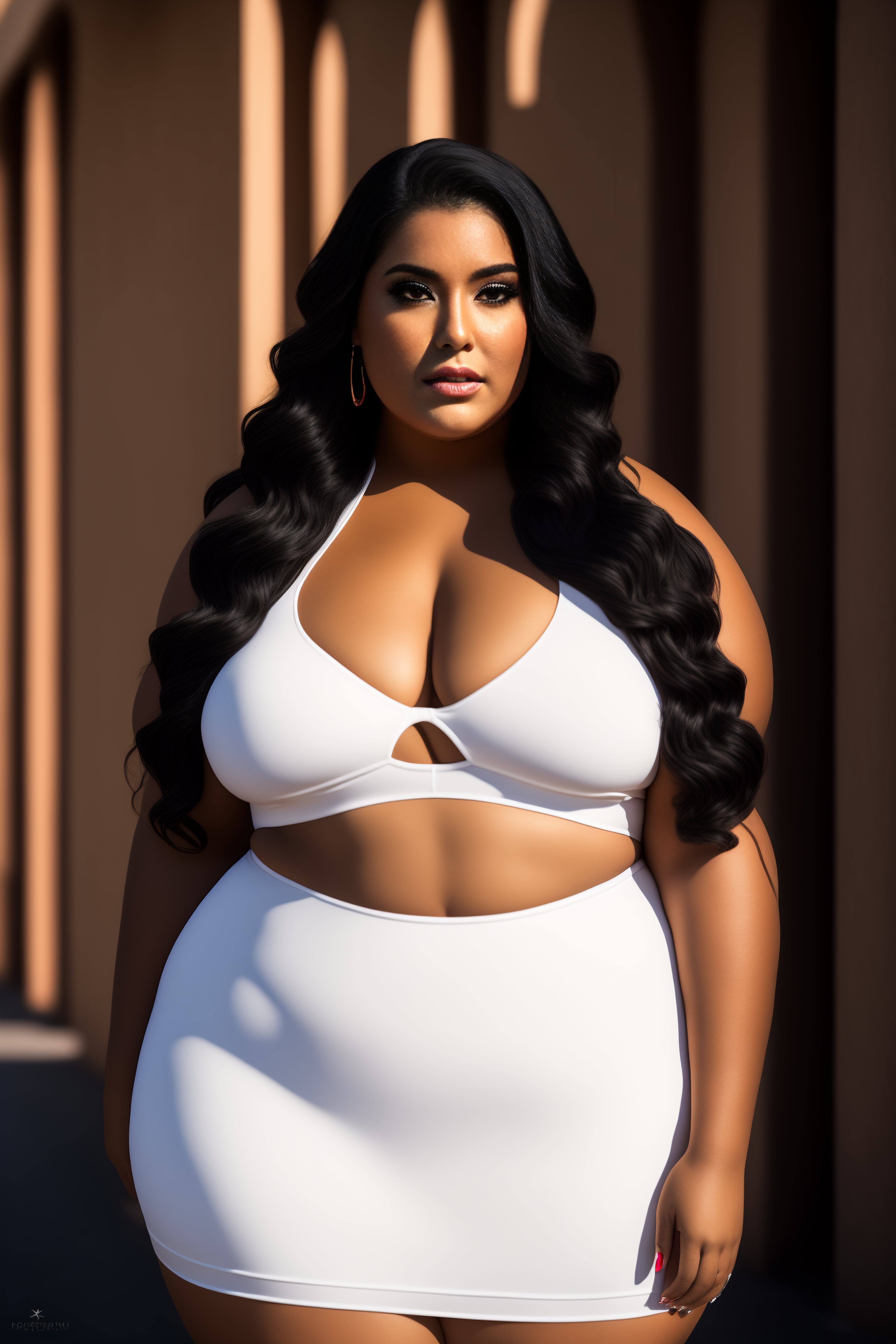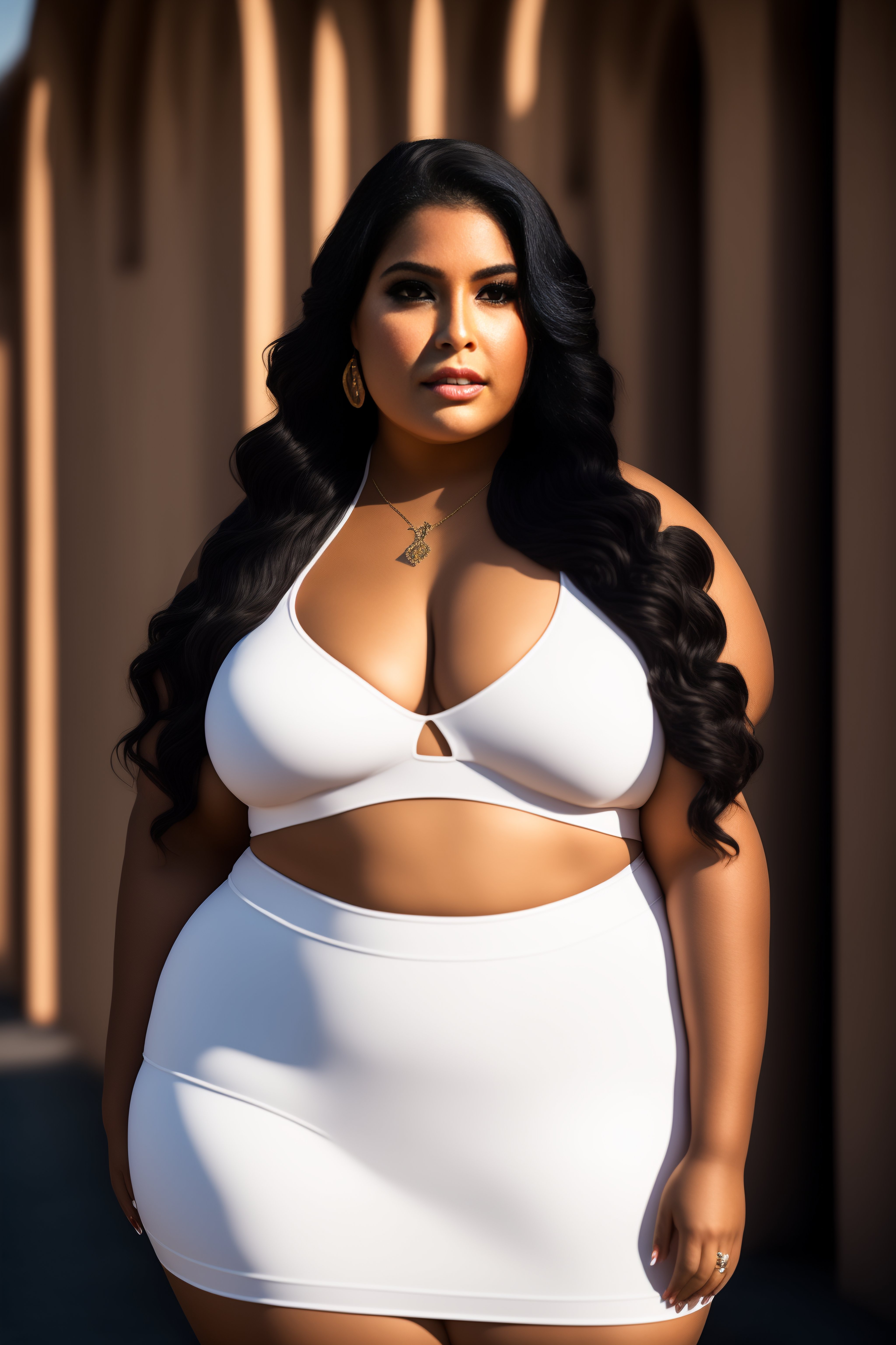 Plus-sized latina model, makeup, eyeliner, wide hips, pretty symmetrical face, outdoor, natural light, photograph, canon 5d mark iii