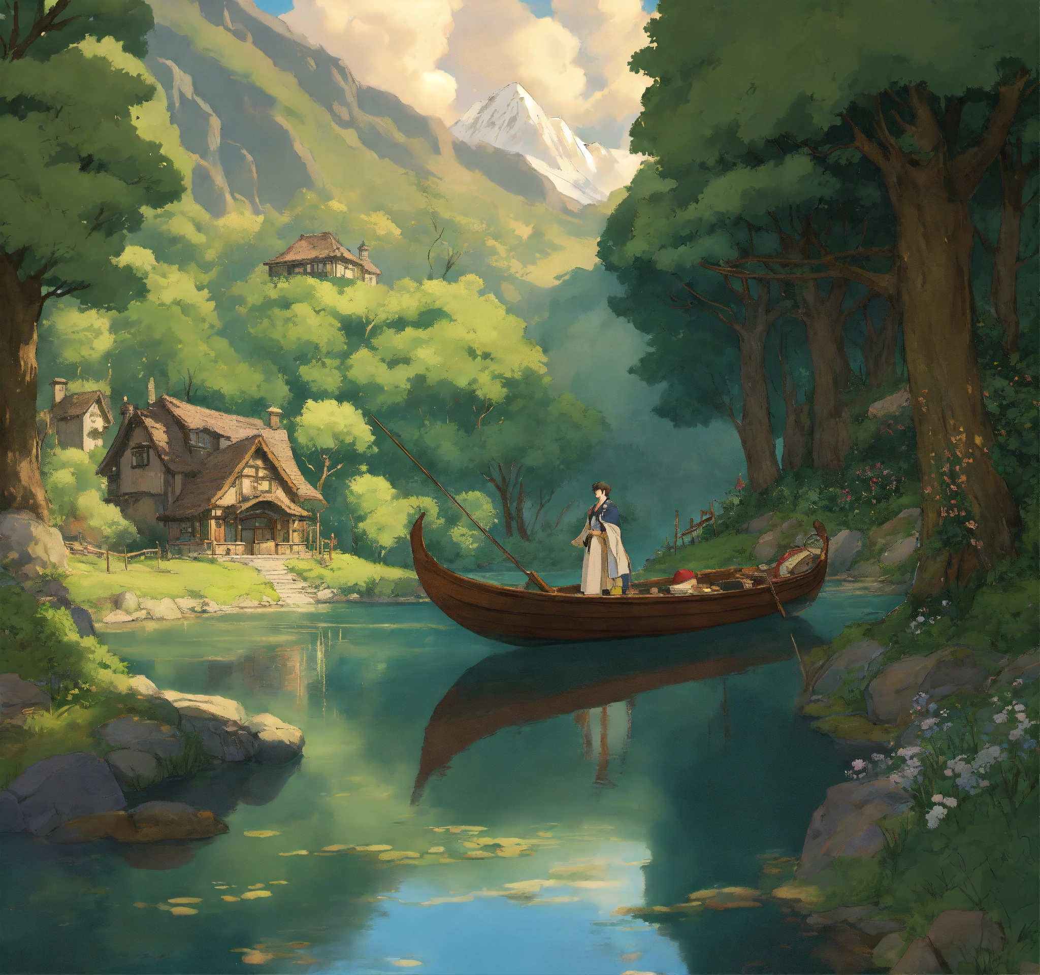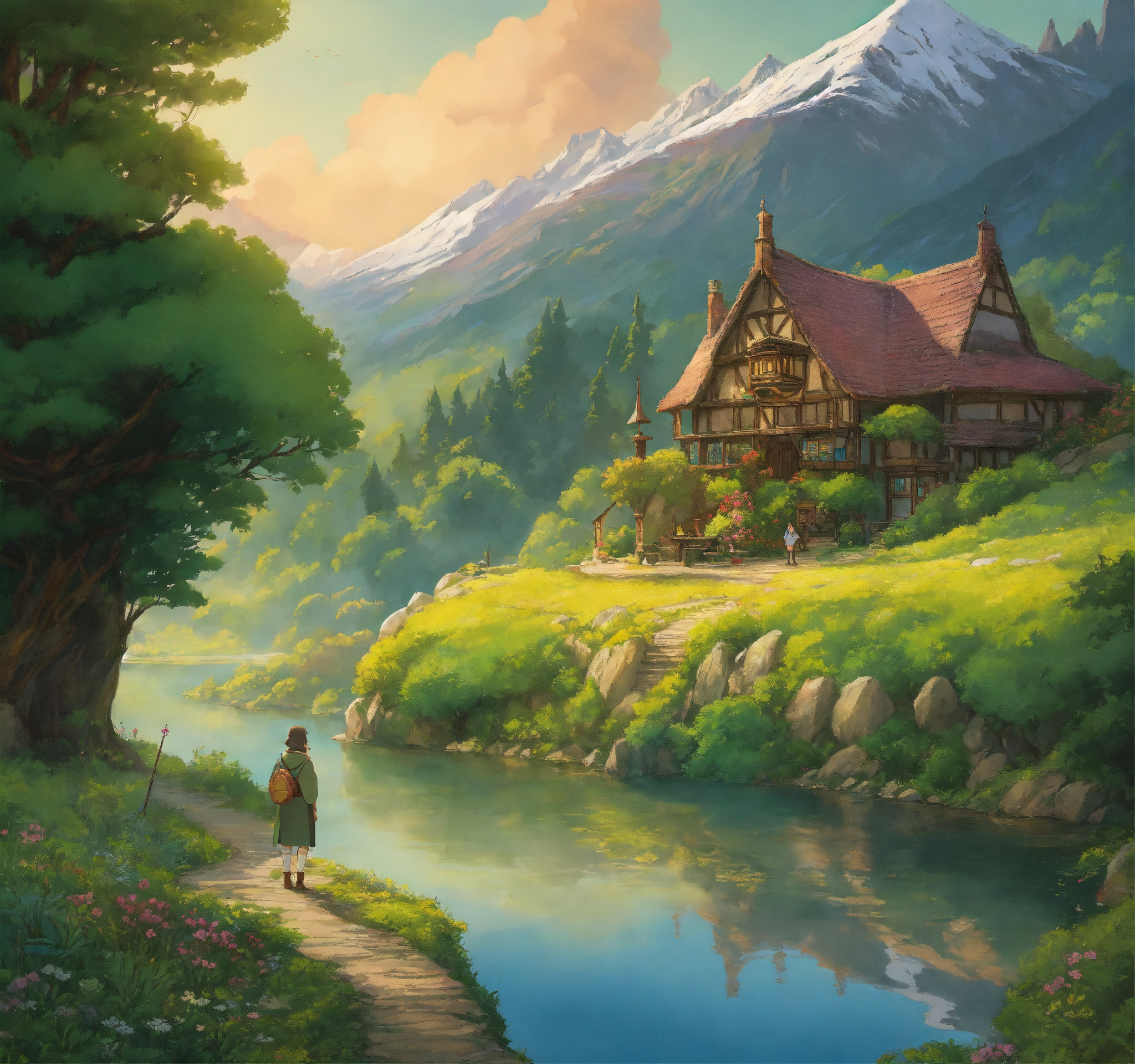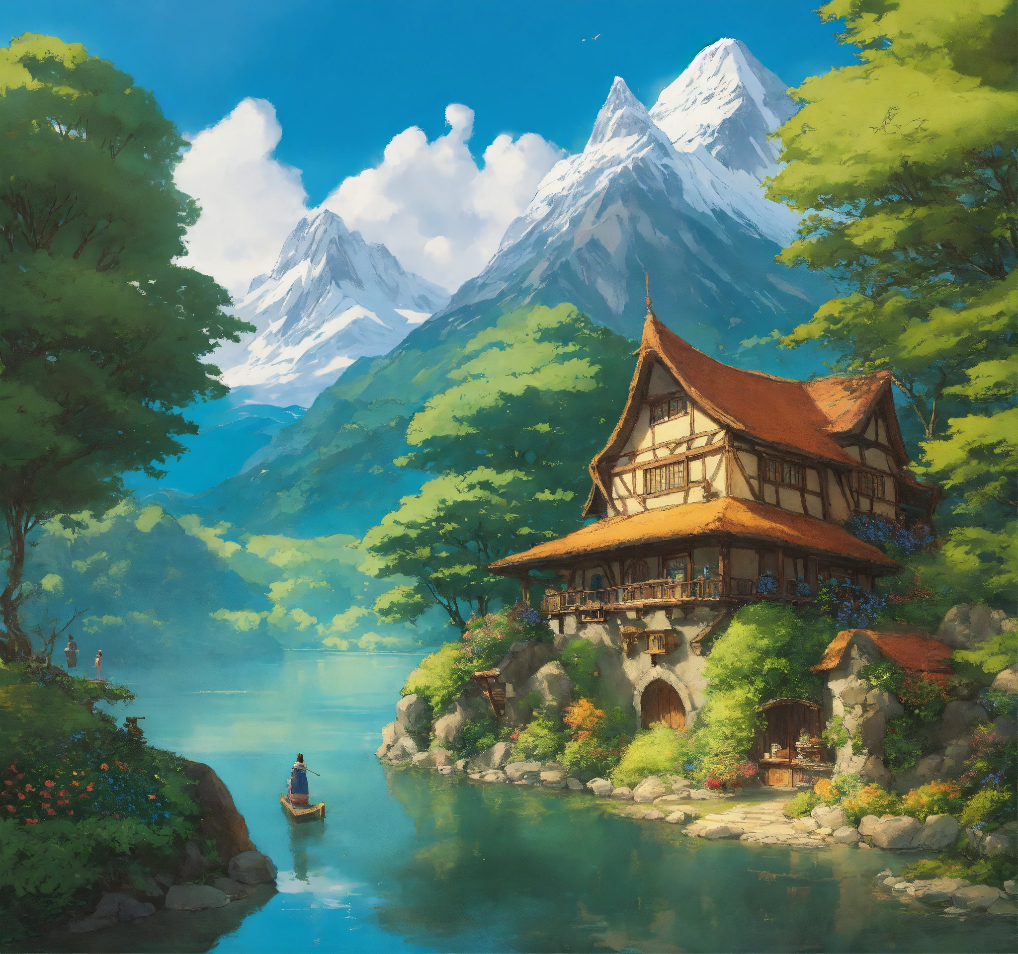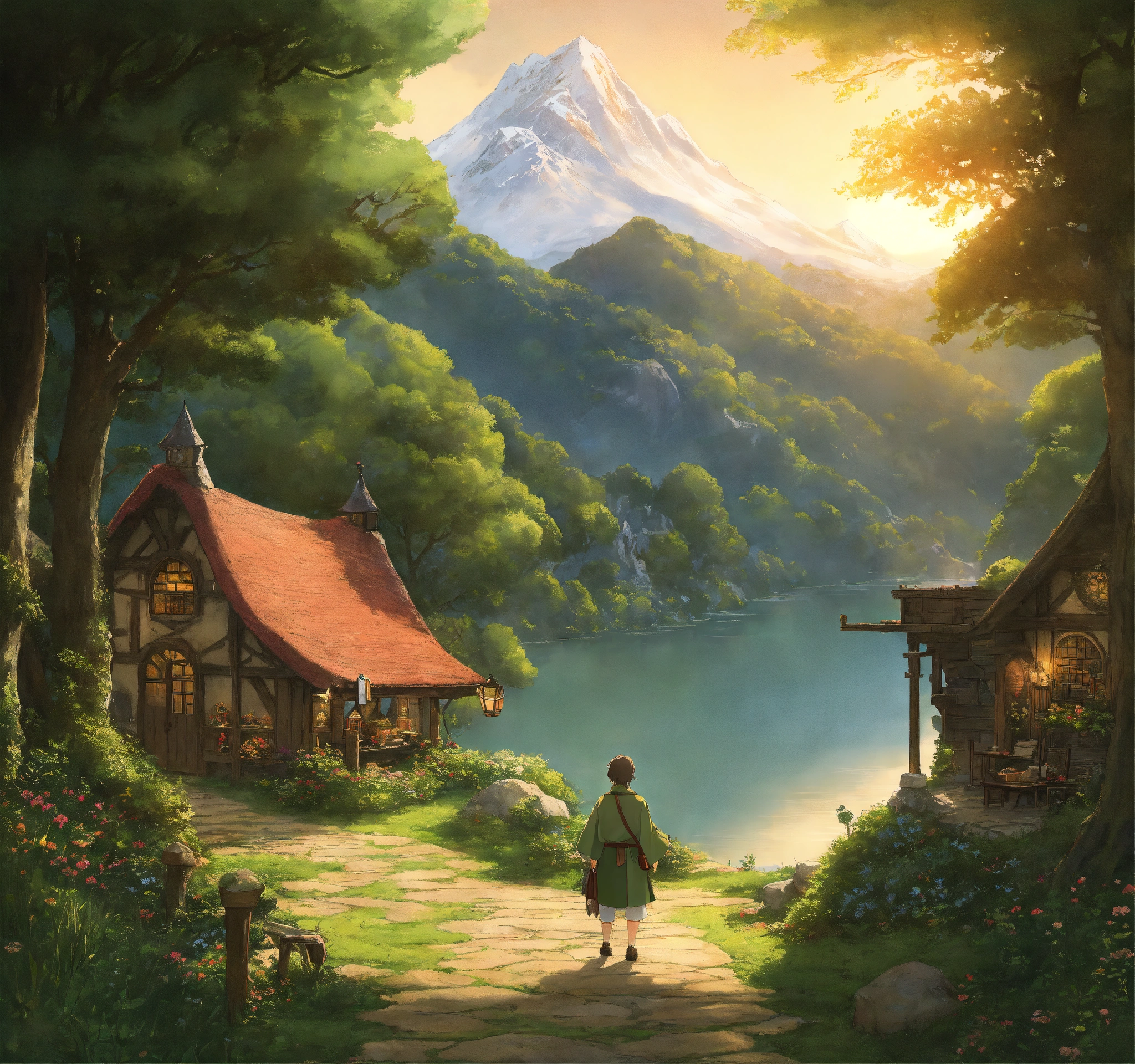 Transport yourself to a dreamy world where a snowy valley and a tranquil lake meet in the style of the lord of the rings are brought to life in the distinct and mesmerizing style of studio ghibli