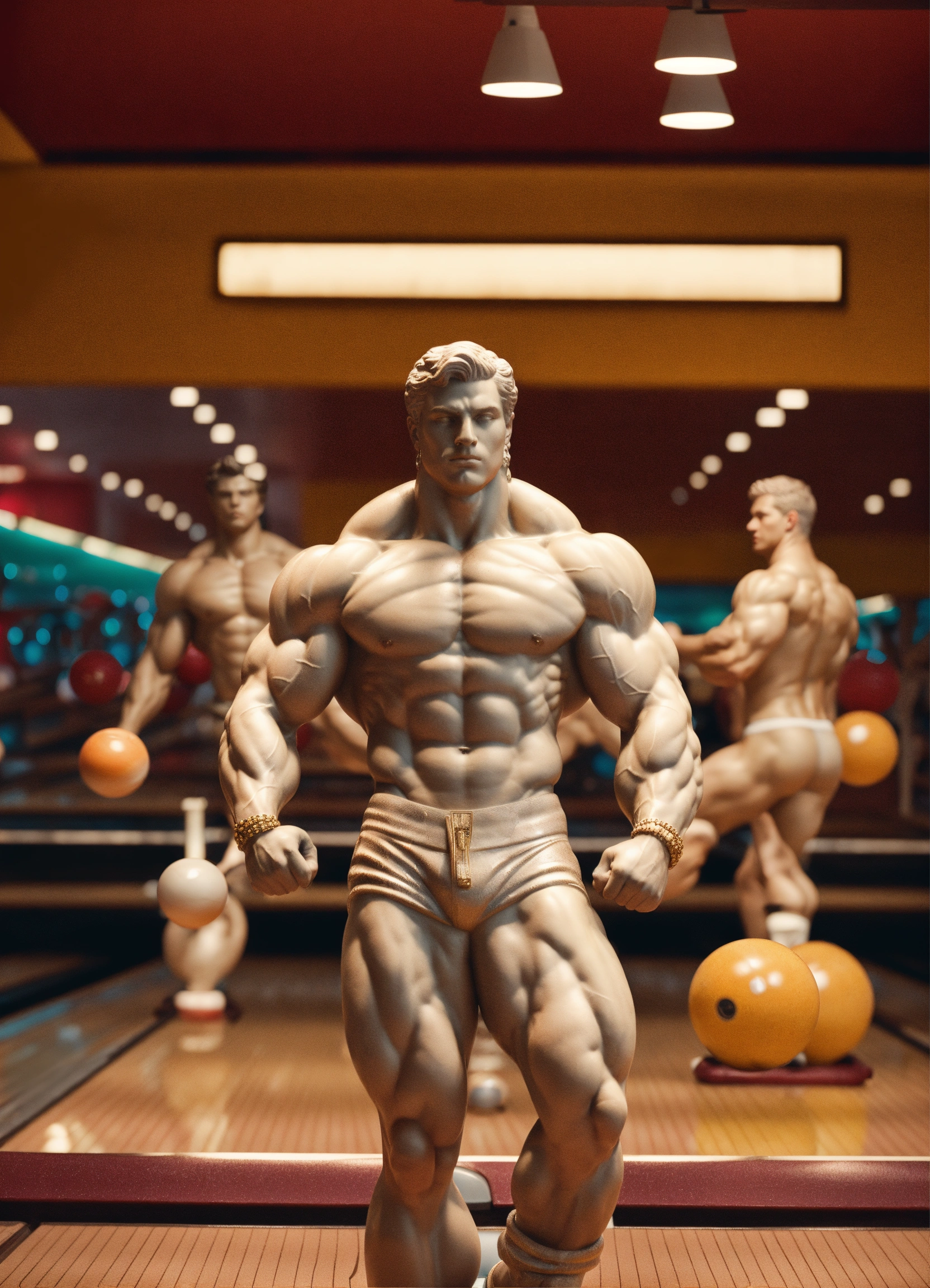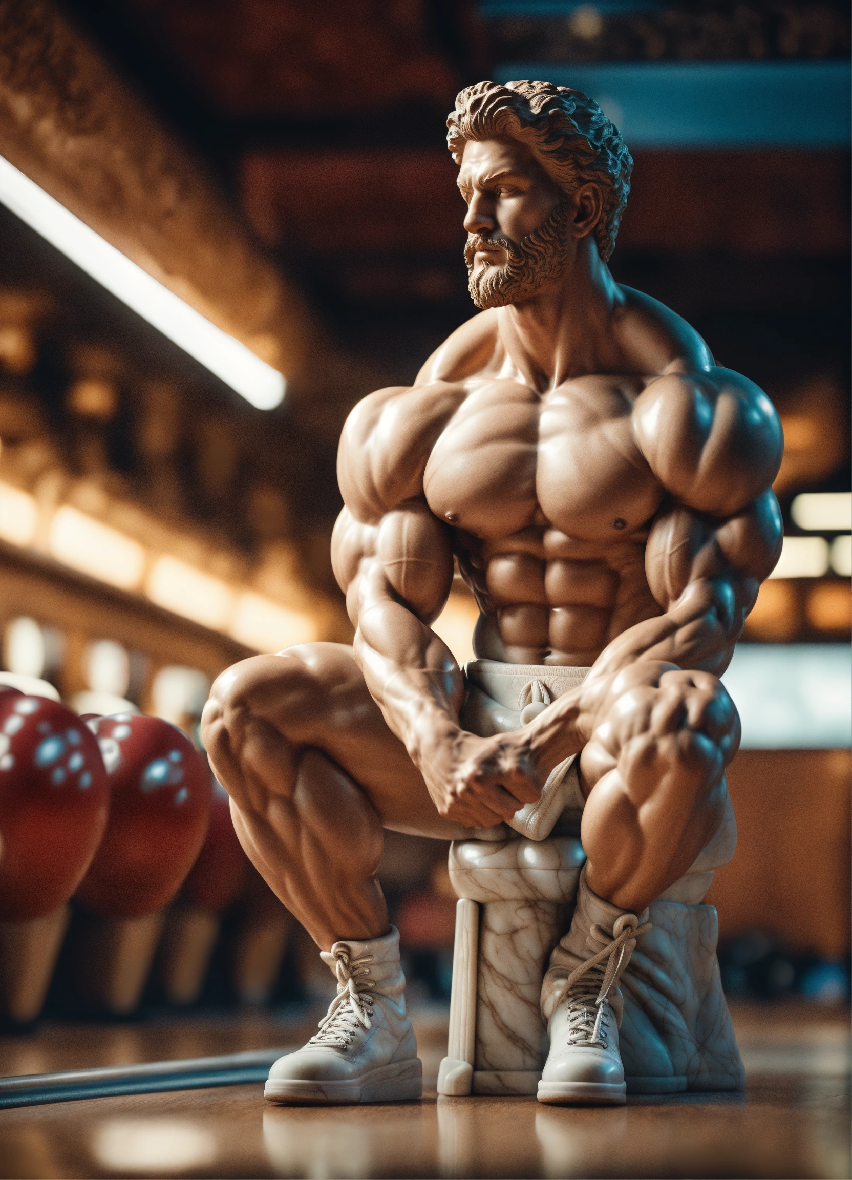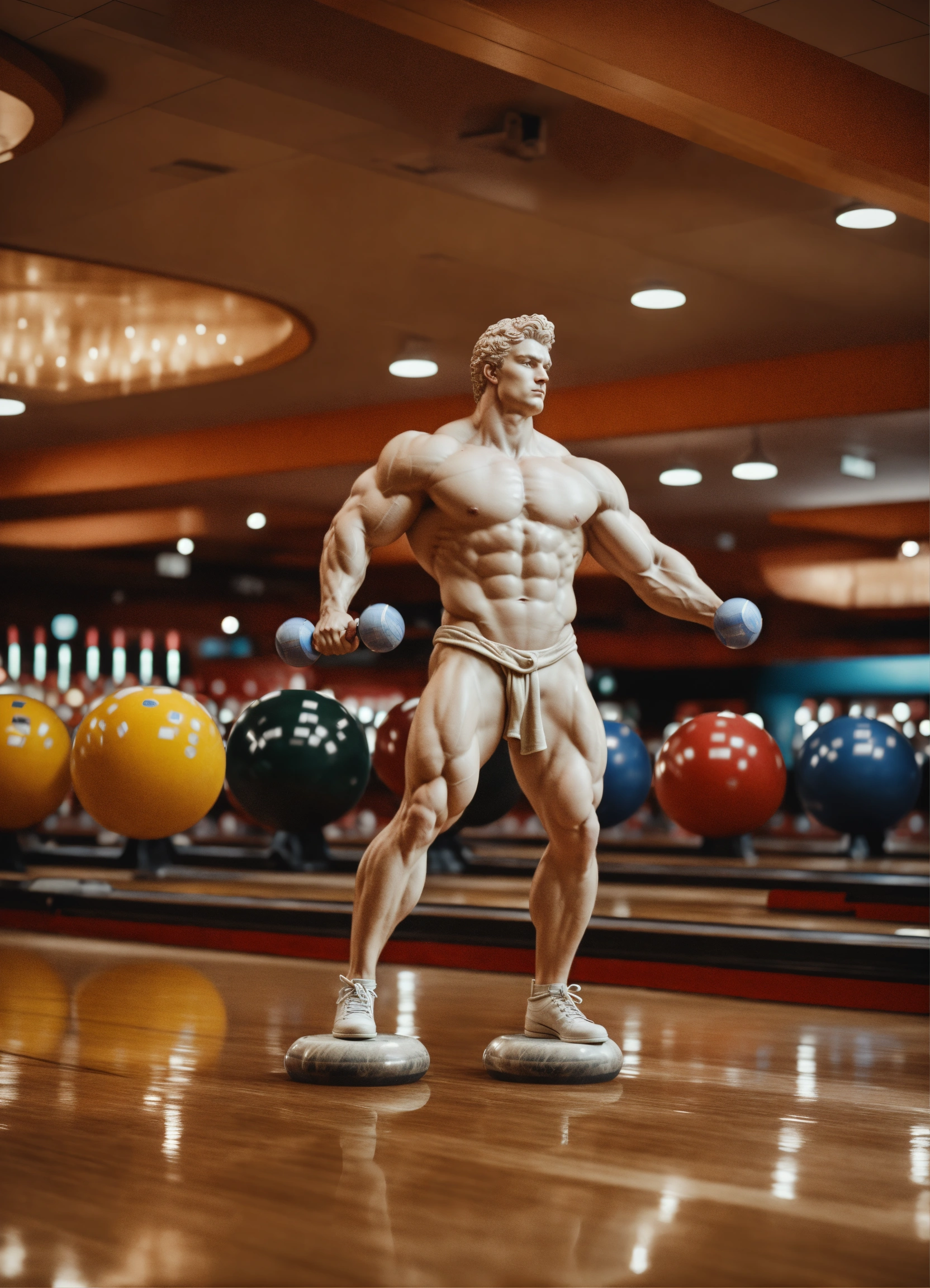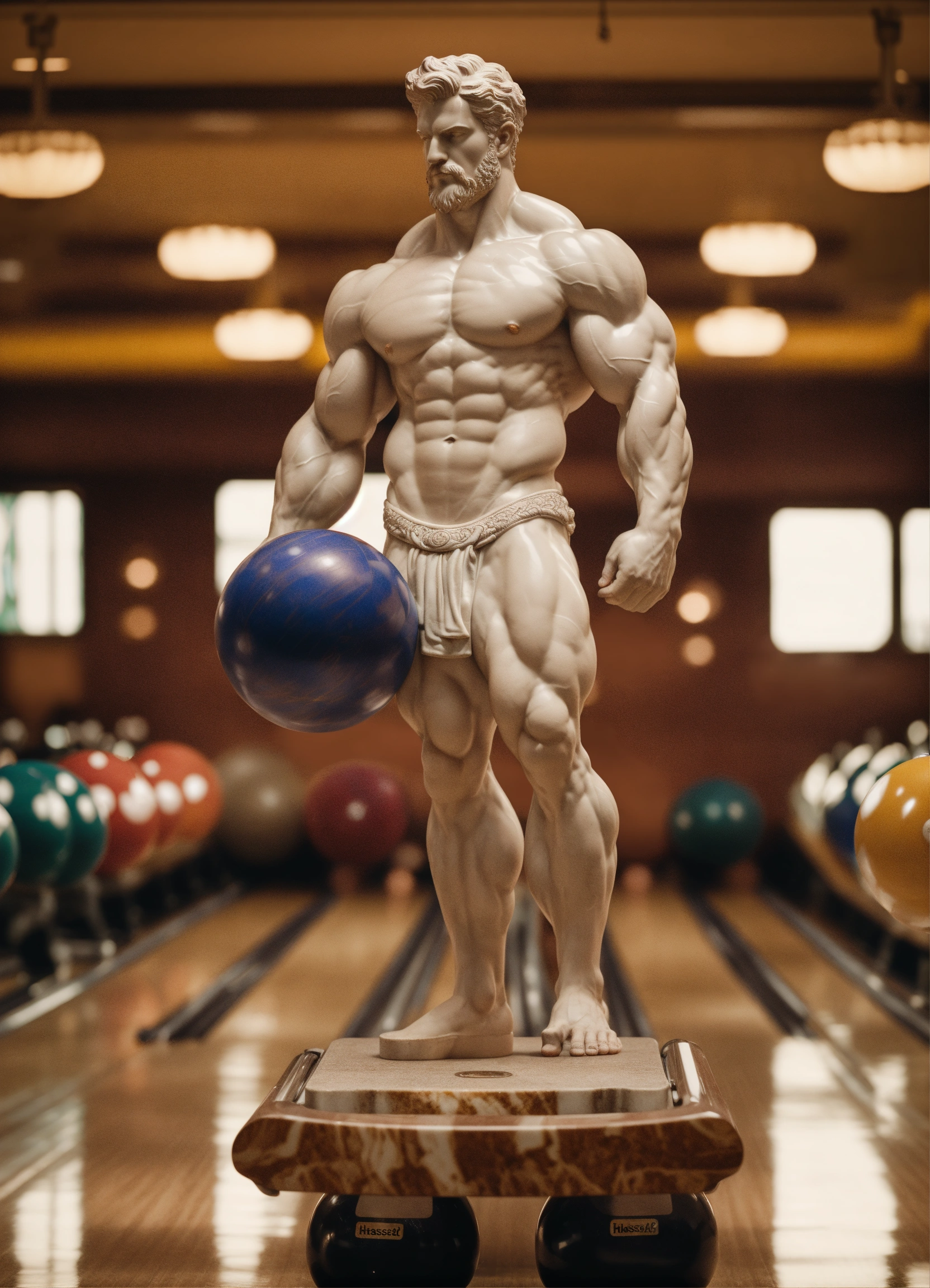 Muscular marble statues flexing their muscles and lifting weights. standing on a bowling alley. intricate details, photo taken on hasselblad, creative photoshoot, unreal render 8k