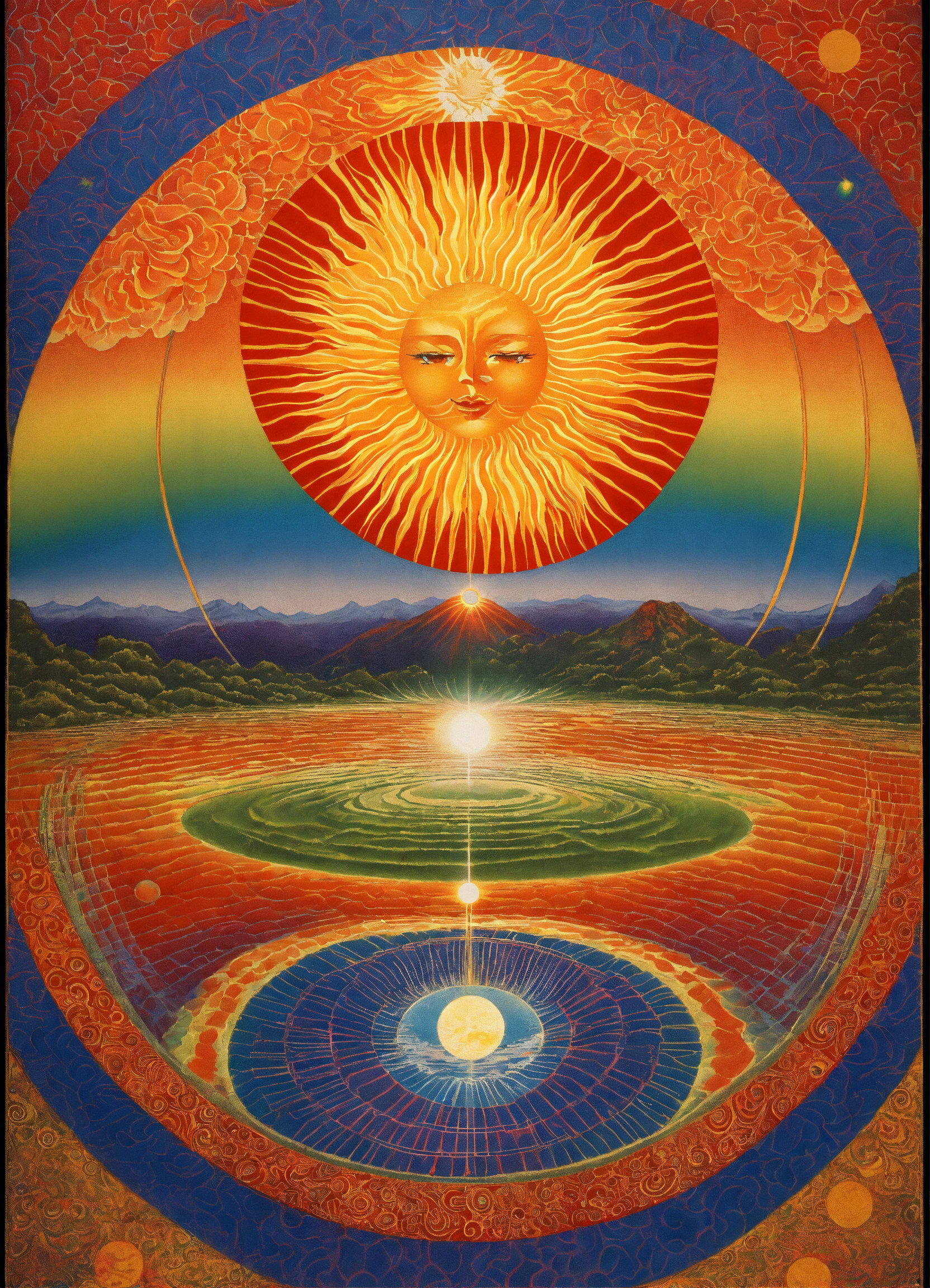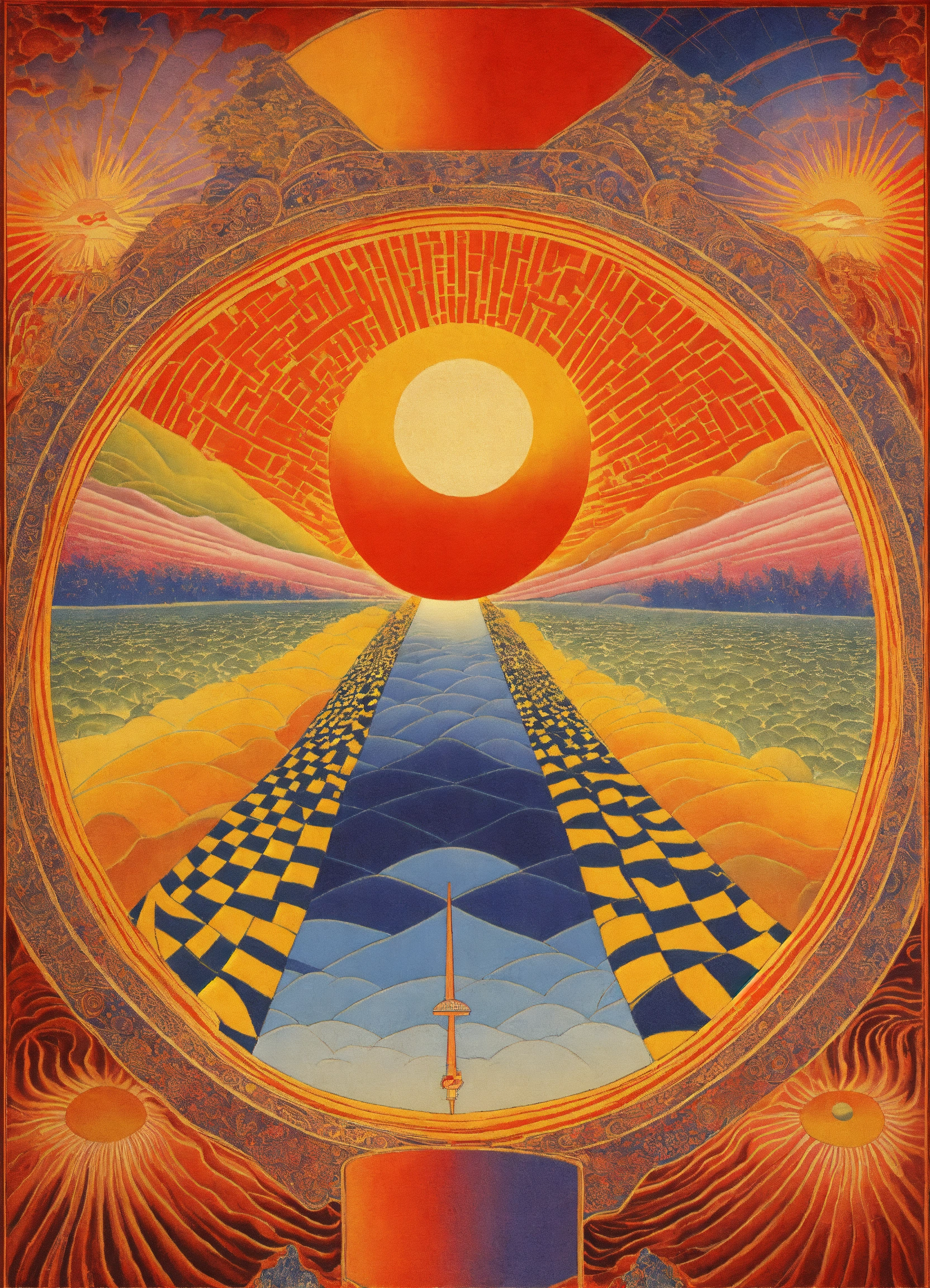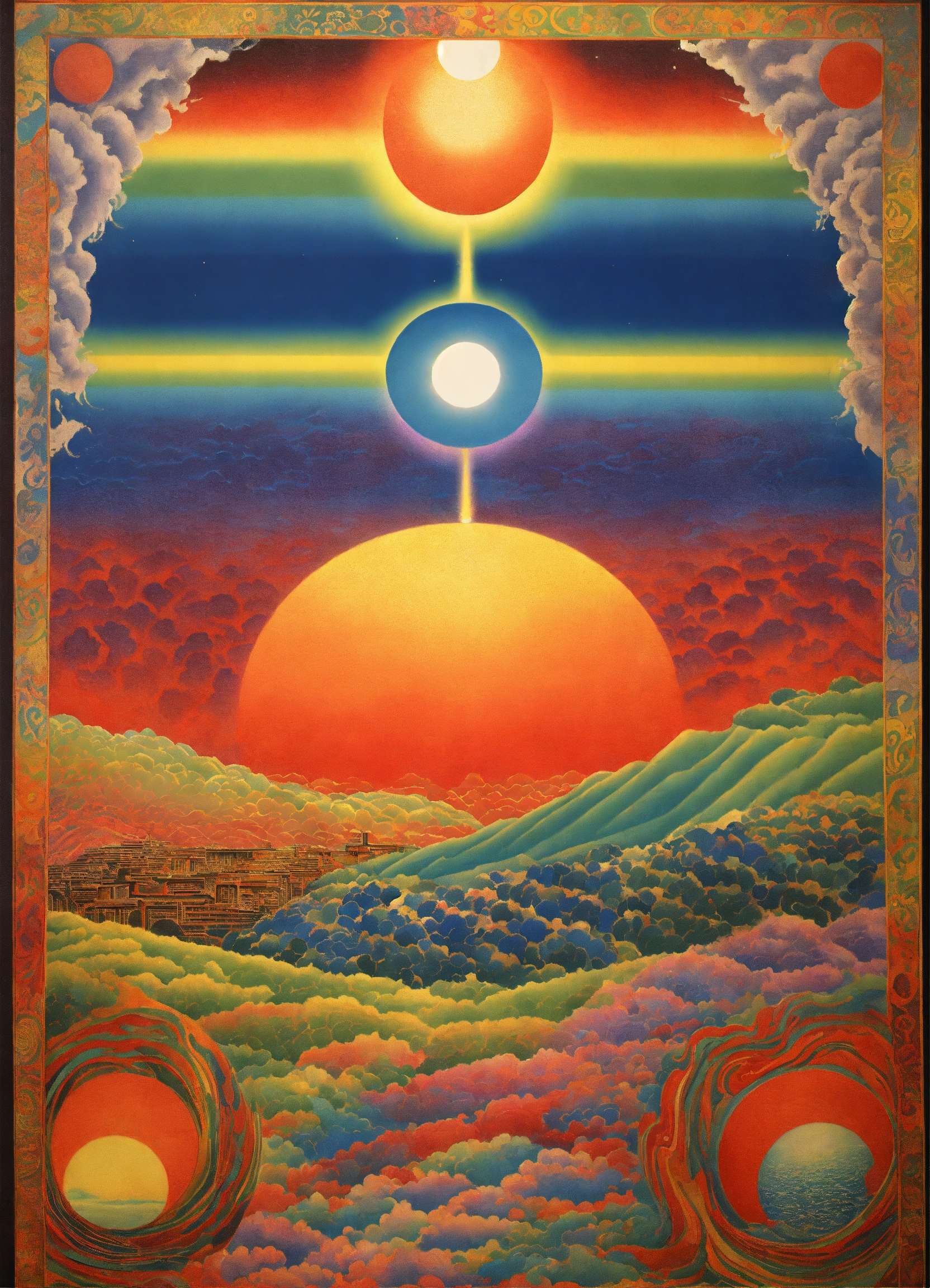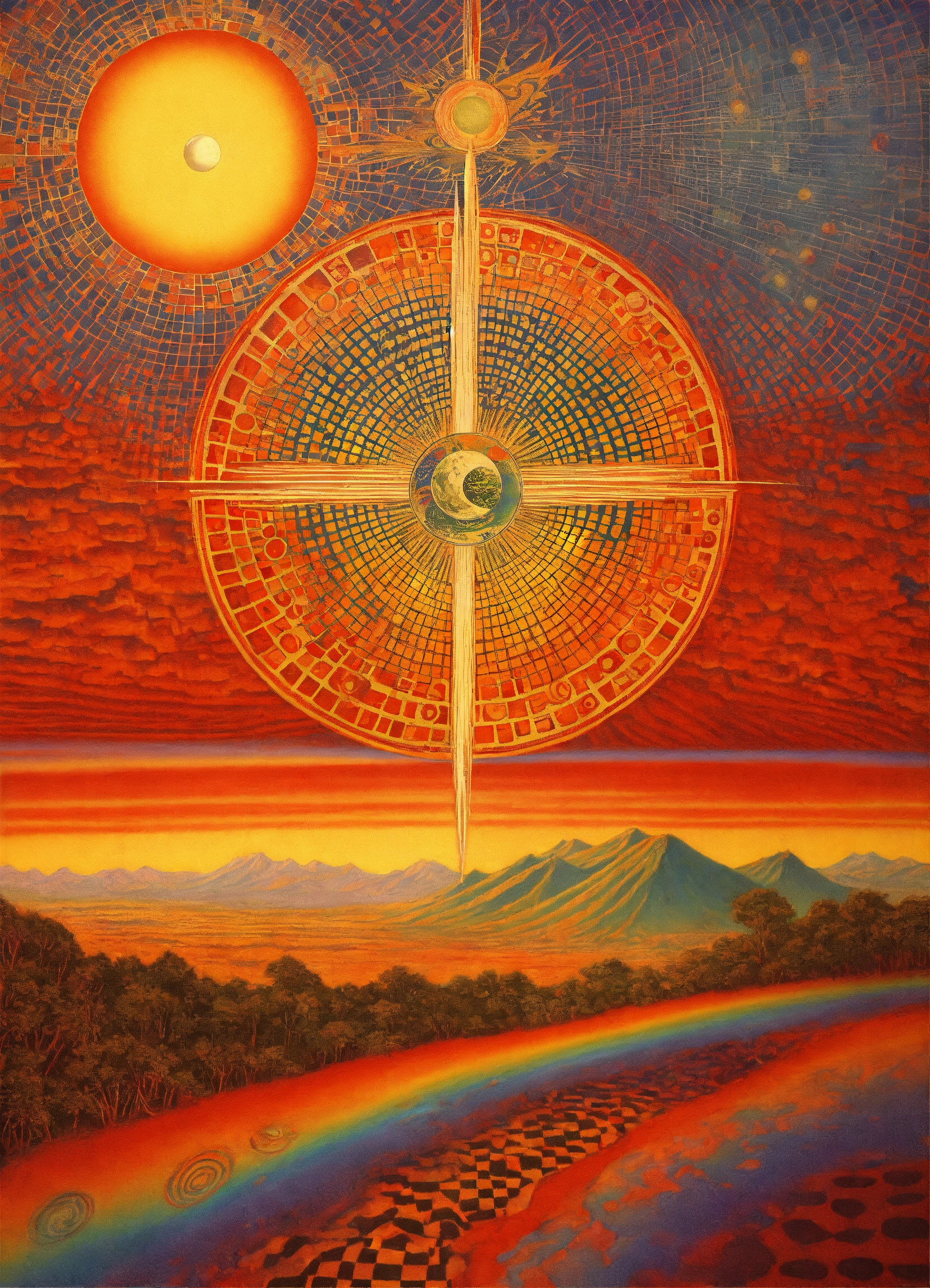 Japanese vintage poster, sun merging into moon, psychedelic, the four corners of the world, rainbow checkerboard patterns by alex grey
