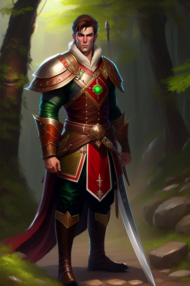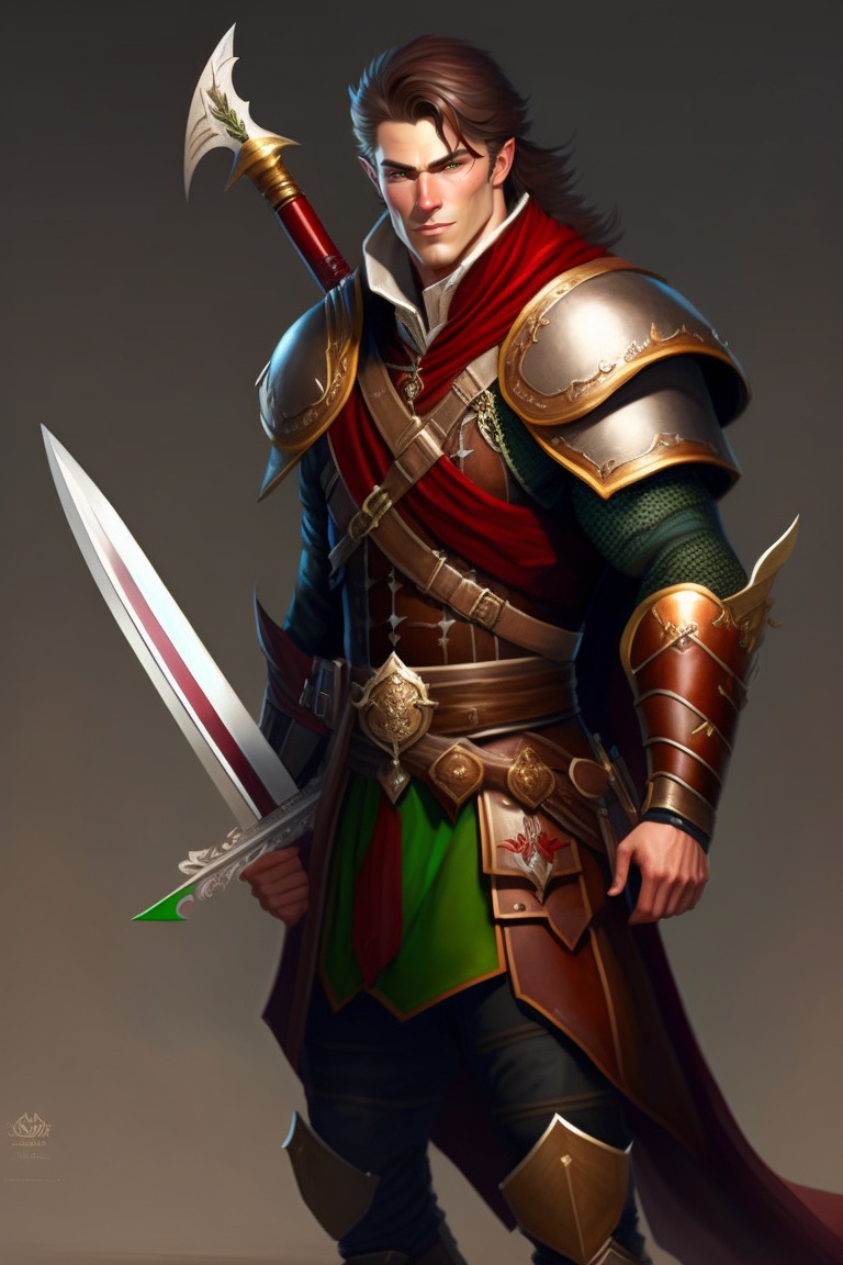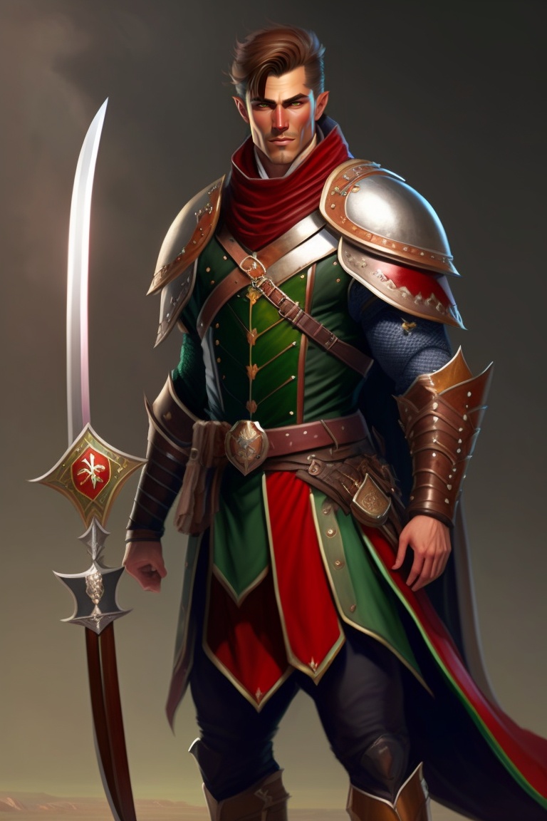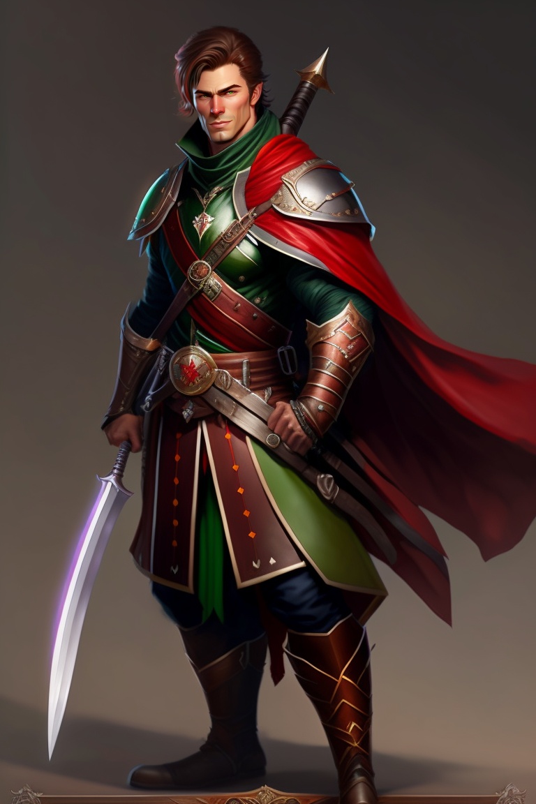 Full body picture of a male half-elf ranger short length brown hair and a very highly detailed face wearing elegant dark red plate mail armor with green and white accents, holding a tall tower shield and a long flintlock sword, highly detailed, ultra realistic, artstation, cgsociety, character concept art, sharp focus, illustration, art by michael komarck and greg rutkowski and alphonse mucha