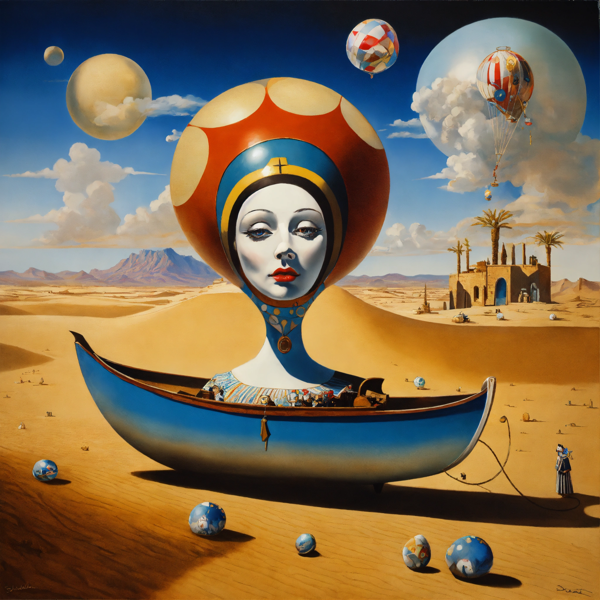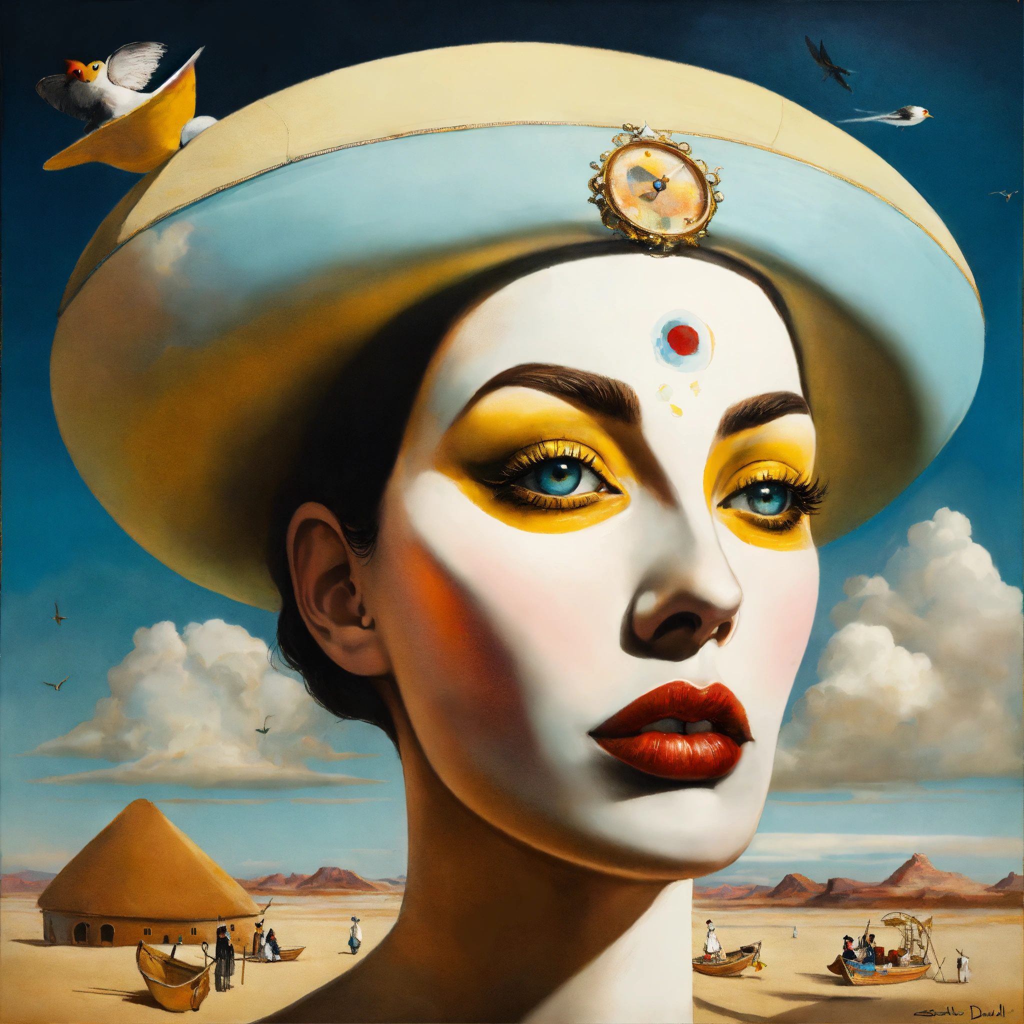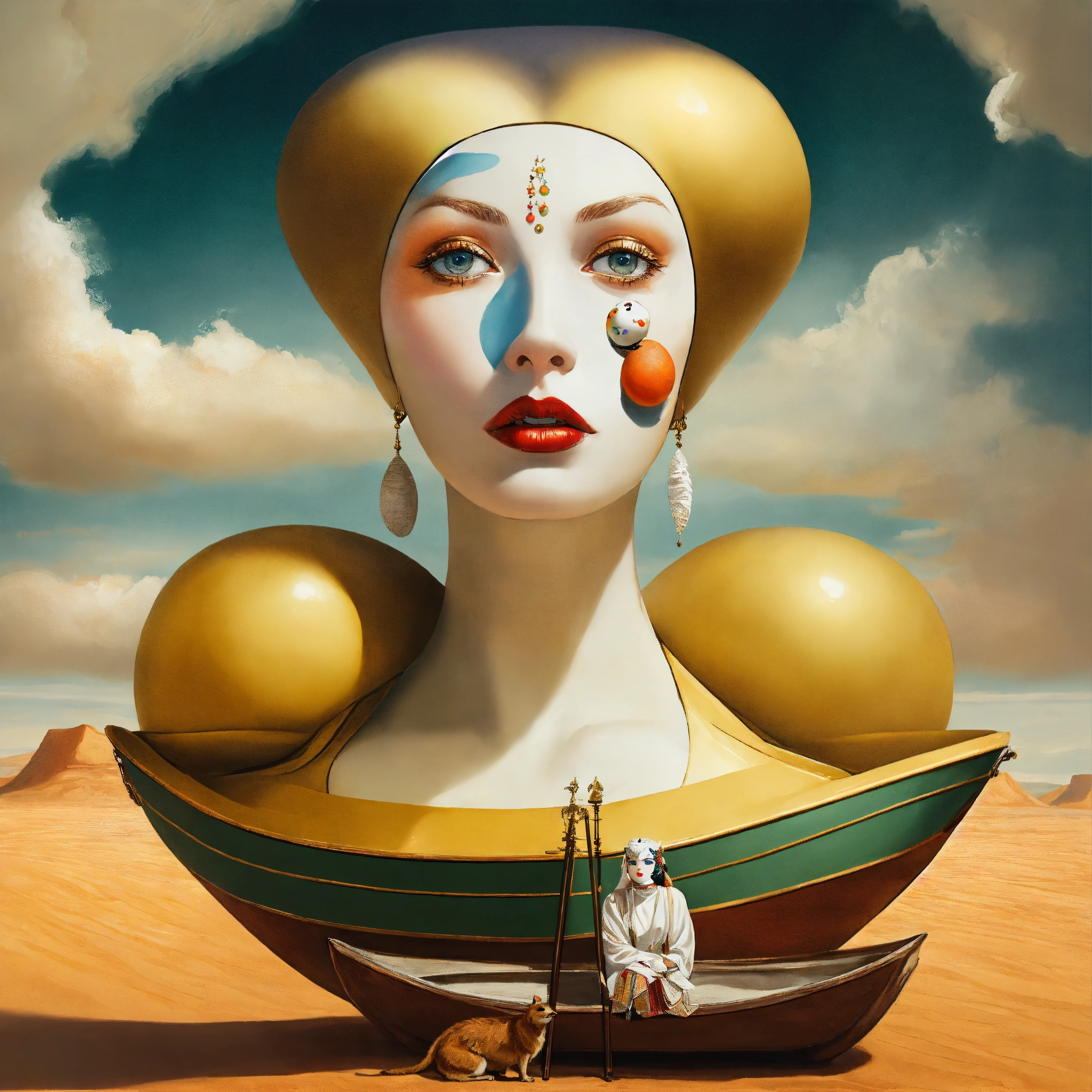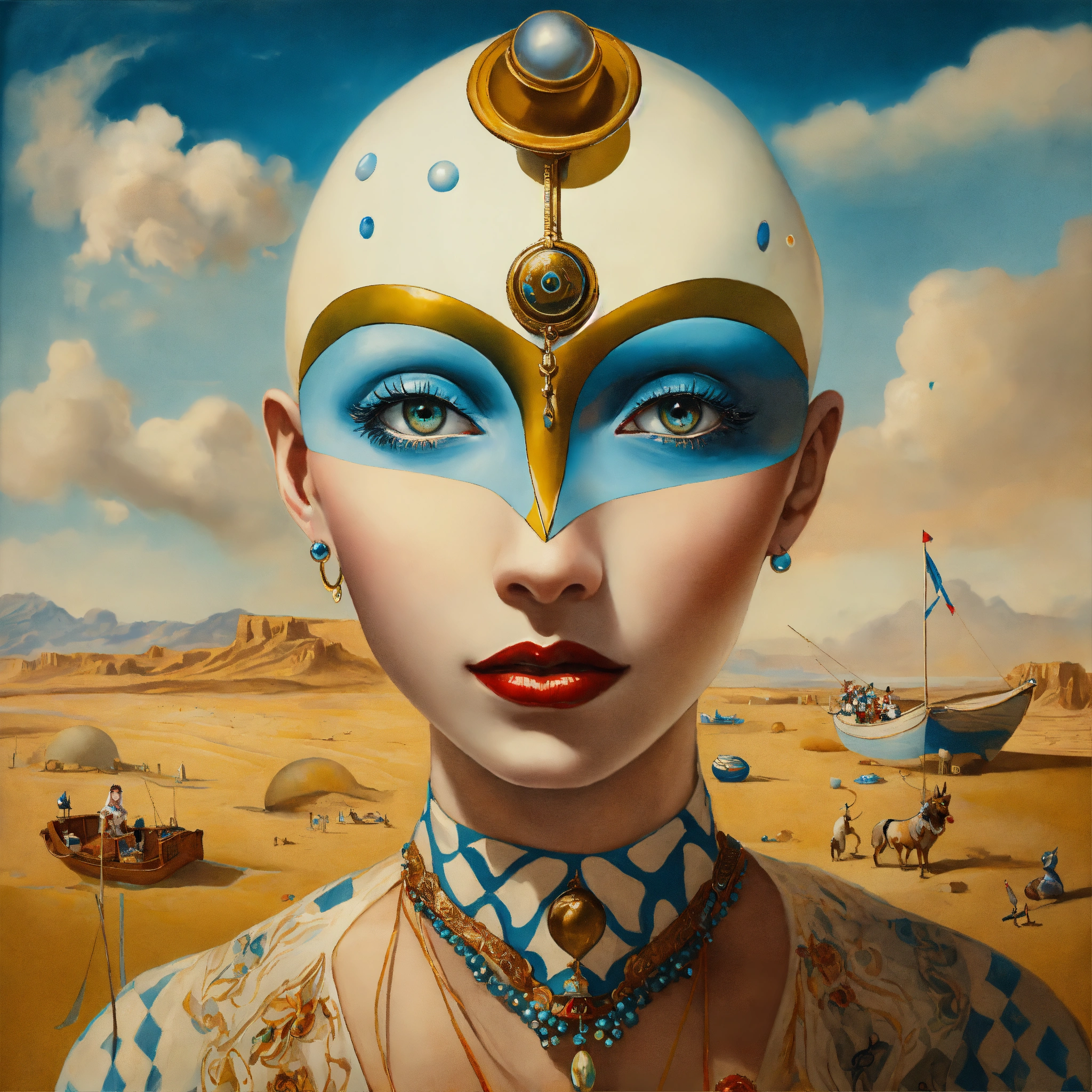 A close up portrait of elegant female humpty with pale white face with eyes looking straight at you. also a harlequin lady sitting in a boat on desert oasis by salvador dali. more surrealism and madness. much more surrealism and crazy designs. with surreal clouds, salvador dali clouds coming out of her head. more surrealism and crazy ideas. like a circus theme. much more surreal designs and electric colours.