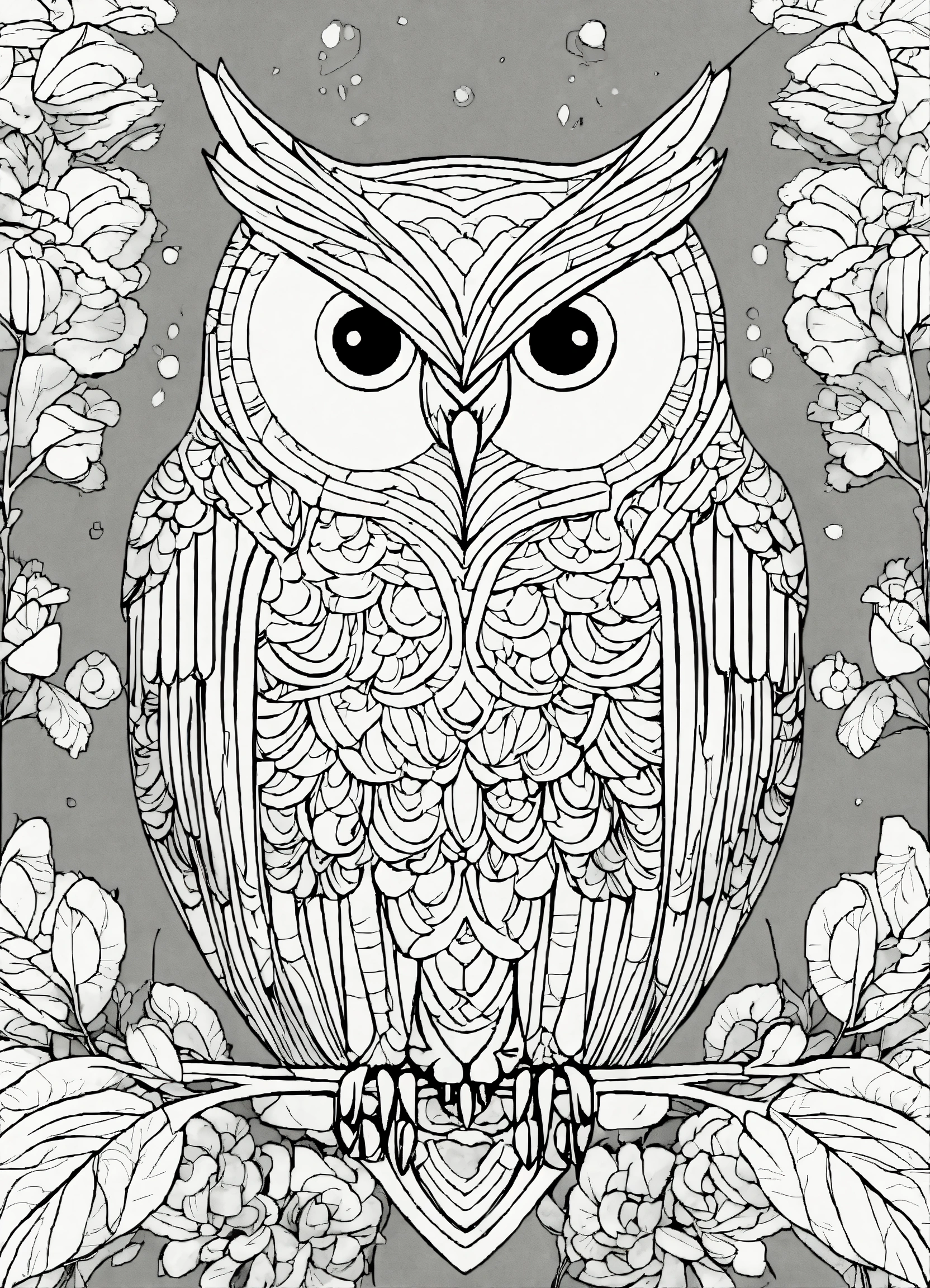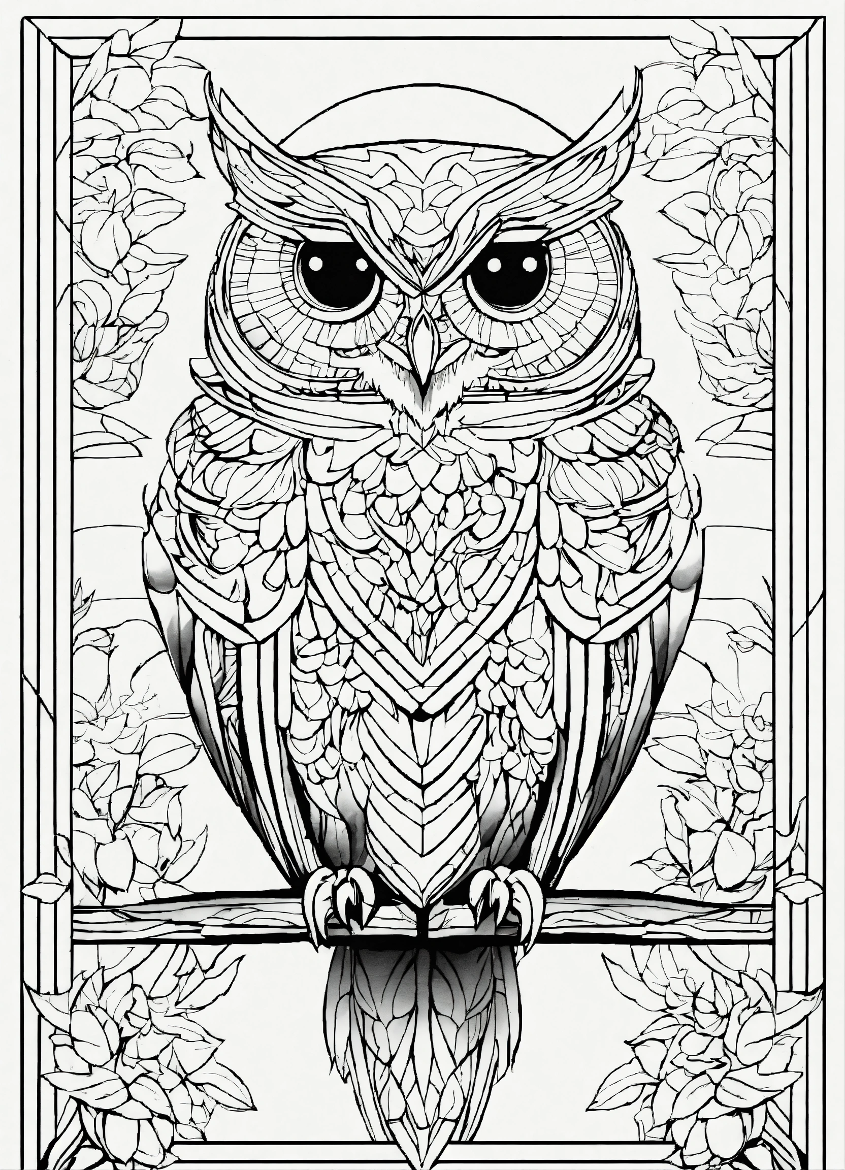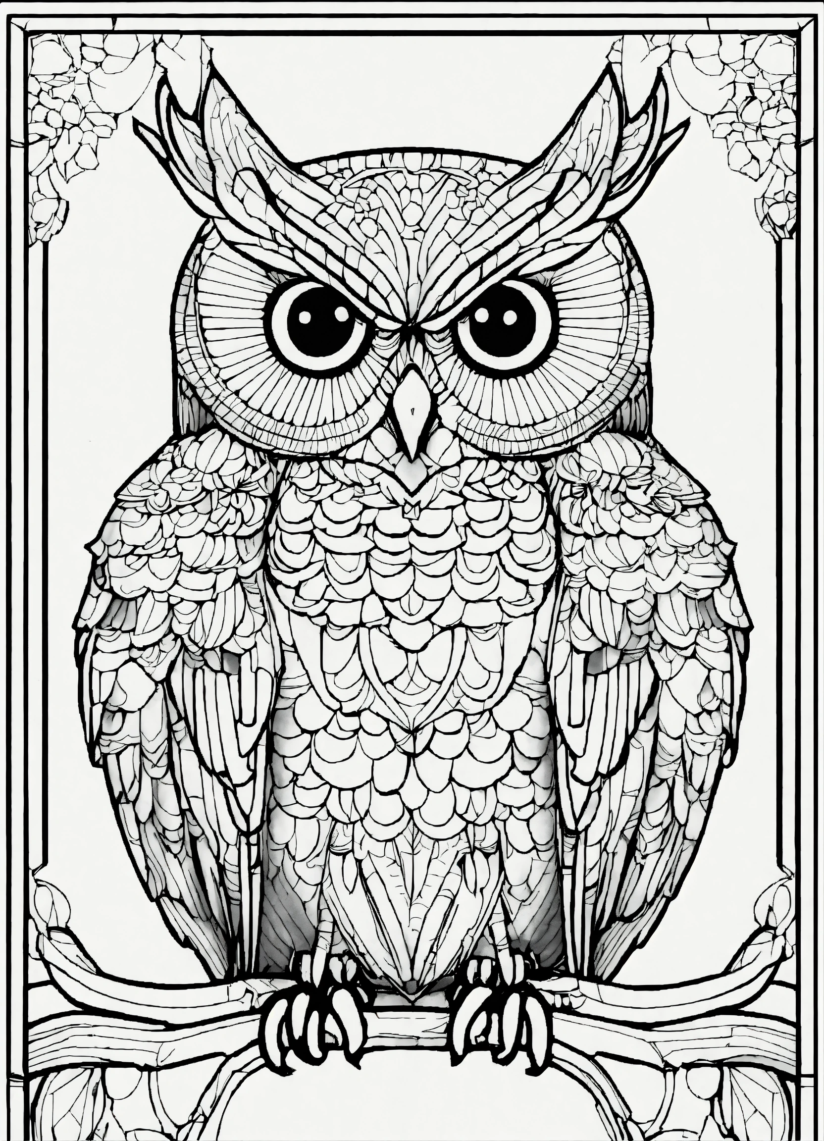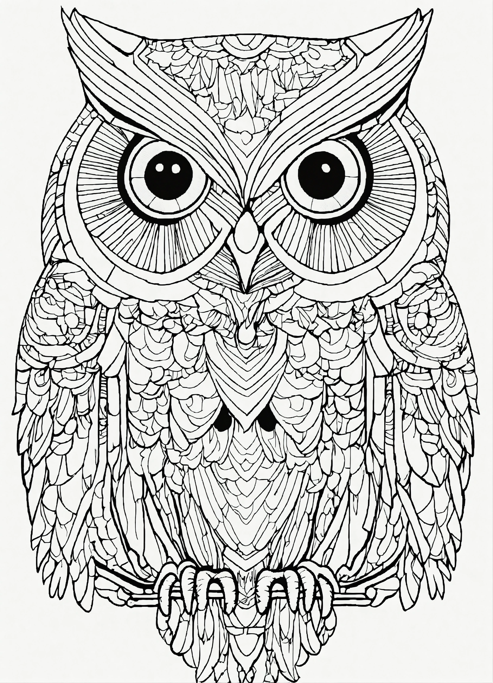 Coloring page for adults, bold lines, dark lines, symmetrical, white background, clean line art, fine line art, owl.