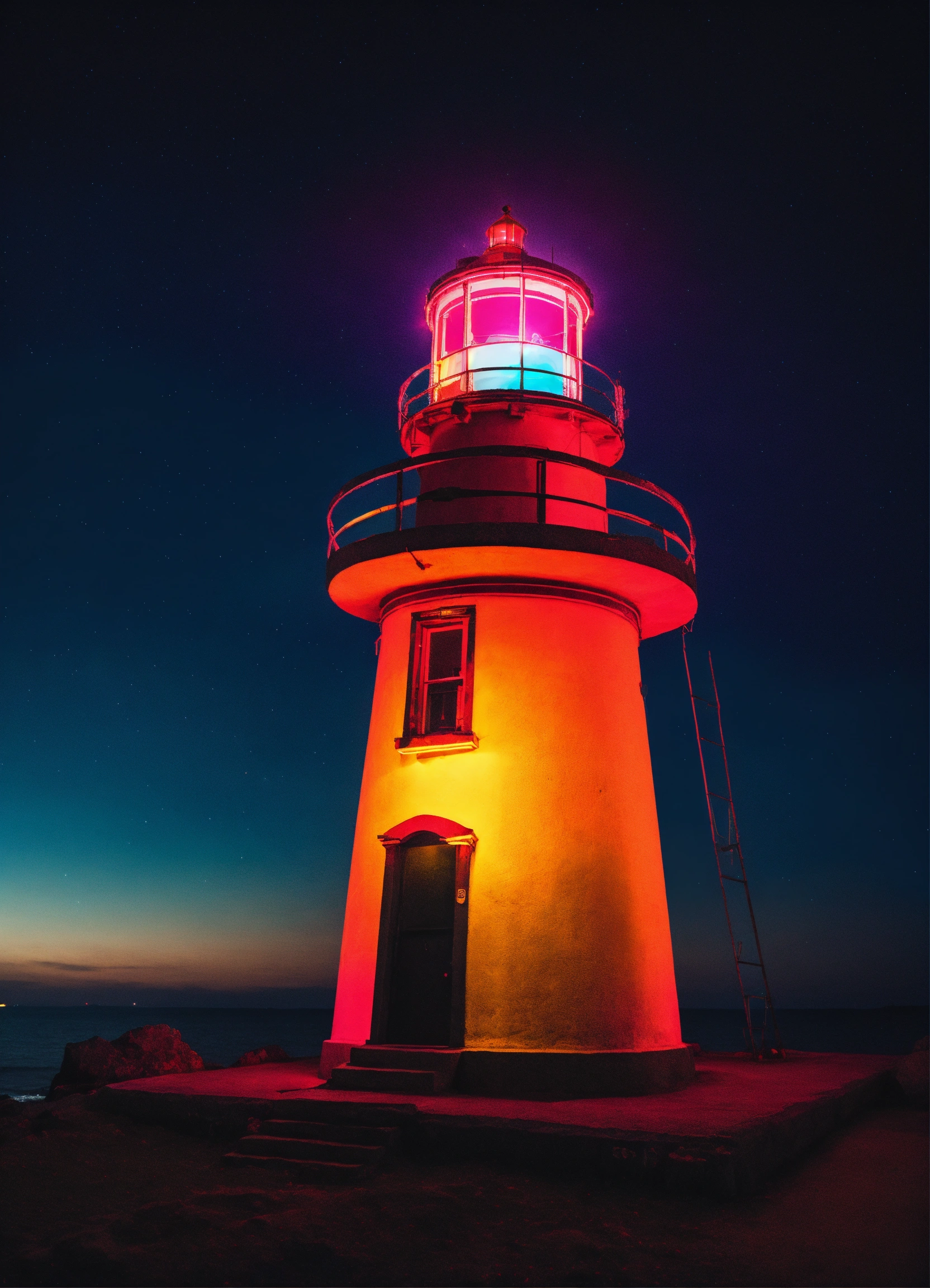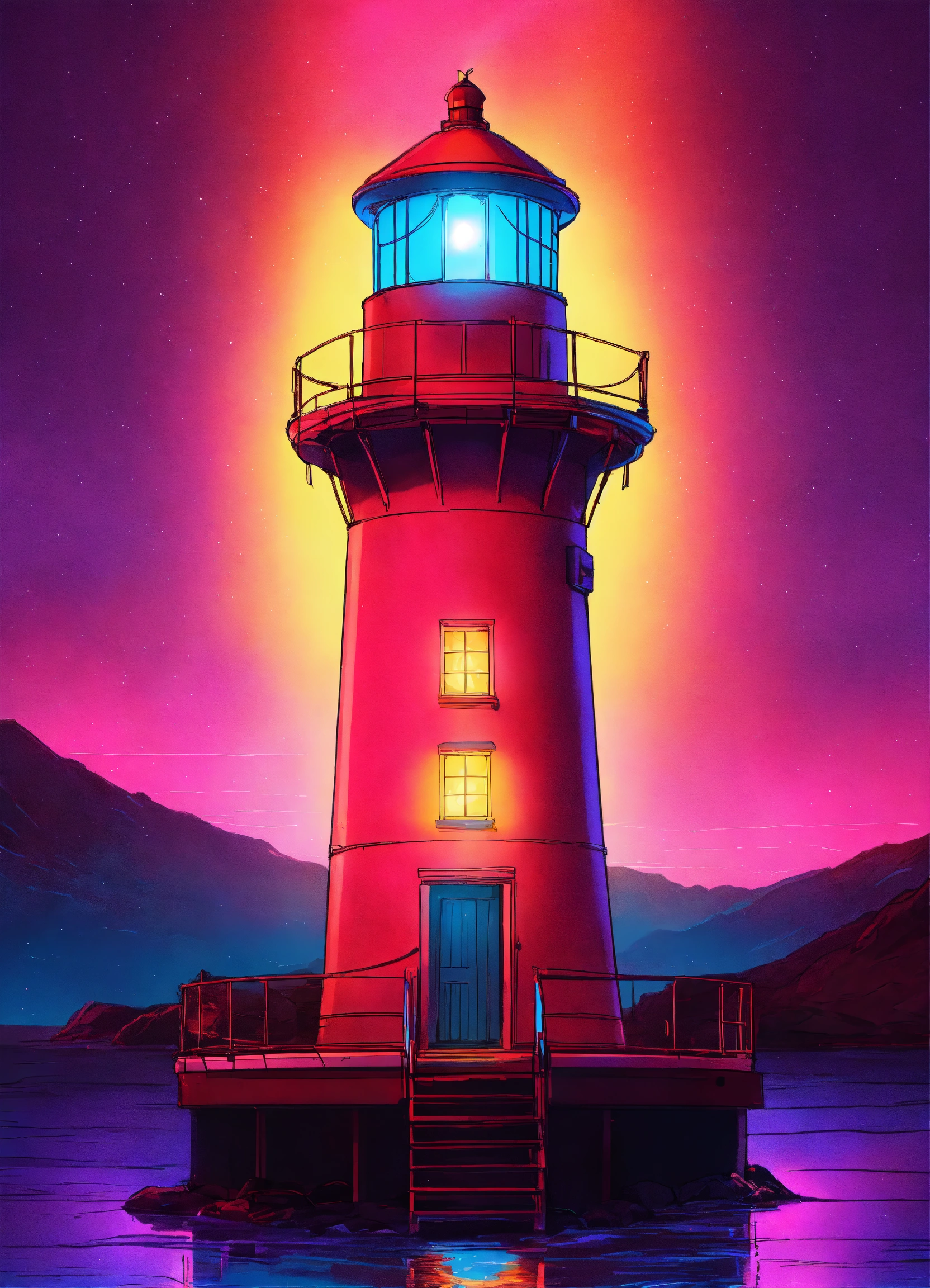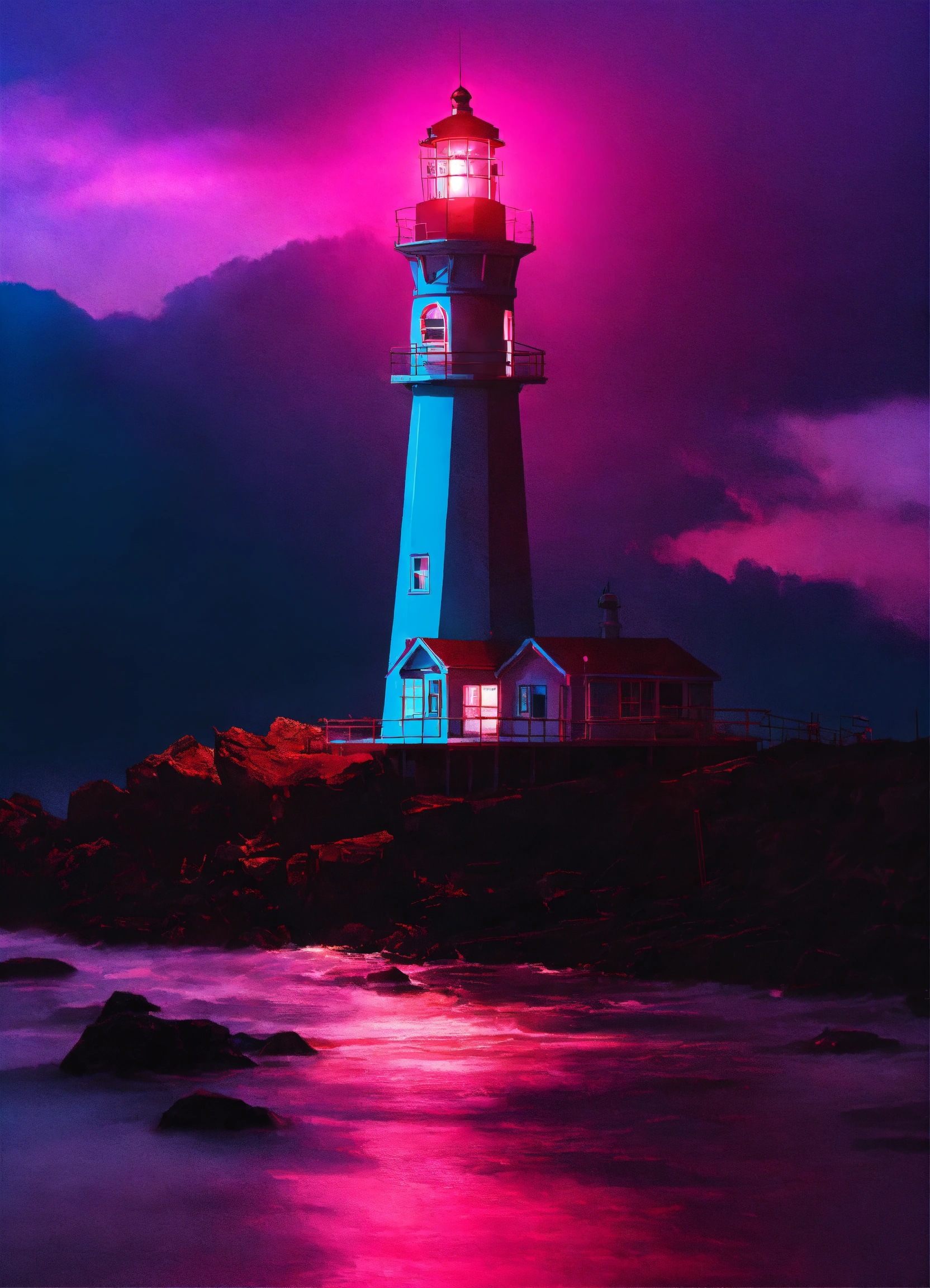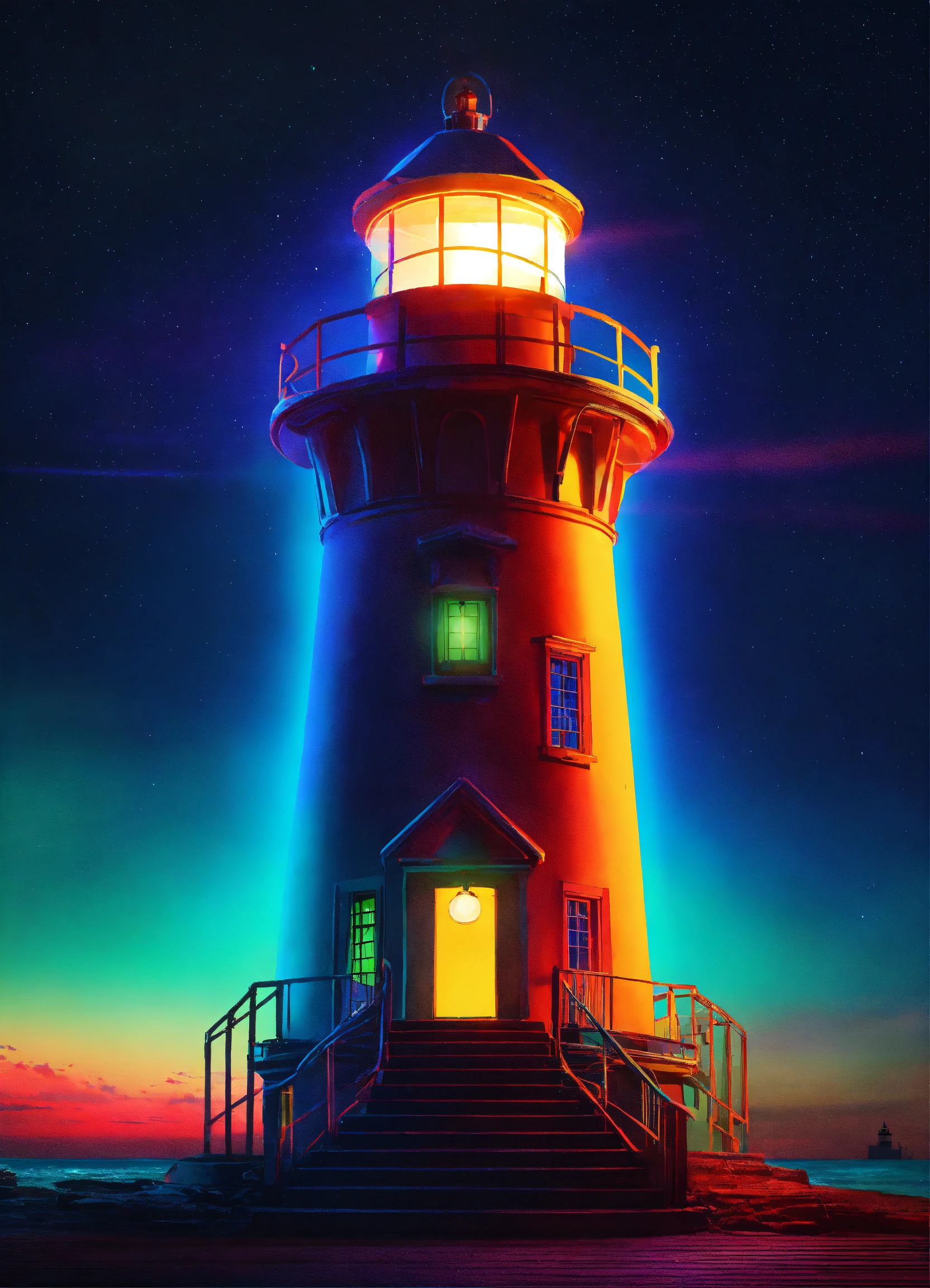 A neon lighthouse with a bright beam of light
