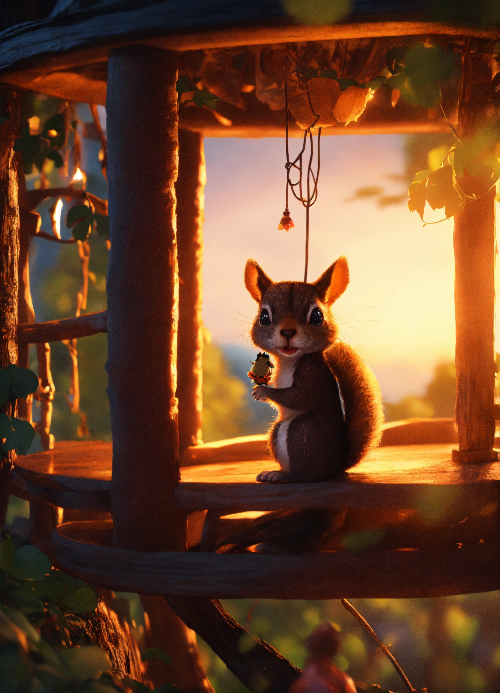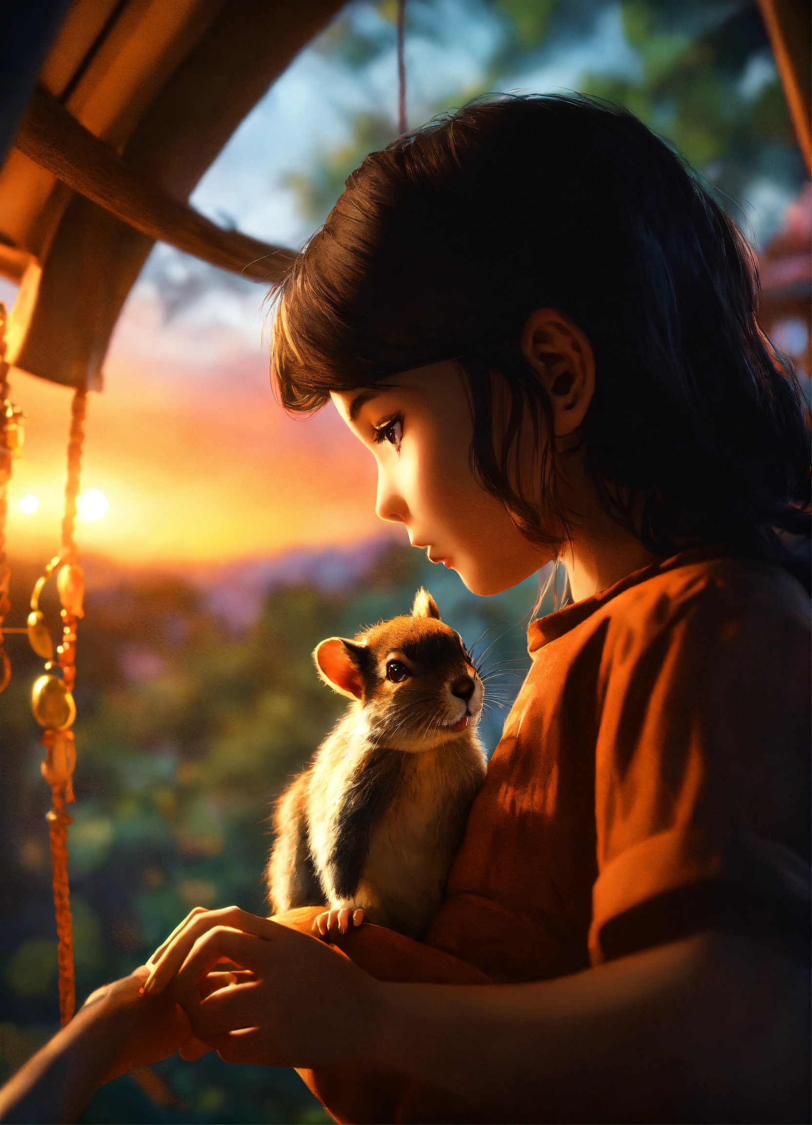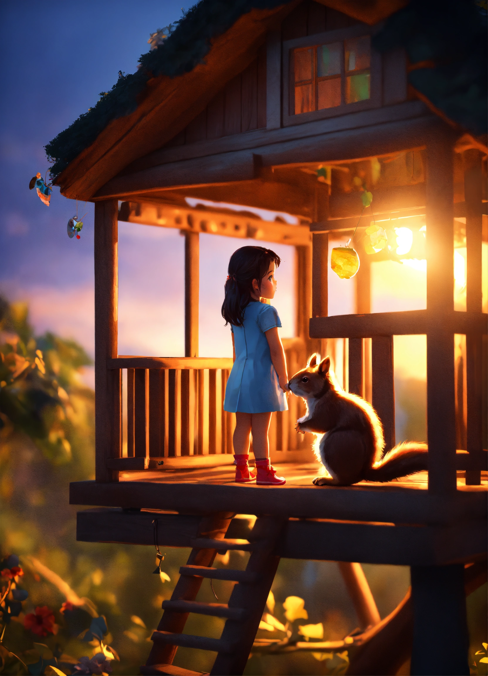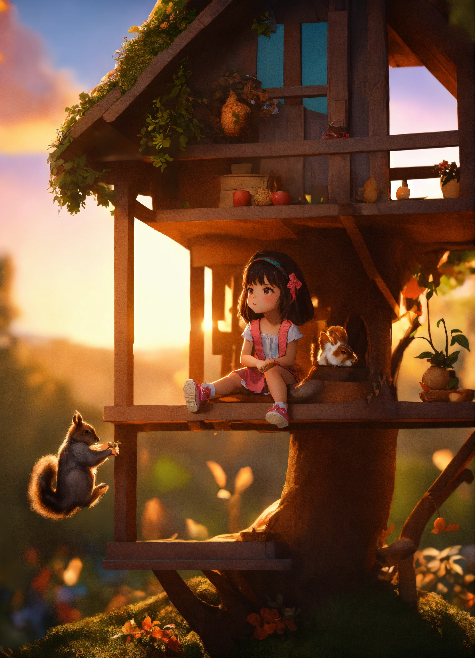 4d photographic image of image of a cute little dark haired girl and her squirrel in a treehouse looking at the sunset realistic, vivid colors octane render trending on artstation, artistic photography, photorealistic concept art, soft natural volumetric cinematic perfect light, uhd no background