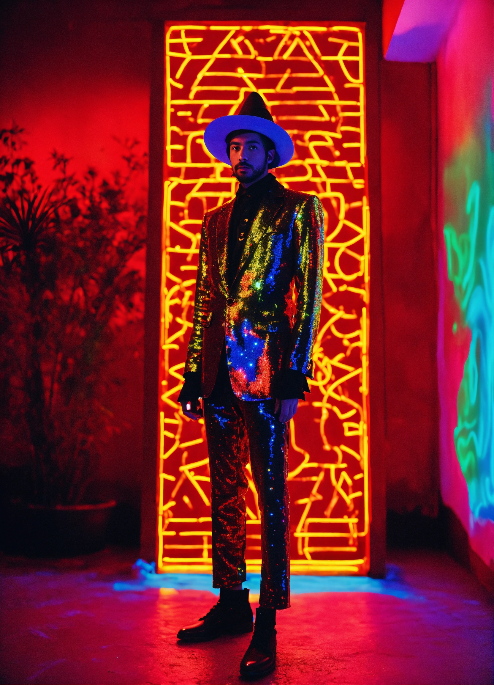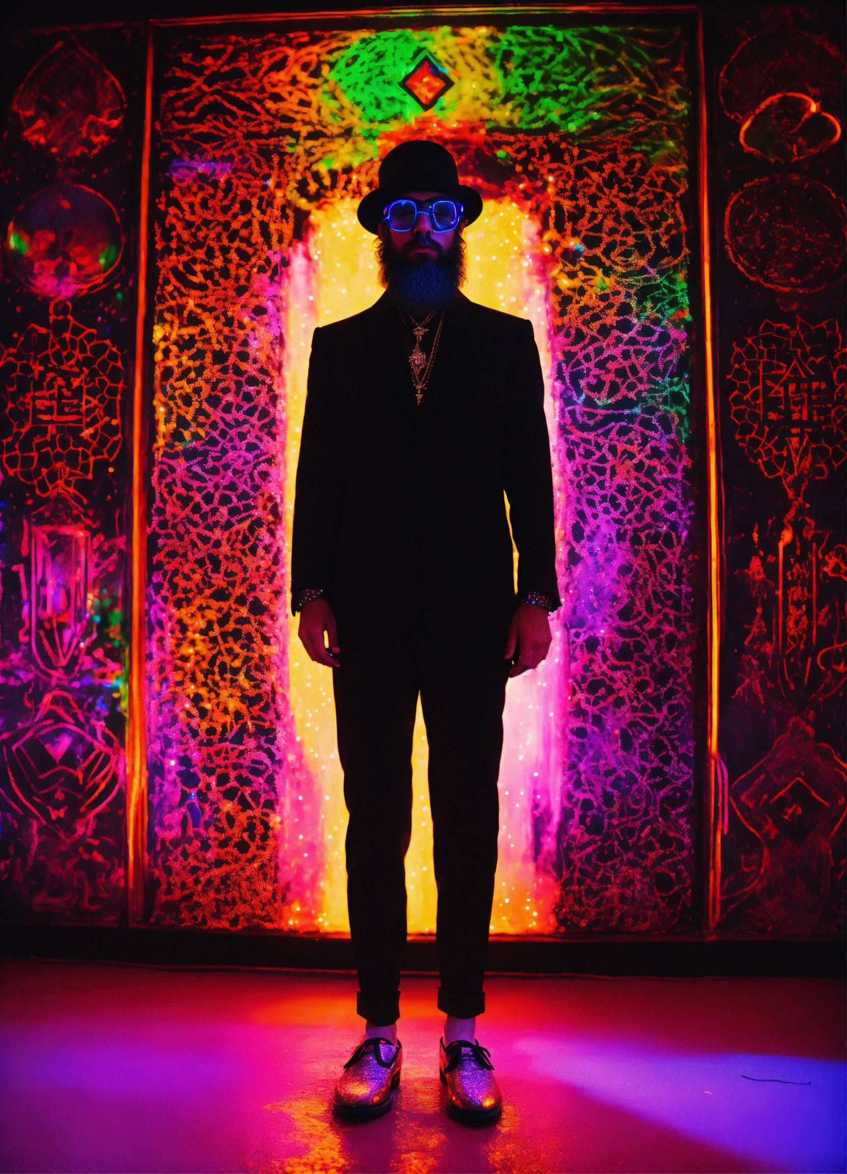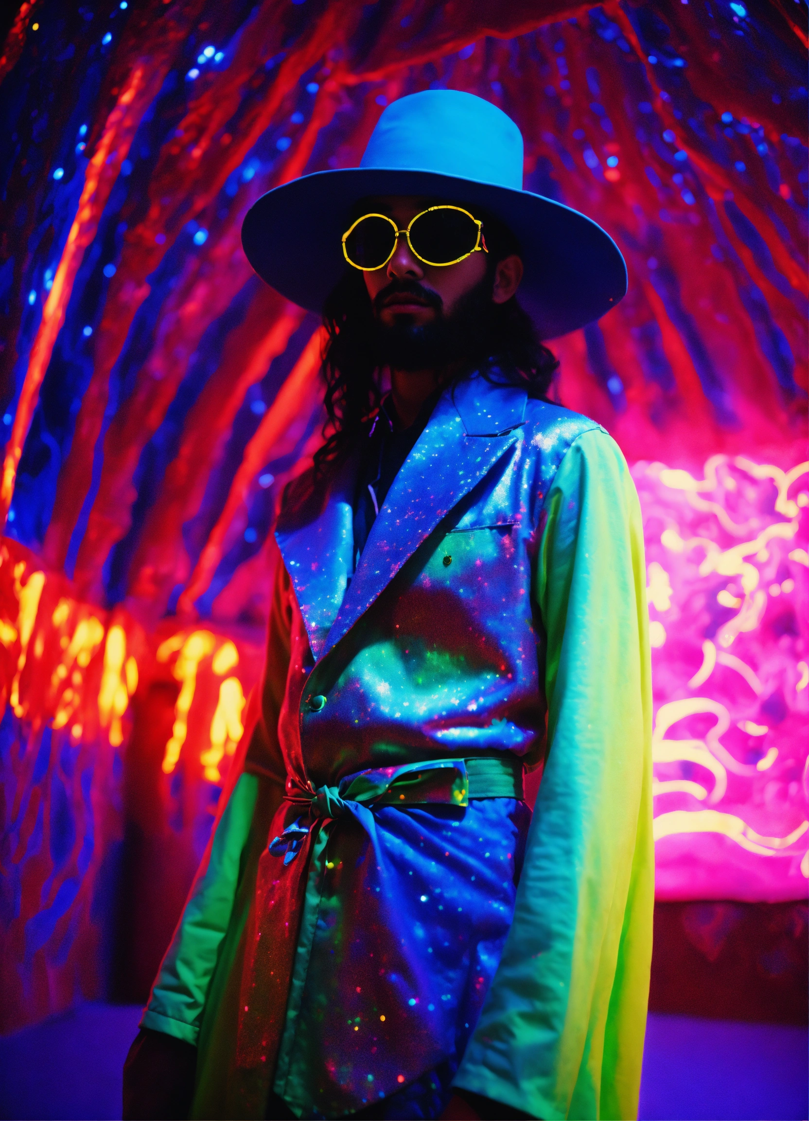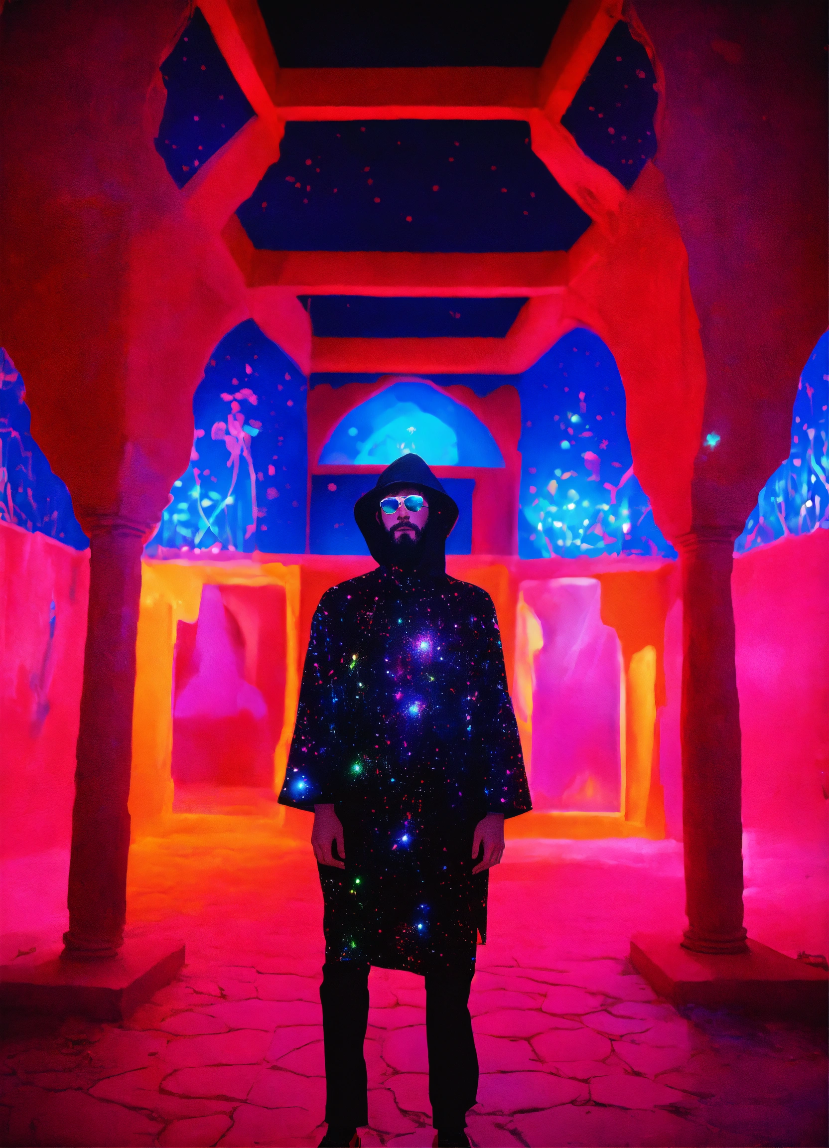 Full body portrait fashion, of cosmic wizard dmt black light glitter neon dubstep marrakech, 35mm film, art by salvador dali and holy mountain
