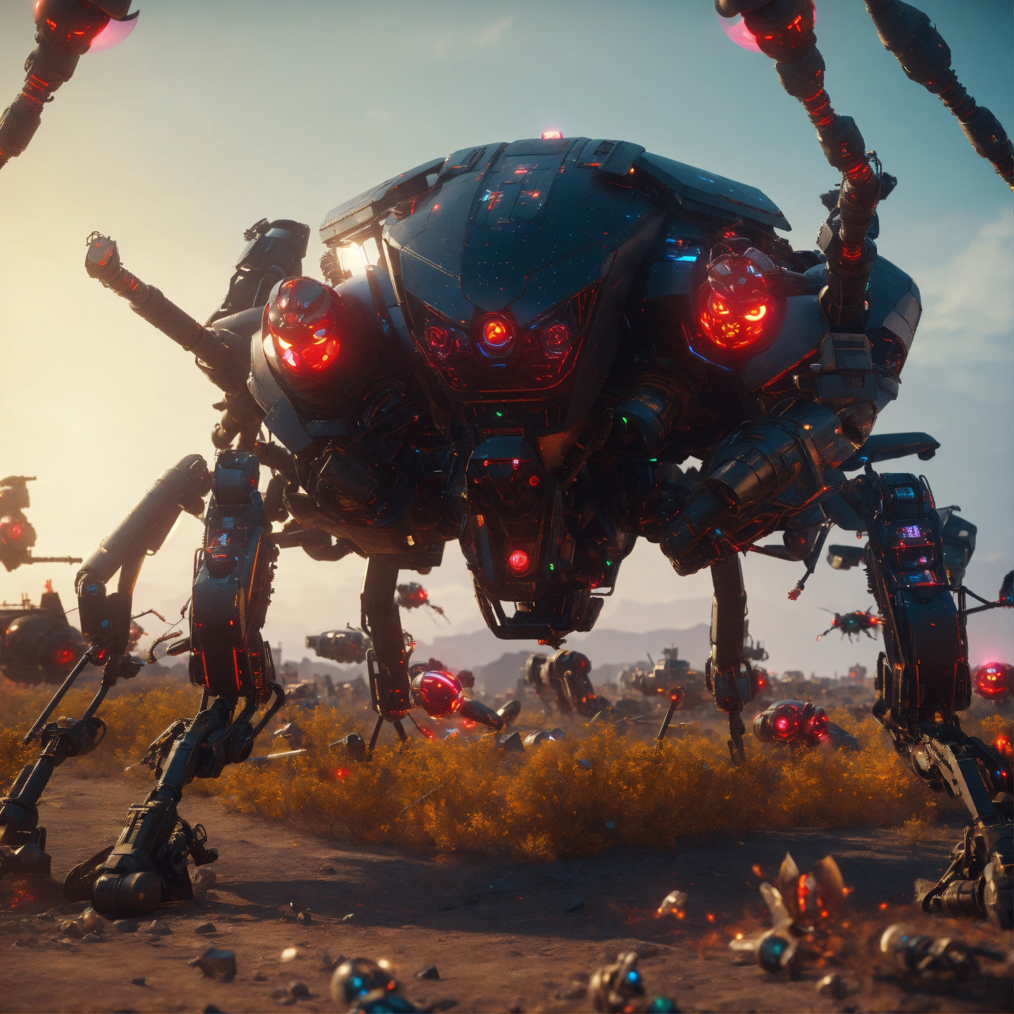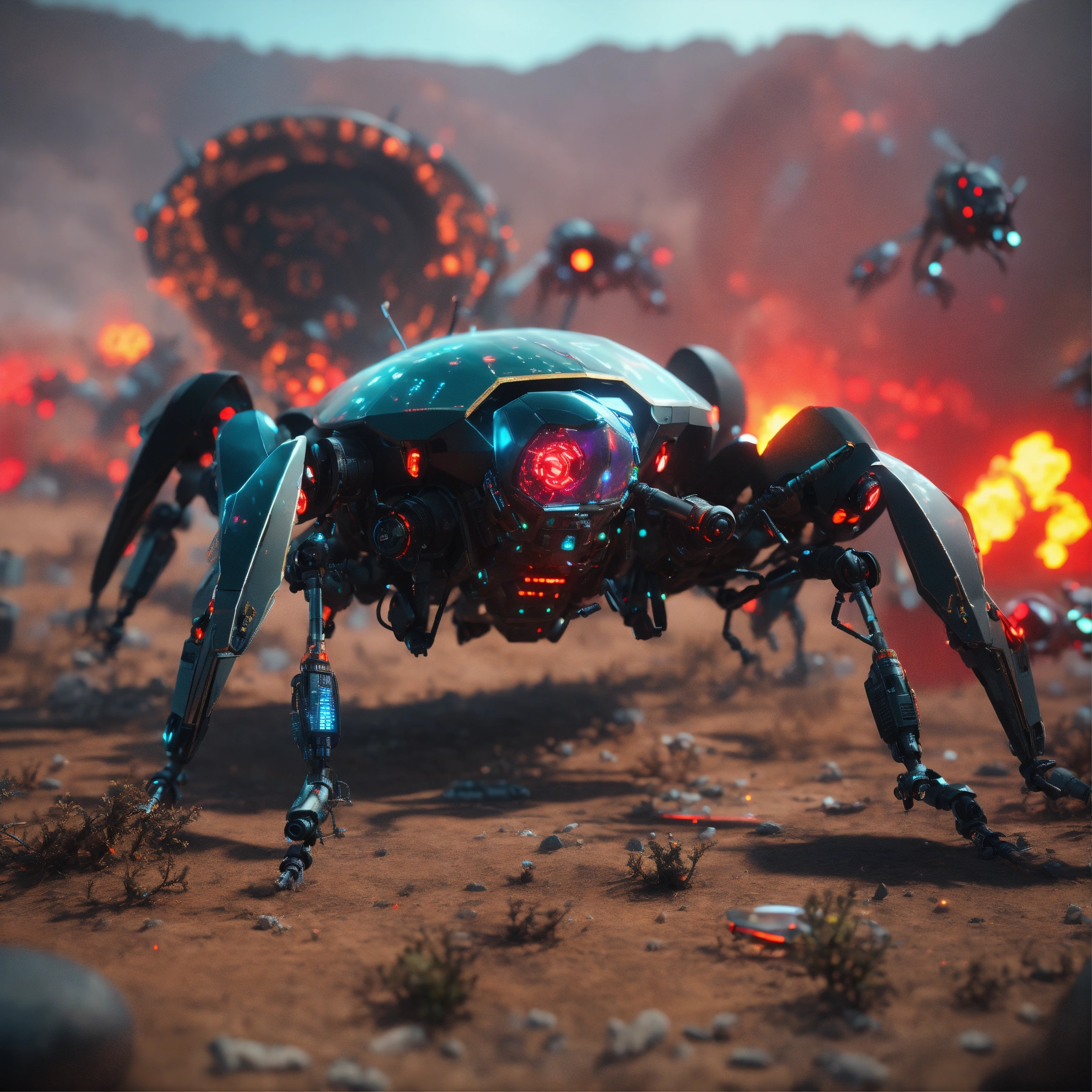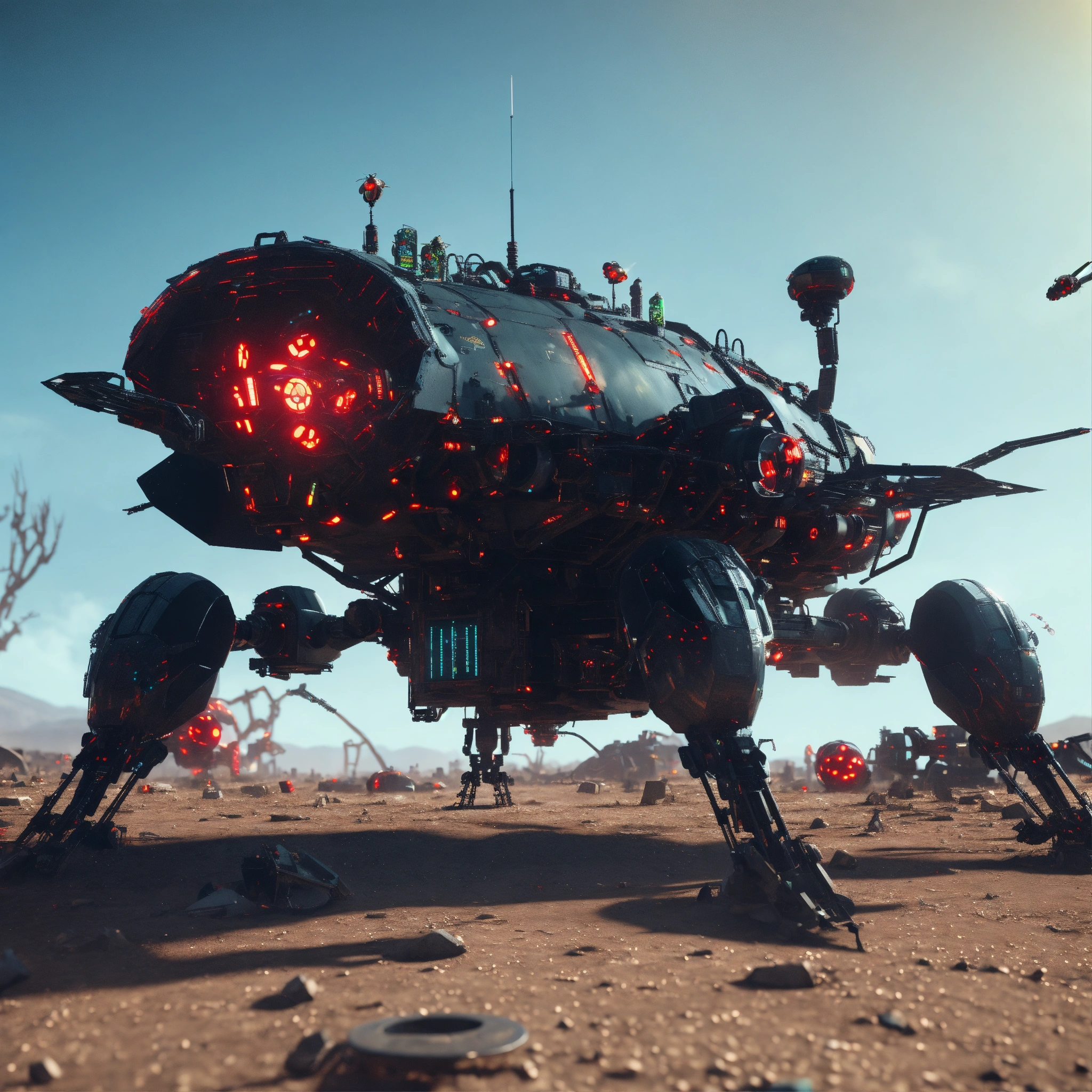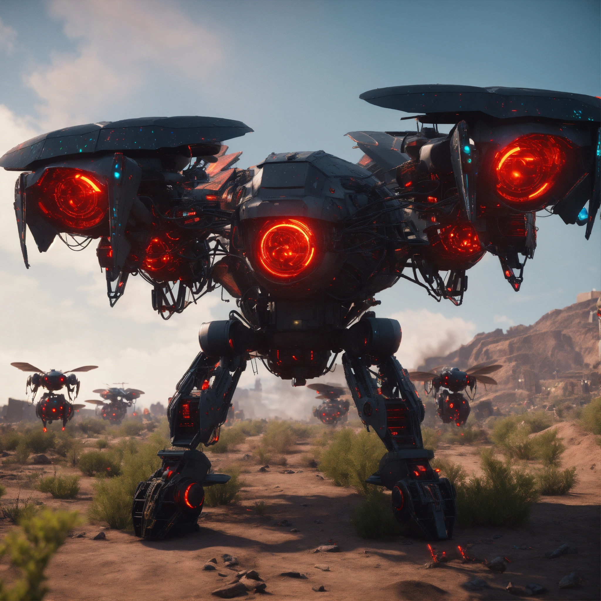 Large black angry digital holographic bio-robotic hornets with red eyes and detailed circuitry, fly to attack in a radioactive wasteland spaceship graveyard, realistic, 8k, unreal engine, pixar