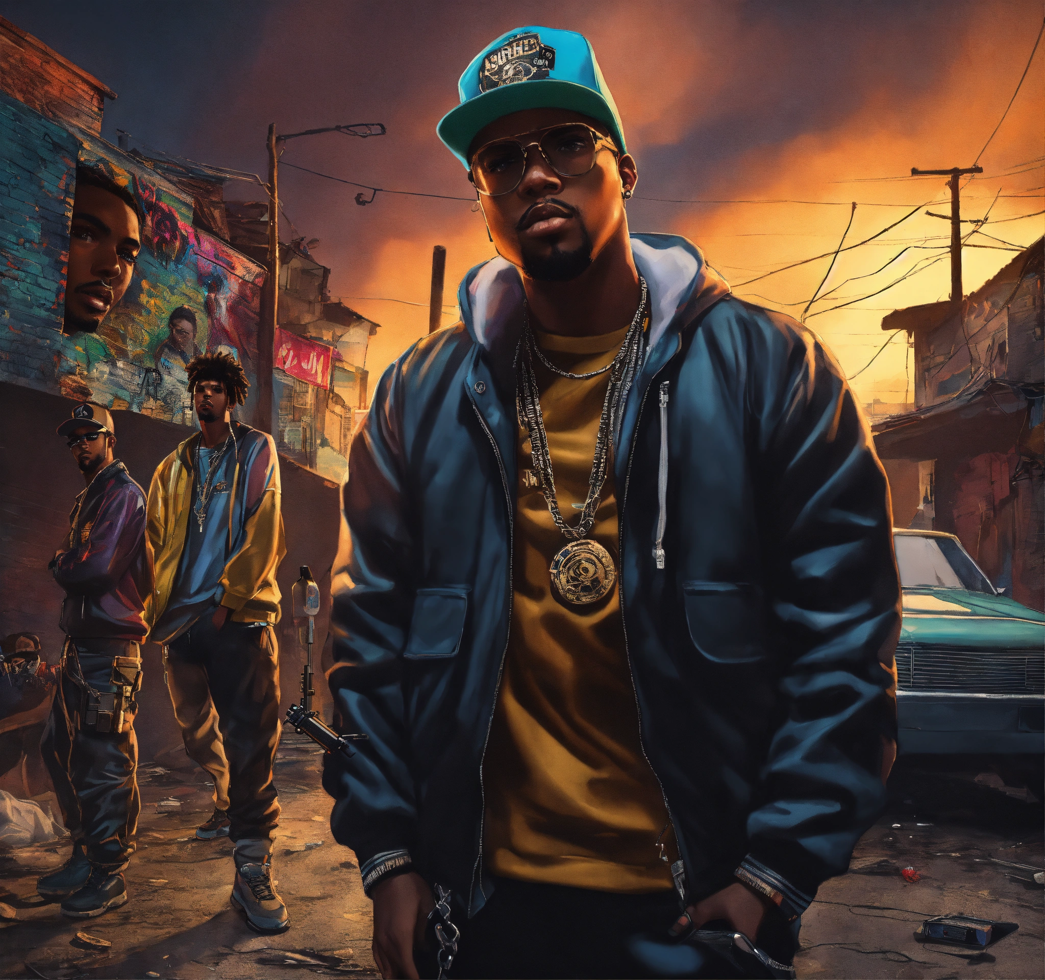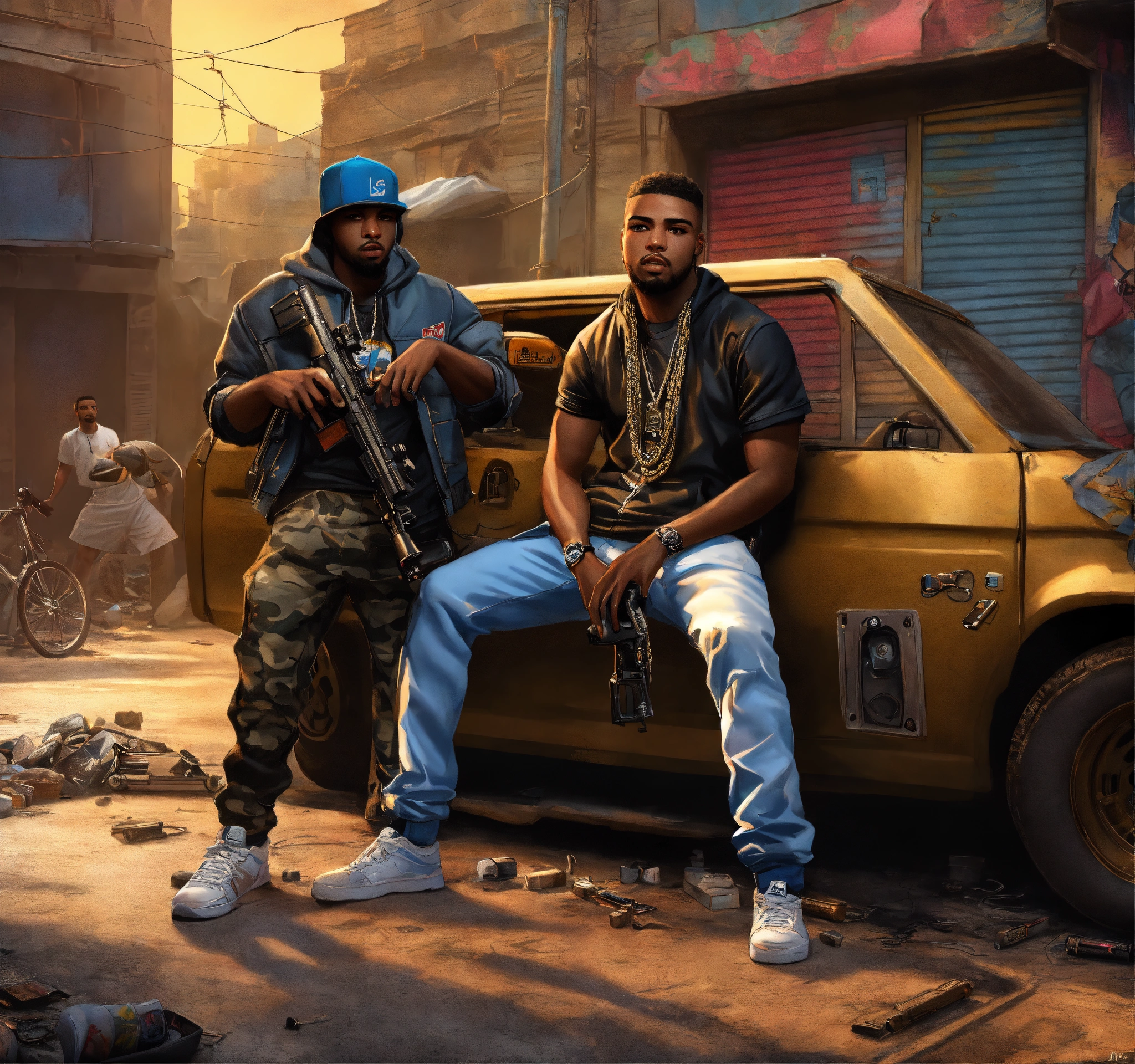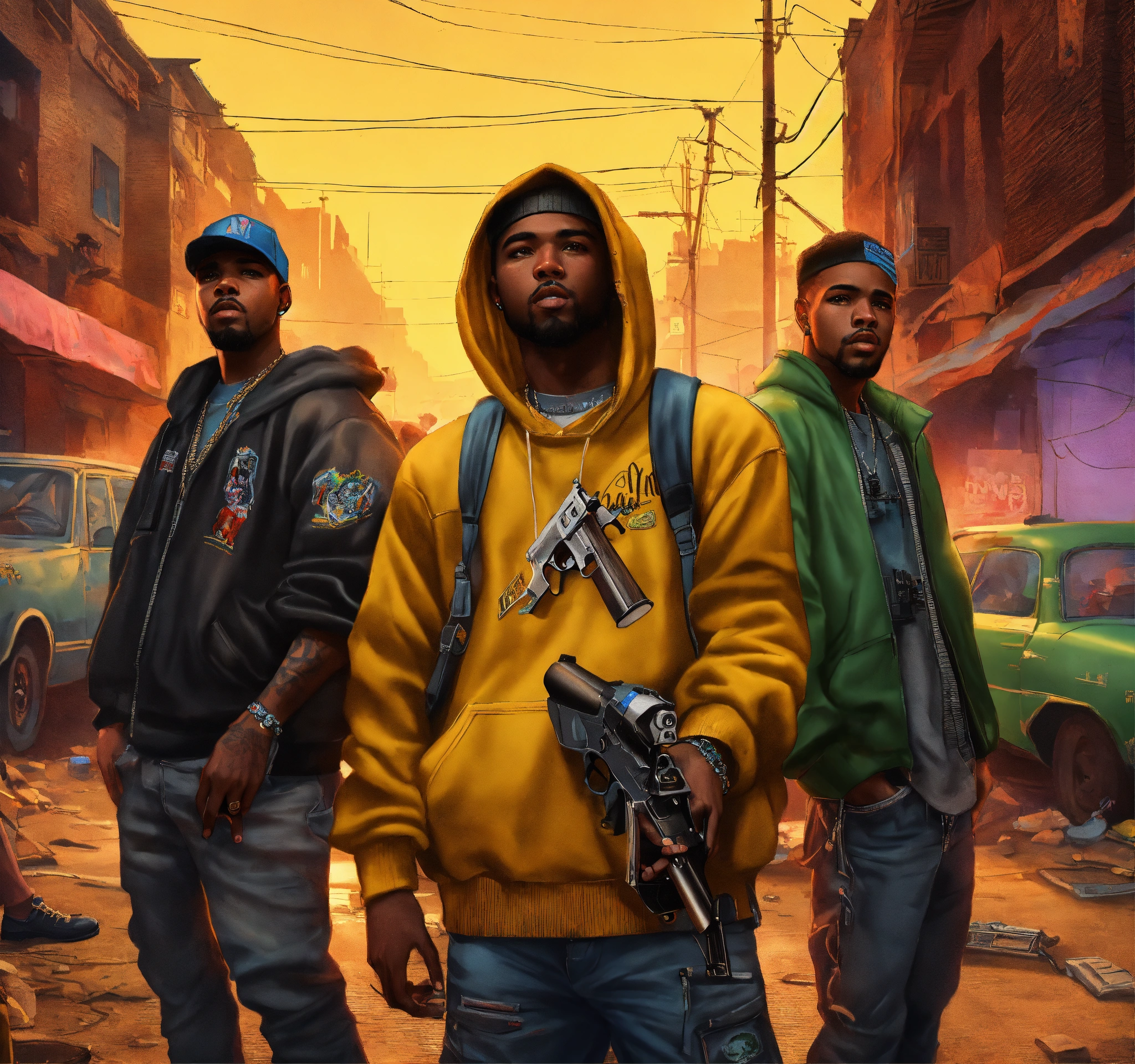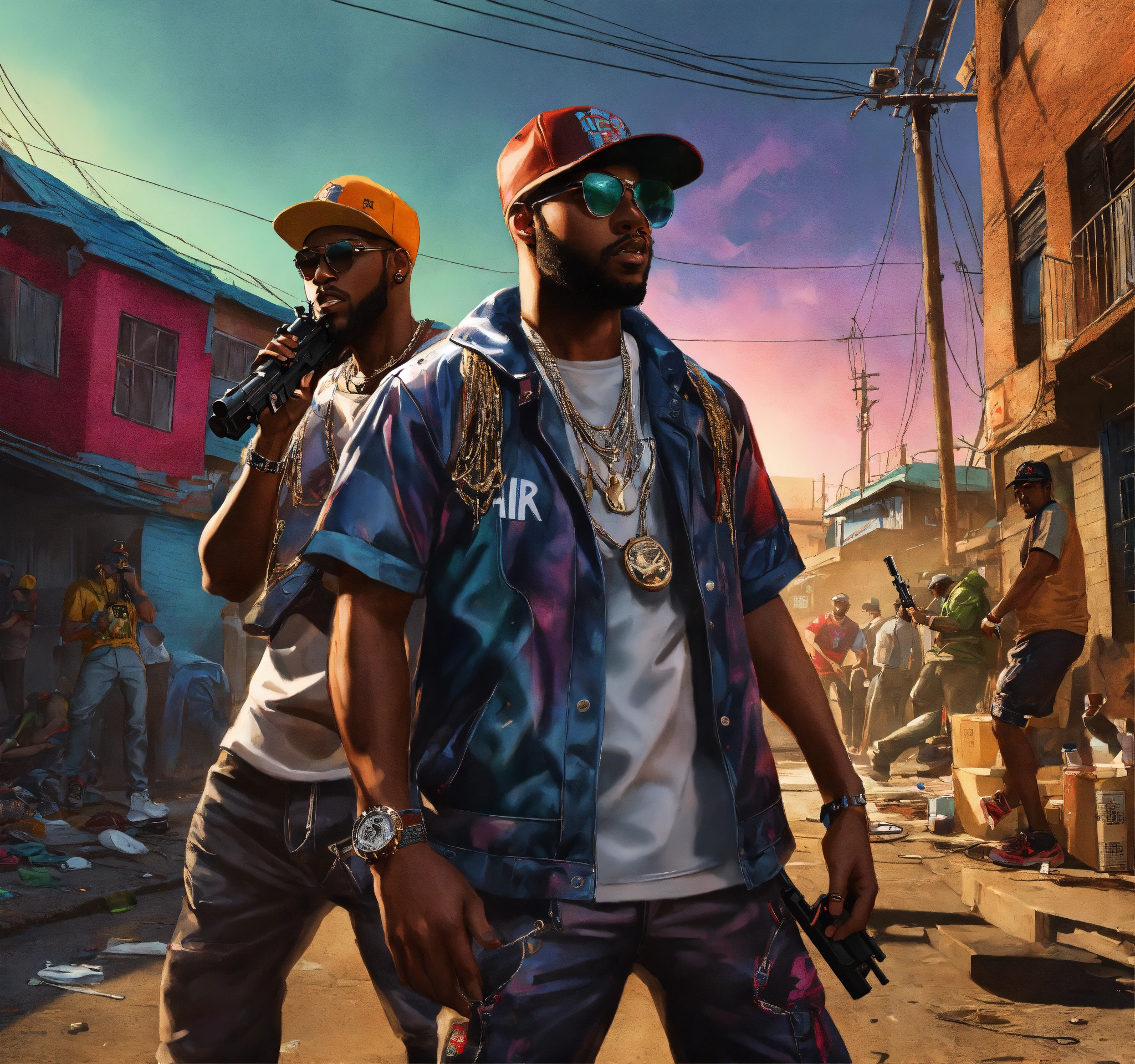 Full body pop art, hyperrealist portrait of rapper "cassidy" and "ar-ab" in a shooting gun out on a slum block with black gang in street fantasy art, photo realistic, dynamic lighting, artstation, poster, volumetric lighting, very detailed faces, 4 k, award winning