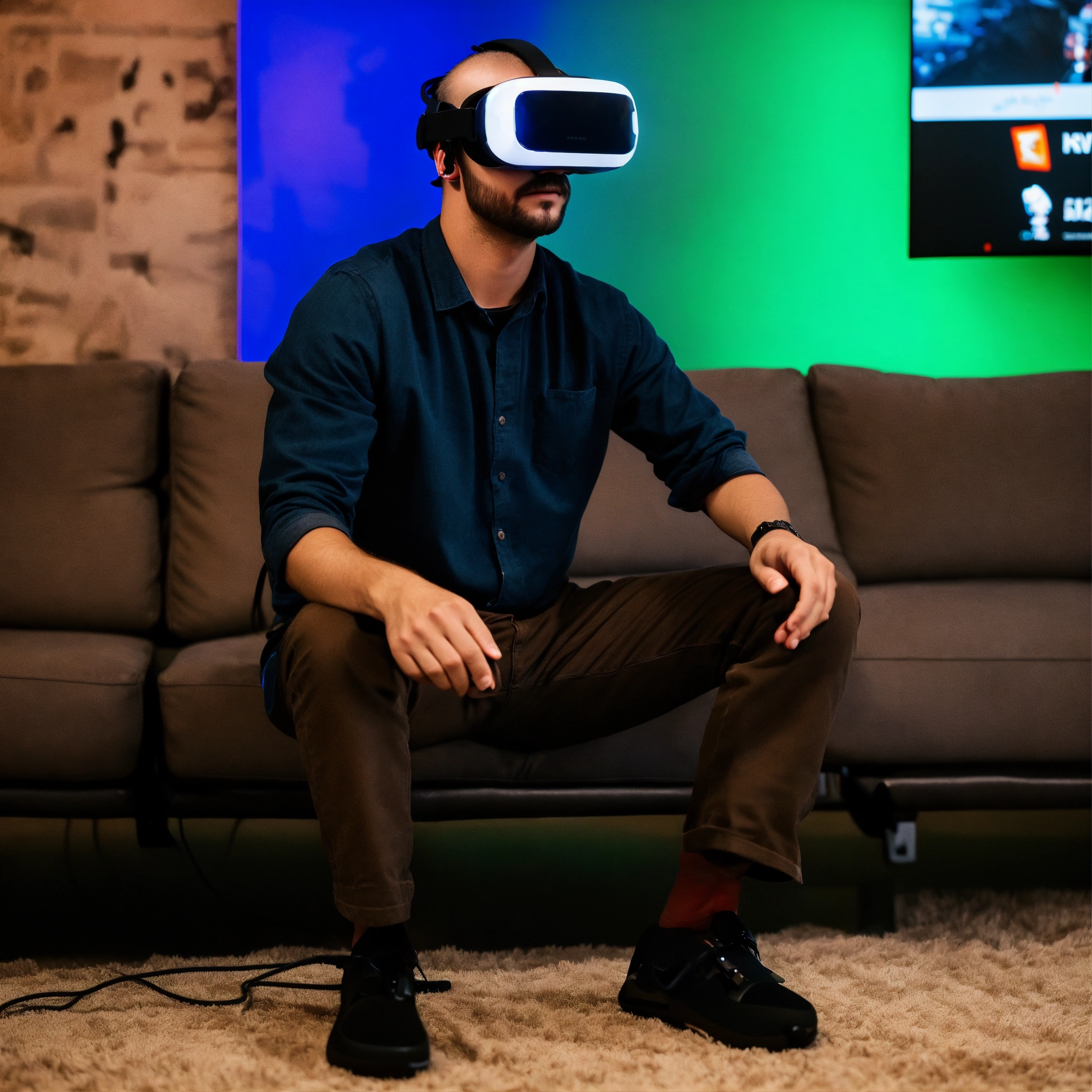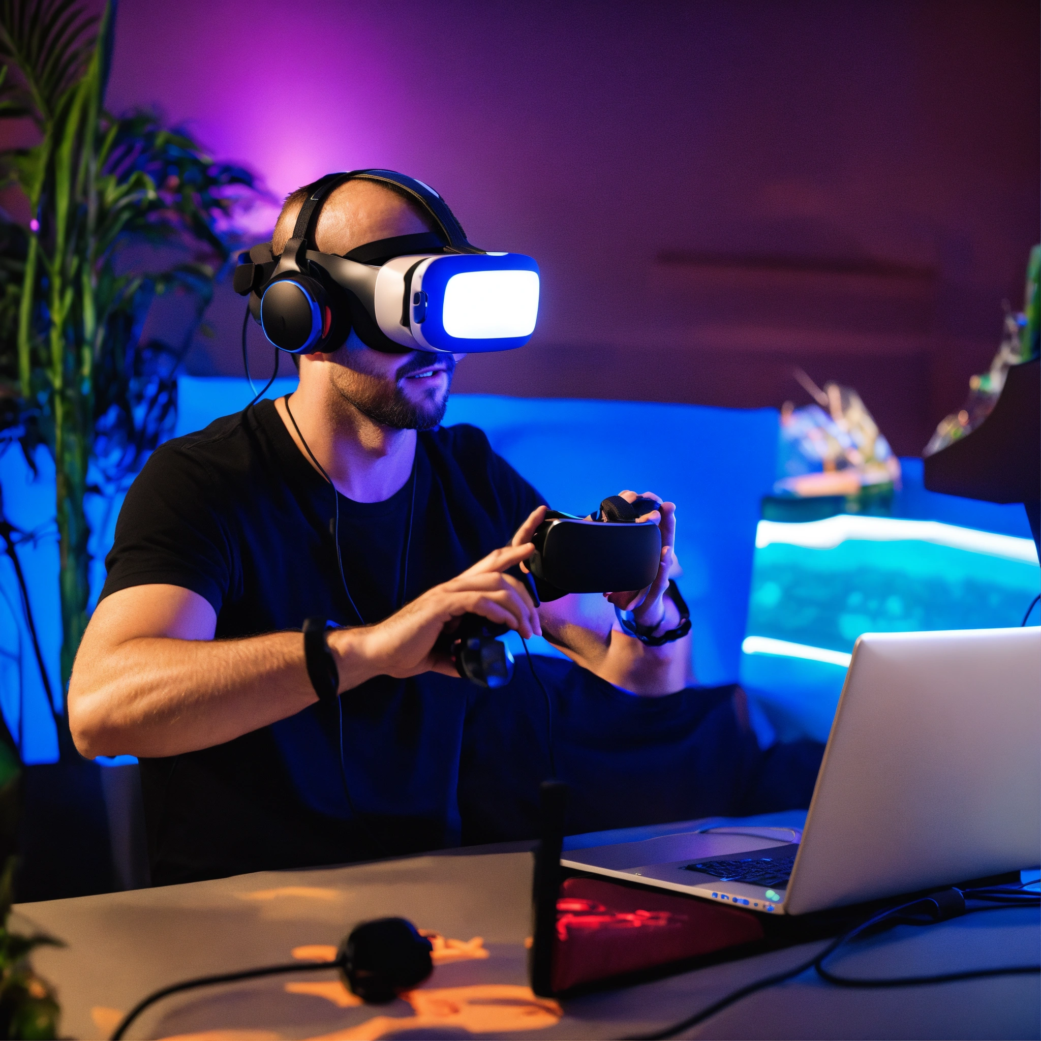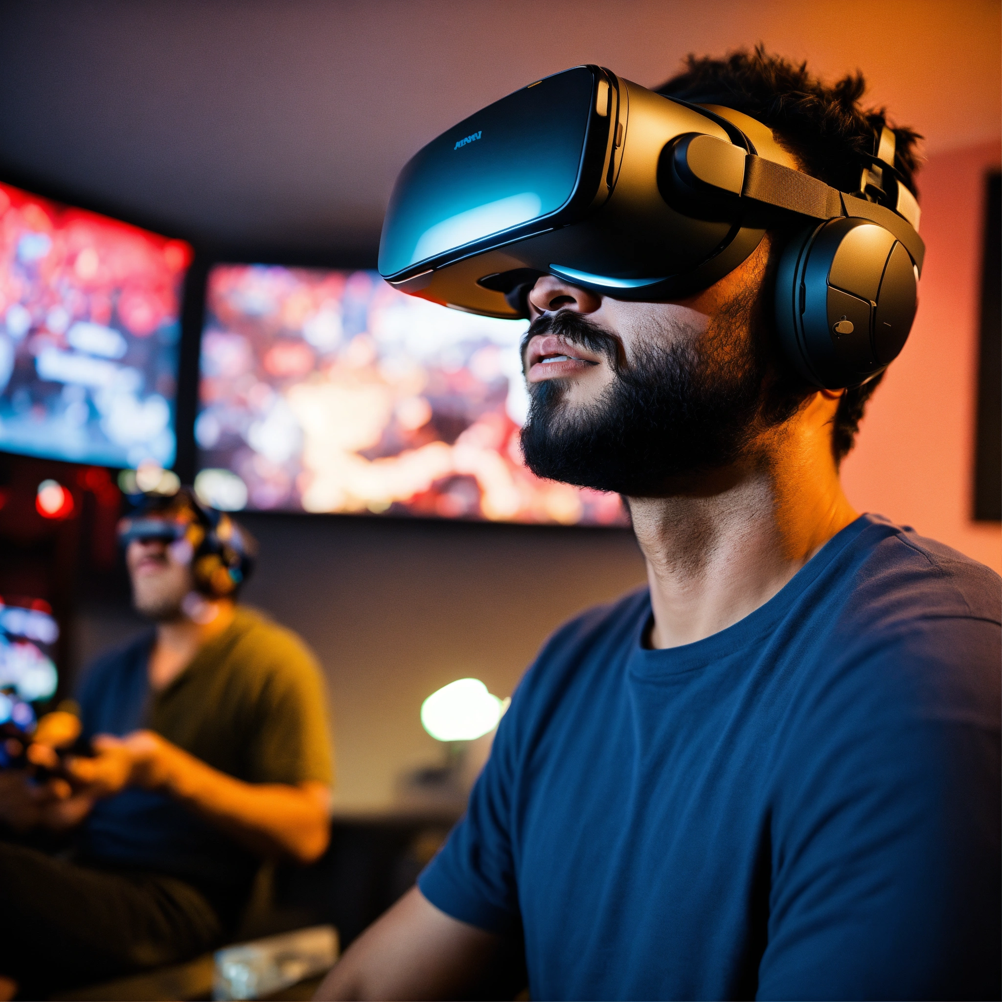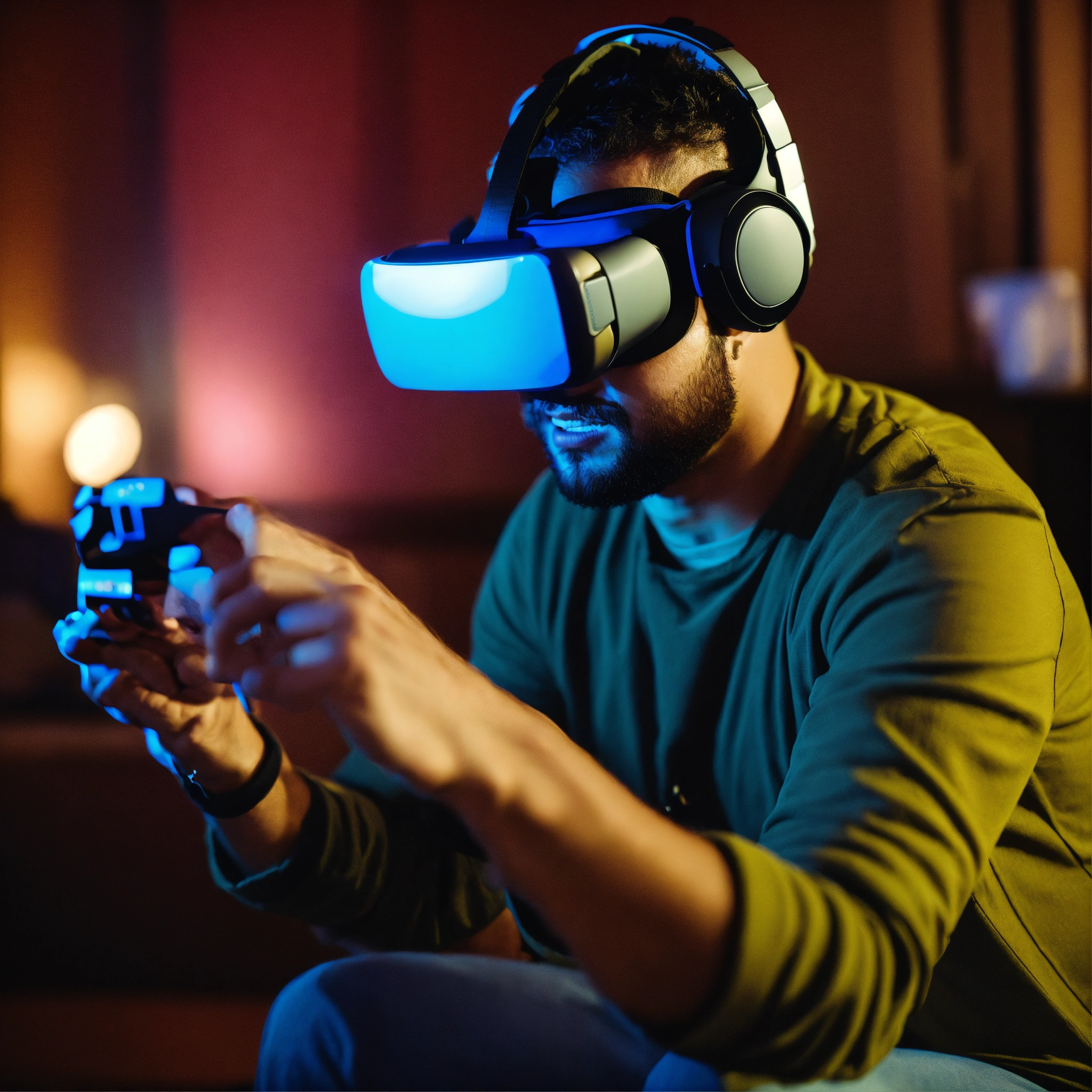 A photo of a man wearing a virtual reality headset, the man is playing a video game and is immersed in the virtual world