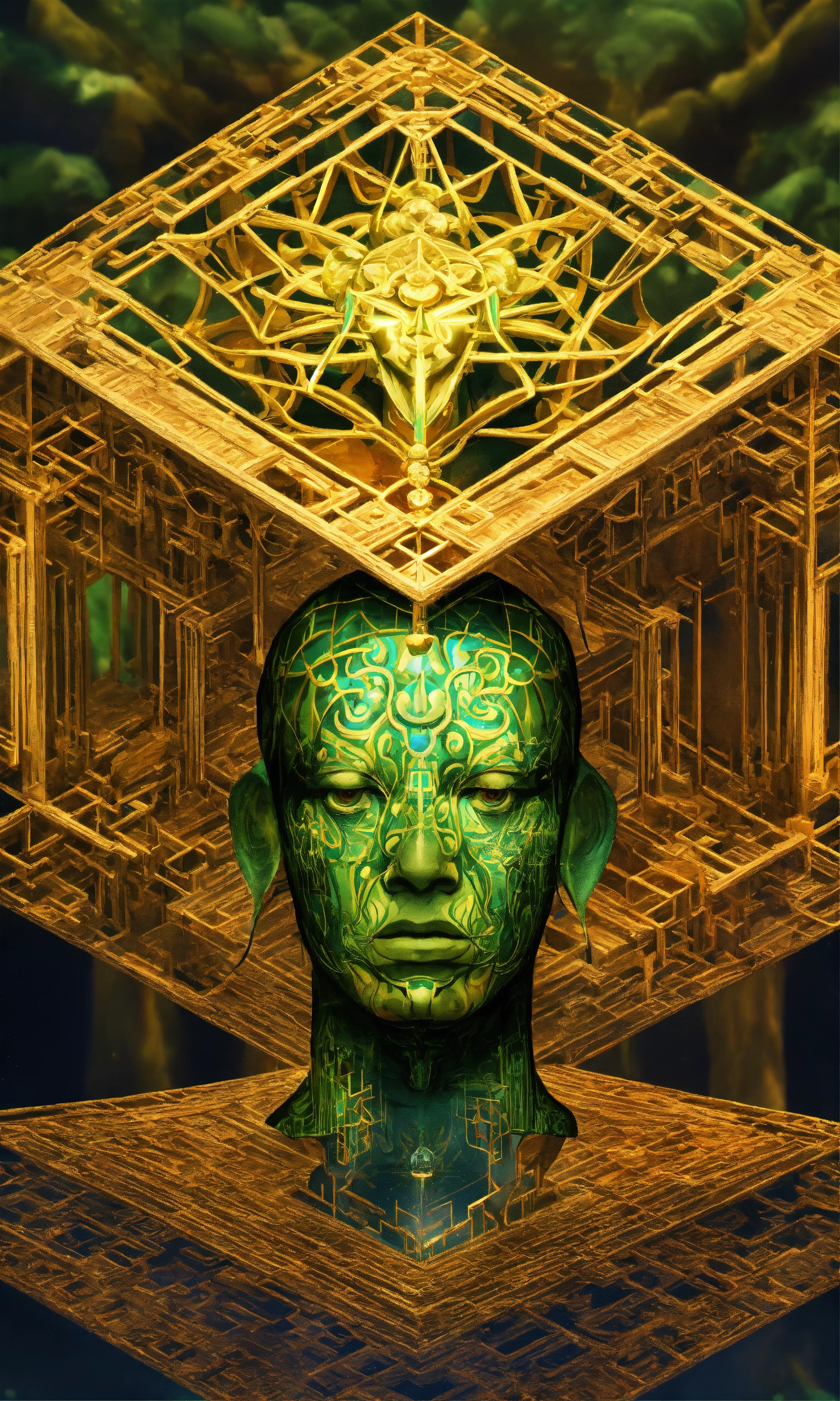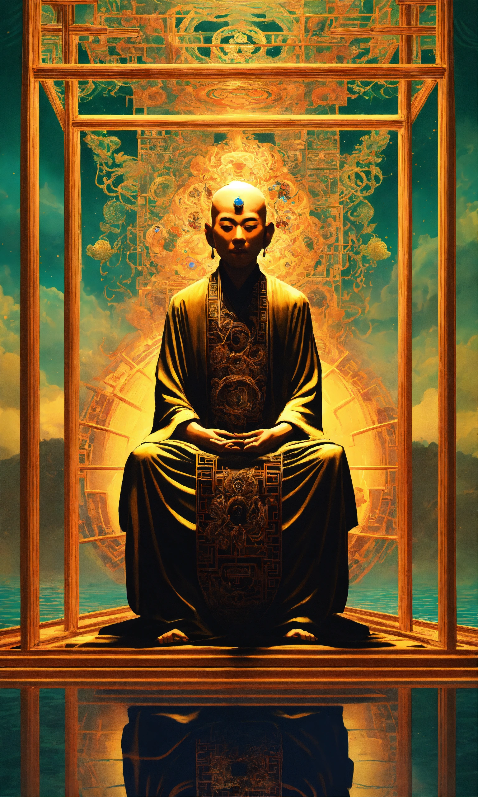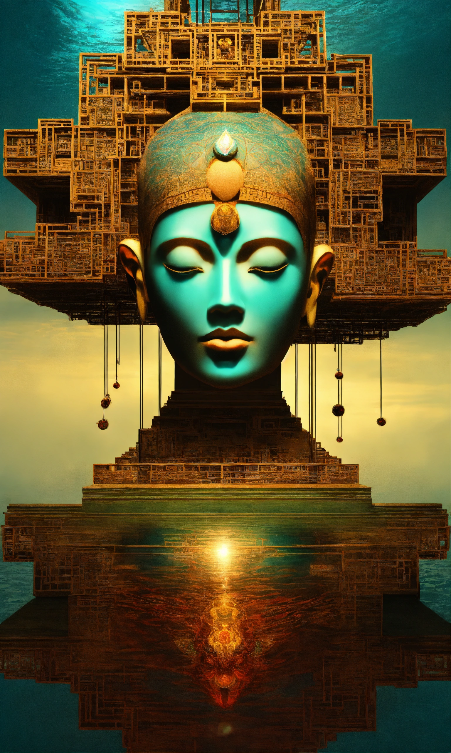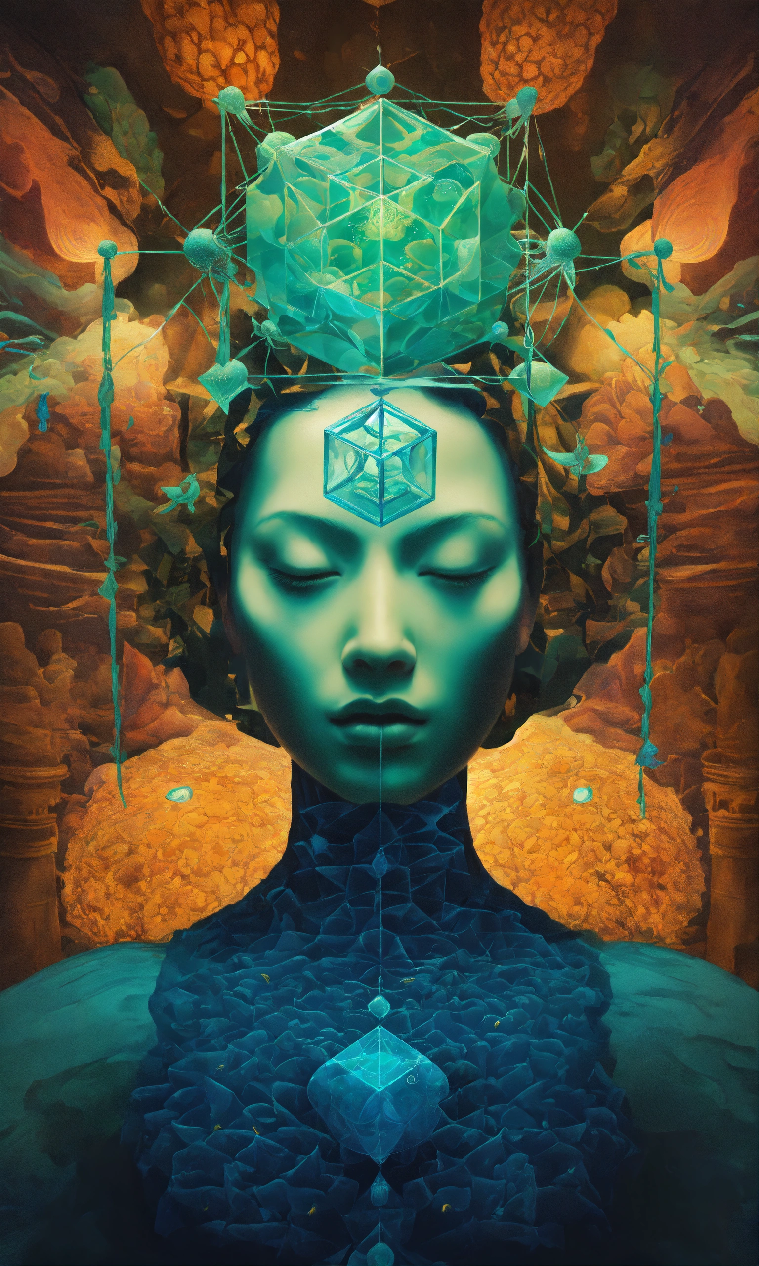 Taoist monk tesseract body fractal three point perspective hypercube mirror zen face brain mayan mantis jellyfish face underwater